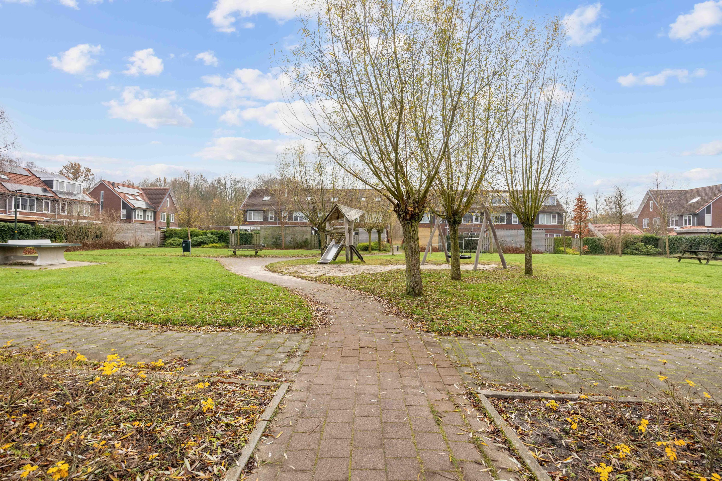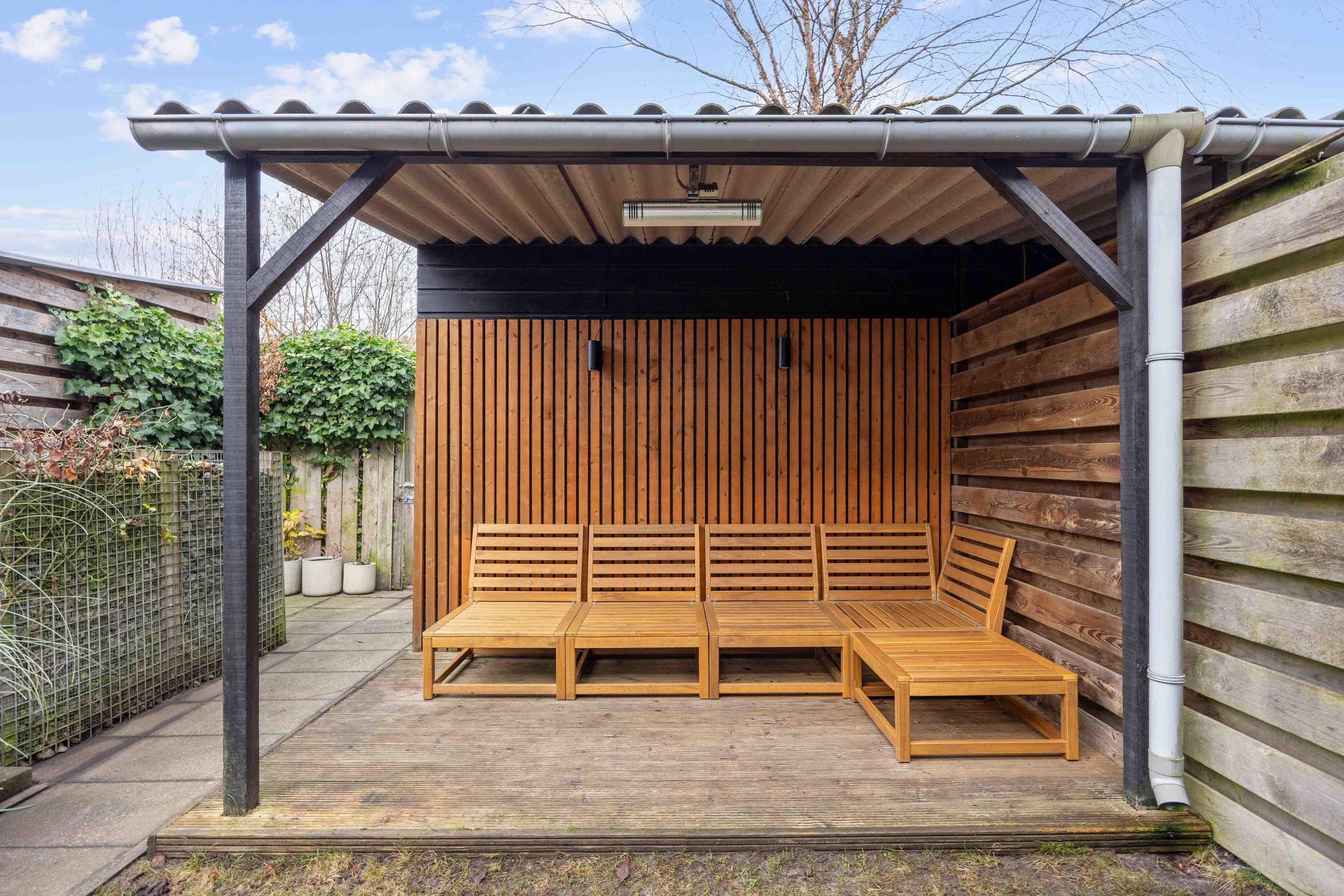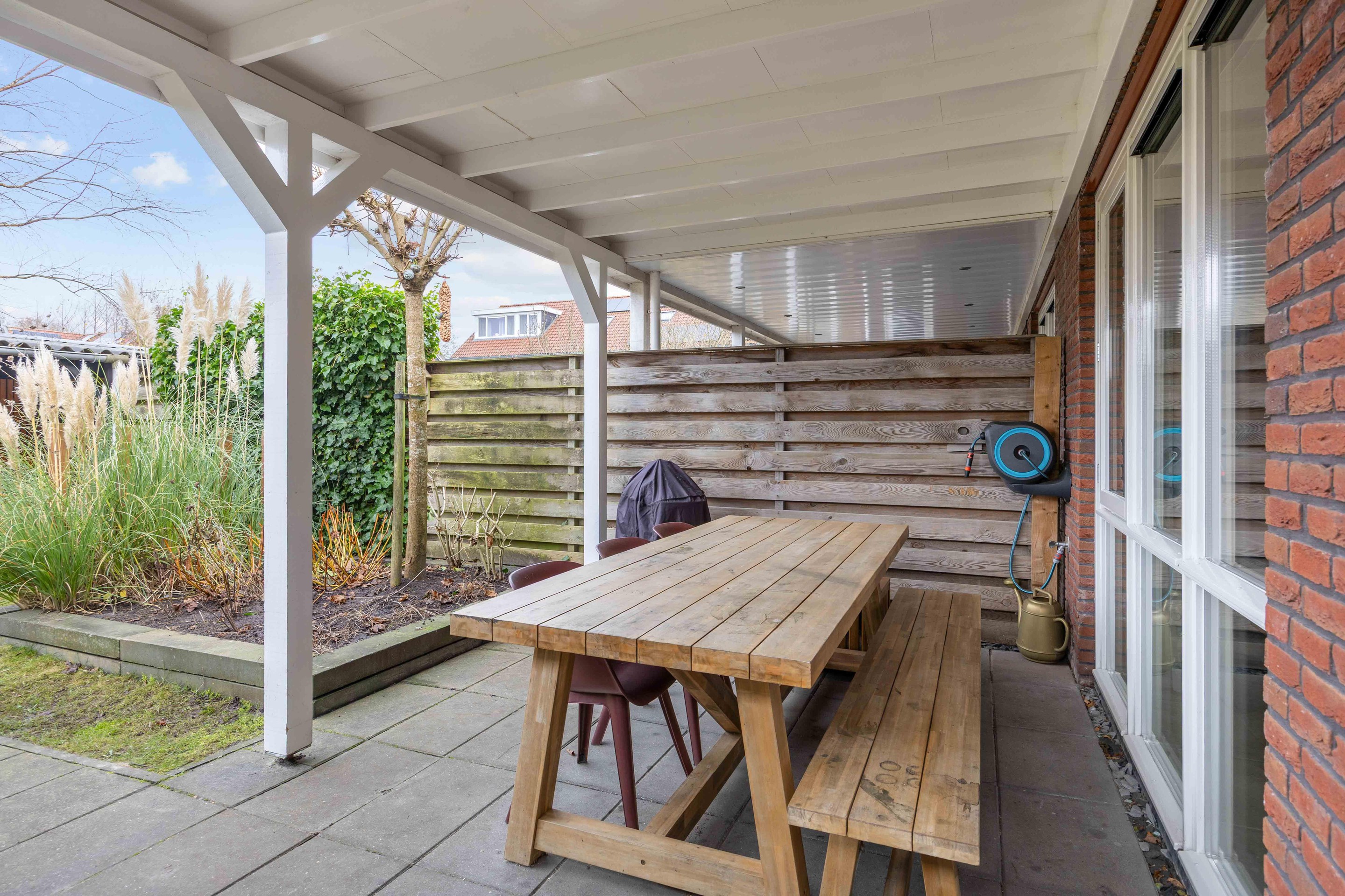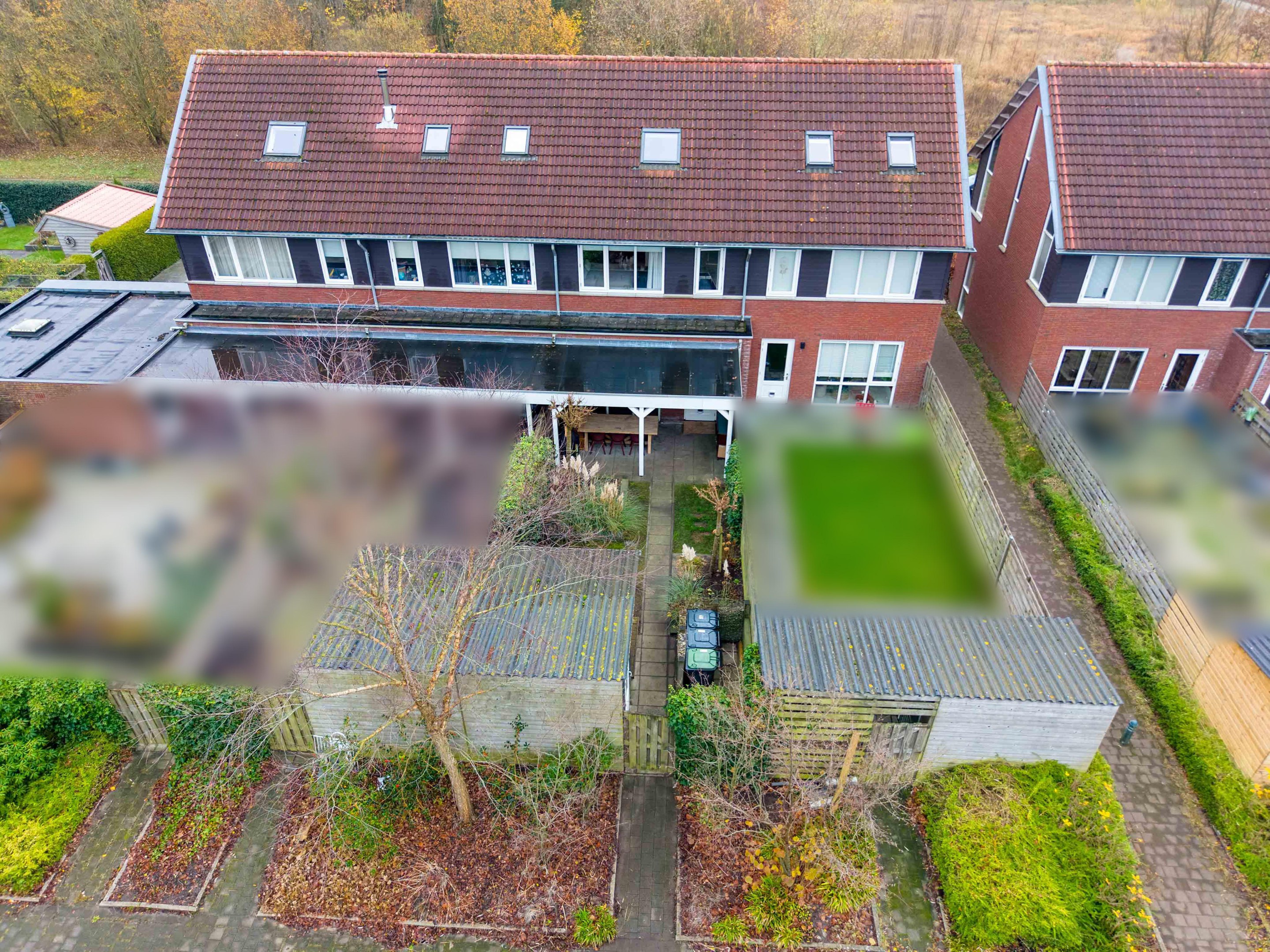 De achtertuin is voorzien van gazon en borders met beplanting. De houten overkapping aan het huis biedt een sfeervolle plek om lange avonden buiten te zitten, terwijl de houten berging zorgt voor extra opslag. Via het achterpad stapt u zo richting het speelveldje direct achter het huis.