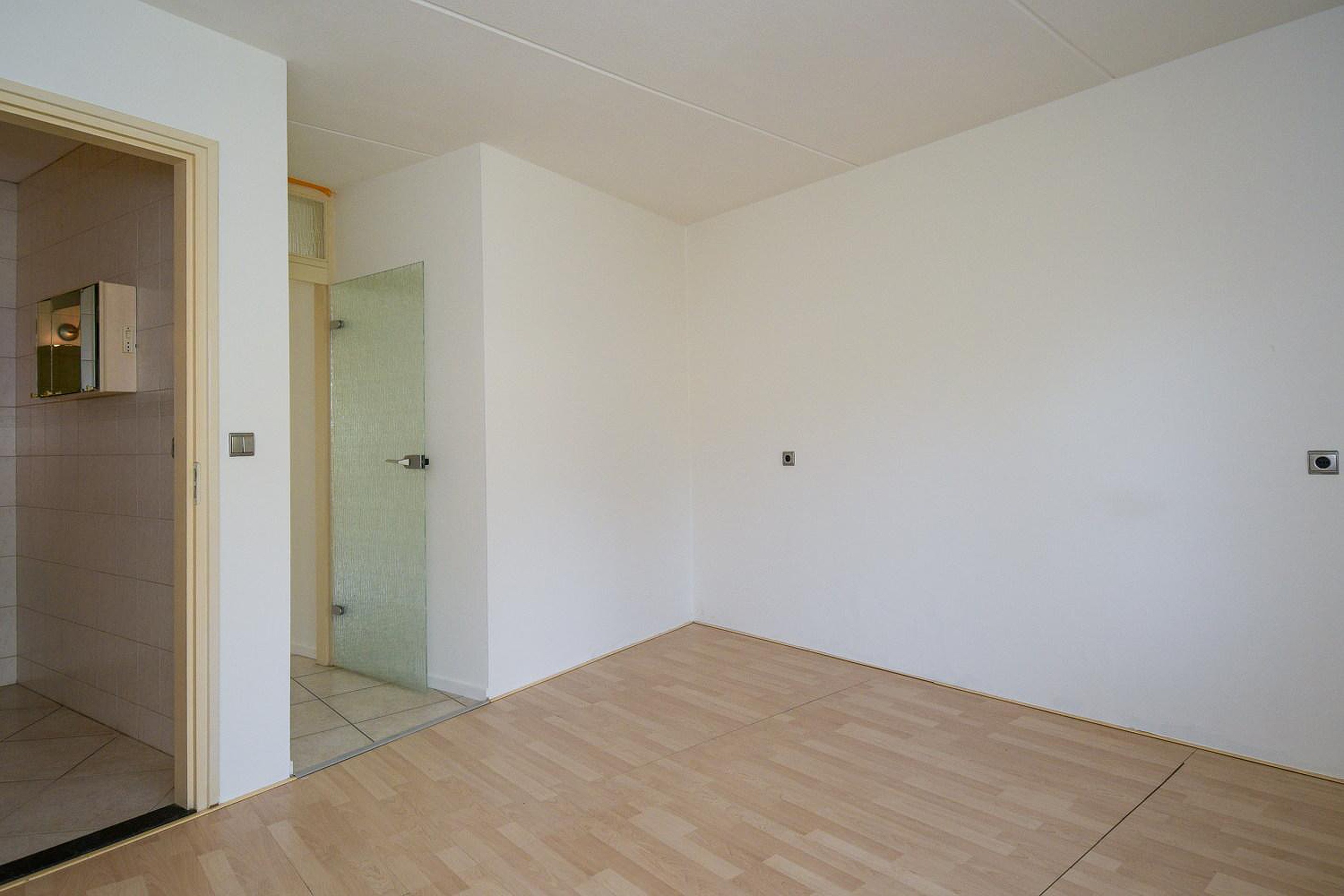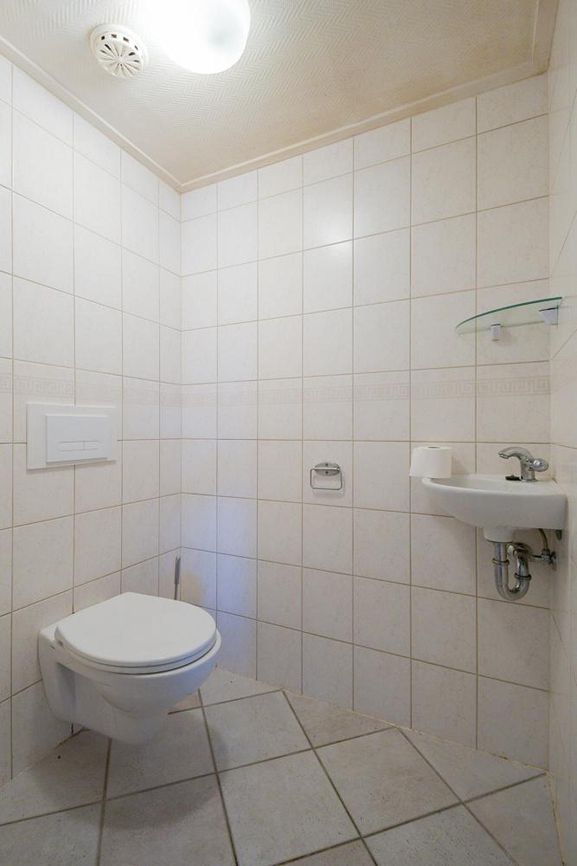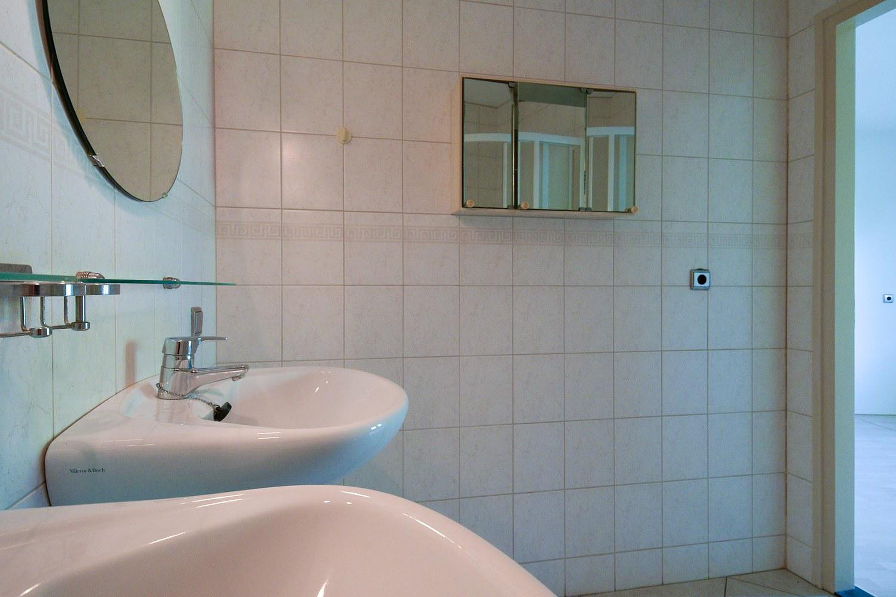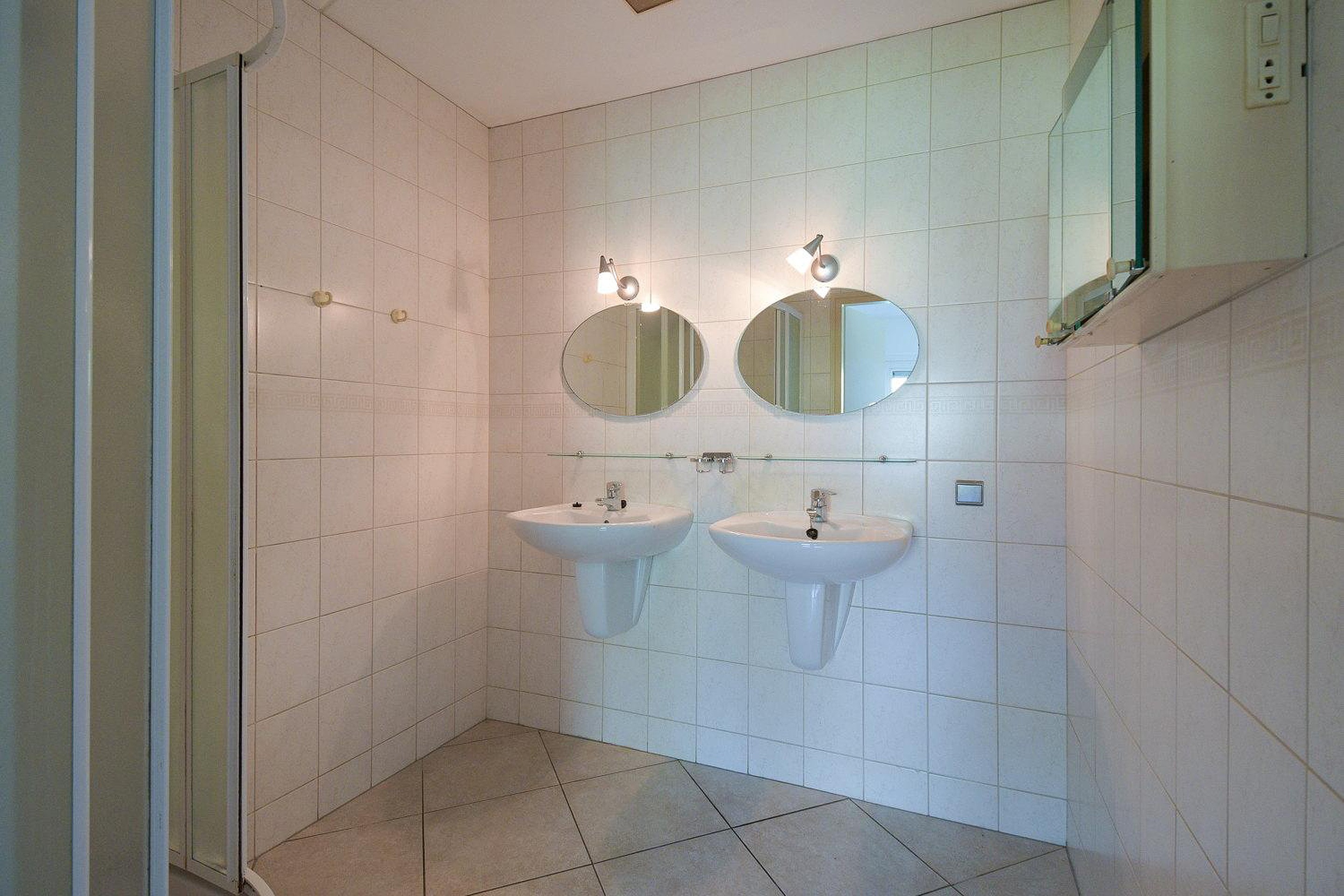 Via de woonkamer kom je in de ruime slaapkamer die zich aan de achterzijde bevindt. Vanuit de slaapkamer krijg je toegang tot de ruime badkamer, welke is voorzien van een dubbele wastafel en doucheruimte. De slaapkamer geeft tevens toegang tot het buitenterras. Terug naar de hal is de bijkeuken toegankelijk waar zich de witgoedaansluitingen bevinden en de CV ketel met de vloerverwarming verdeler. Ook het moderne toilet (wandcloset) met fonteintje bevindt zich hier en er is nog een vaste kast, geschikt voor berging.