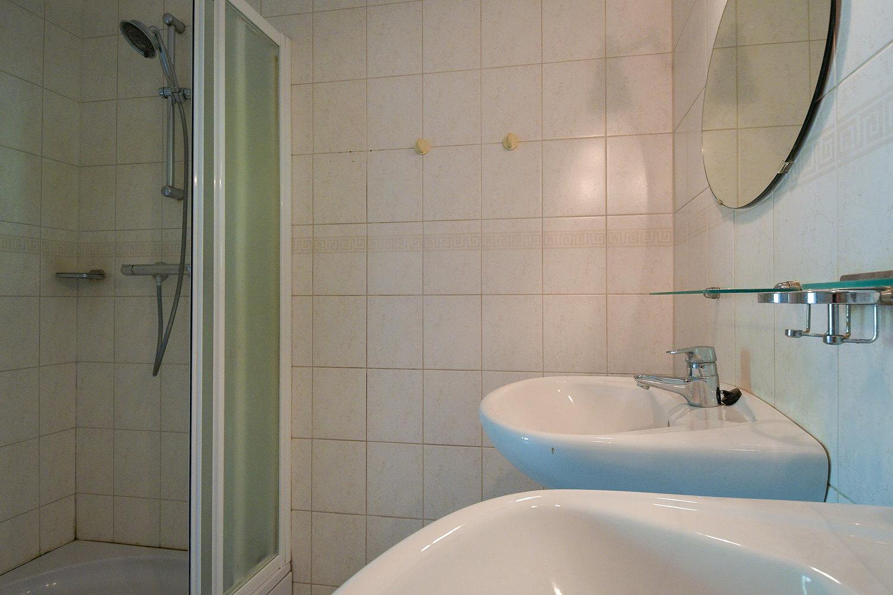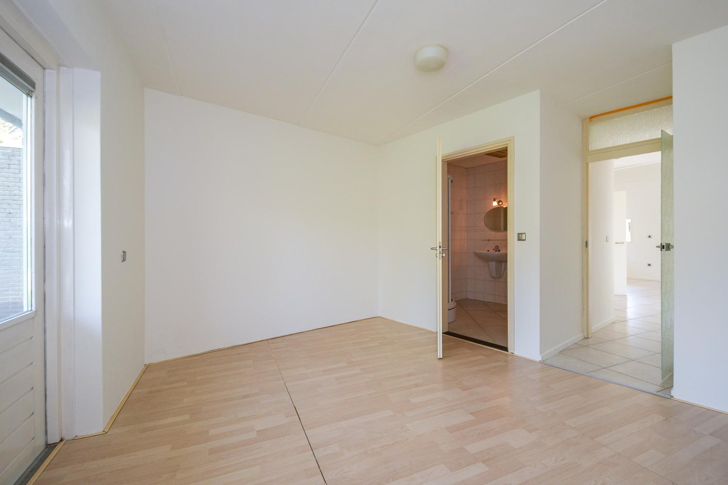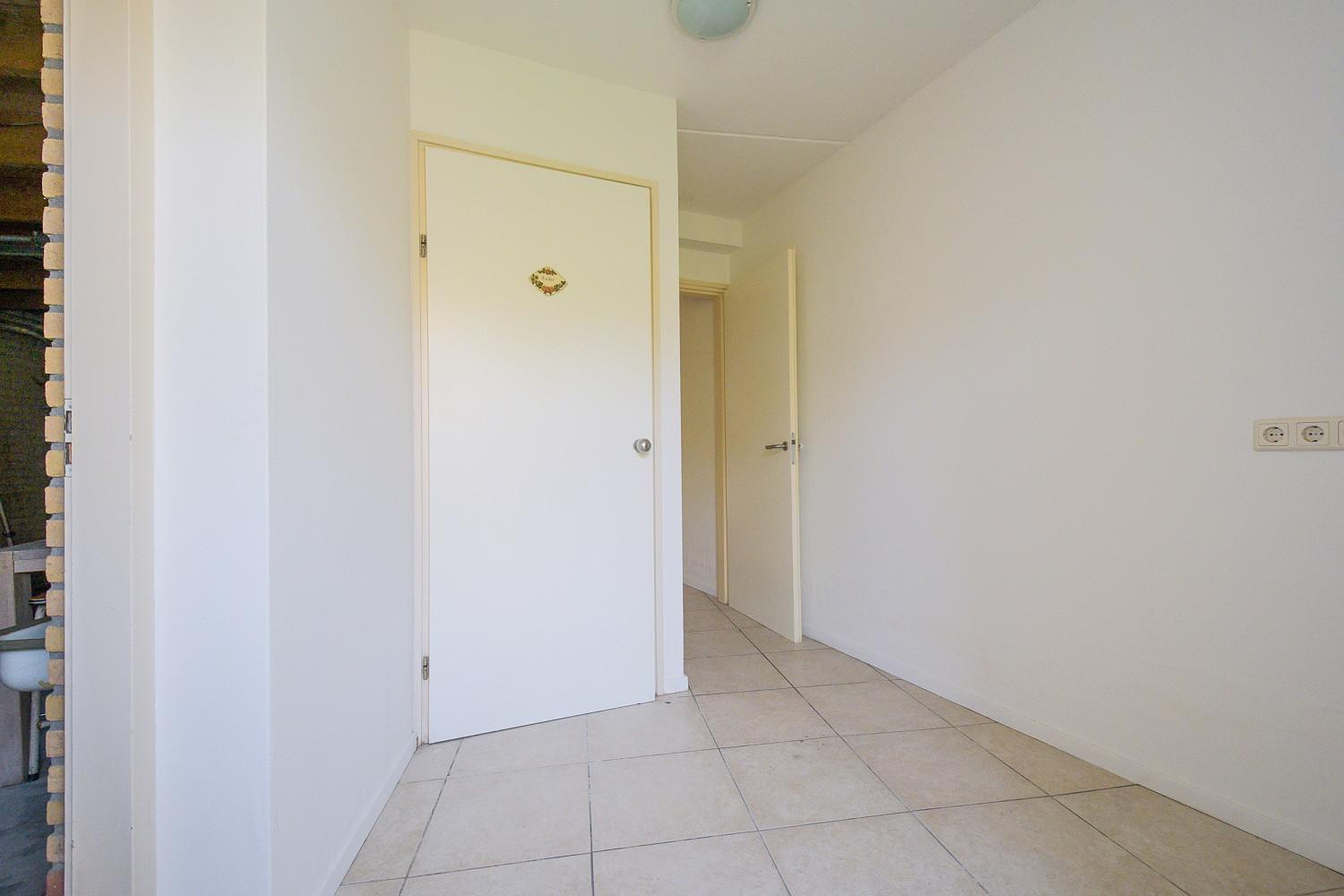 Via de woonkamer kom je in de ruime slaapkamer die zich aan de achterzijde bevindt. Vanuit de slaapkamer krijg je toegang tot de ruime badkamer, welke is voorzien van een dubbele wastafel en doucheruimte. De slaapkamer geeft tevens toegang tot het buitenterras. Terug naar de hal is de bijkeuken toegankelijk waar zich de witgoedaansluitingen bevinden en de CV ketel met de vloerverwarming verdeler. Ook het moderne toilet (wandcloset) met fonteintje bevindt zich hier en er is nog een vaste kast, geschikt voor berging.