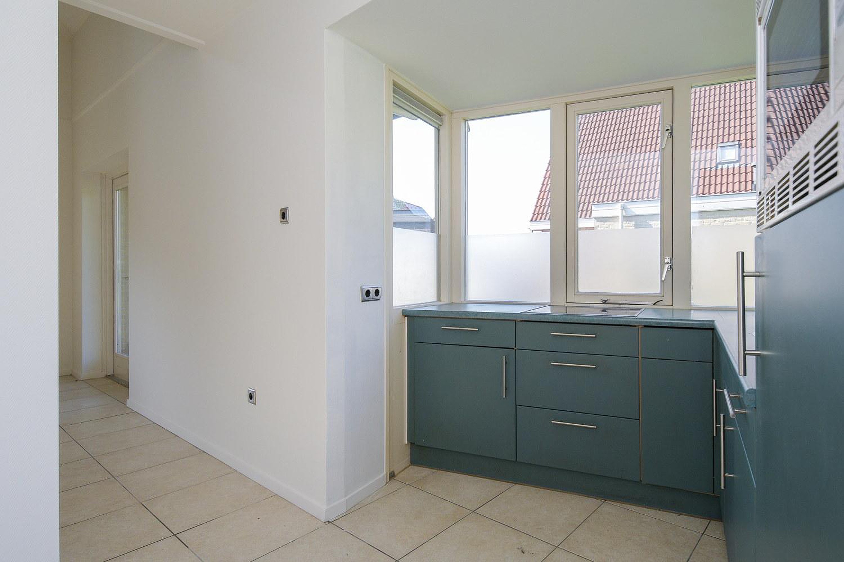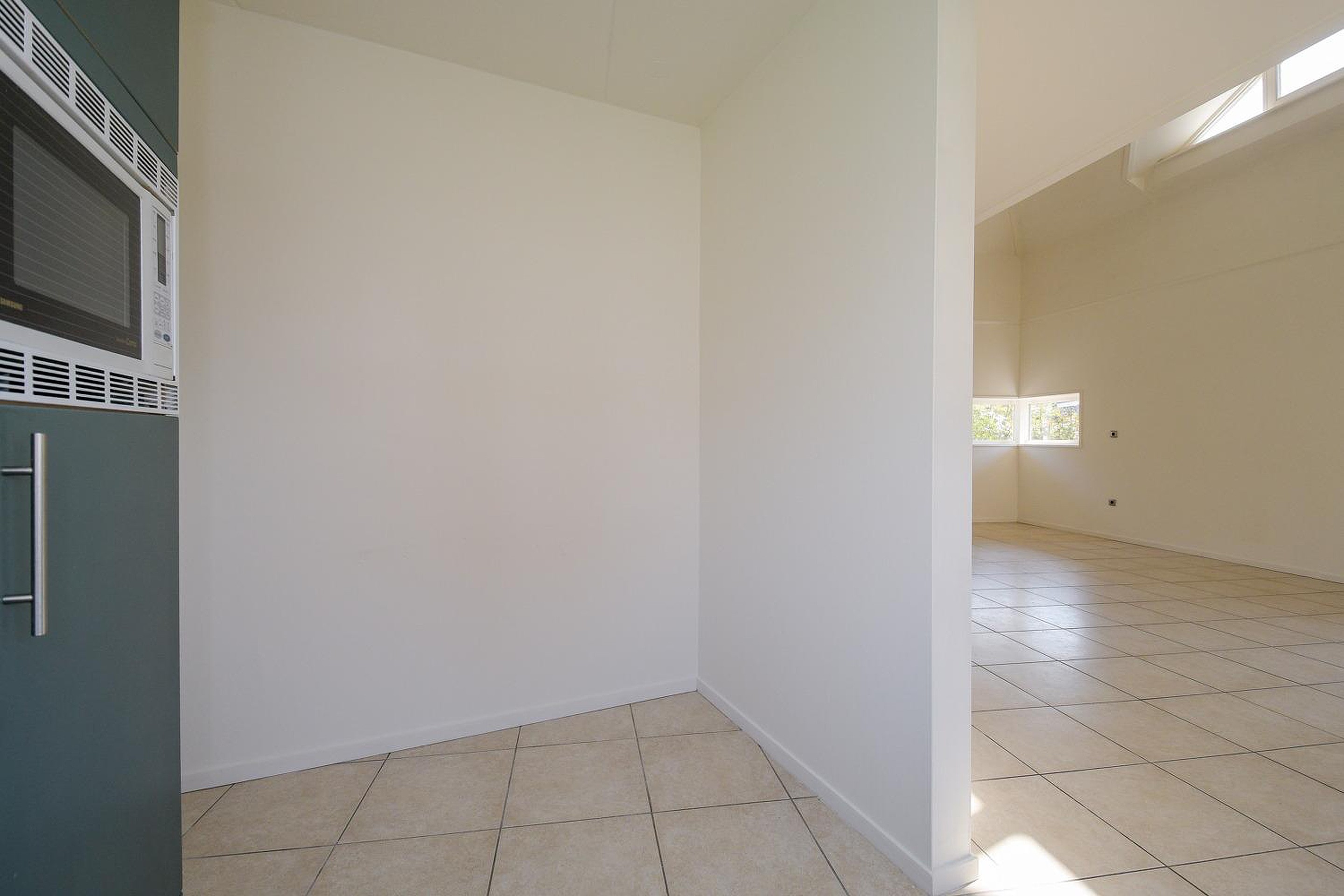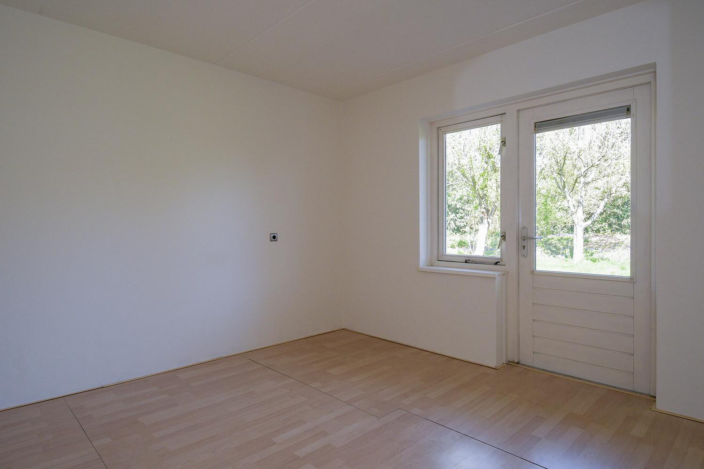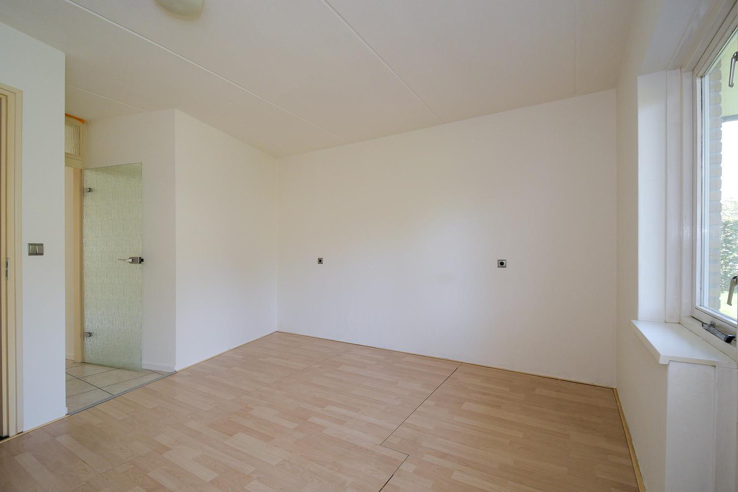 Via de woonkamer kom je in de ruime slaapkamer die zich aan de achterzijde bevindt. Vanuit de slaapkamer krijg je toegang tot de ruime badkamer, welke is voorzien van een dubbele wastafel en doucheruimte. De slaapkamer geeft tevens toegang tot het buitenterras. Terug naar de hal is de bijkeuken toegankelijk waar zich de witgoedaansluitingen bevinden en de CV ketel met de vloerverwarming verdeler. Ook het moderne toilet (wandcloset) met fonteintje bevindt zich hier en er is nog een vaste kast, geschikt voor berging.