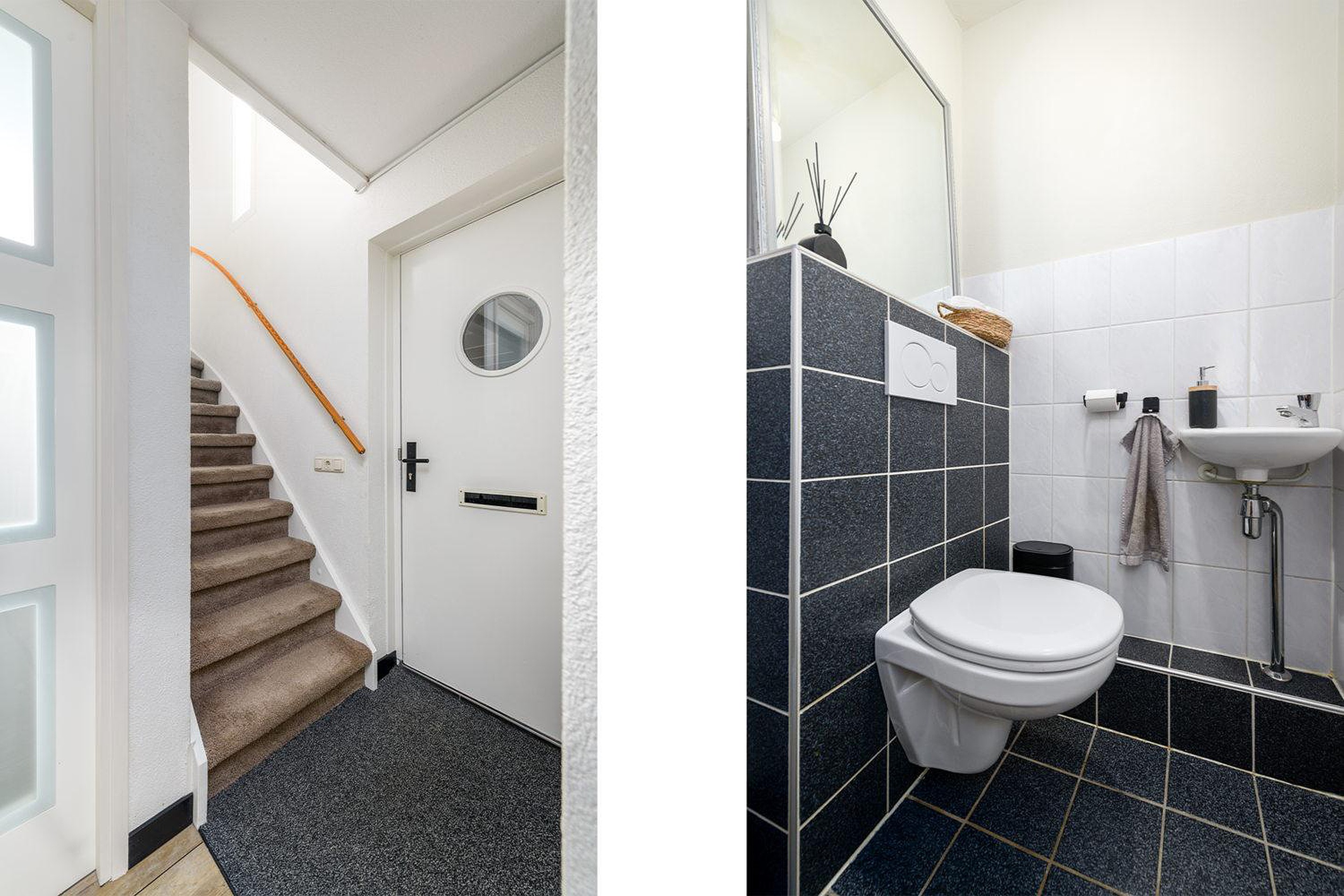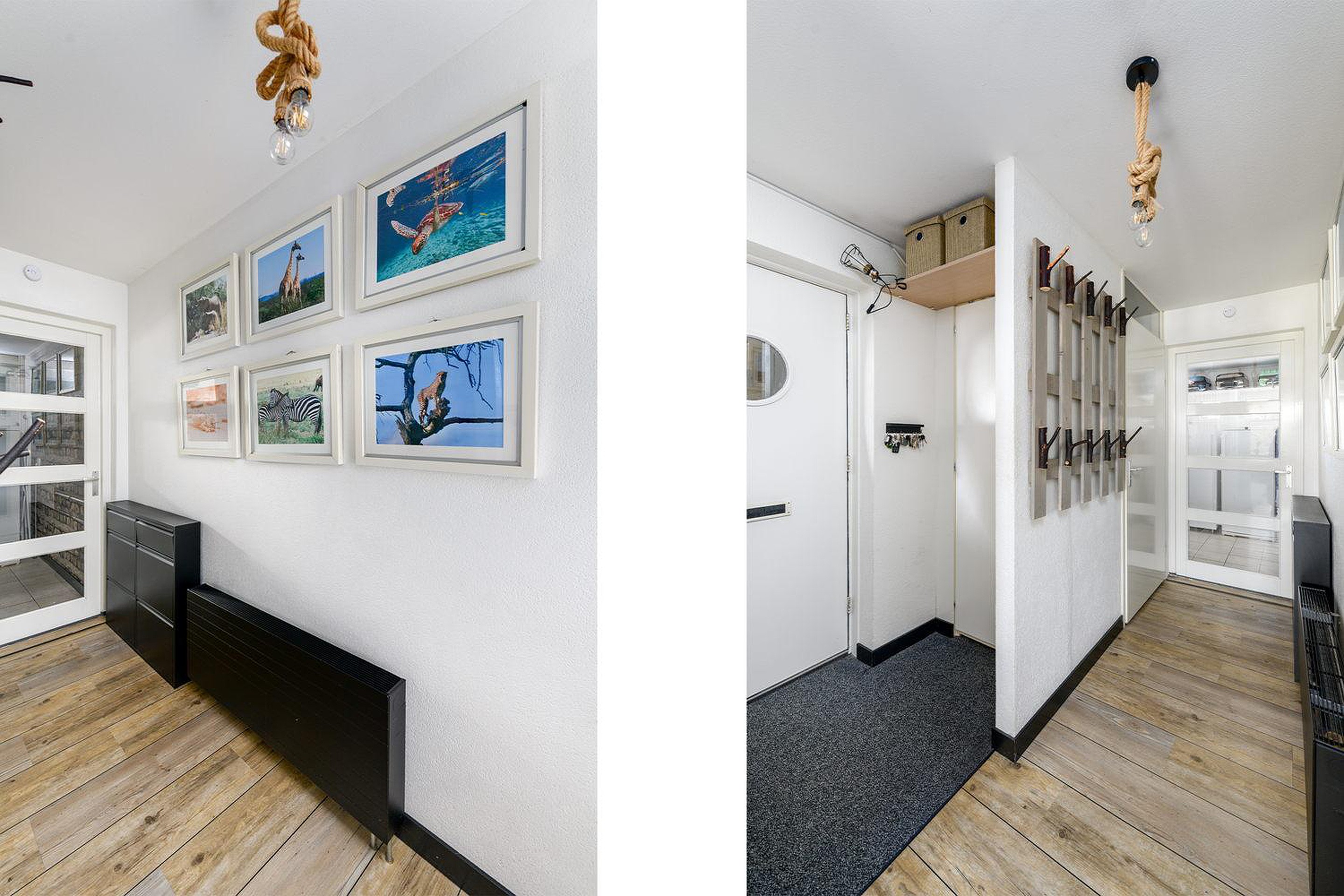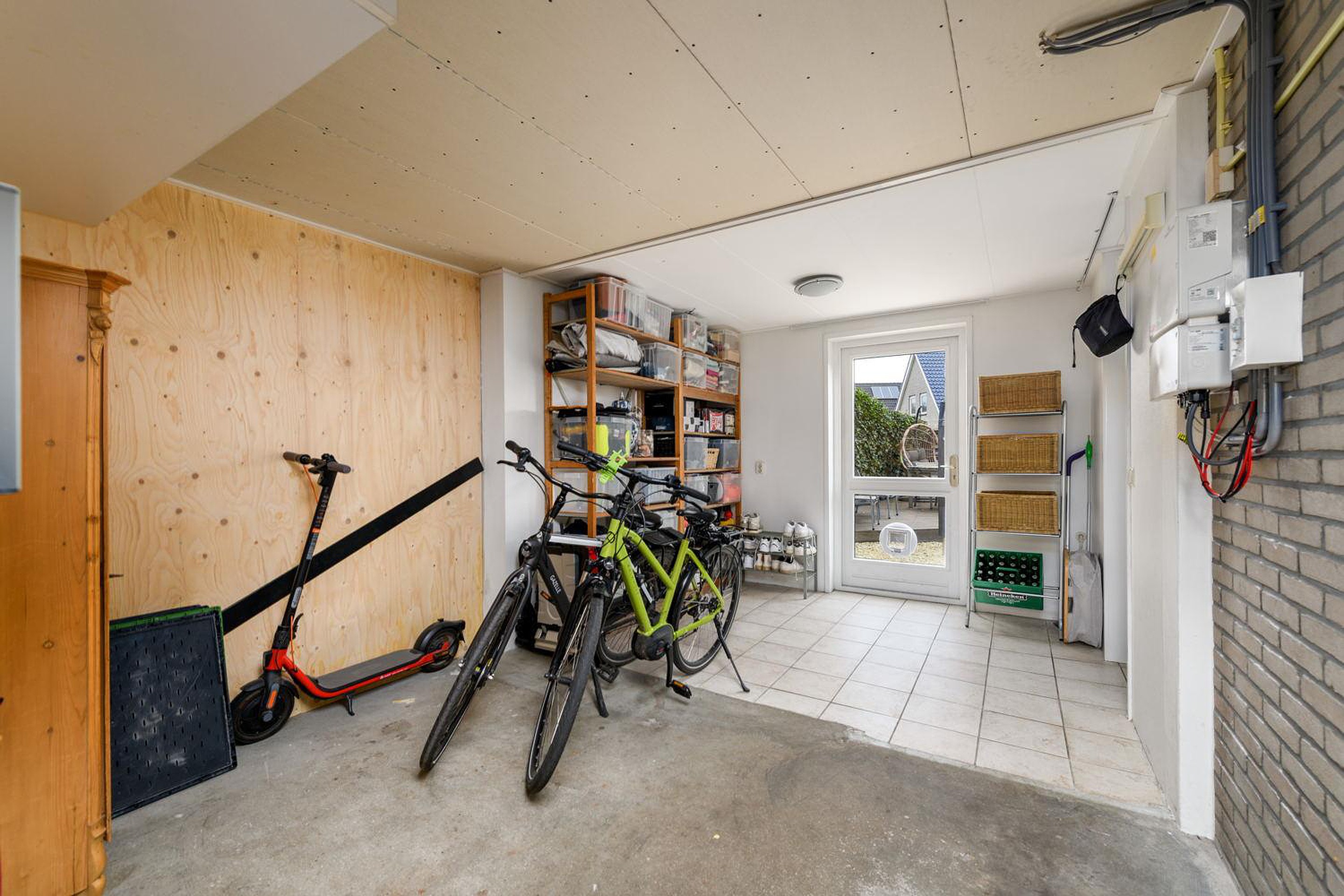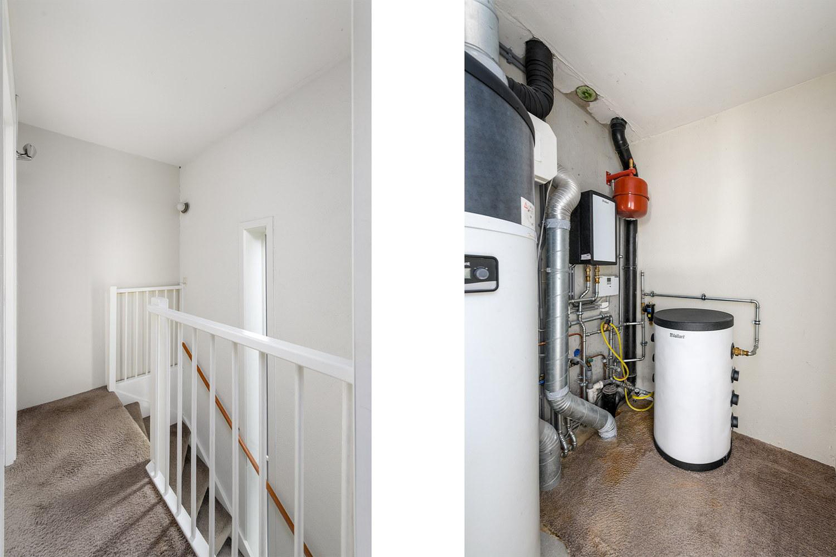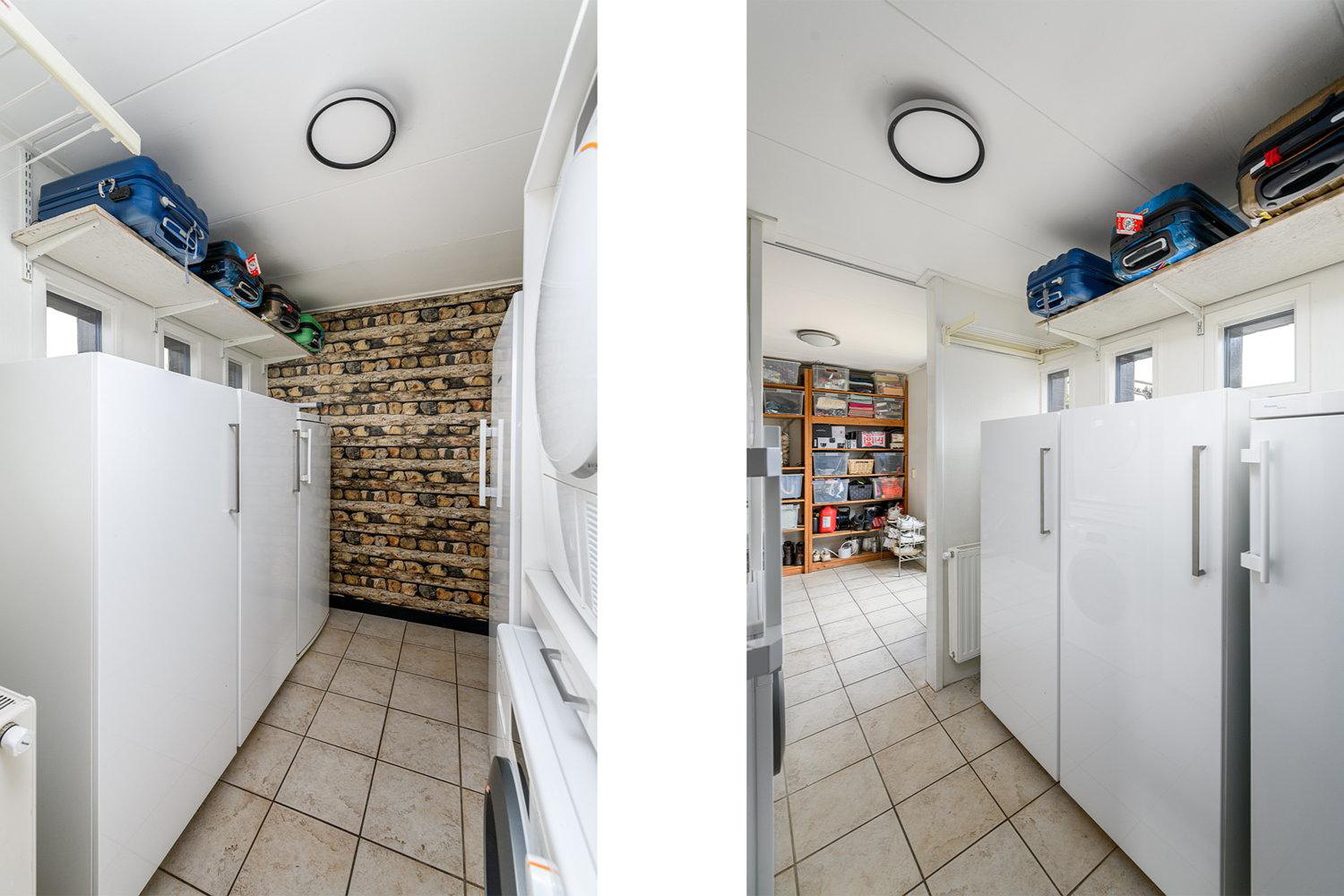 Vanuit de hal kom je in de bijkeuken met de opstelling voor witgoedaansluitingen. De geïsoleerde verwarmde bijkeuken staat in open verbinding met de berging waar de omvormer van de zonnepanelen hangt. Aan de voorzijde bevindt zich de oprit met een flinke overkapping/carport geschikt voor twee auto’s.