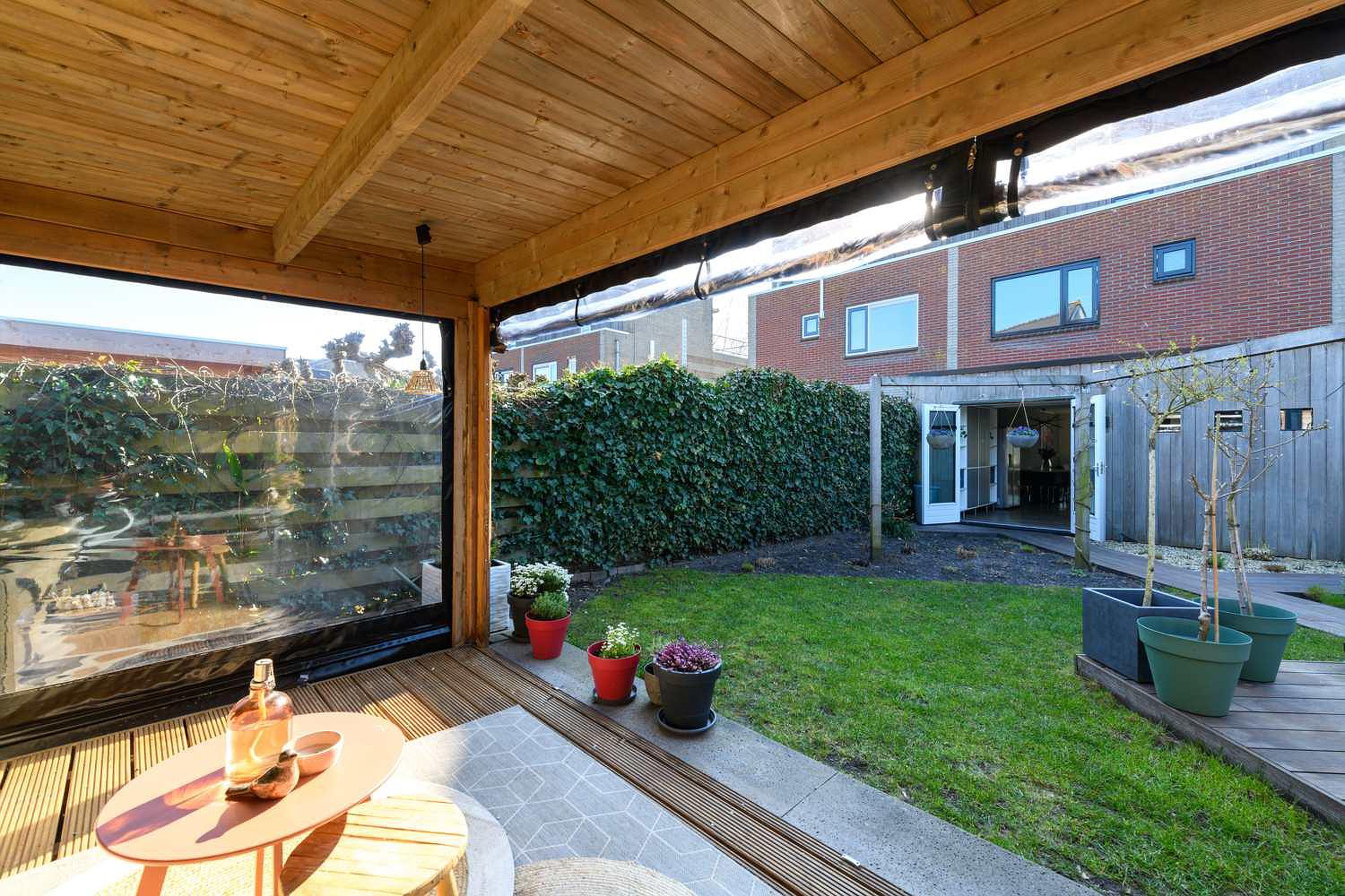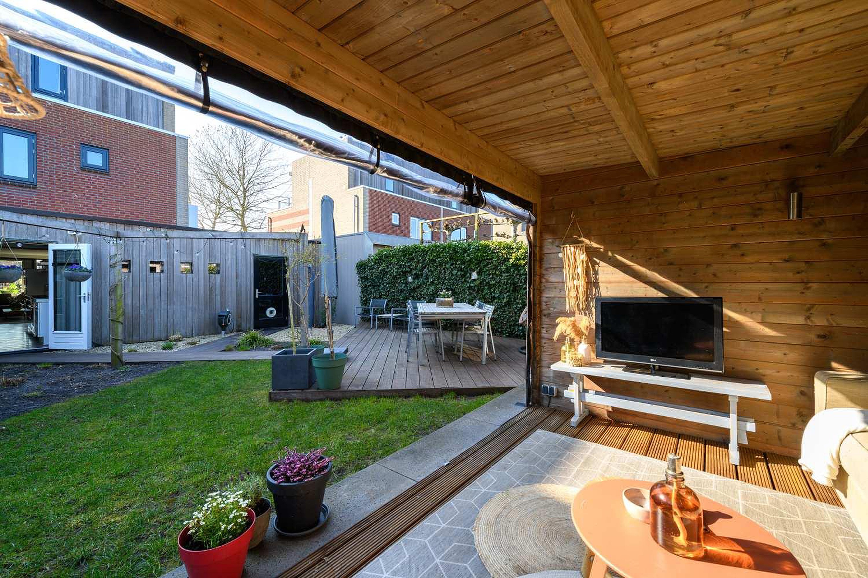 Tuin De tuin is gelegen op het oosten met achter op het erf een groot vrijstaand tuinhuis met overkapping, perfect als heerlijke loungeplek. De tuin is opnieuw ingericht en voorzien van veel groen, bamboe -vlonders met speelse niveauverschillen en volop privacy. De overkapping kan desgewenst ook dichtgemaakt worden met verandazeilen. Heel plezierig op de koelere dagen. Het dak is in 2022 vervangen.