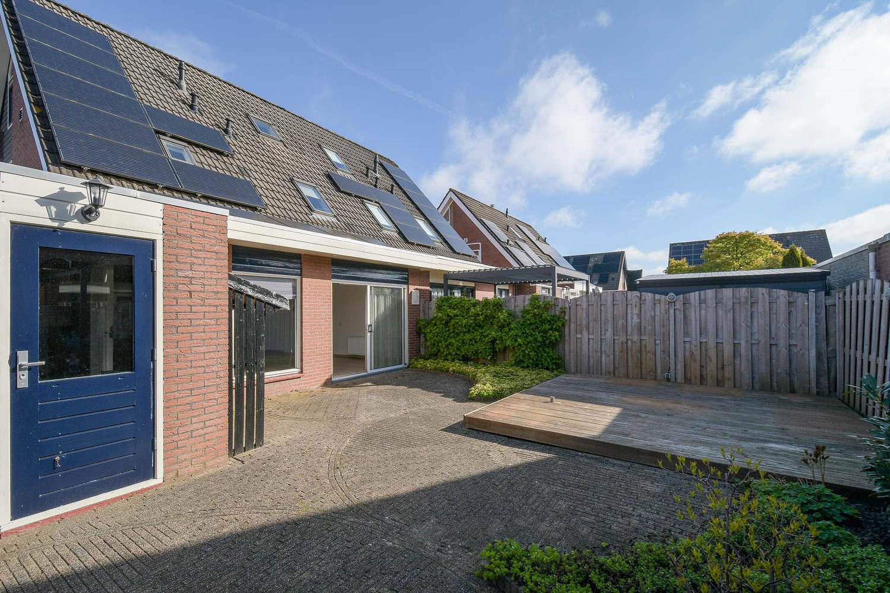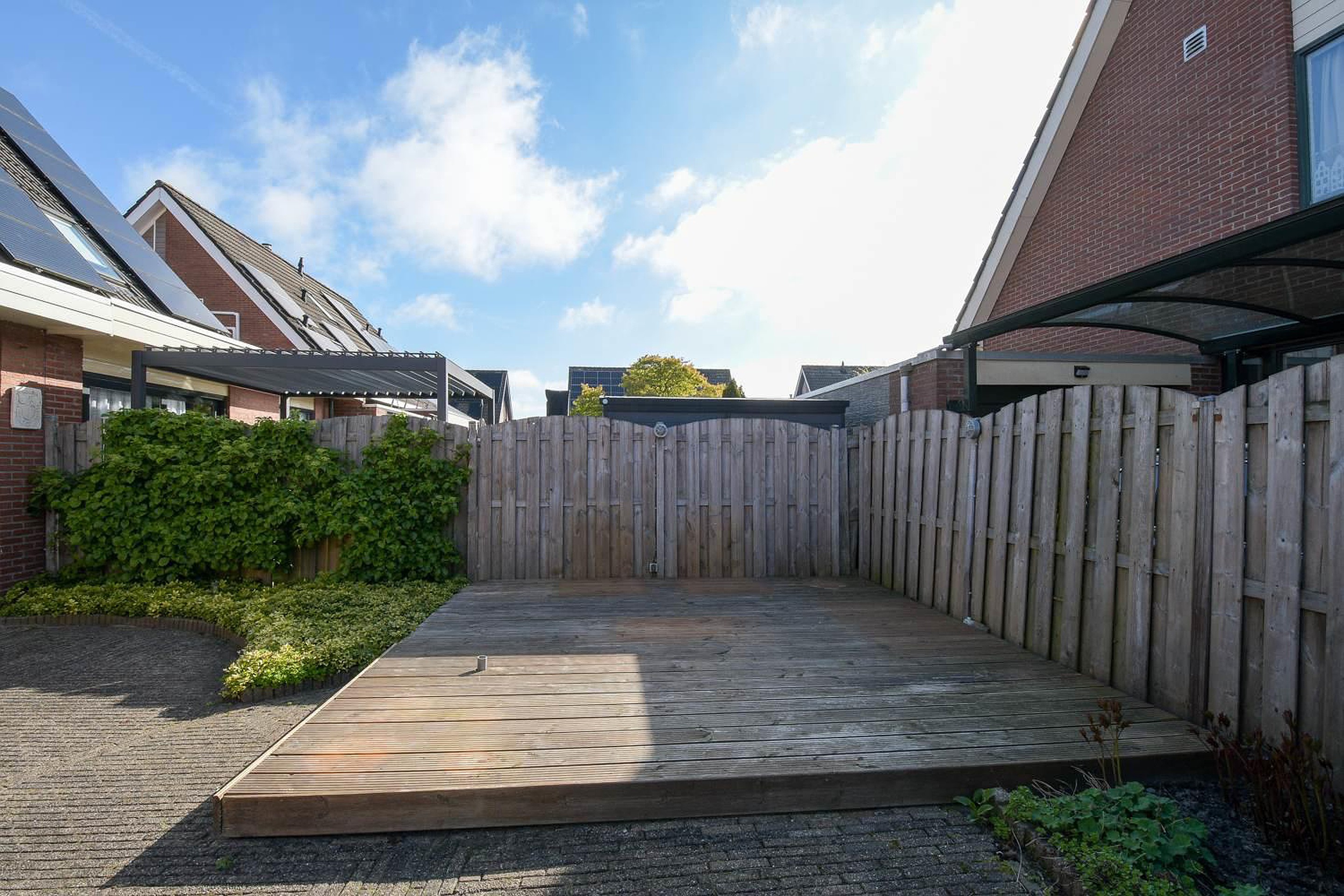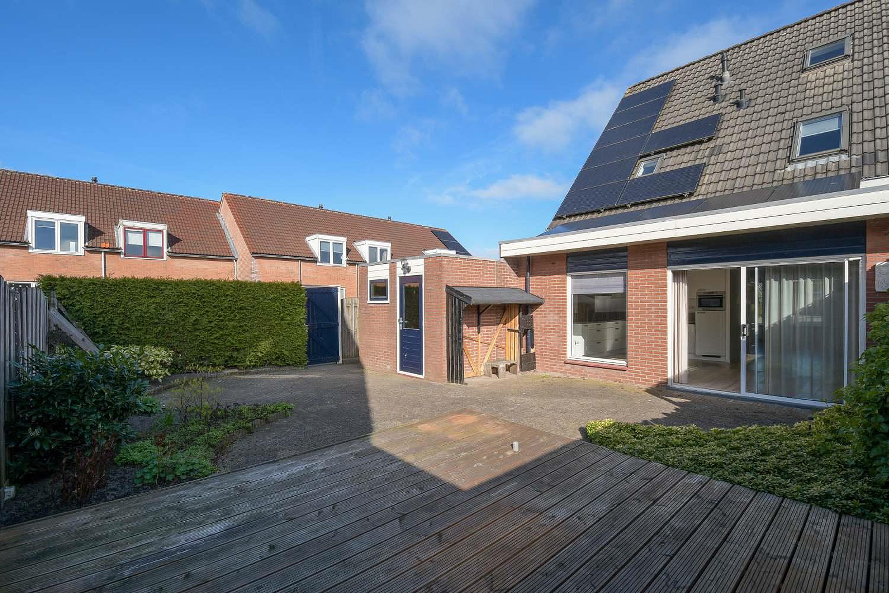 De ligging van de tuin is op het zuiden. Het terras in de zonnige achtertuin is voorzien van een stijlvolle houten vlonder (2025), wat zorgt voor een warme en natuurlijke uitstraling. De vlonder maakt het terras extra comfortabel en onderhoudsvriendelijk, perfect om buiten te loungen, te dineren of heerlijk te ontspannen en te genieten van lange zomeravonden.