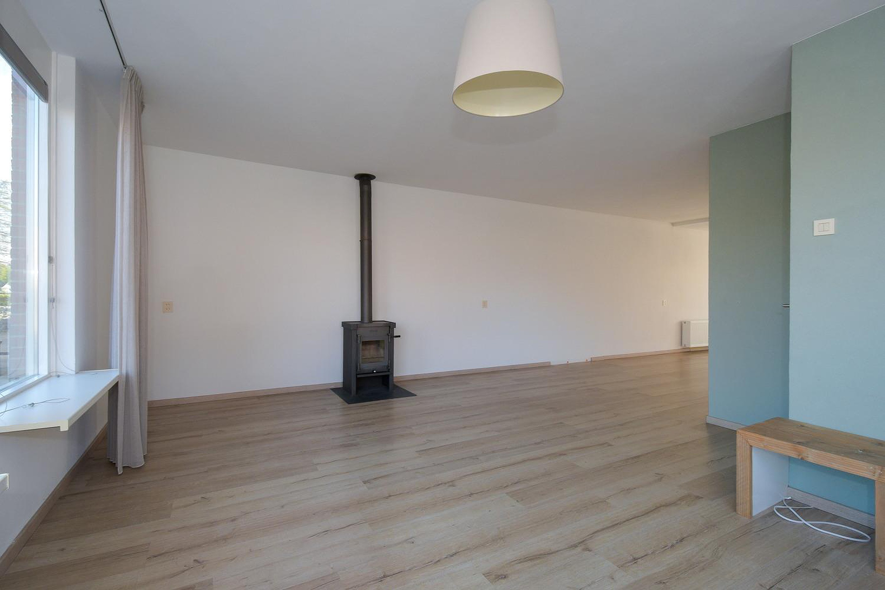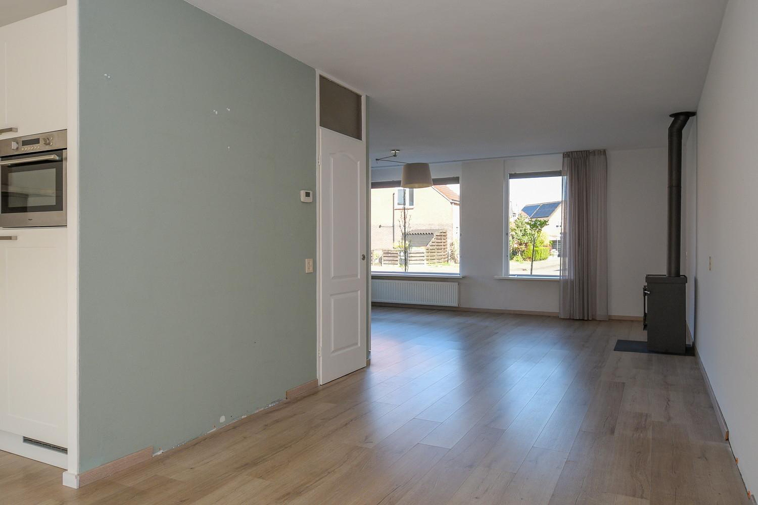 De geschakelde twee onder één kapwoning is aan de achterzijde uitgebouwd en voorzien van een grote aluminium schuifpui. Hierdoor is de woon-leefkeuken heerlijk licht en ruim en is er een directe verbinding met de tuin ontstaan. De houtkachel in de woonkamer zorgt voor extra sfeer en warmte in de koude maanden. De strak gestucte plafonds op de begane grond dragen bij aan het eigentijdse wooncomfort.