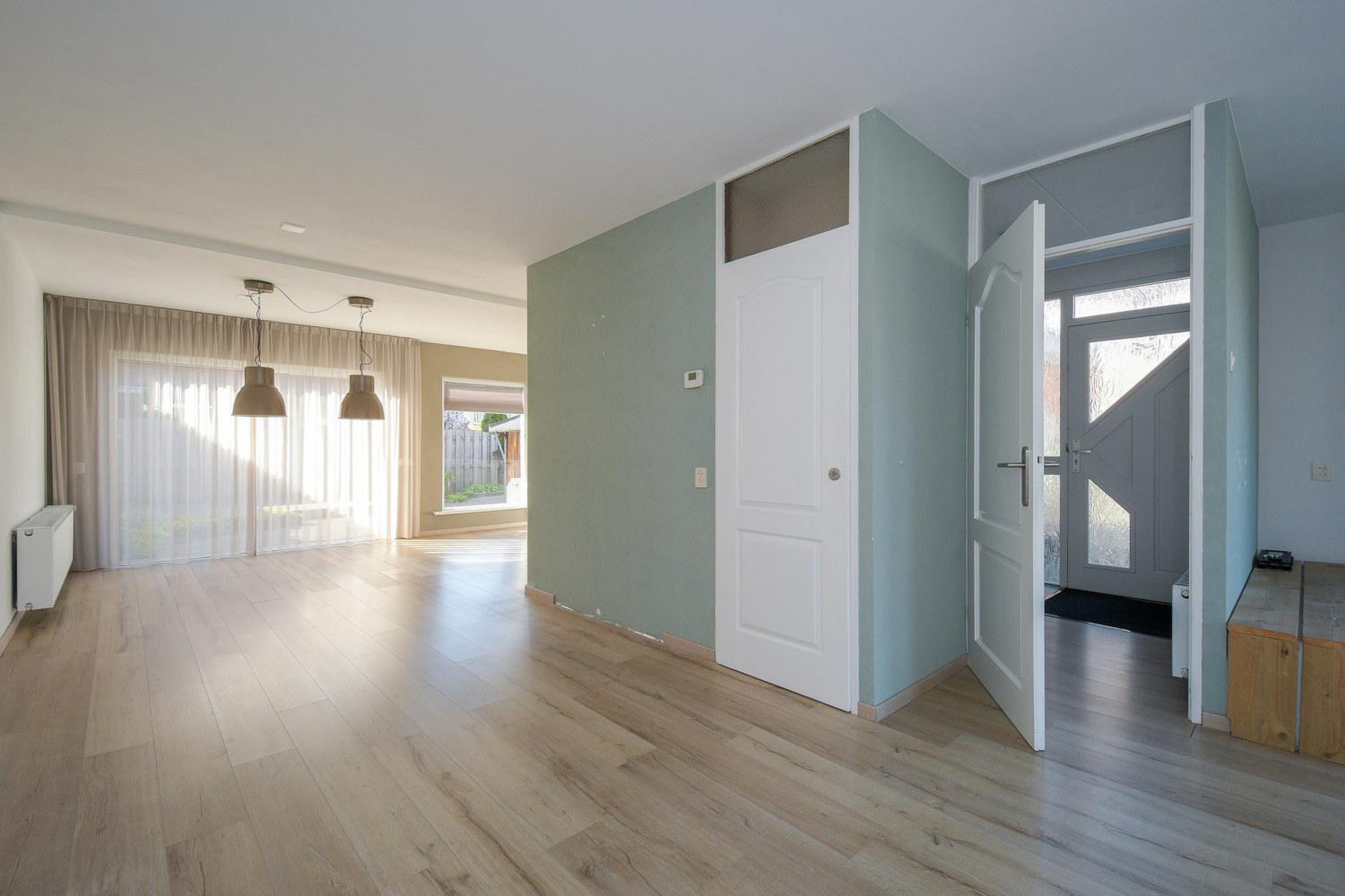 Entree, toilet met fonteintje, meterkast inclusief 3 fasen aansluiting, trapopgang naar eerste verdieping. De gezellige woonkamer heeft een fraaie laminaatvloer. De houtkachel zorgt voor sfeer en extra warmte in herfst en winter. De woonkamer heeft door de vele ramen veel lichtinval en een vrij uitzicht over de straat.