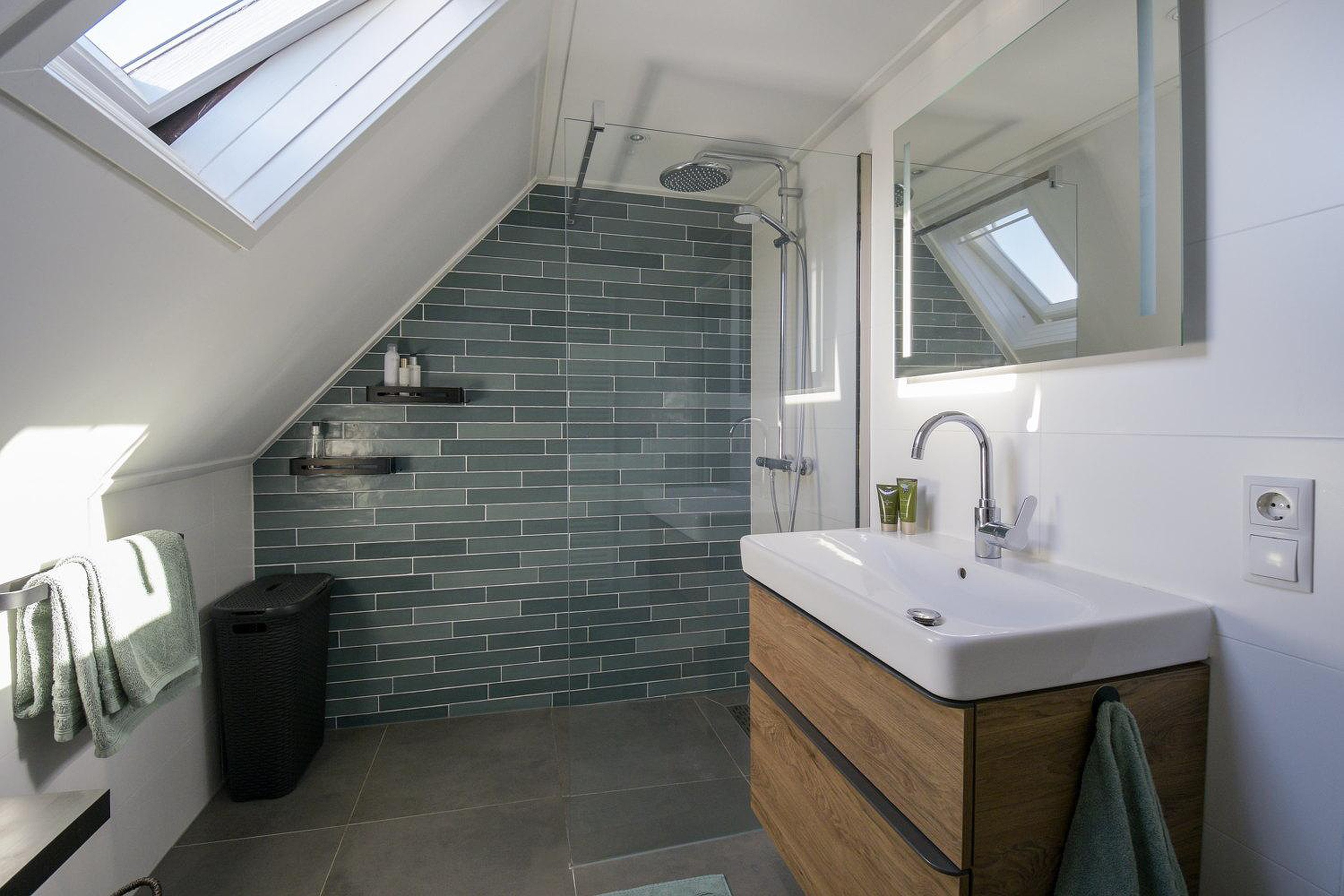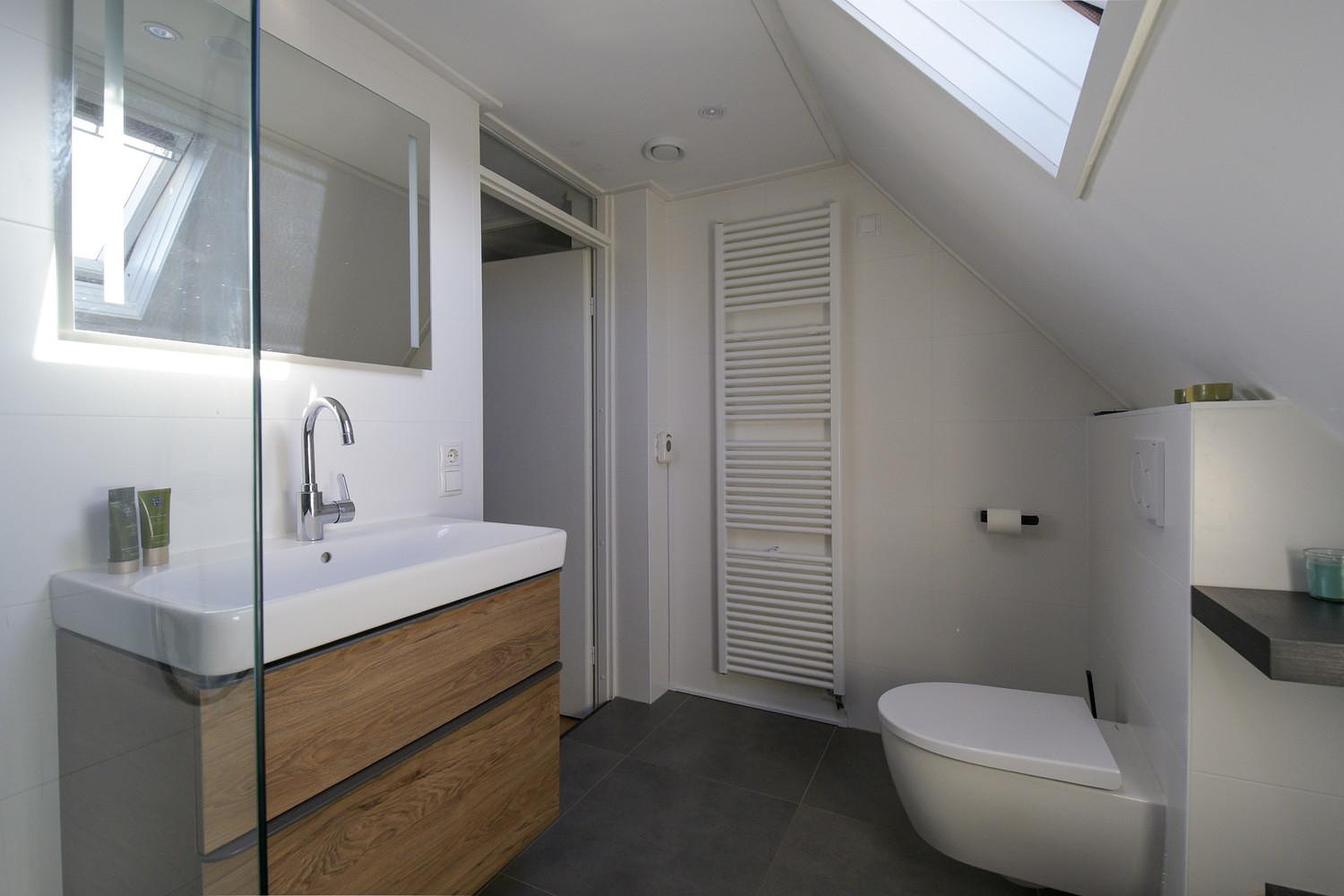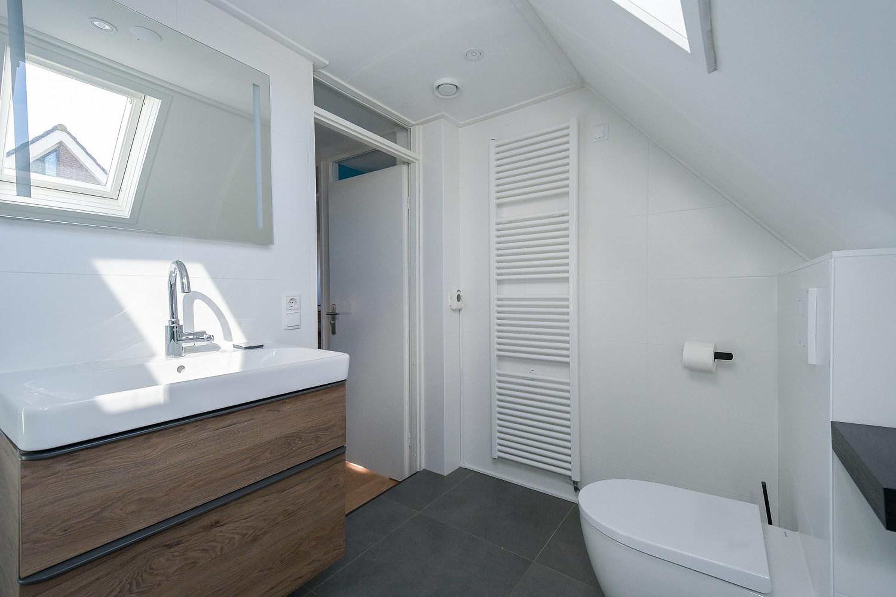 Op de eerste verdieping bevinden zich 3 slaapkamers, waarvan één voorzien is van een dakkapel, die zorgt voor extra ruimte en lichtinval. De moderne luxe badkamer (2022) beschikt over een inloopdouche, wastafelmeubel en tweede toilet (wandcloset).