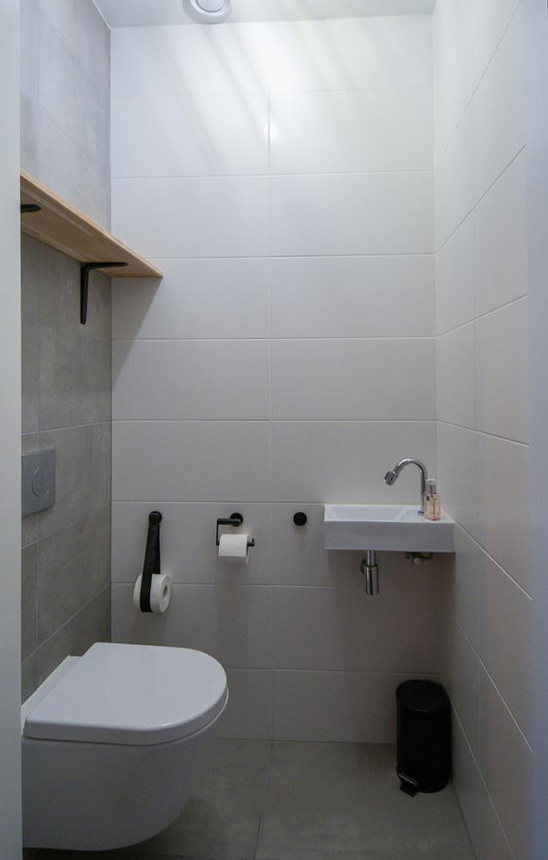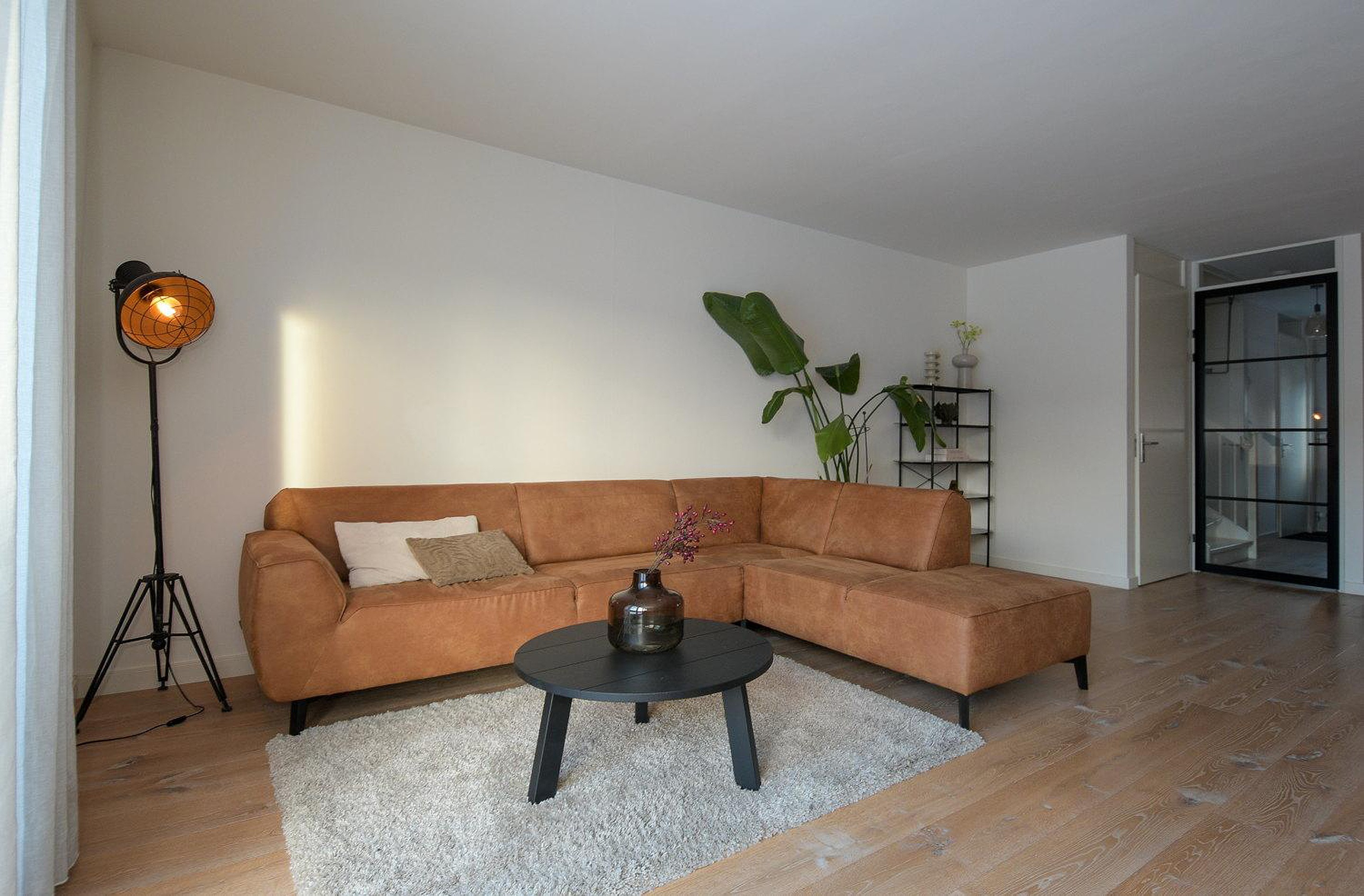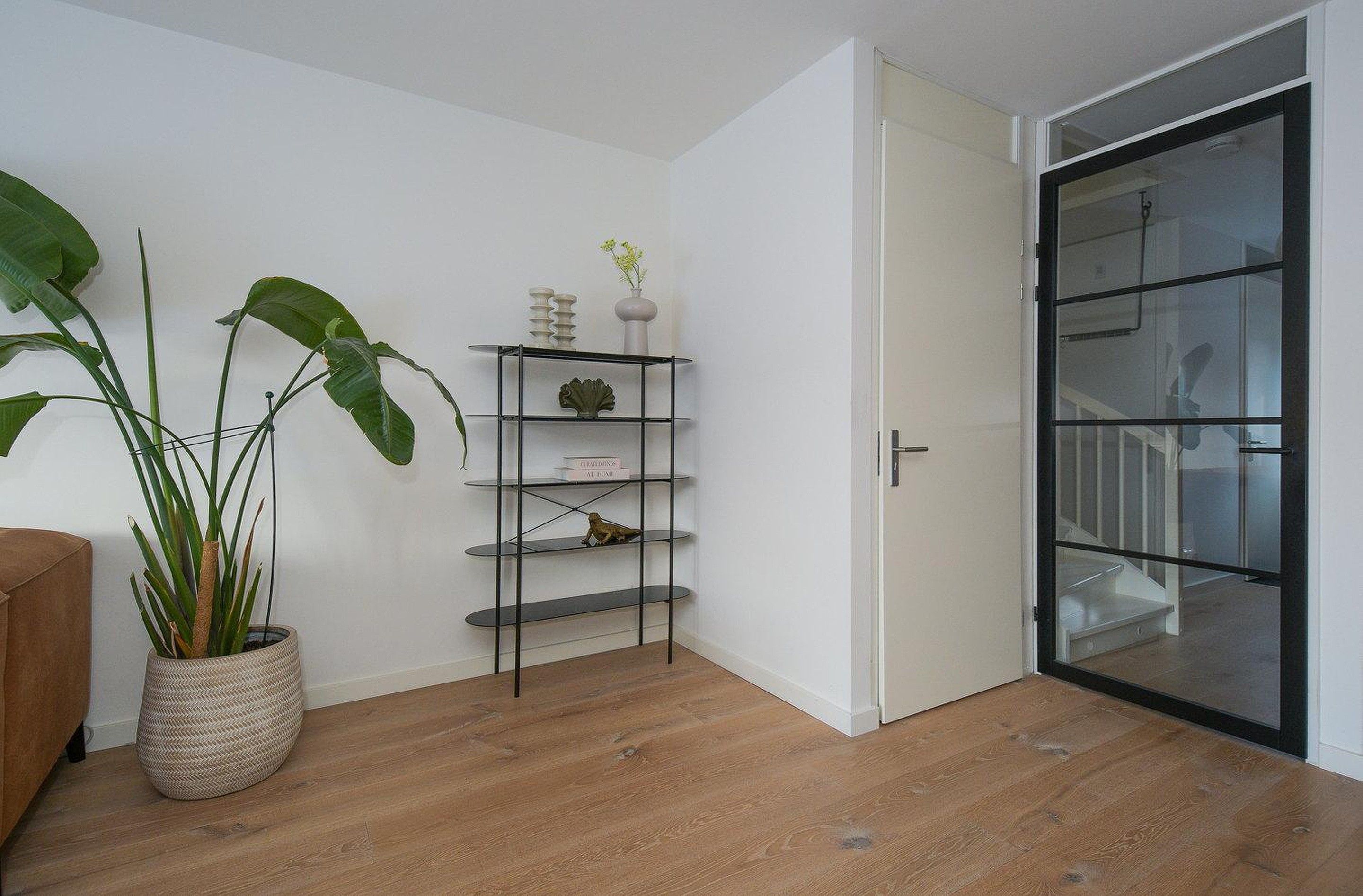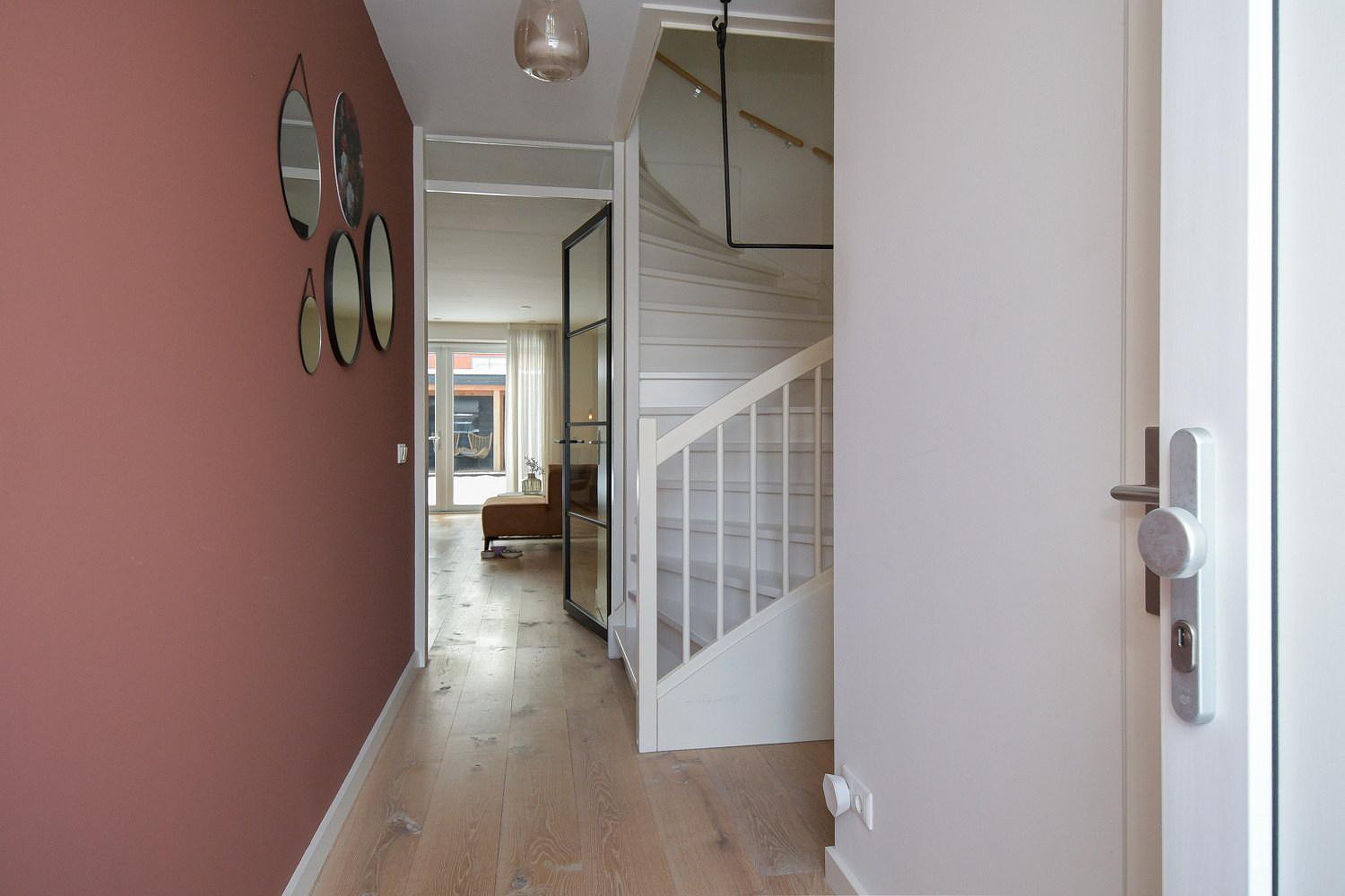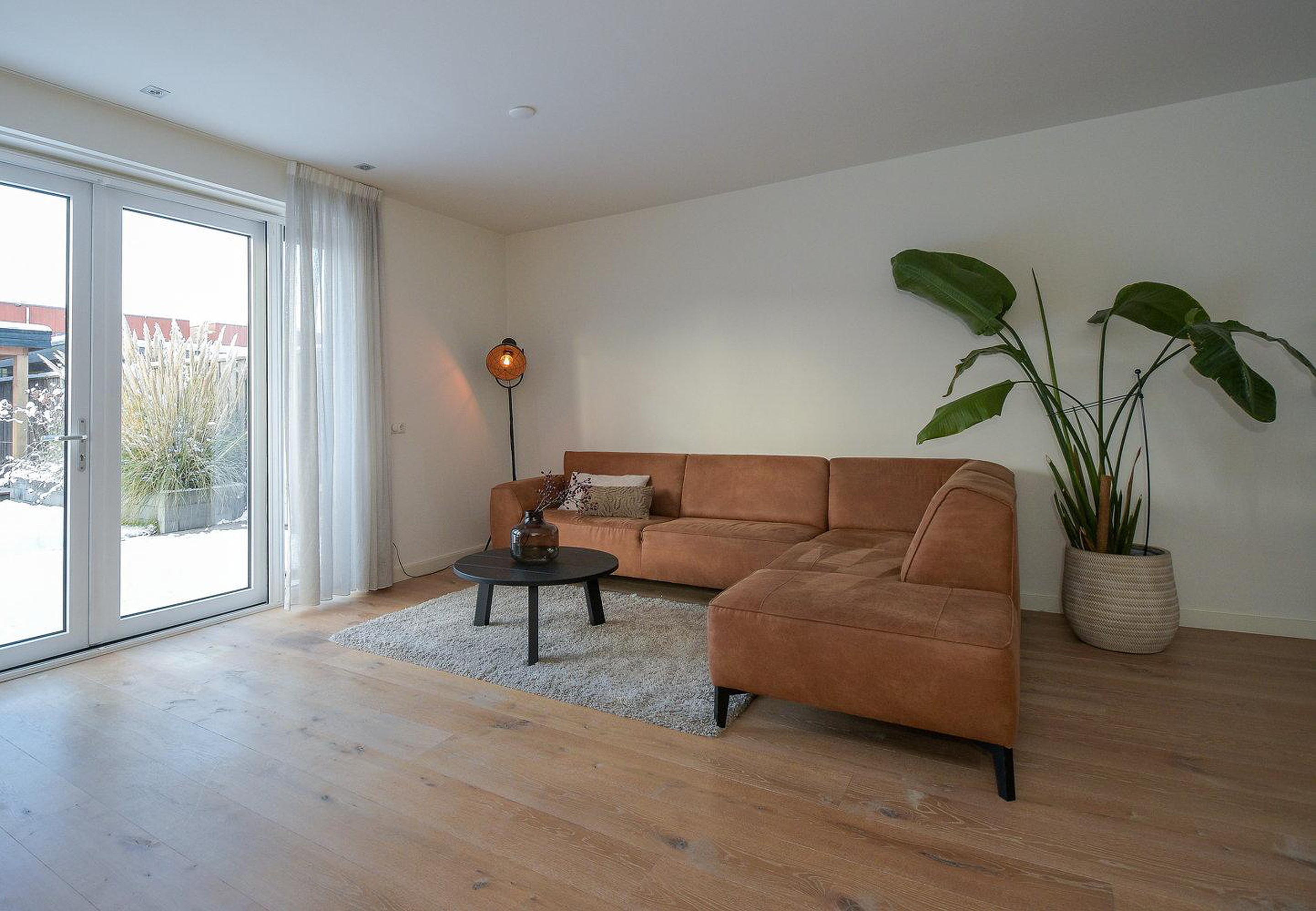 Begane grond Entree, modern toilet (wandcloset) met fonteintje, meterkast, trapopgang naar eerste verdieping. De stijlvolle stalen scharnierdeur geeft toegang tot de woonkamer, is vervaardigd uit zwart, gepoedercoat staal en geeft door het glas een ruimtelijk effect. De woonkamer is tijdens de bouw met 2,4 meter uitgebouw waardoor er een grote lichte ruimte is gecreëerd met openslaande tuindeuren naar het terras. Op de vloer ligt een warme sfeervolle eiken houten vloer puur wit 22 cm breed met vloerverwarming.