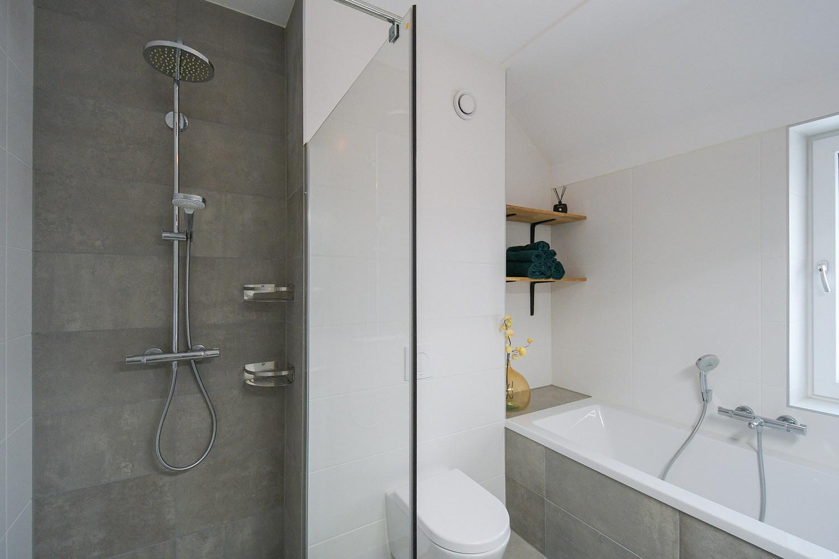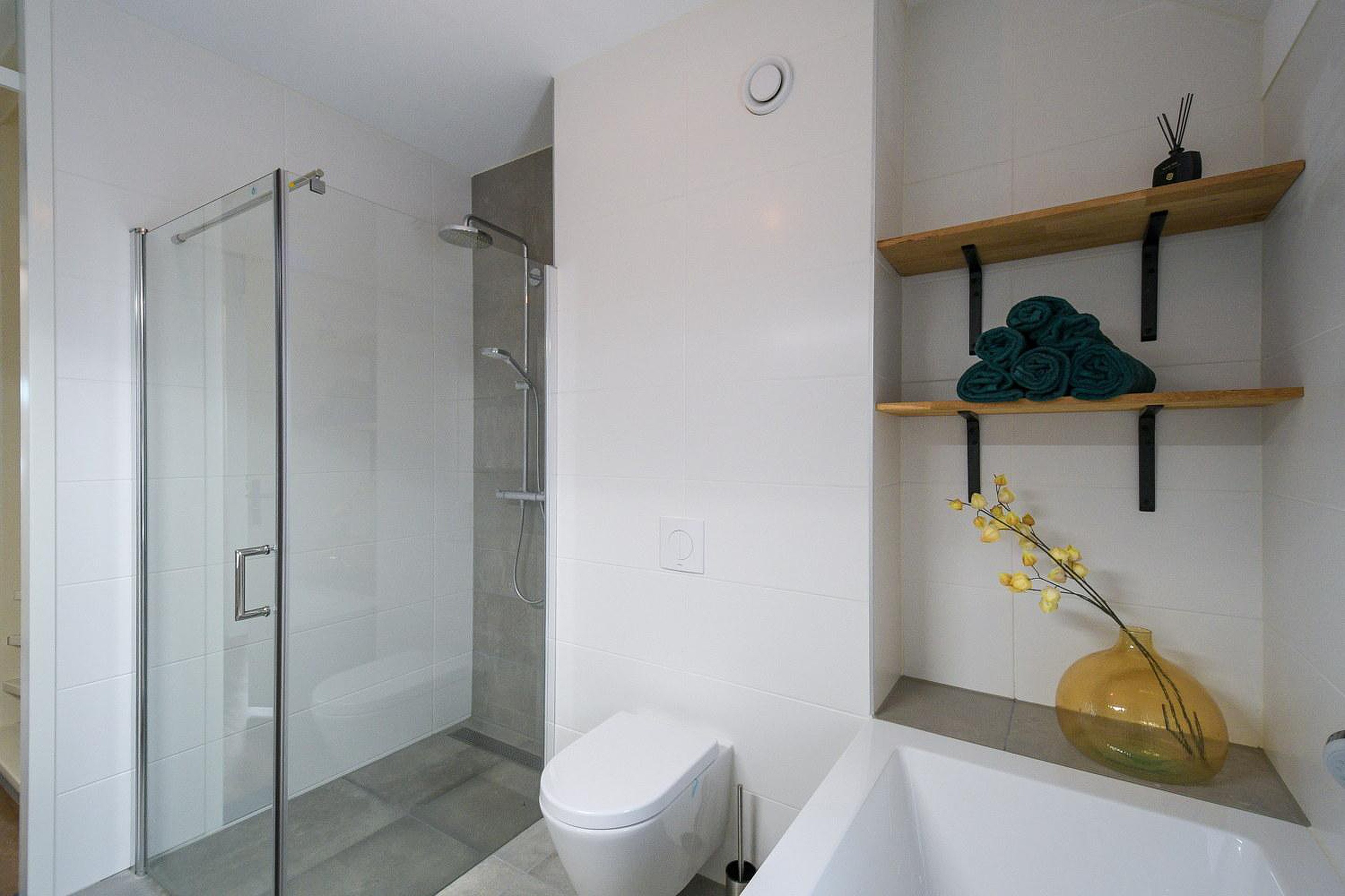Eerste verdieping Op de eerste verdieping bevinden zich drie slaapkamers met een oppervlakte van respectievelijk ca 11,3 m2, 8,4 m2 en 17,9 m2. De hele verdieping beschikt over een prachtige PVC vloer (eiken) met vloerverwarming. De moderne luxe badkamer, geheel betegeld in modieuze kleurstelling, beschikt over een inloopdouche met regen- en handdouche, wastafelmeubel met dubbele wasbak, ligbad en tweede toilet met wandcloset.