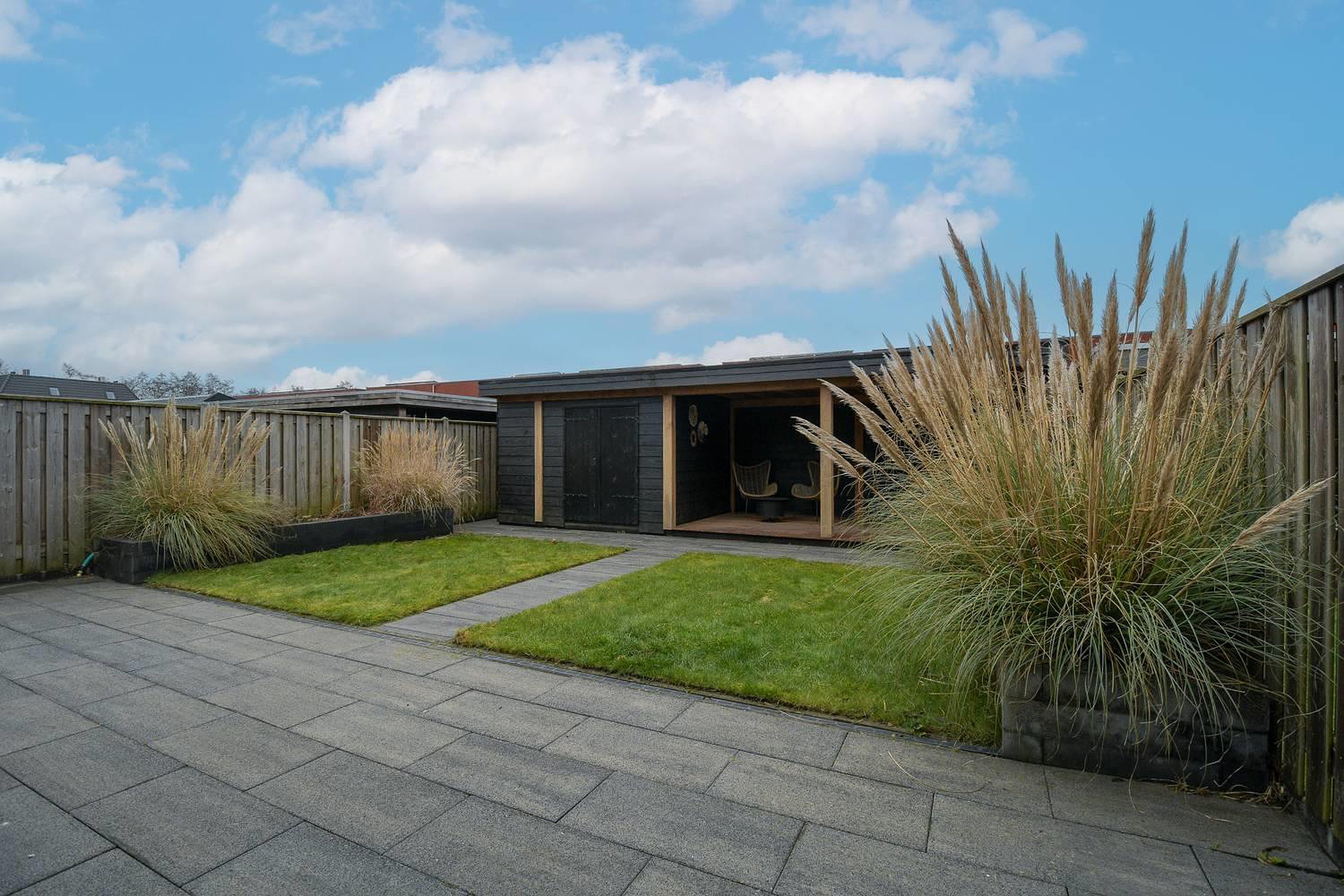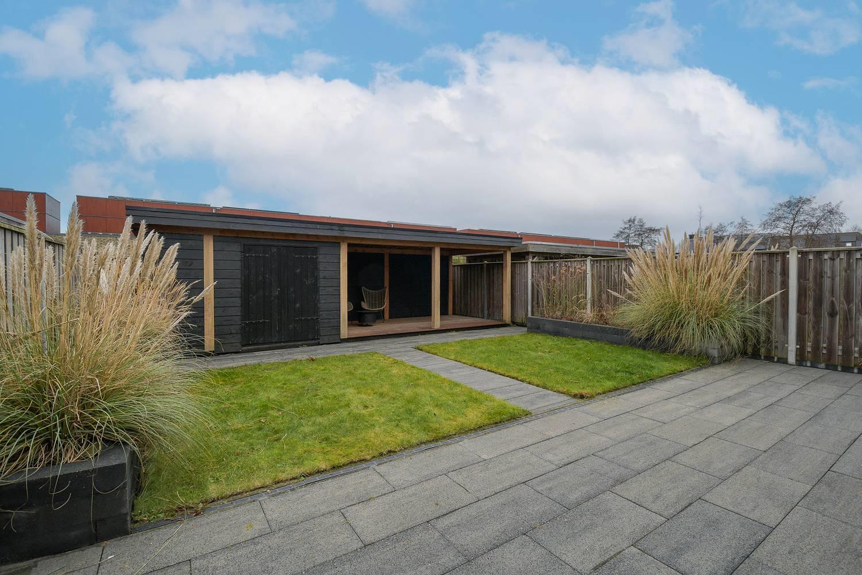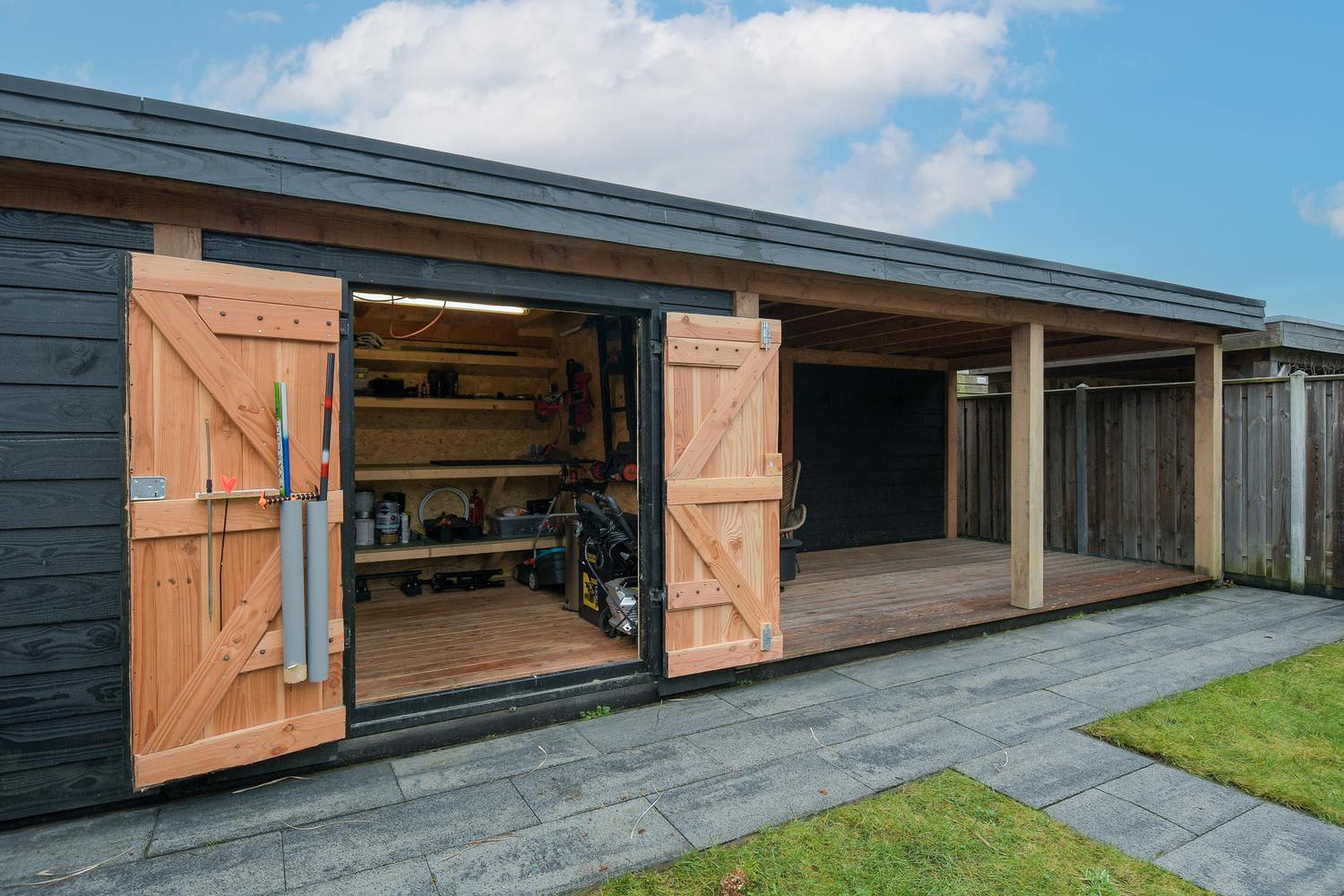 Tuin De tuin is gelegen op het zuidwesten en biedt een heerlijke plek om te relaxen. Over de volle breedte vind je een prachtige stijlvolle houten overkapping en schuur met een totale oppervlakte van ca 21 m2. Hier zit je tot in de late uurtjes droog en gezellig buiten. In de schuur is er meer dan genoeg plek voor fietsen en tuingereedschap.