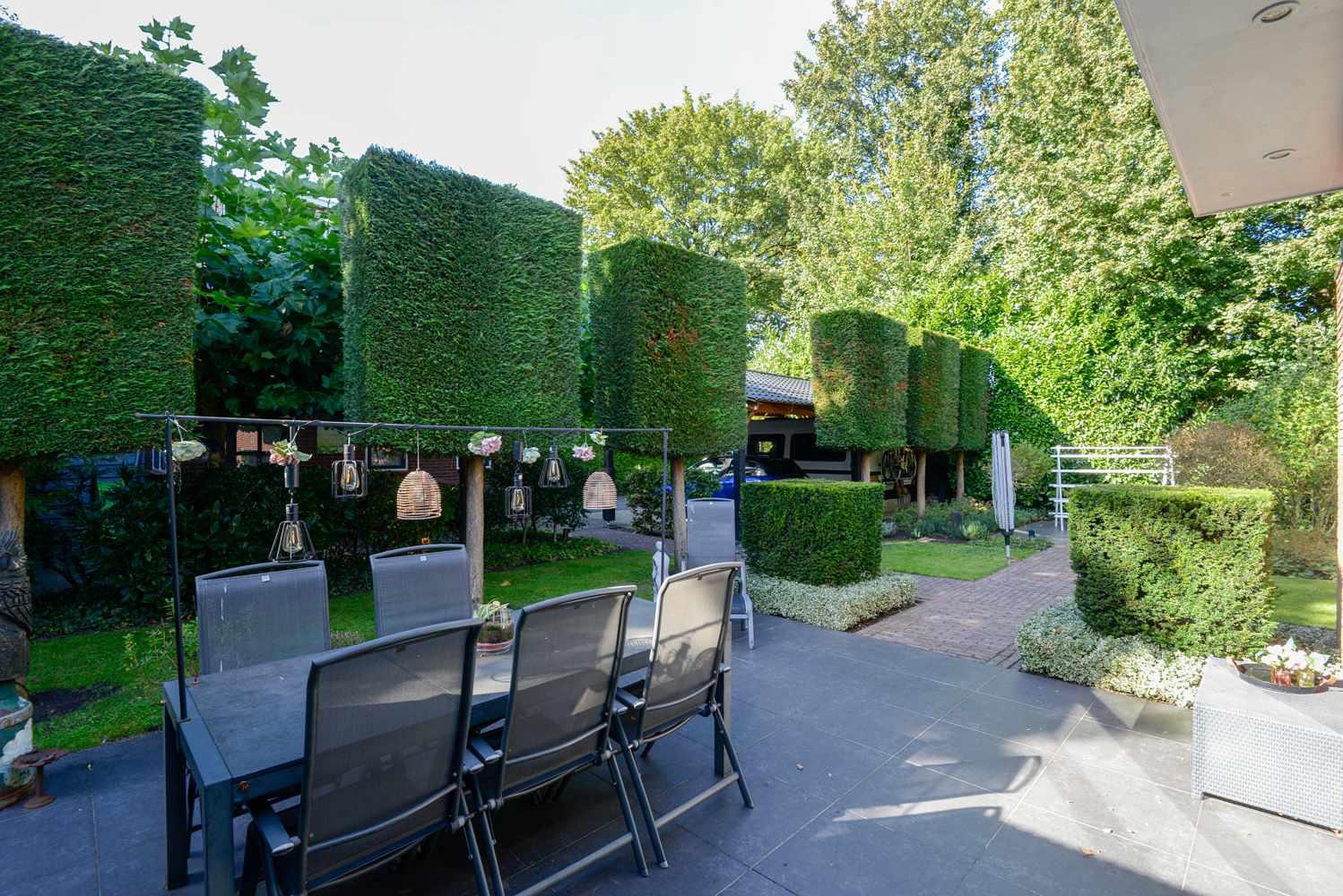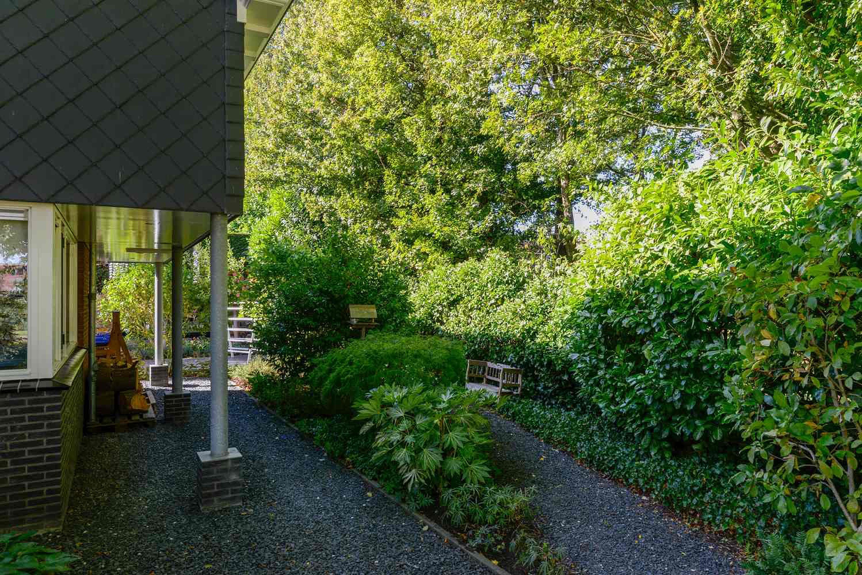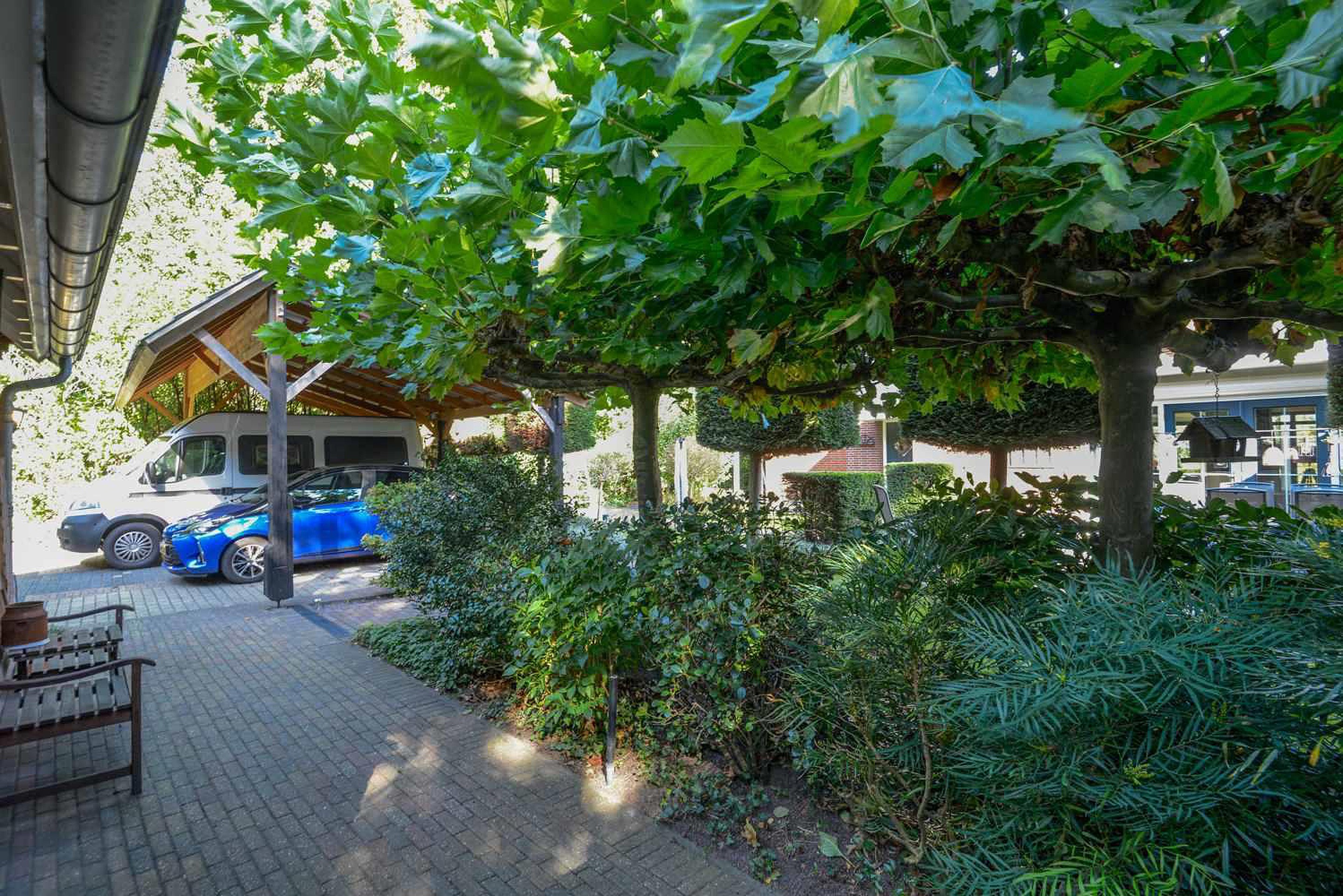 De tuin is een ontwerp van tuinarchitect Rob Verlinden. Een ware eyecatcher - een plek waar design en natuur samenkomen. Een prachtige plek met diverse terrassen waar je heerlijk kunt ontspannen. Een tuin met veel groen en aan de voorzijde een prachtige beukeboom met een op maat gemaakt houten bankje waar je eindeloos van het uitzicht kunt genieten. Daarnaast is er nog een vrijstaande houten schuur met kap. De grote stenen garage heeft eveneens een kap en een elektrische deur. De aparte carport biedt ruimte aan meerdere auto’s. Het erf is toegankelijk aan de zijkant van de woning met een elektrisch bedienbaar toegangshek en een lange oprit naar de garage.