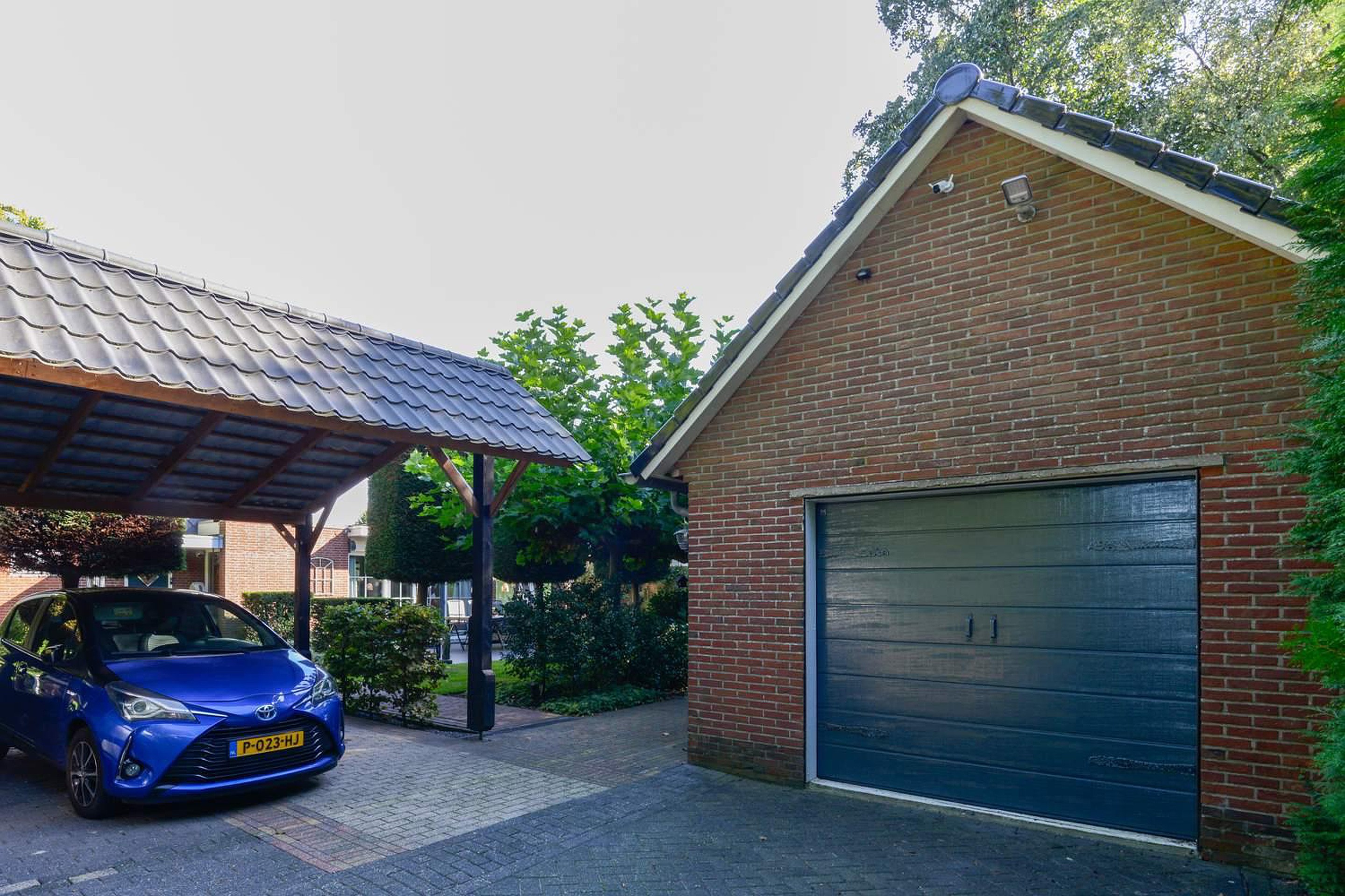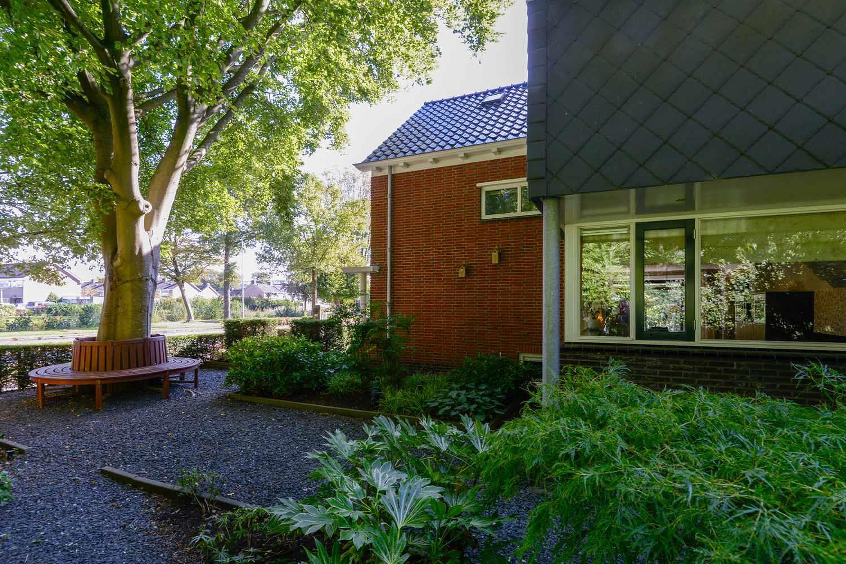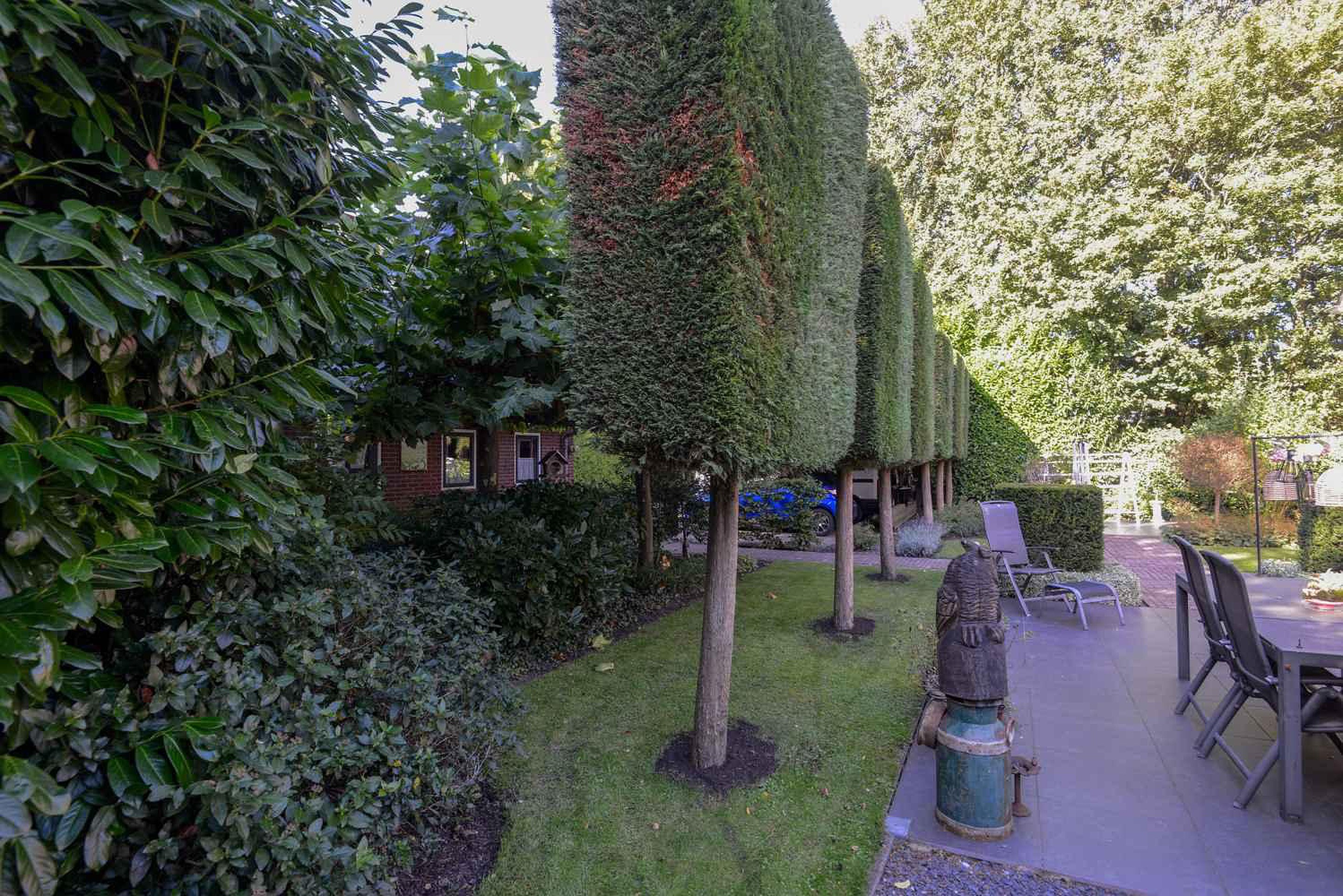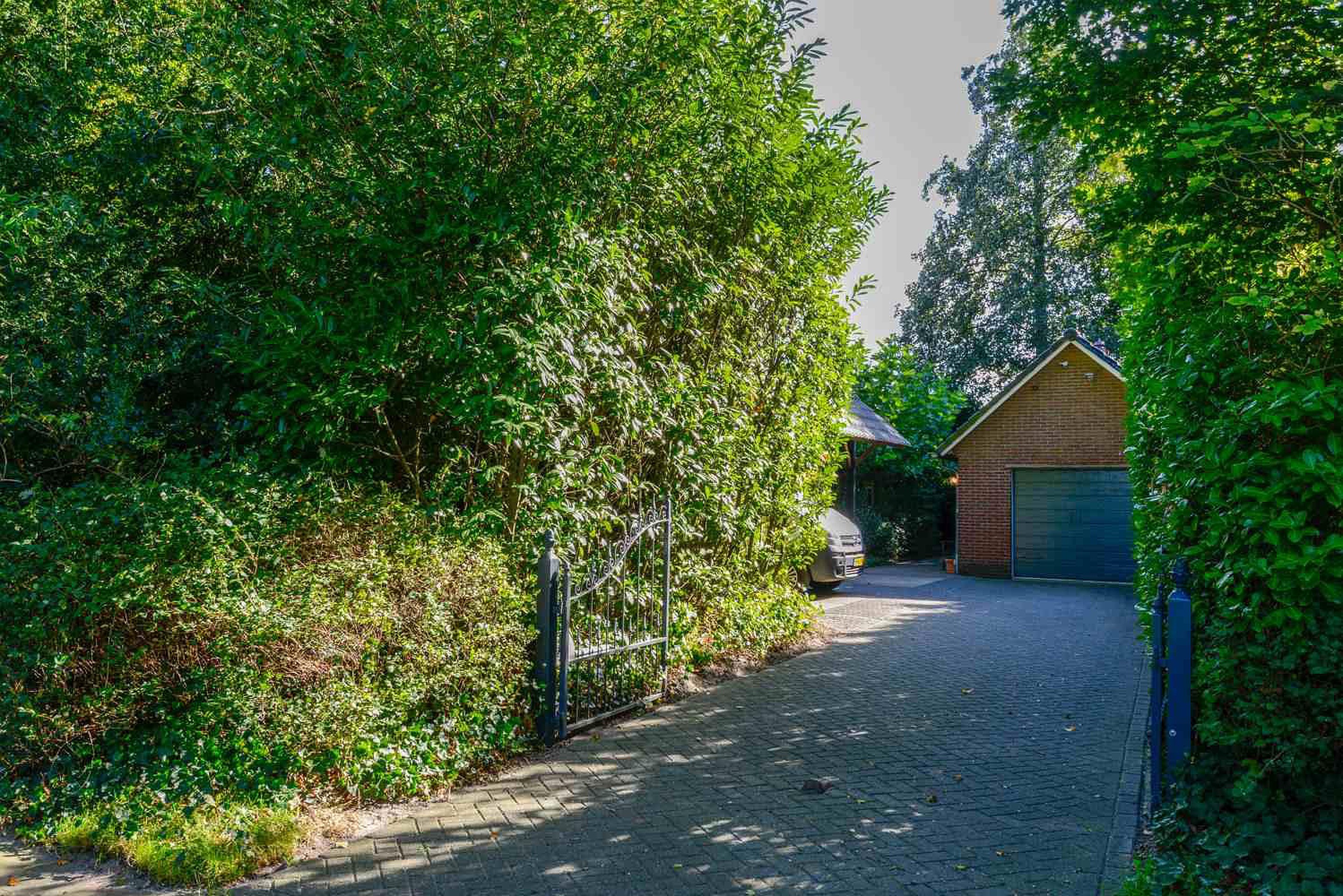 De tuin is een ontwerp van tuinarchitect Rob Verlinden. Een ware eyecatcher - een plek waar design en natuur samenkomen. Een prachtige plek met diverse terrassen waar je heerlijk kunt ontspannen. Een tuin met veel groen en aan de voorzijde een prachtige beukeboom met een op maat gemaakt houten bankje waar je eindeloos van het uitzicht kunt genieten. Daarnaast is er nog een vrijstaande houten schuur met kap. De grote stenen garage heeft eveneens een kap en een elektrische deur. De aparte carport biedt ruimte aan meerdere auto’s. Het erf is toegankelijk aan de zijkant van de woning met een elektrisch bedienbaar toegangshek en een lange oprit naar de garage.