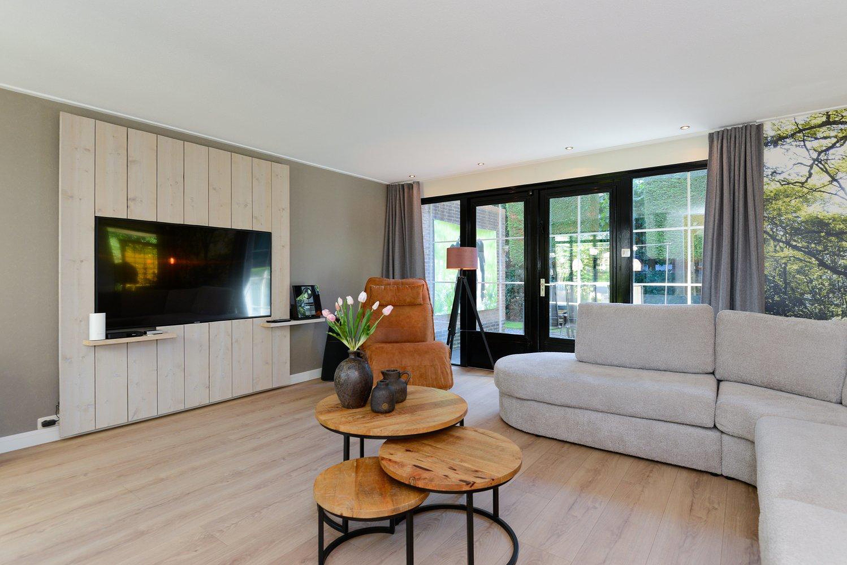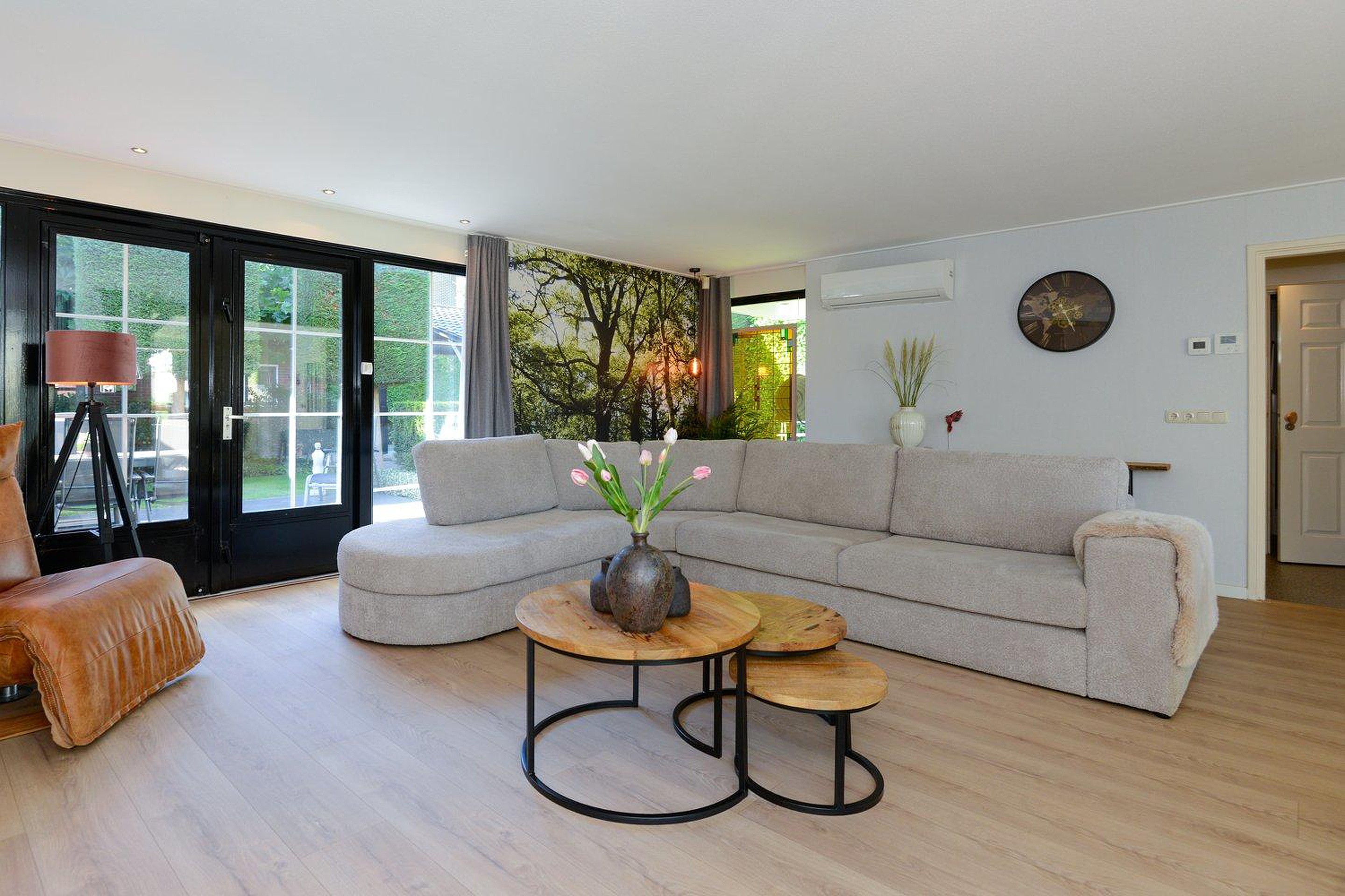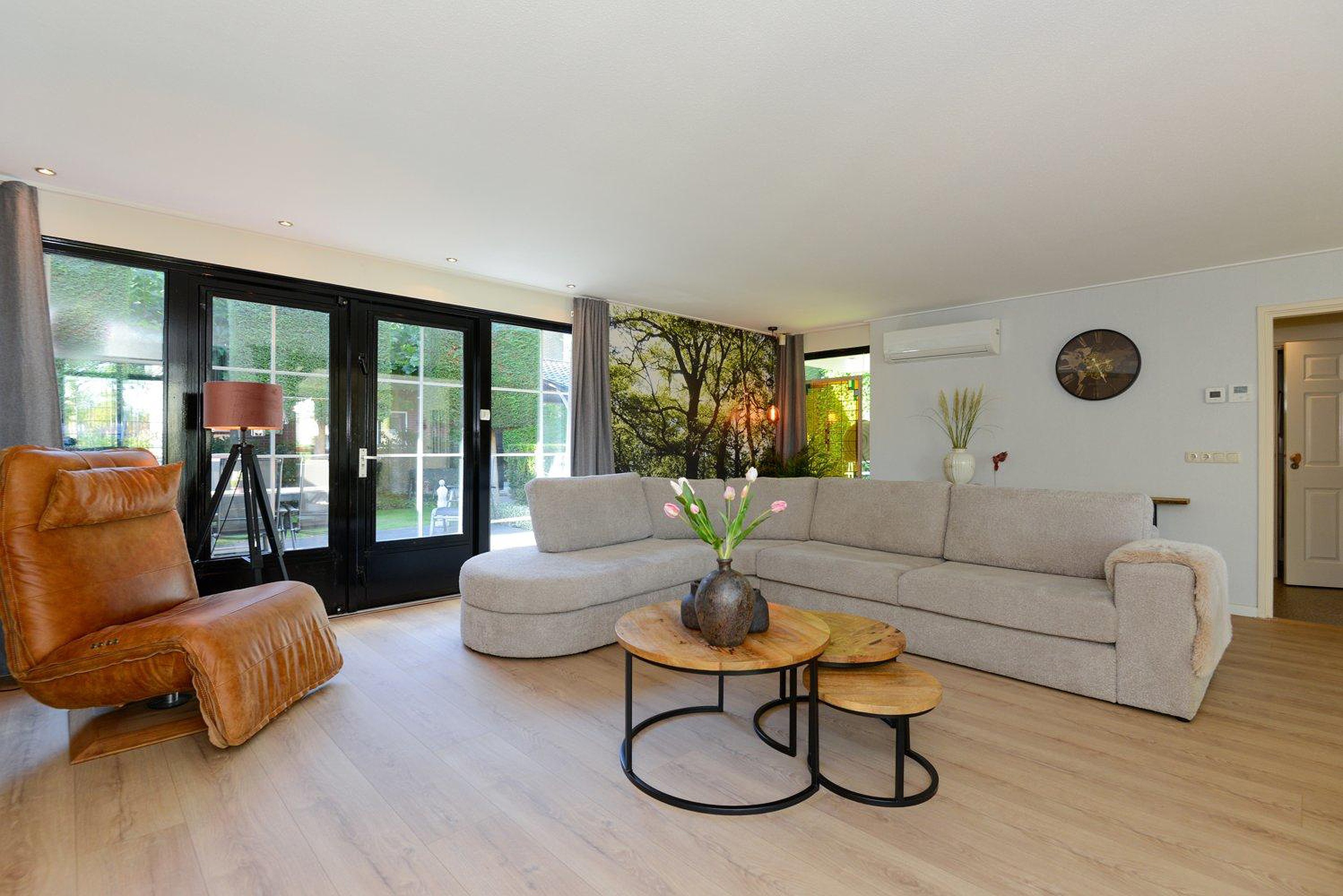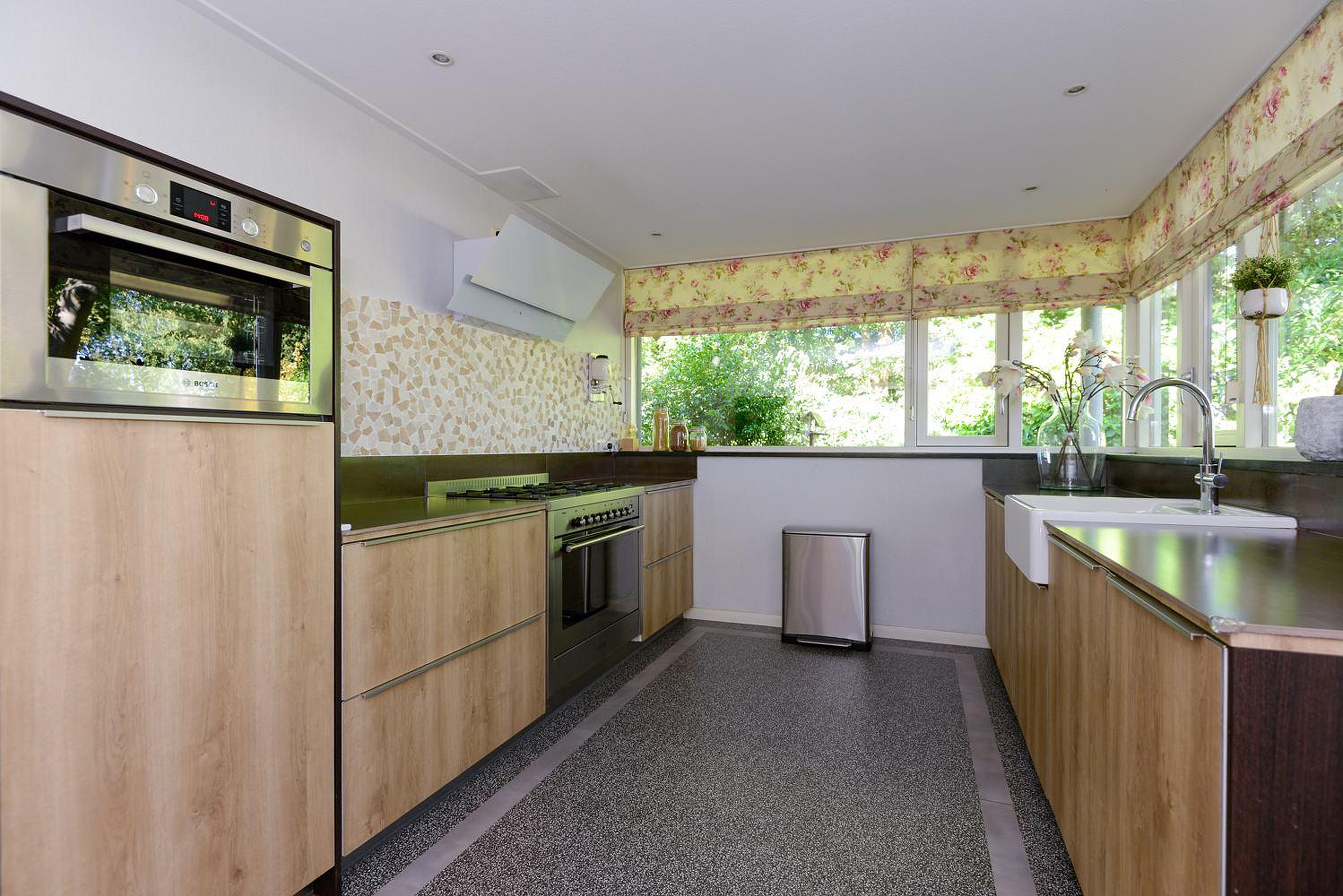 Entree, meterkast, ruimte hal en trapopgang naar de eerste verdieping. Aan de voorzijde van de woning bevindt zich een zithoek met uitzicht over de straat, in het midden de eetkamer en aan de tuinzijde een riante living met openslaande tuindeuren naar het terras. Een groot elektrisch zonnescherm met knik arm zorgt voor de nodige schaduw. De moderne luxe keuken is voorzien van diverse inbouwapparatuur, waaronder; magnetron, heteluchtoven, koffiezetapparaat, Grohe red boiler en vaatwasser. Vanuit de keuken heb je rondom zicht over de fraaie tuin.