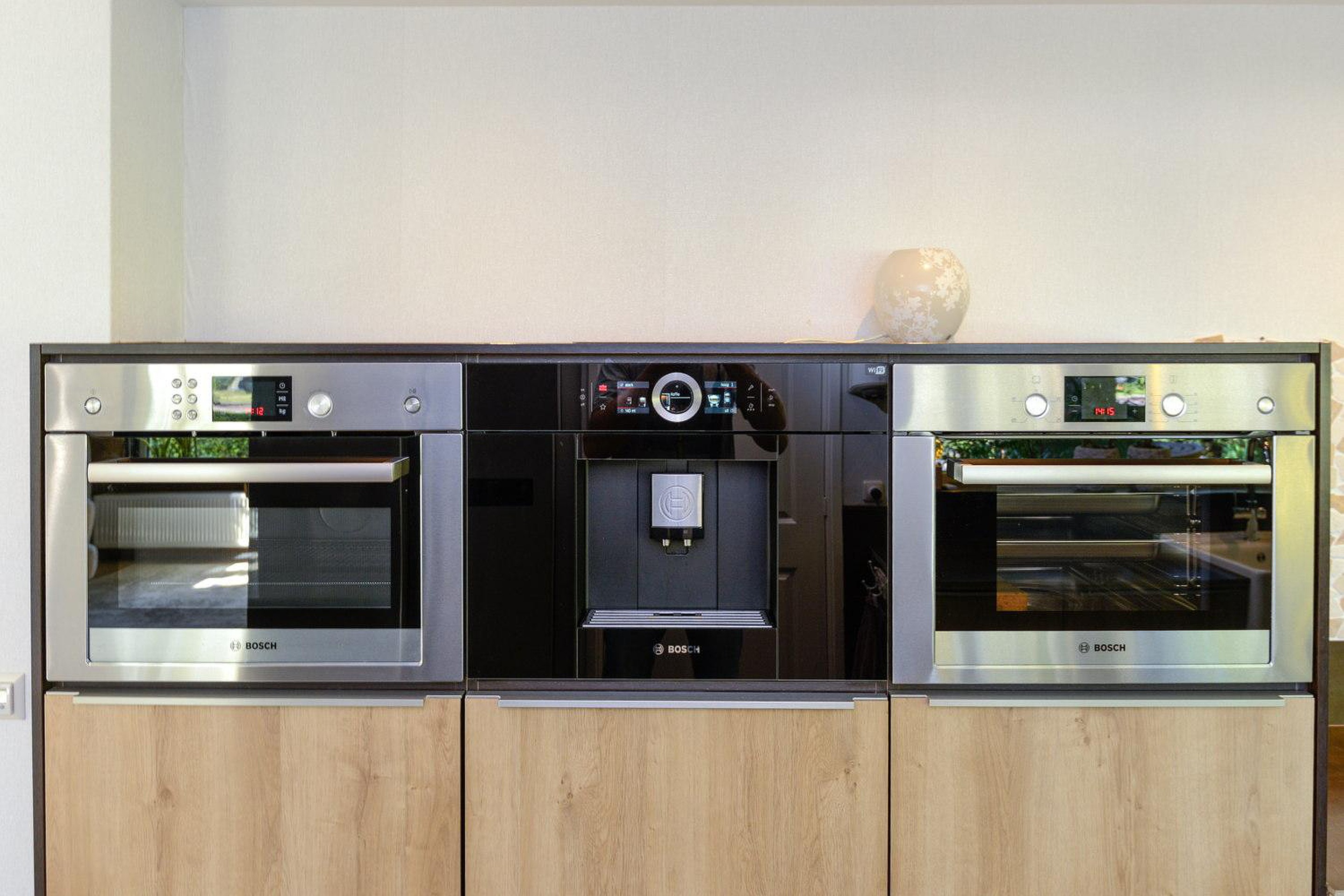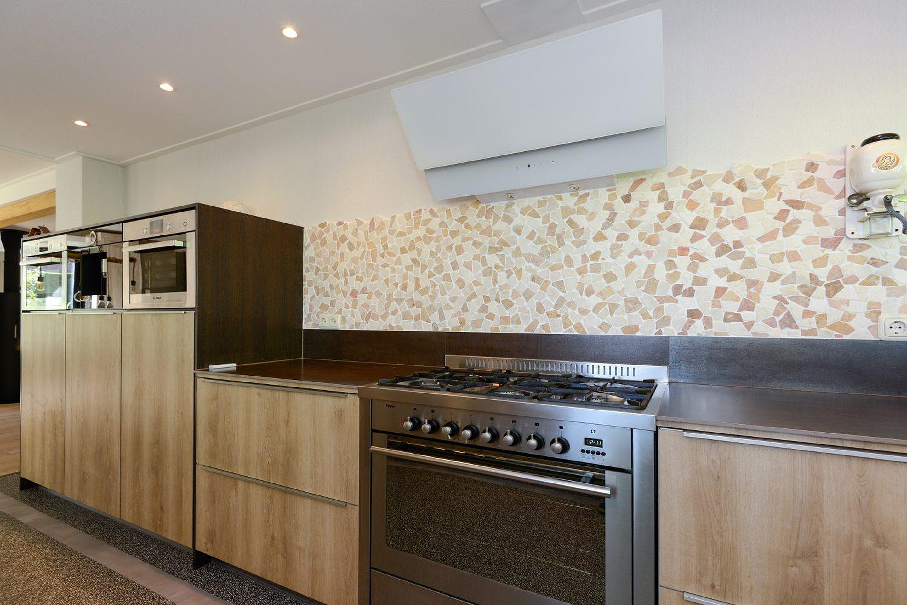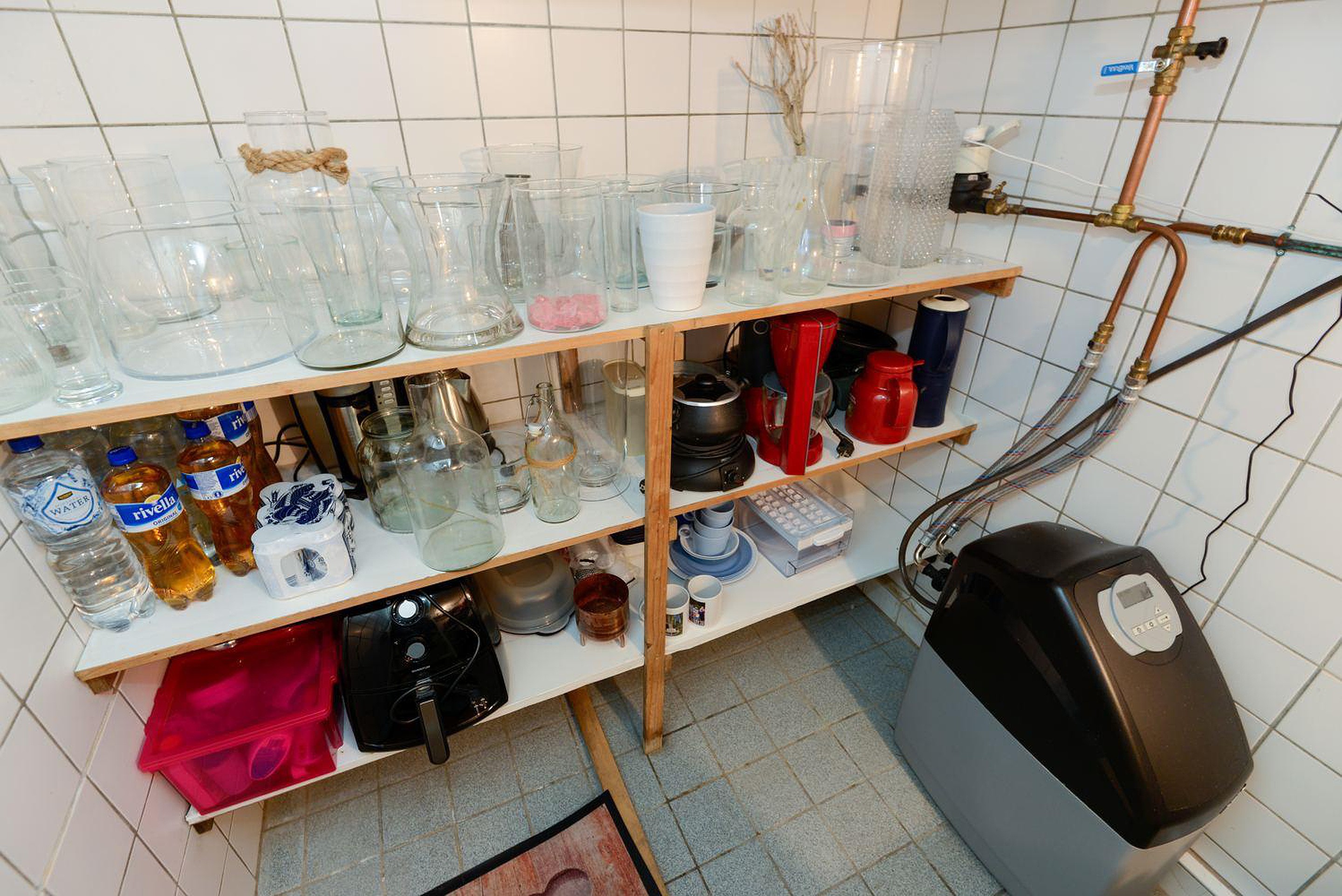 De moderne luxe badkamer is van alle gemakken voorzien; inloopdouche met regen- en handdouche, dubbel wastafelmeubel en ligbad. In een separate ruimte bevindt zich het moderne luxe toilet (wandcloset). De kelder met stahoogte heeft een oppervlakte van ca 5 m2 en is heerlijk koel in de zomer; een prima ruimte voor opslag van wijn en proviand. In de kelder bevindt zich ook de waterontharder. In de hal grenzend aan de badkamer bevinden zich de hybride warmte pomp en de witgoedaansluitingen in afgesloten ruimtes.