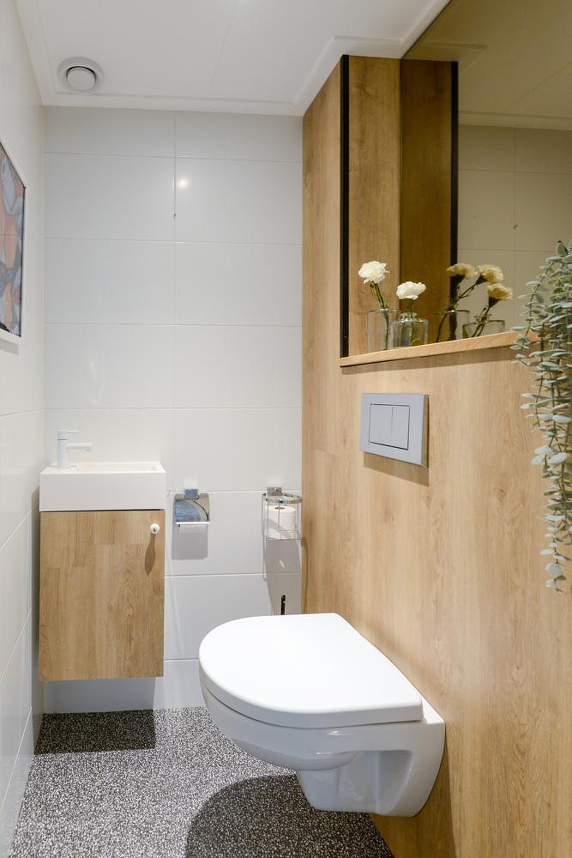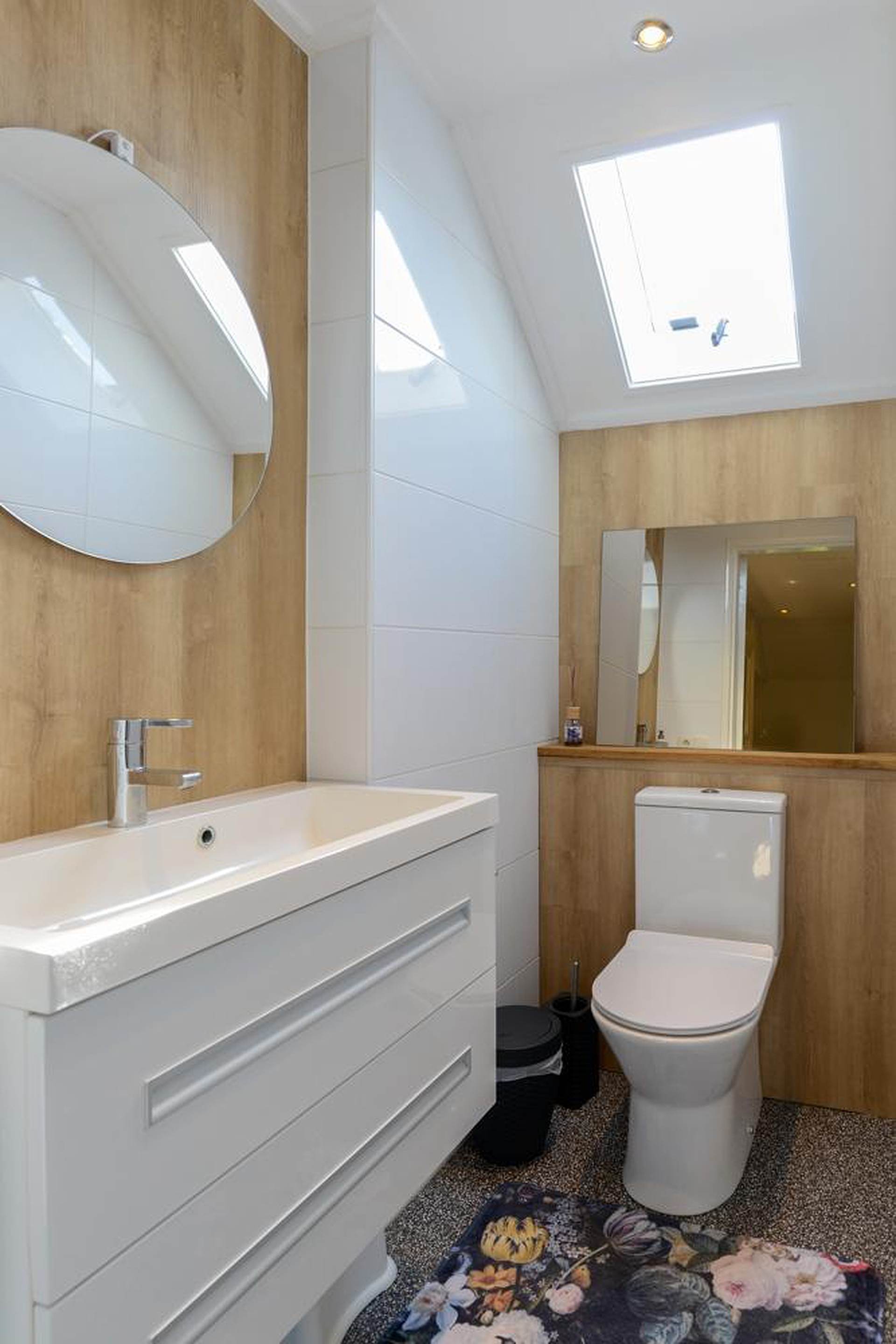 Op de begane grond bevindt zich een moderne luxe badkamer van alle gemakken voorzien en met een separate ruimte voor het moderne toilet. Qua afwerking is alles tot in de puntjes verzorgd: kunststof kozijnen met triple glas aan de voorzijde van de woning voor optimale geluidsisolatie, airconditioning, waterontharder en elektrische zonwering. Voor wie duurzaamheid belangrijk vindt, zit hier ook helemaal goed: een hybride warmtepomp (Daikin) met warmtepompboiler, 20 zonnepanelen en een energielabel A+ maken de woning toekomstbestendig én energiezuinig.
