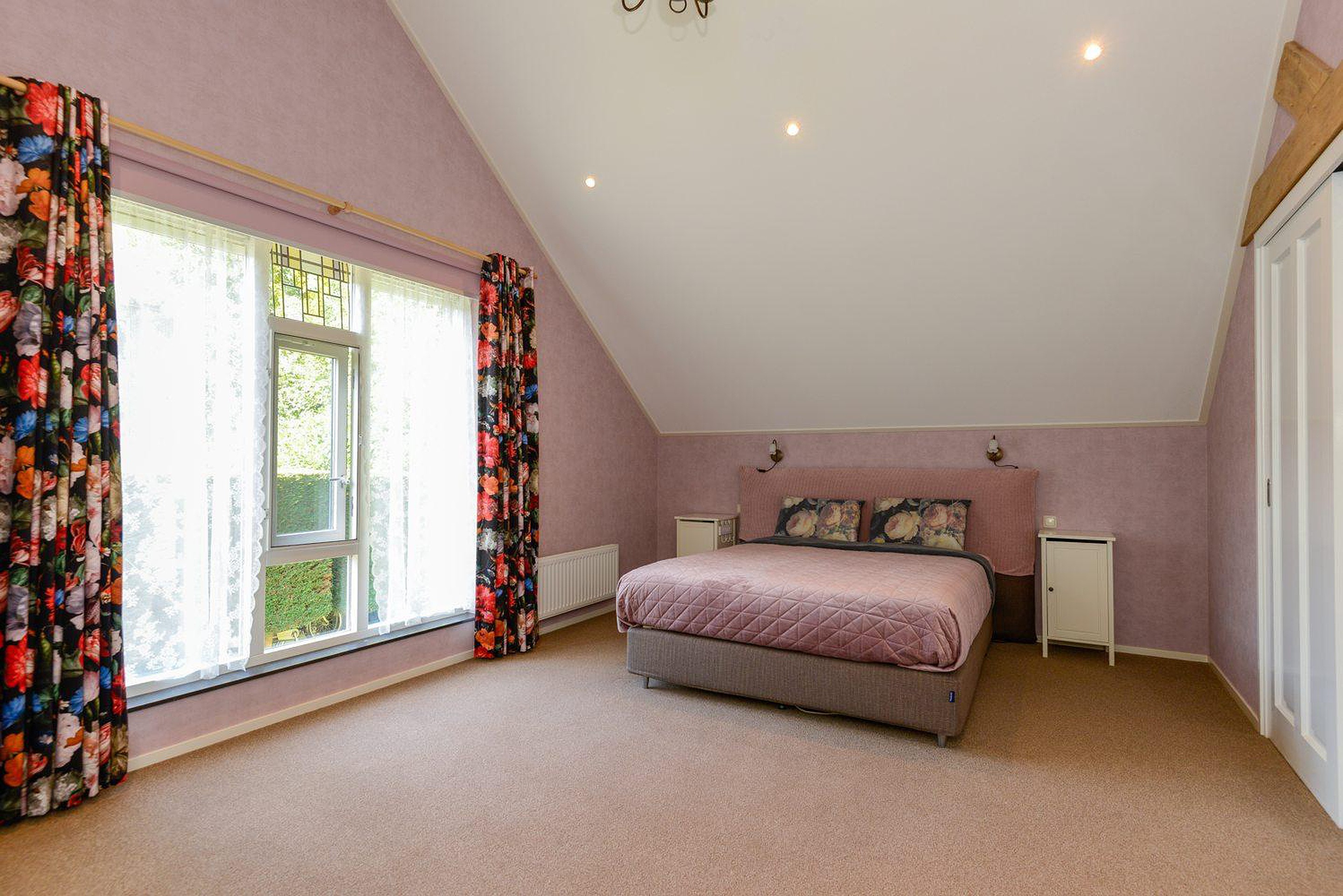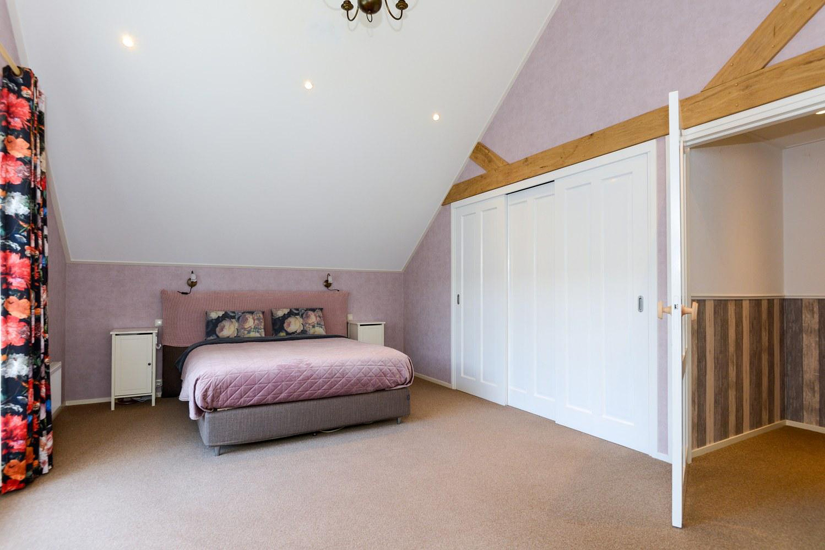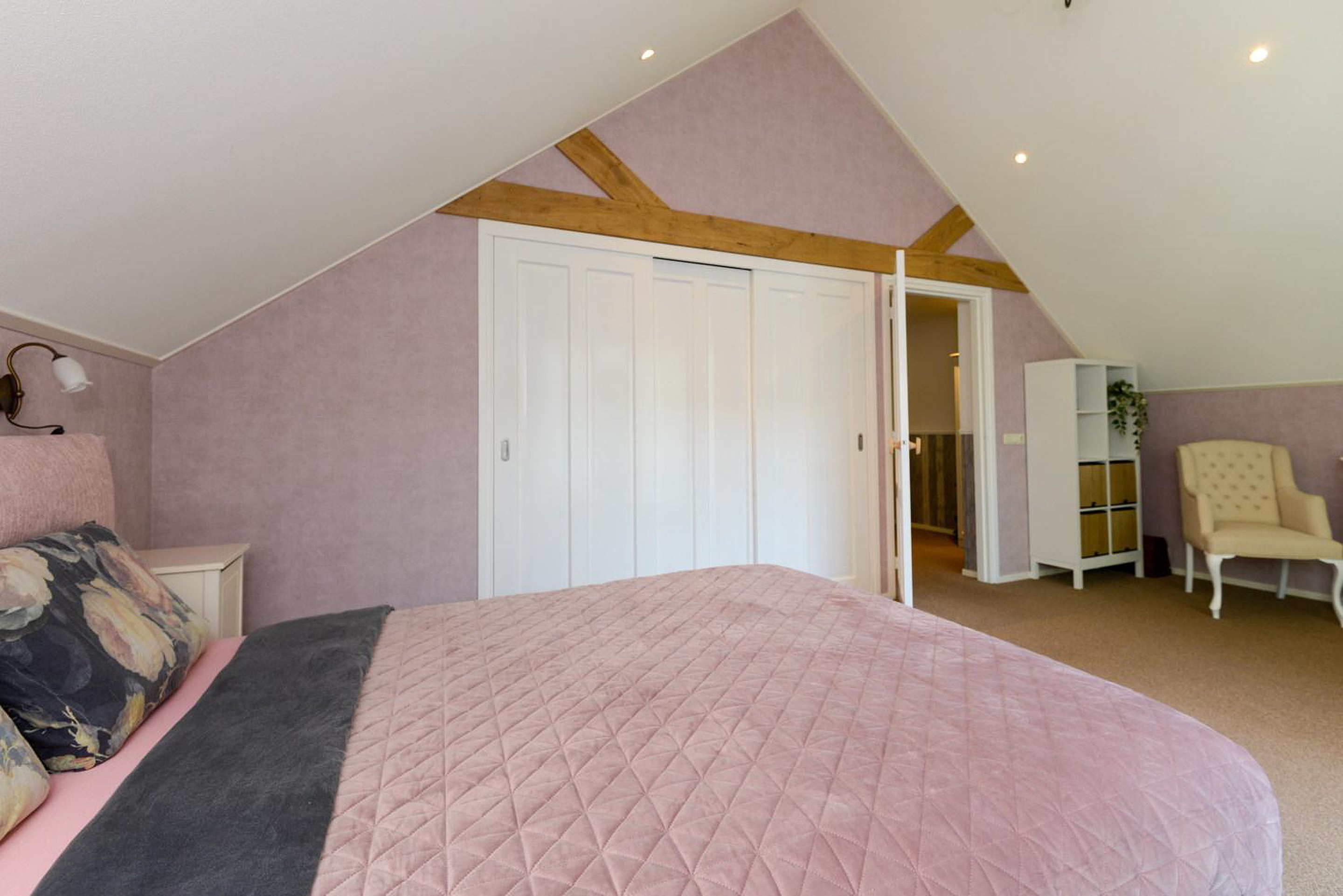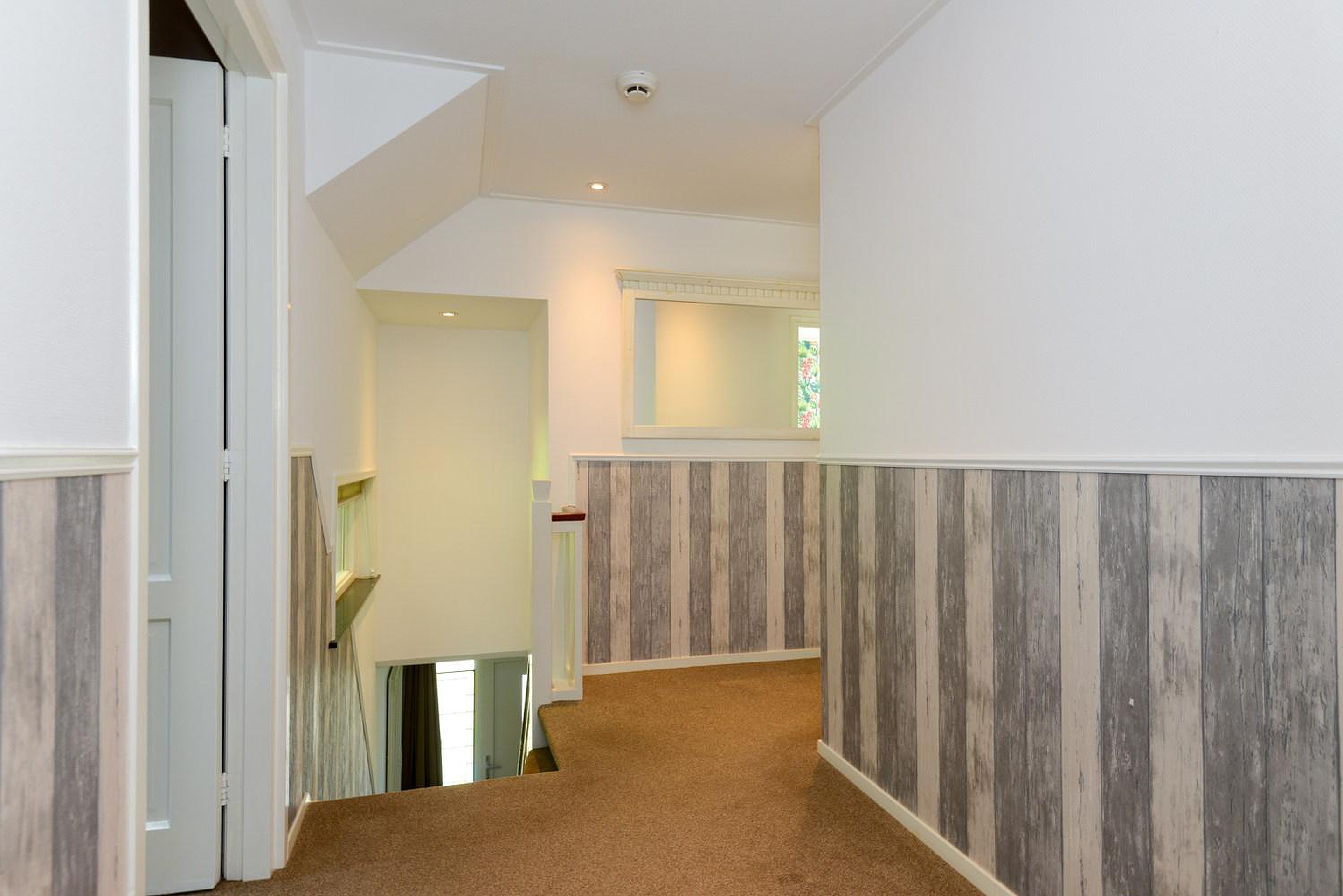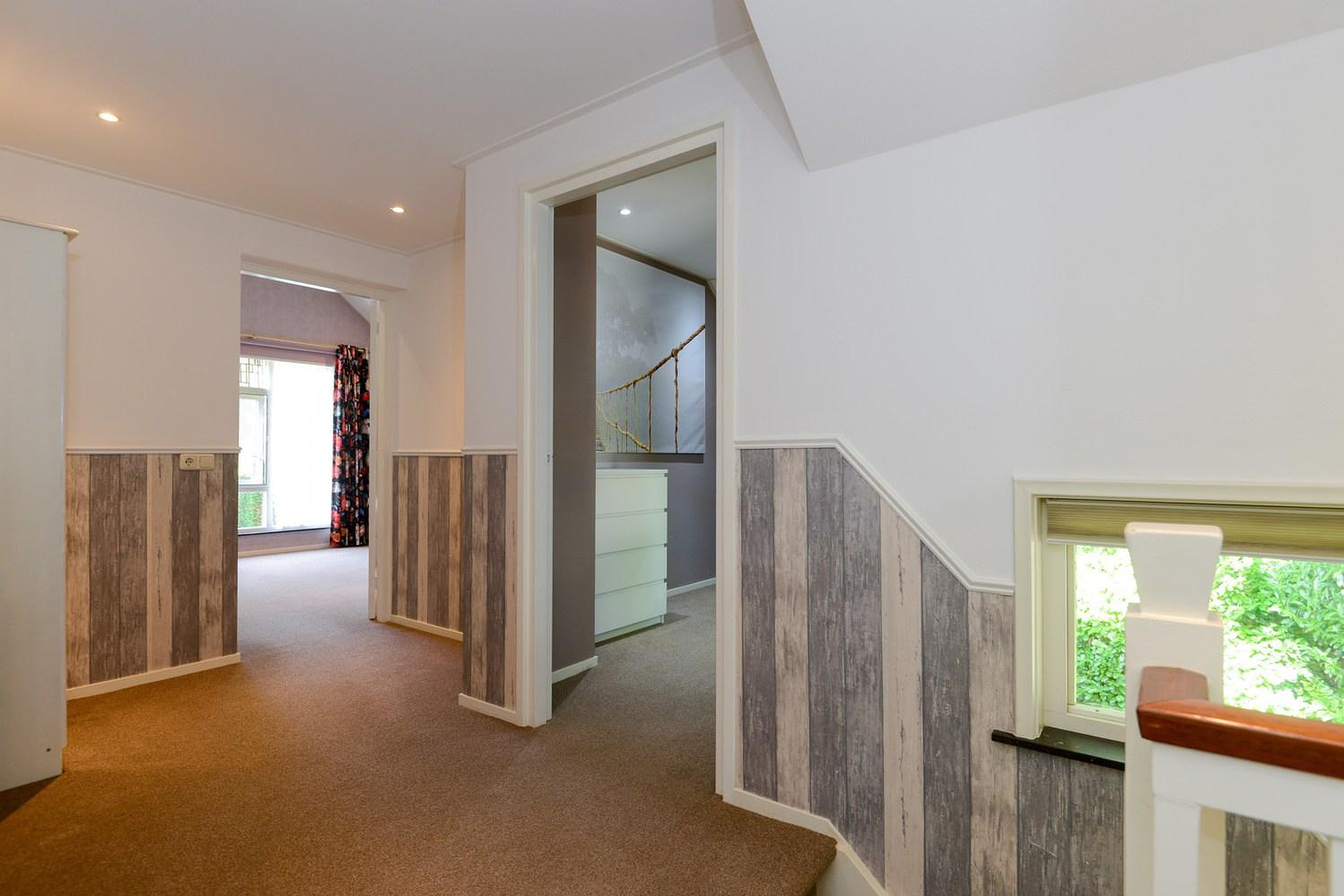 De ruime overloop biedt toegang tot 4 slaapkamers waarvan de grootste een ingebouwde kastenwand heeft. Eén van de kamers heeft een balkon. Er bevindt zich een separate ruimte met een toilet en een wastafelmeubel. Vanuit de overloop is via een vlizotrap de bergzolder bereikbaar.