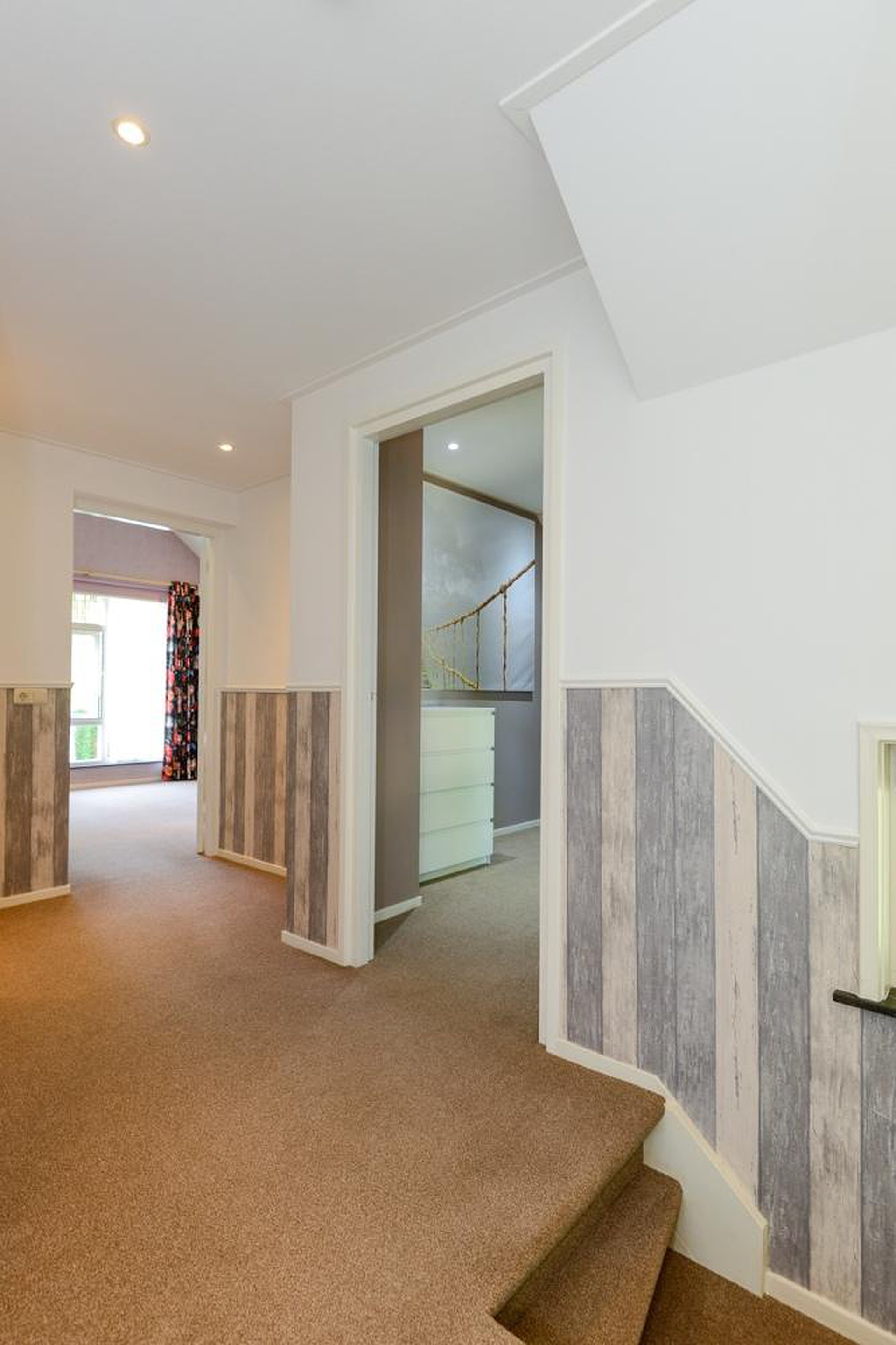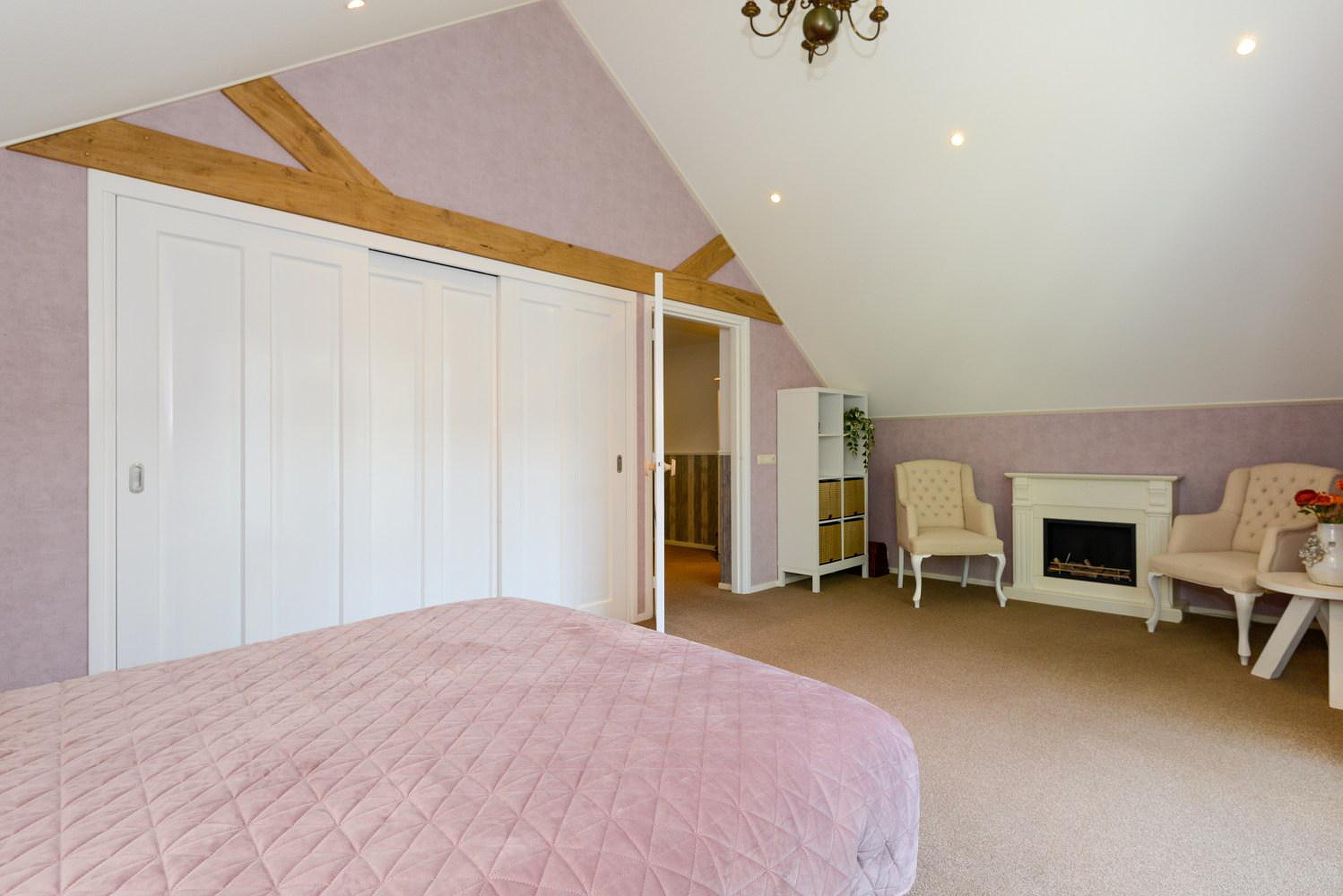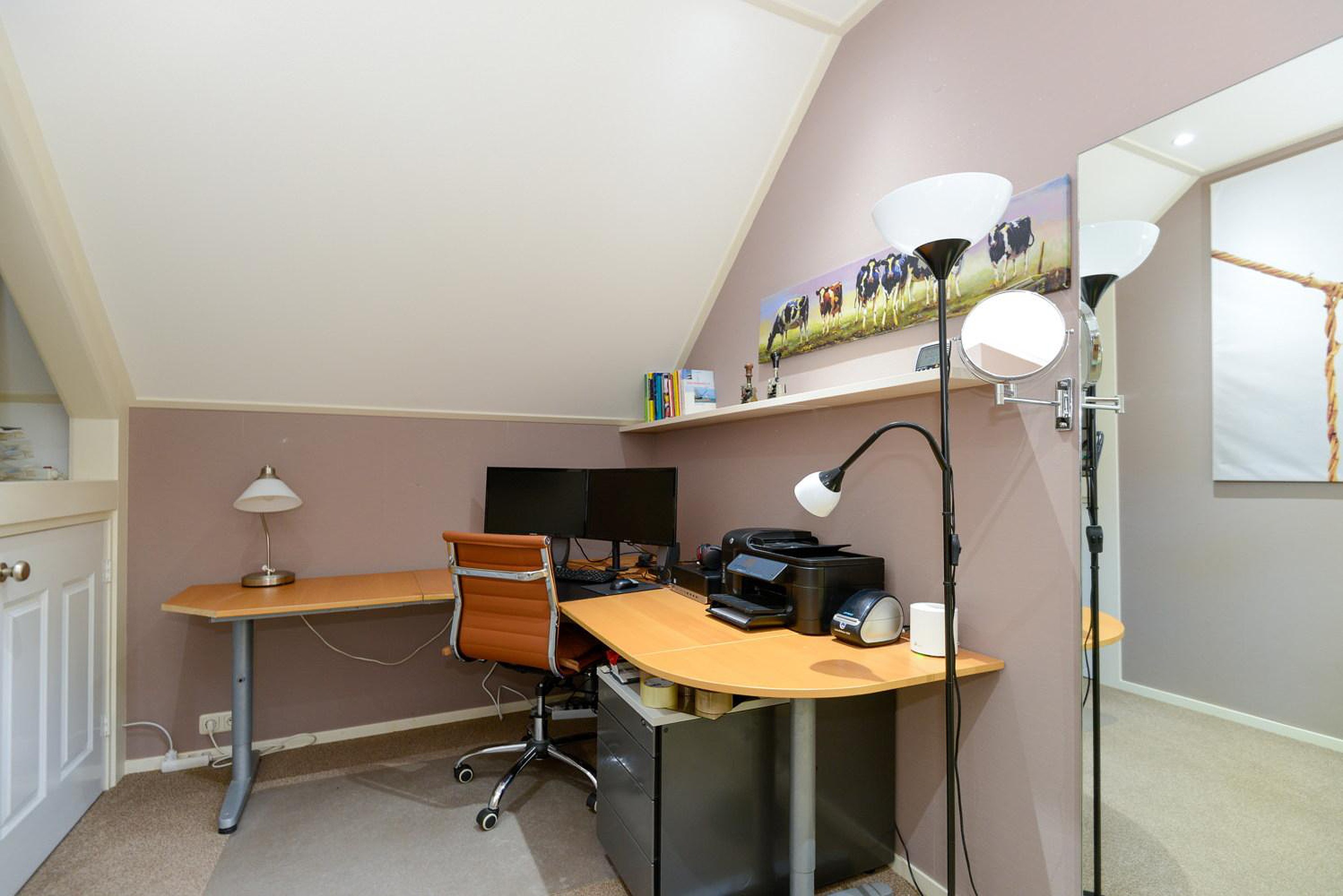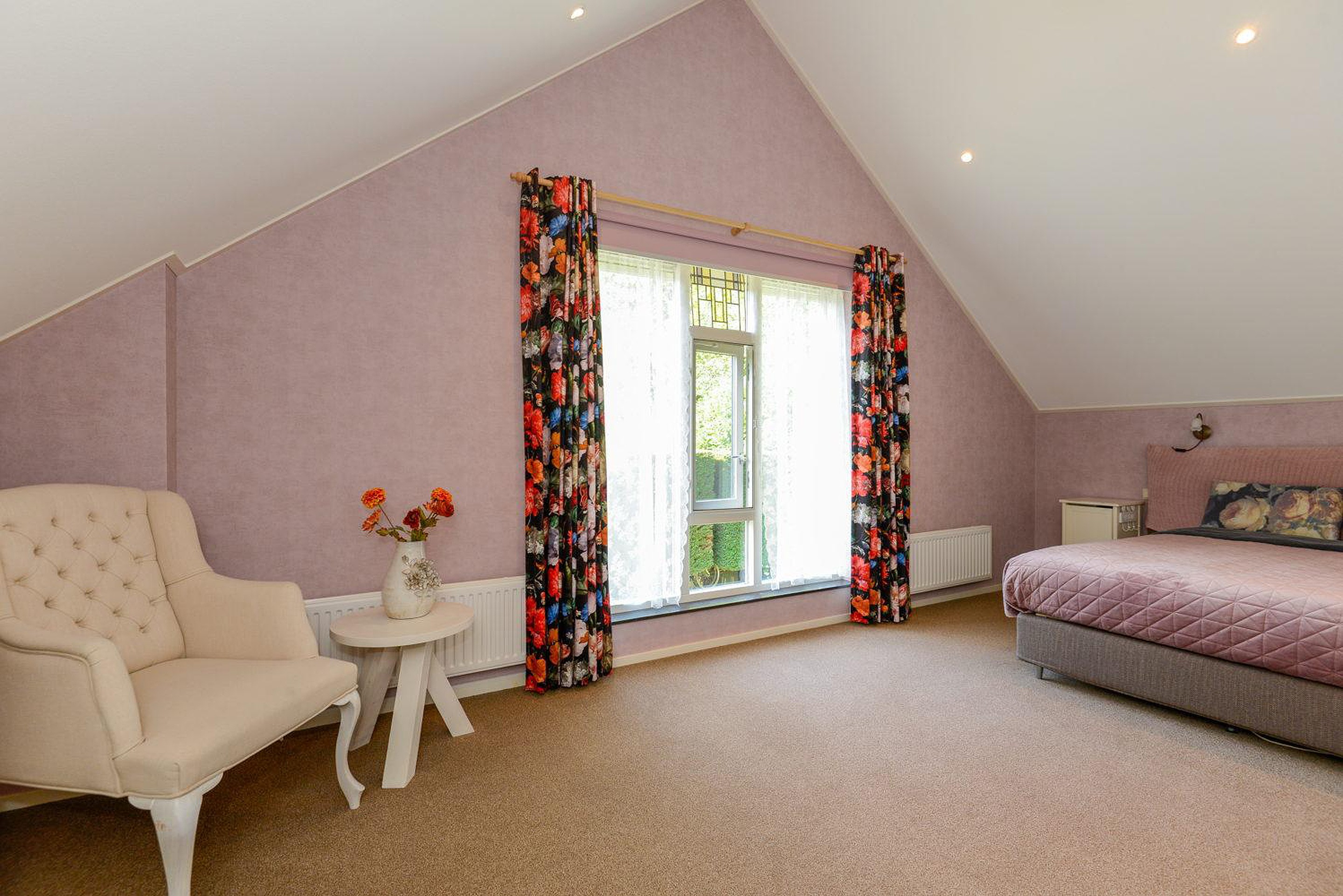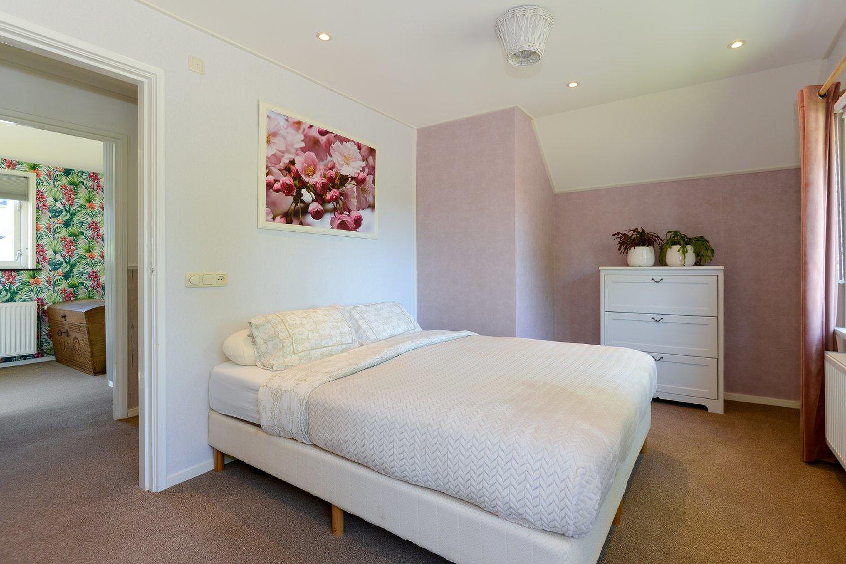De ruime overloop biedt toegang tot 4 slaapkamers waarvan de grootste een ingebouwde kastenwand heeft. Eén van de kamers heeft een balkon. Er bevindt zich een separate ruimte met een toilet en een wastafelmeubel. Vanuit de overloop is via een vlizotrap de bergzolder bereikbaar.