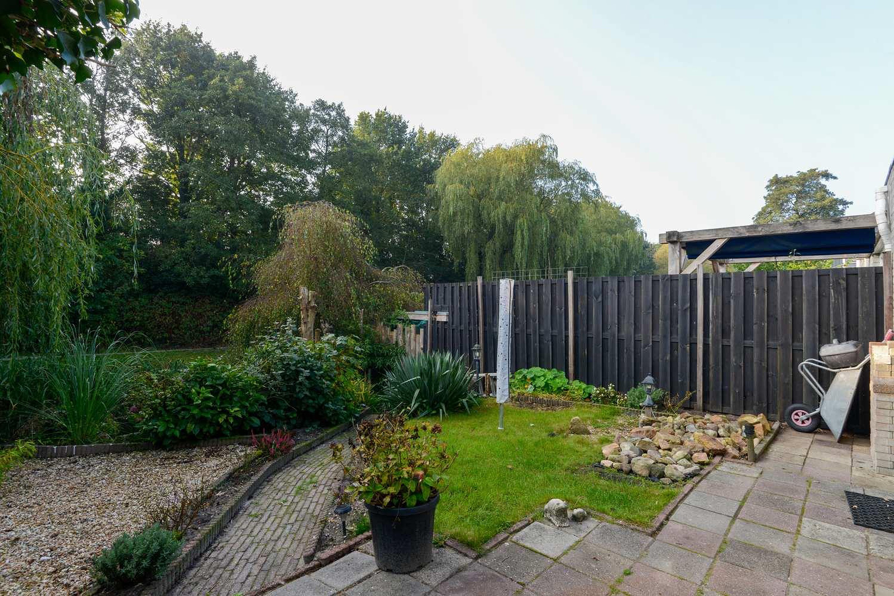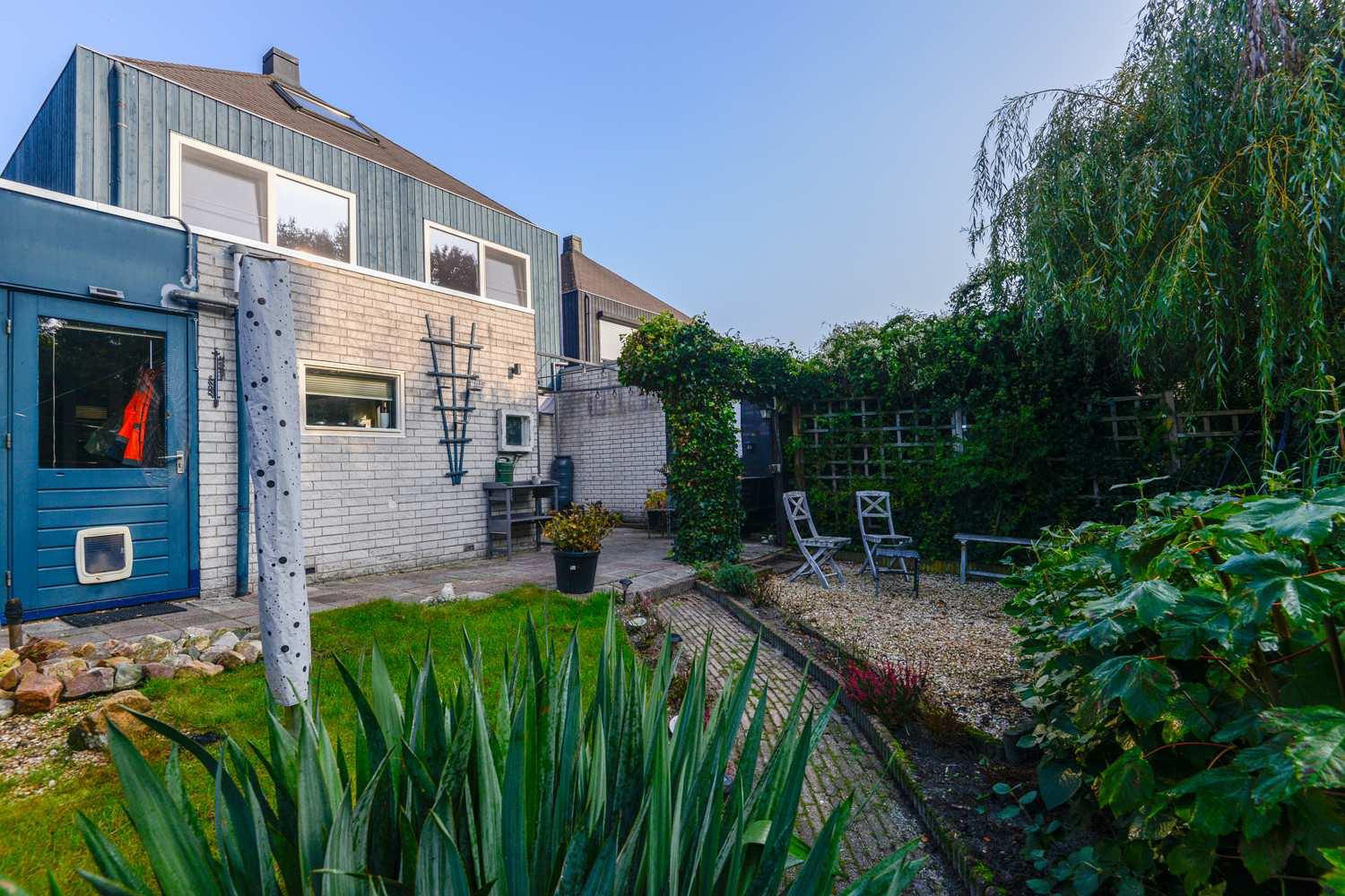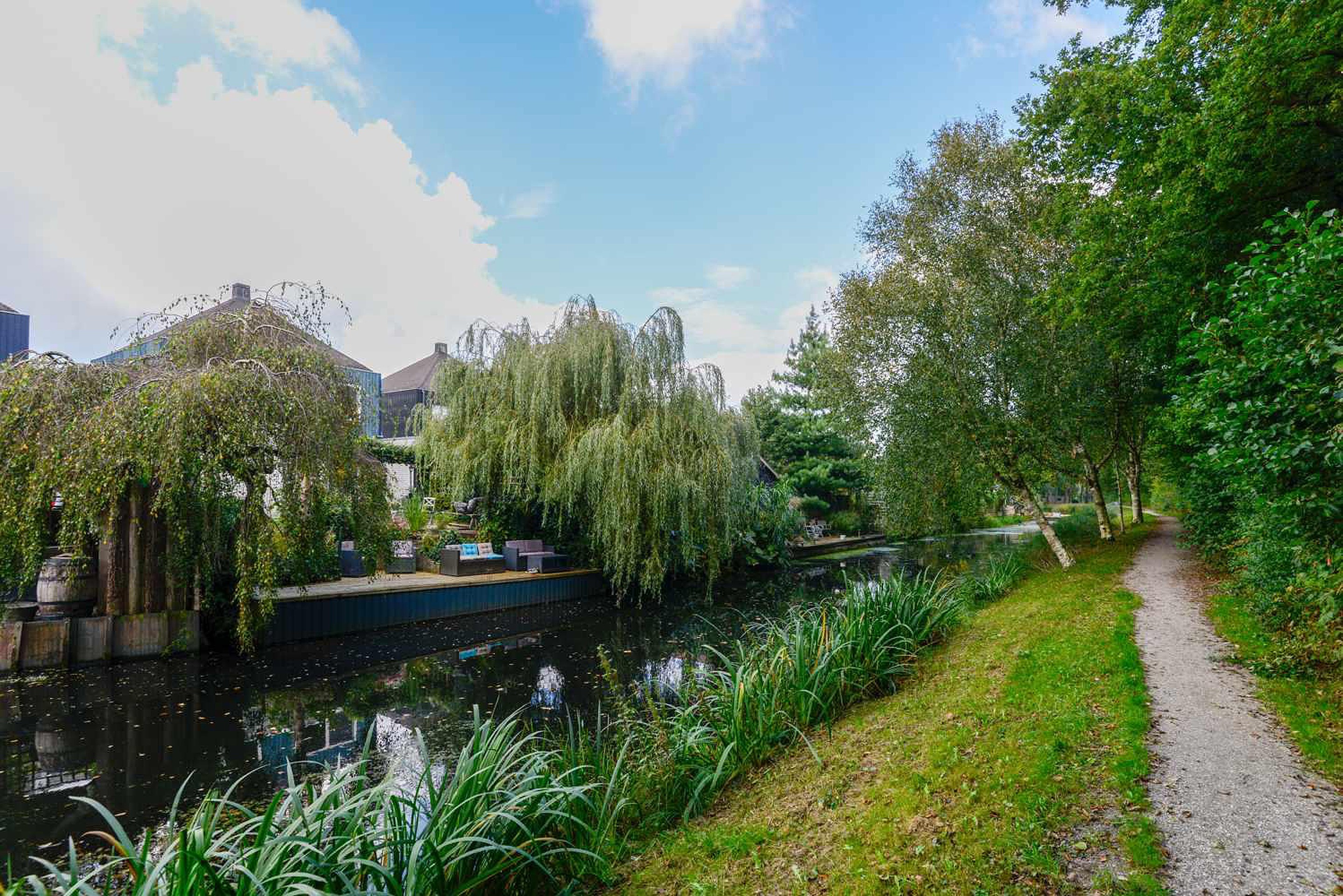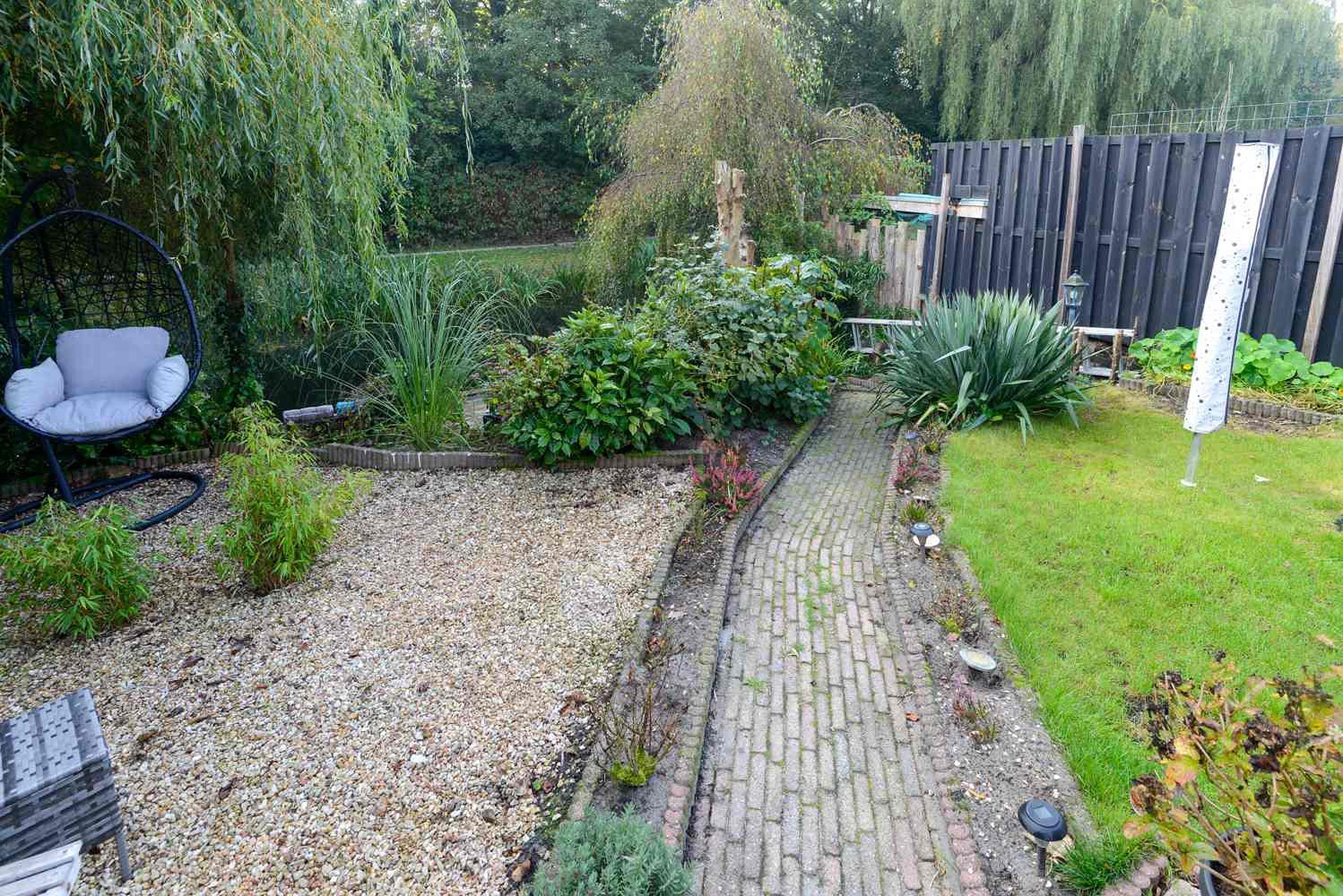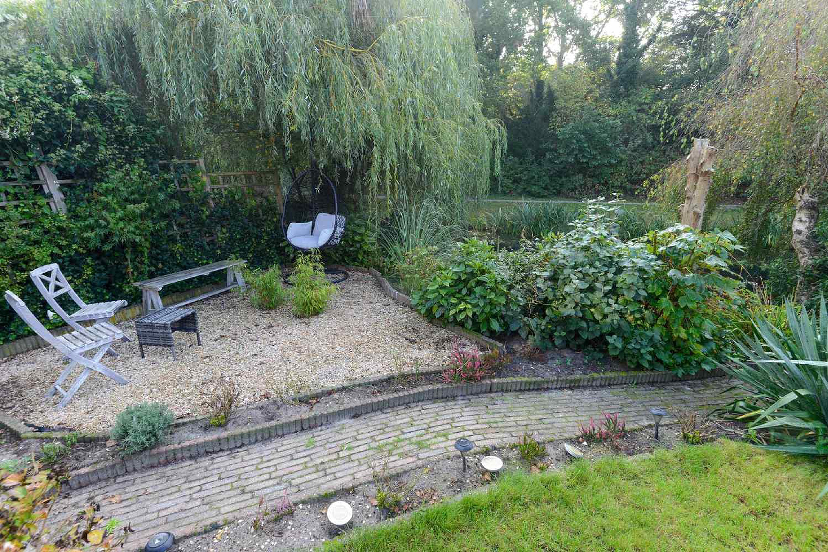De woning ligt verscholen in het groen en aan het begin van de woonwijk. De tuin ligt op het zonnige zuiden en grenst aan een waterpartij. Het water en de omringende hoge bomen zorgen voor een parkachtige beleving.