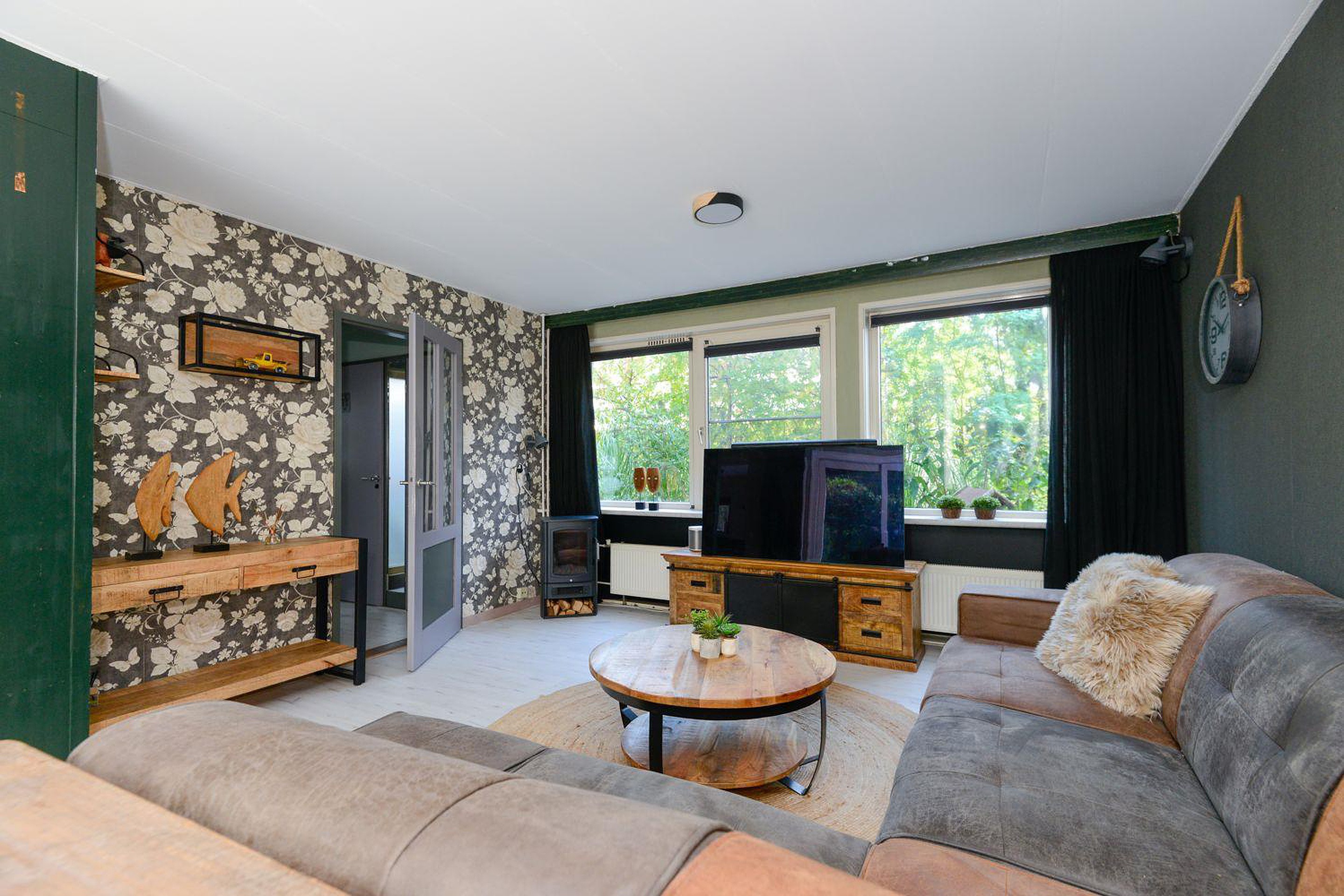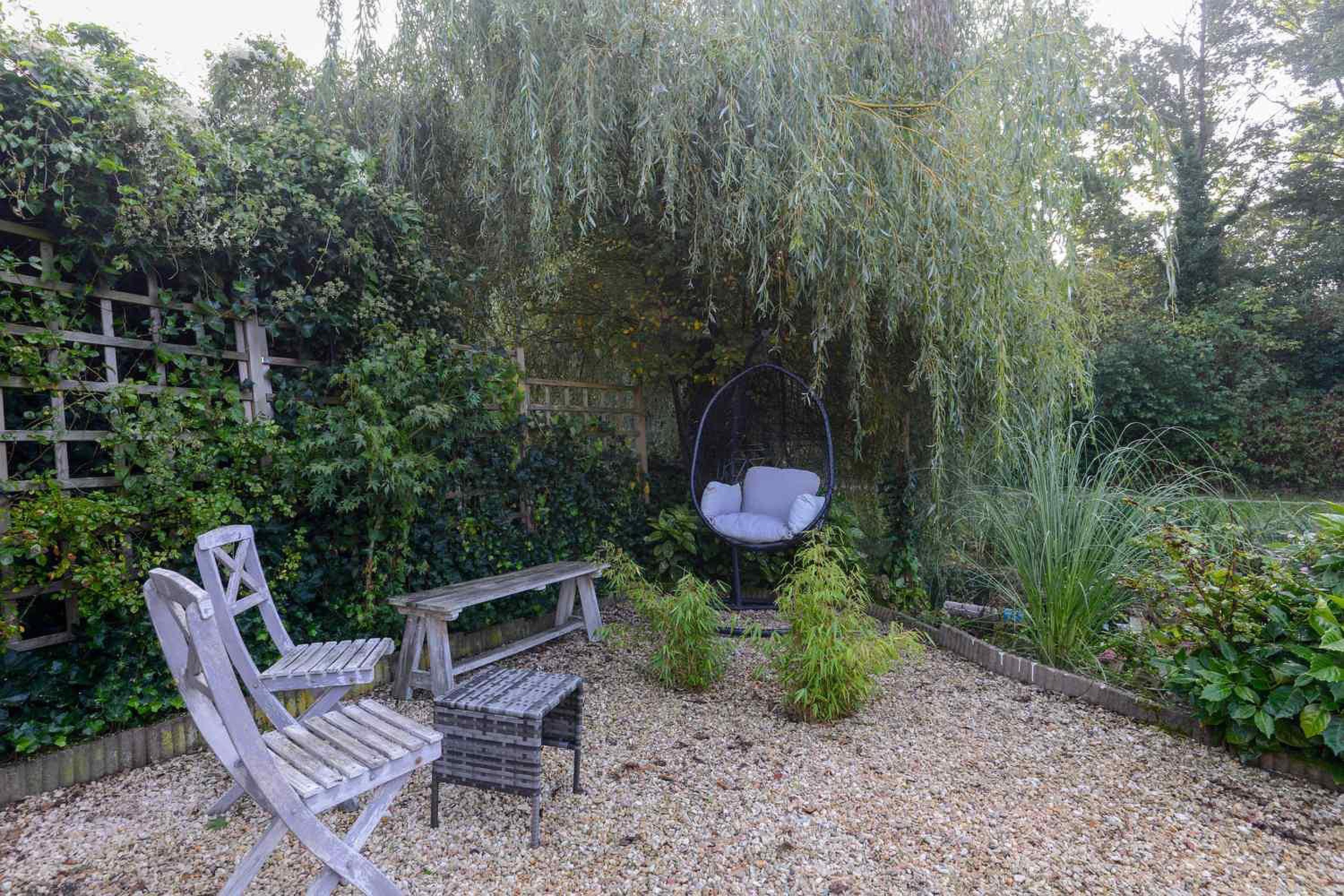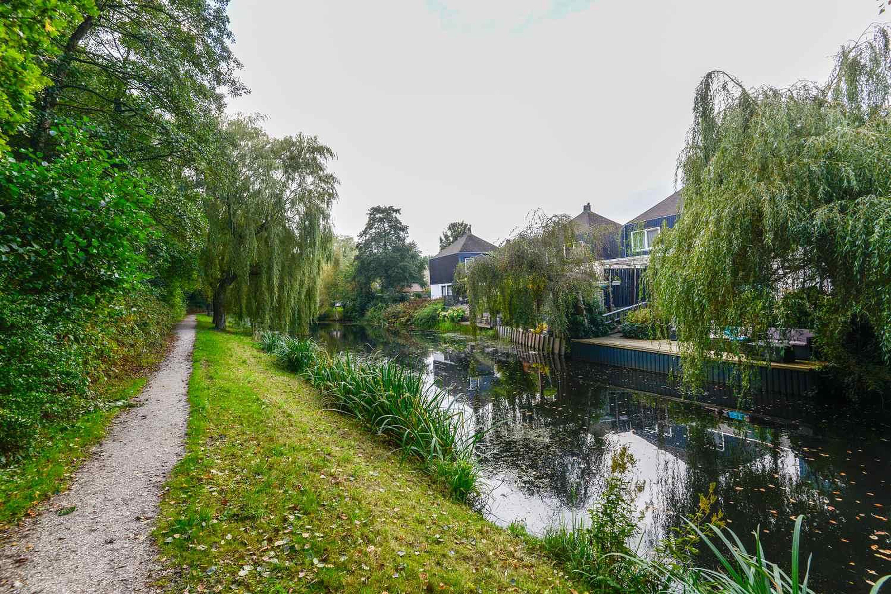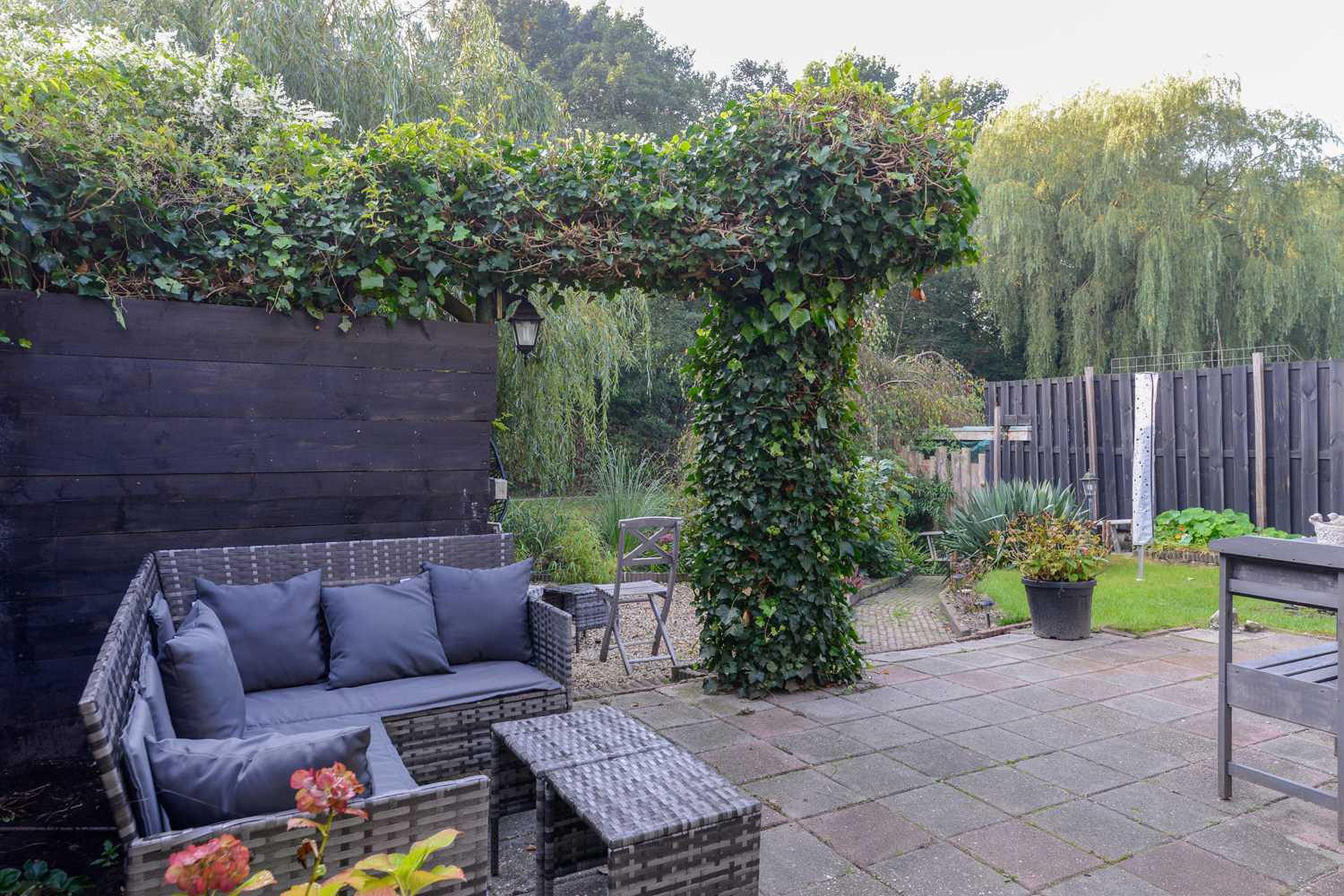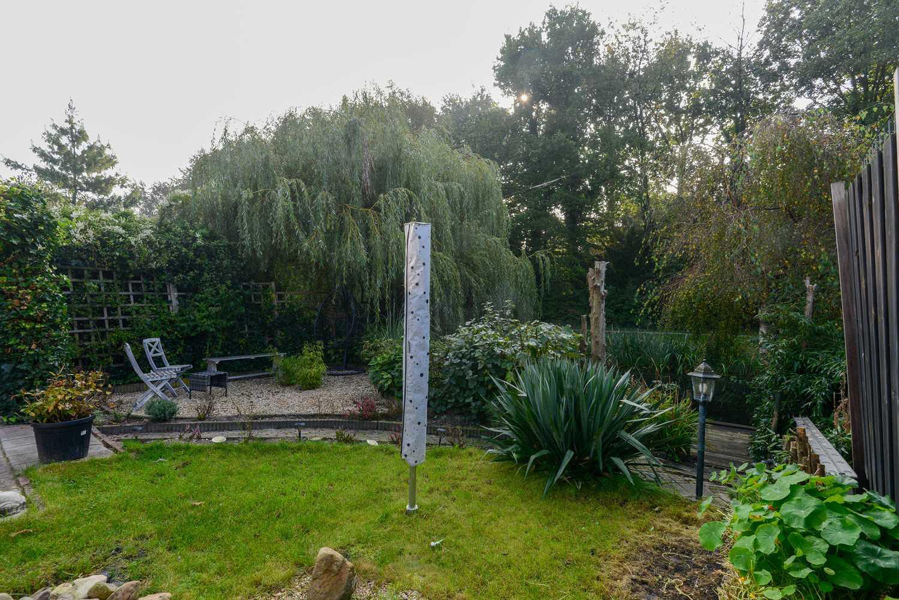 De woning ligt verscholen in het groen en aan het begin van de woonwijk. De tuin ligt op het zonnige zuiden en grenst aan een waterpartij. Het water en de omringende hoge bomen zorgen voor een parkachtige beleving.