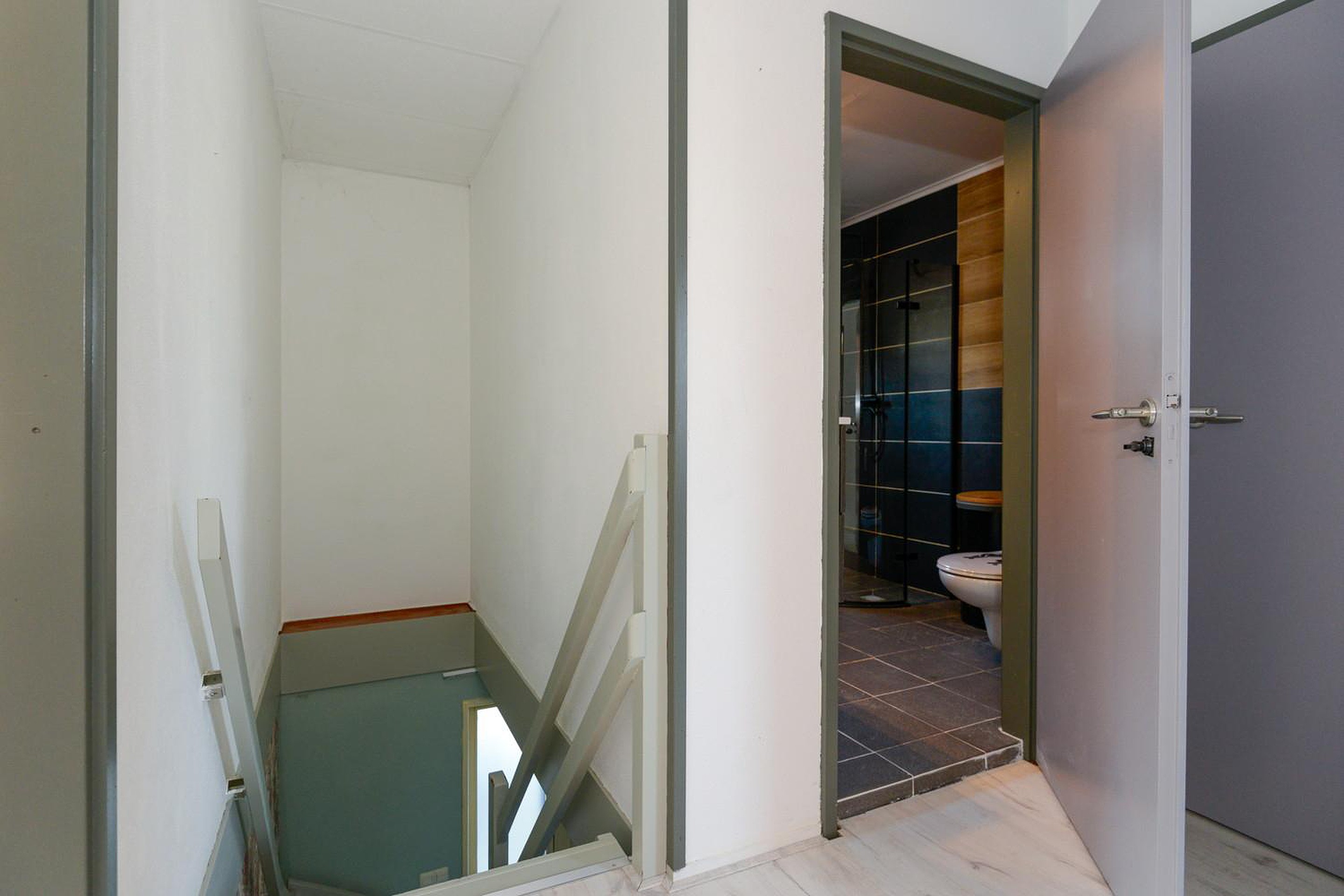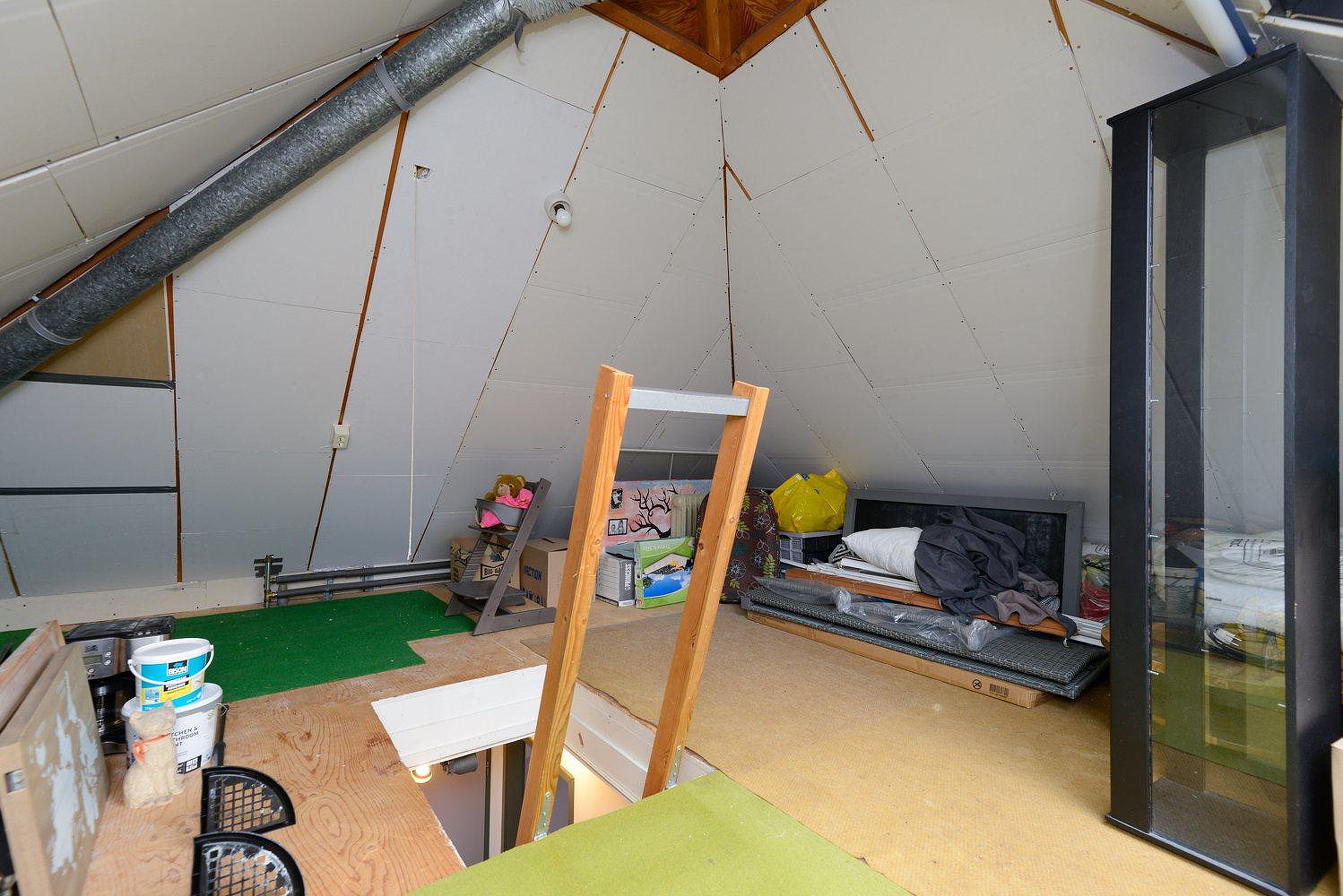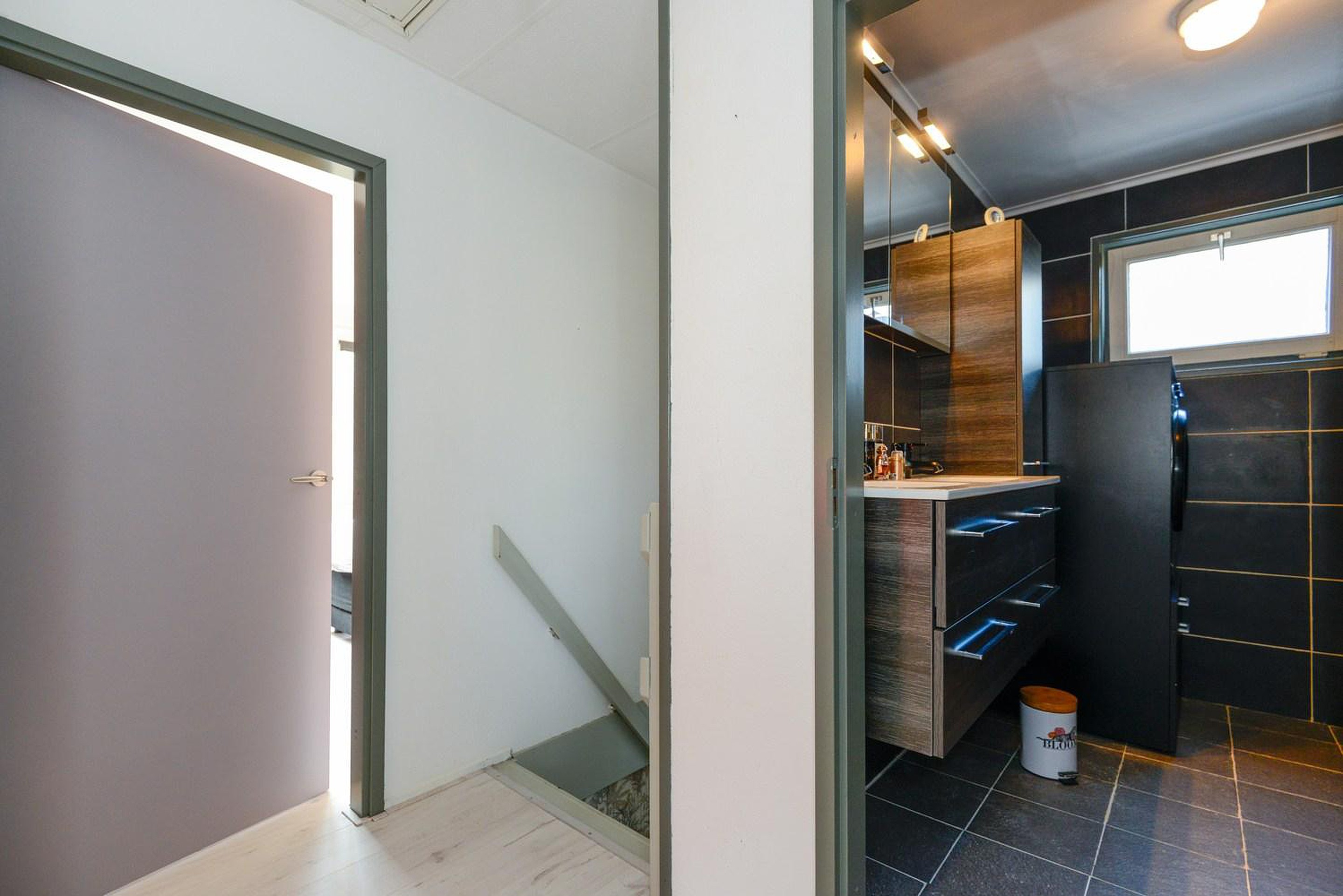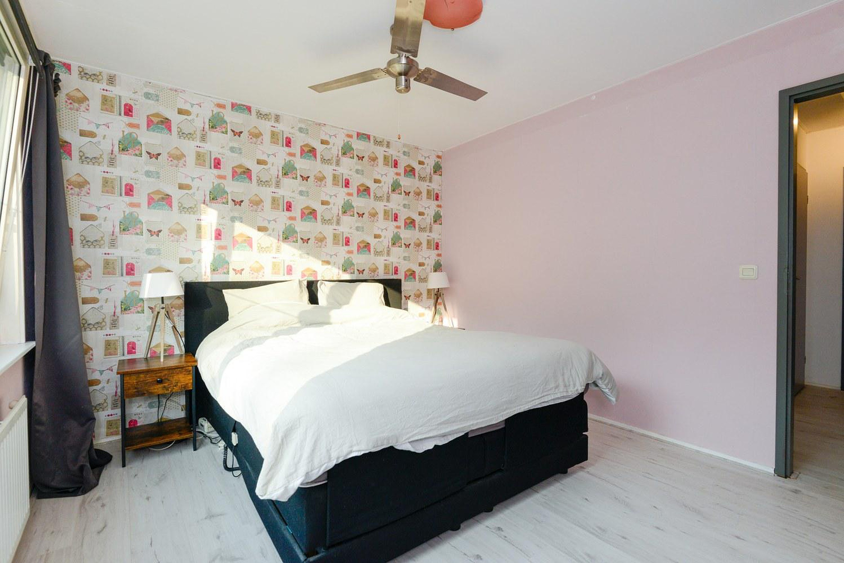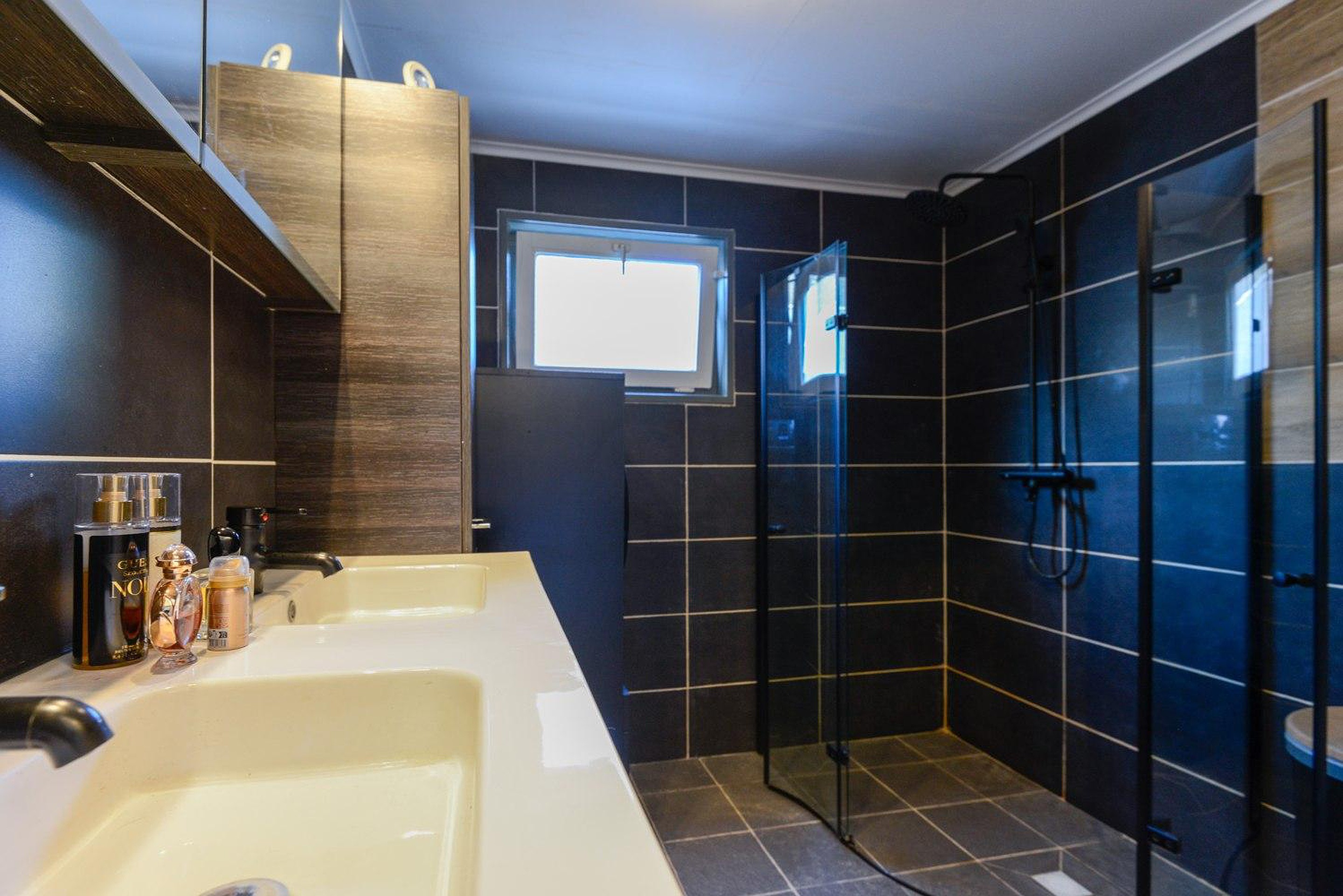 Op de eerste verdieping bevinden zich 3 slaapkamers met een oppervlakte van respectievelijk 12,7 m2 11,9 m2 en 7,2 m2. De kozijnen zijn grotendeels van kunststof met HR beglazing. In een separate ruimte staat de CV, merk Intergas uit 2013. De moderne badkamer in donkere kleurstelling is vernieuwd en voorzien van een inloopdouche met regen- en handdouche, dubbel wastafelmeubel en tweede toilet (wandcloset). Vanaf de overloop is via een vlizotrap toegang tot de zolderruimte, welke geschikt is als bergruimte.