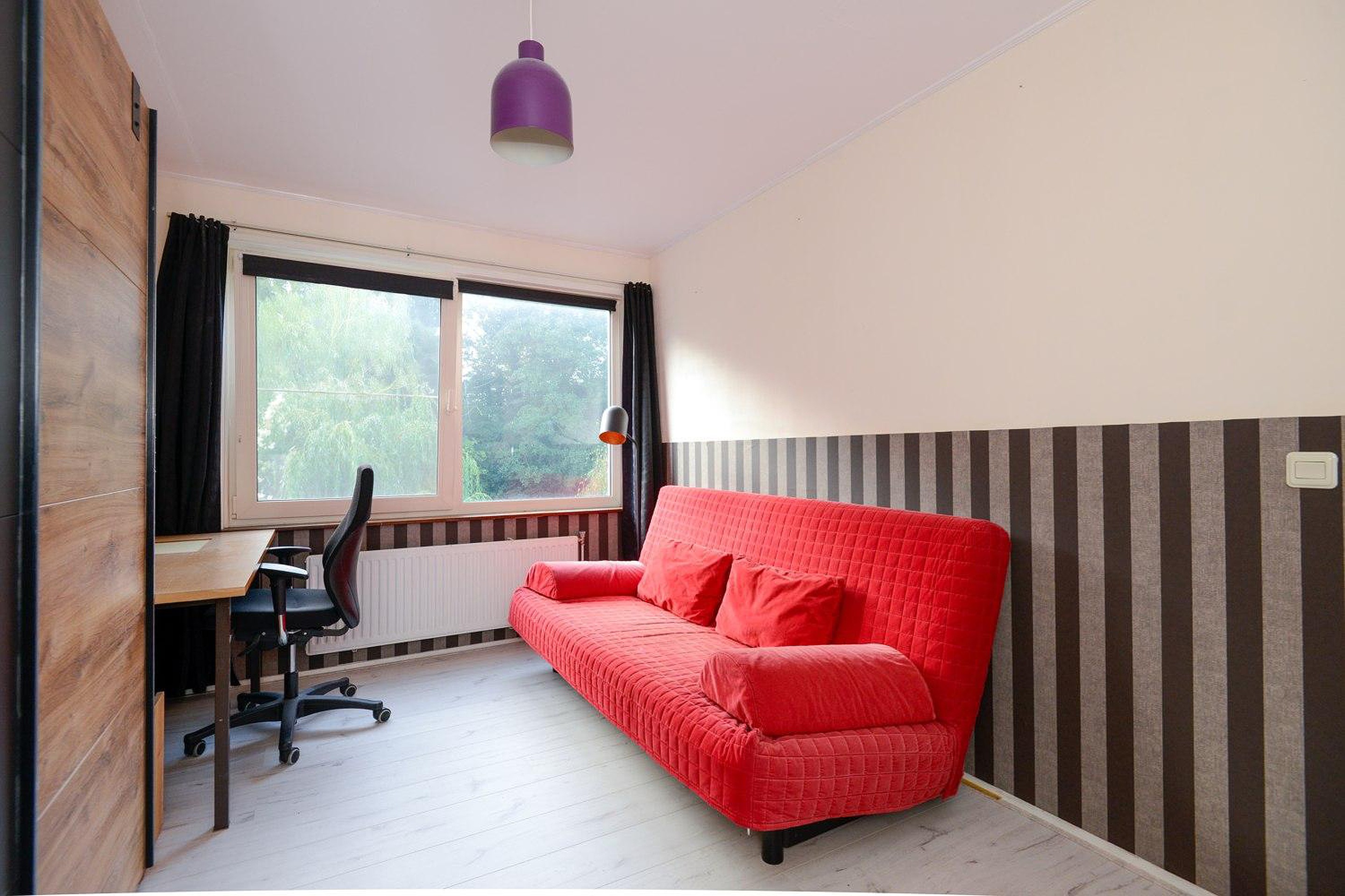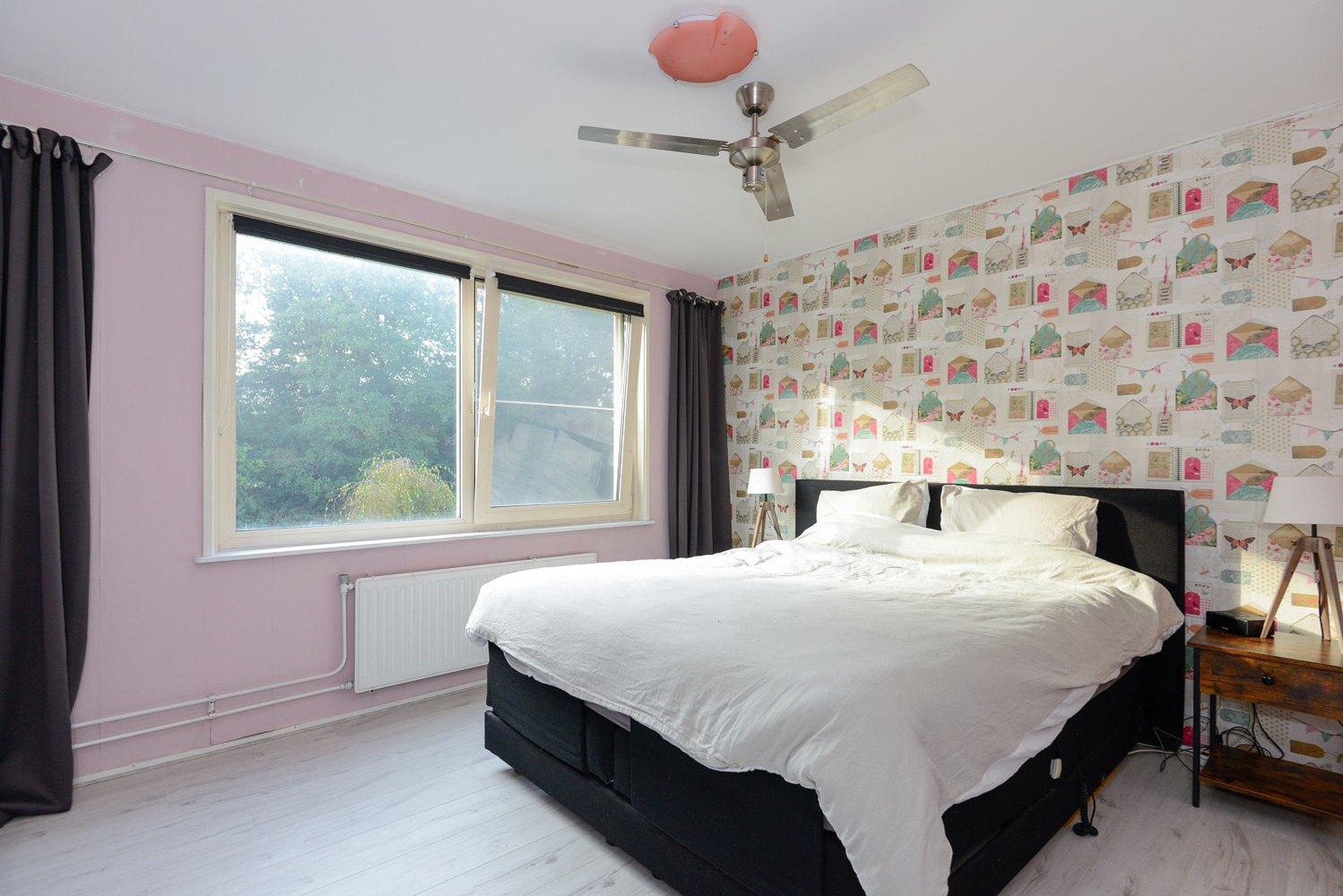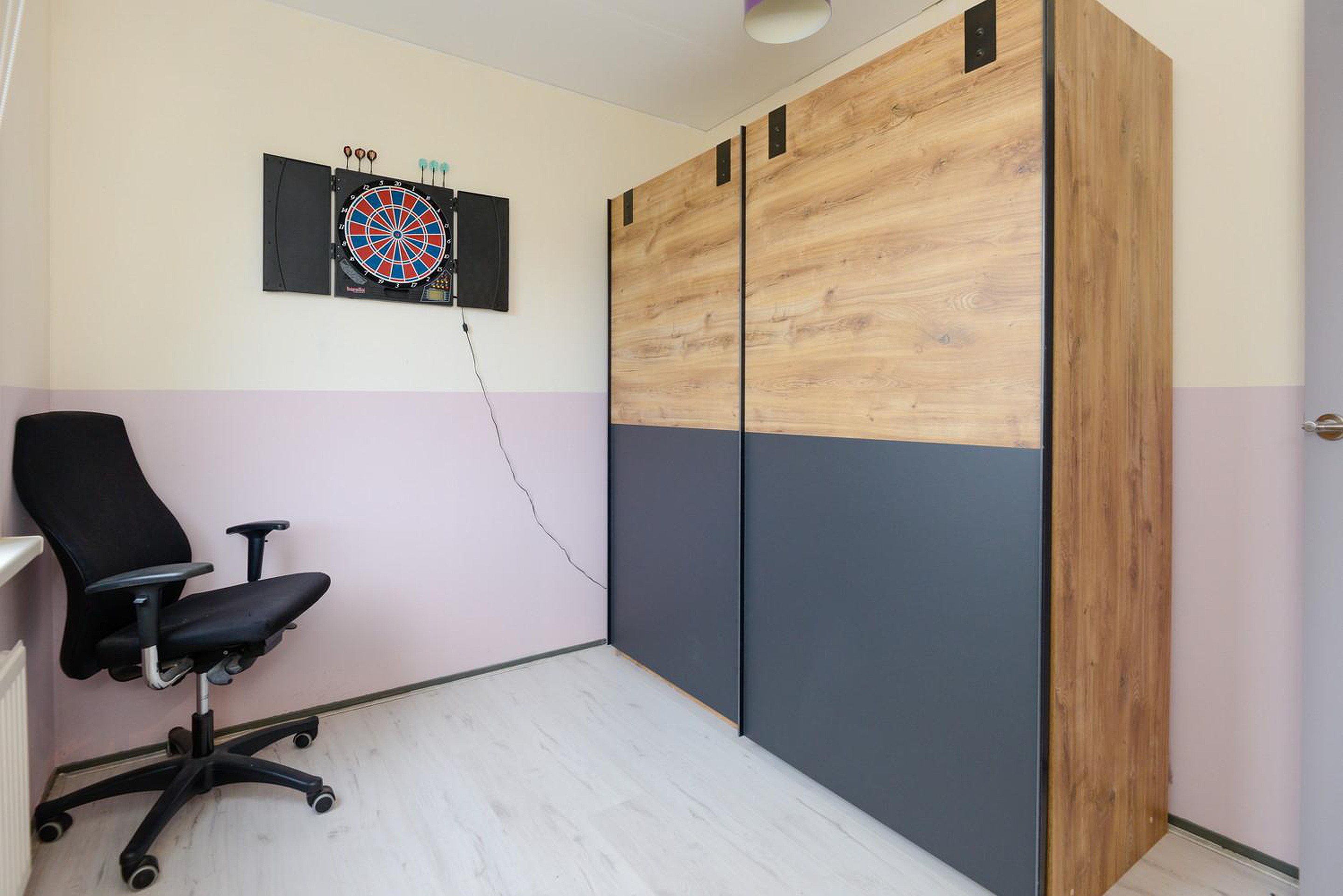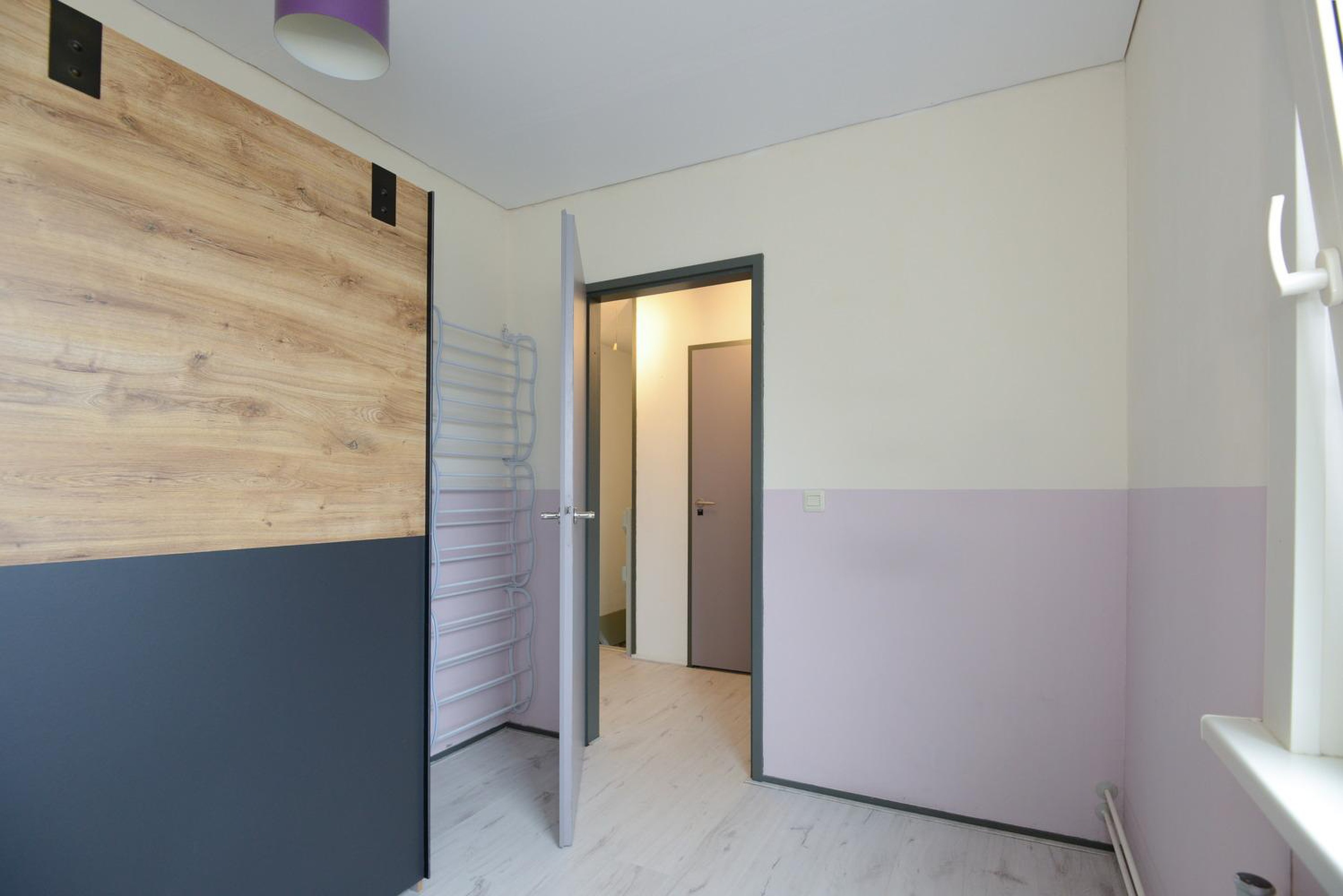 Op de eerste verdieping bevinden zich 3 slaapkamers met een oppervlakte van respectievelijk 12,7 m2 11,9 m2 en 7,2 m2. De kozijnen zijn grotendeels van kunststof met HR beglazing. In een separate ruimte staat de CV, merk Intergas uit 2013. De moderne badkamer in donkere kleurstelling is vernieuwd en voorzien van een inloopdouche met regen- en handdouche, dubbel wastafelmeubel en tweede toilet (wandcloset). Vanaf de overloop is via een vlizotrap toegang tot de zolderruimte, welke geschikt is als bergruimte.