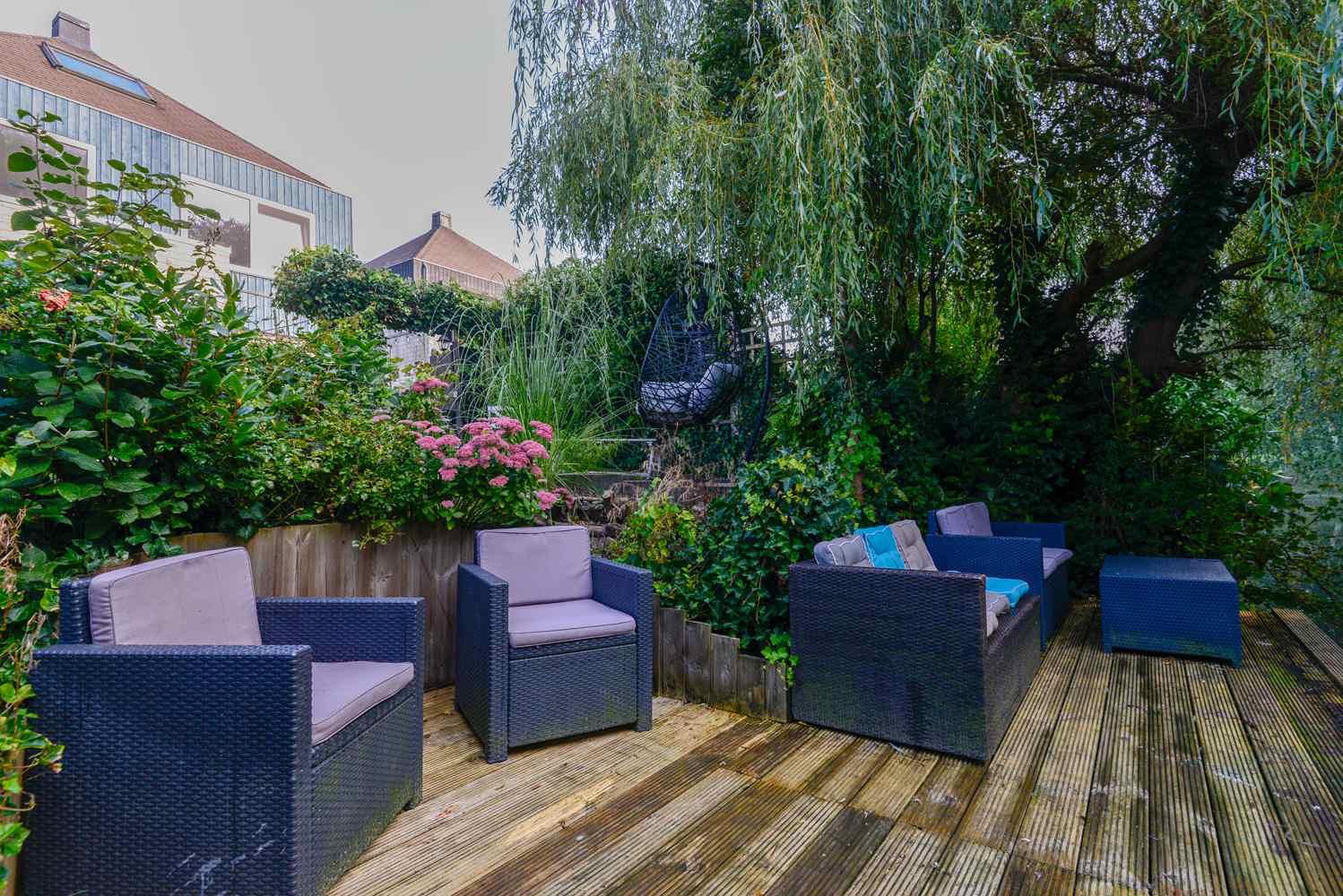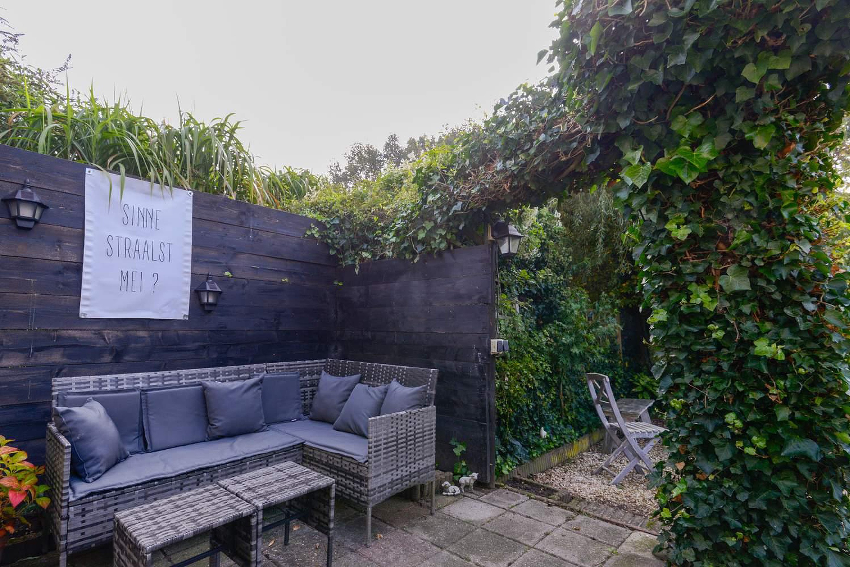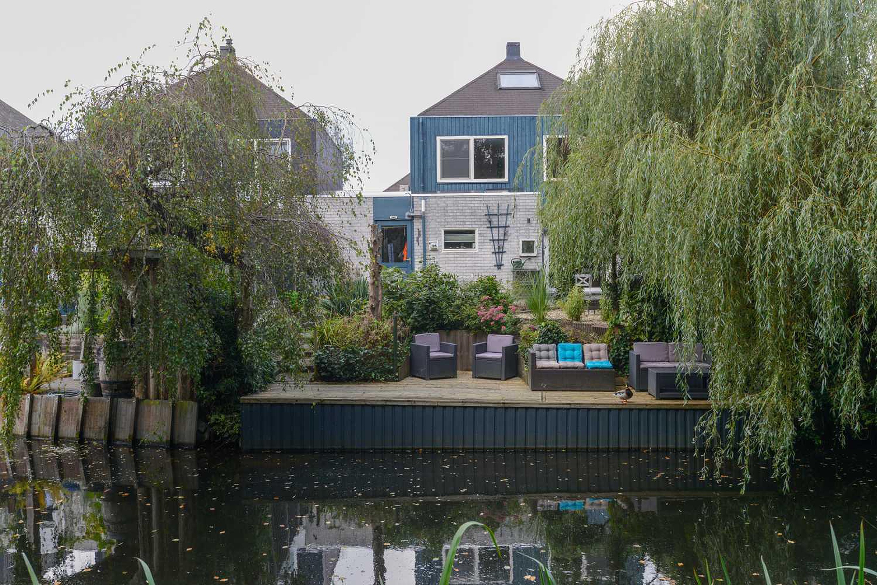 De onderhoudsvriendelijke tuin is gelegen op het zuiden en heeft diverse terrassen. Het vele groen in de directe omgeving geeft het geheel een parkachtige sfeer. De achtertuin biedt veel privacy. Het terras aan het water heeft een houten vlonder waar je heerlijk kunt ontspannen en kunt genieten van de verschillende seizoenen.