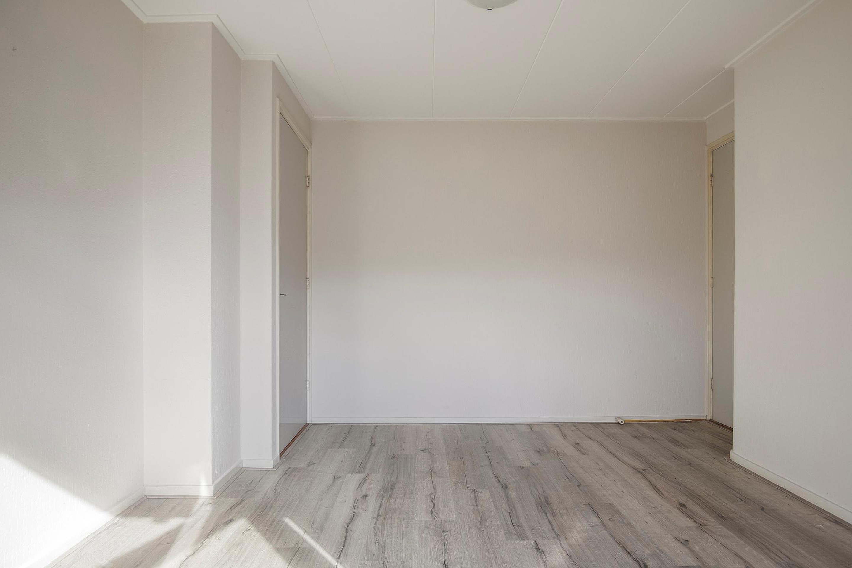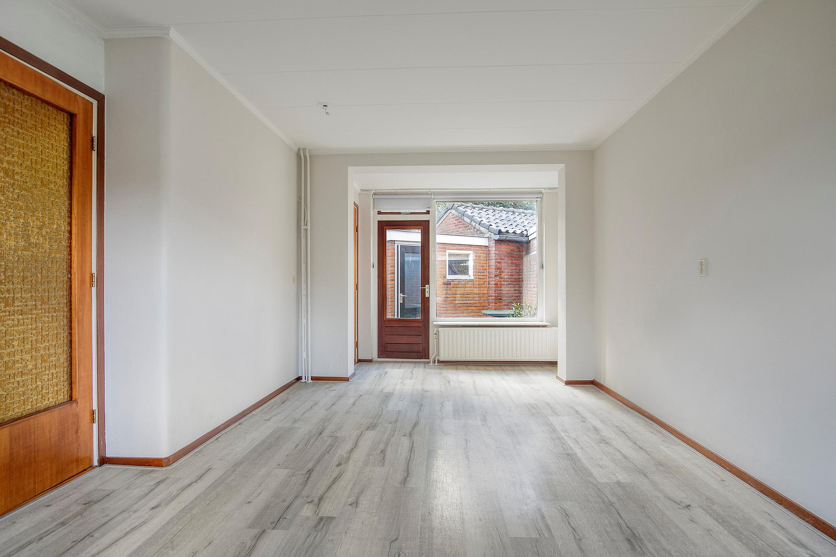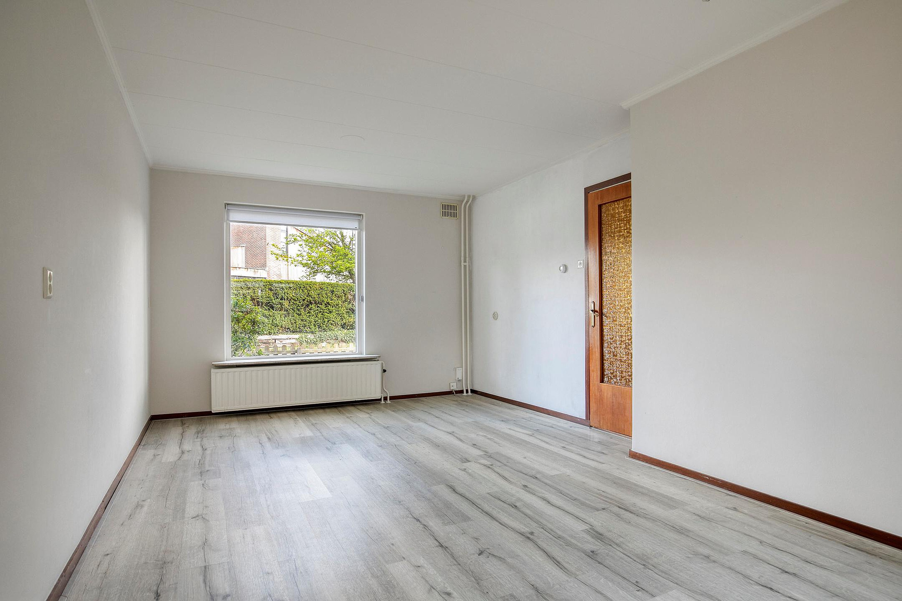 De lichte woonkamer, afgewerkt met een nette laminaatvloer, voelt direct prettig aan.