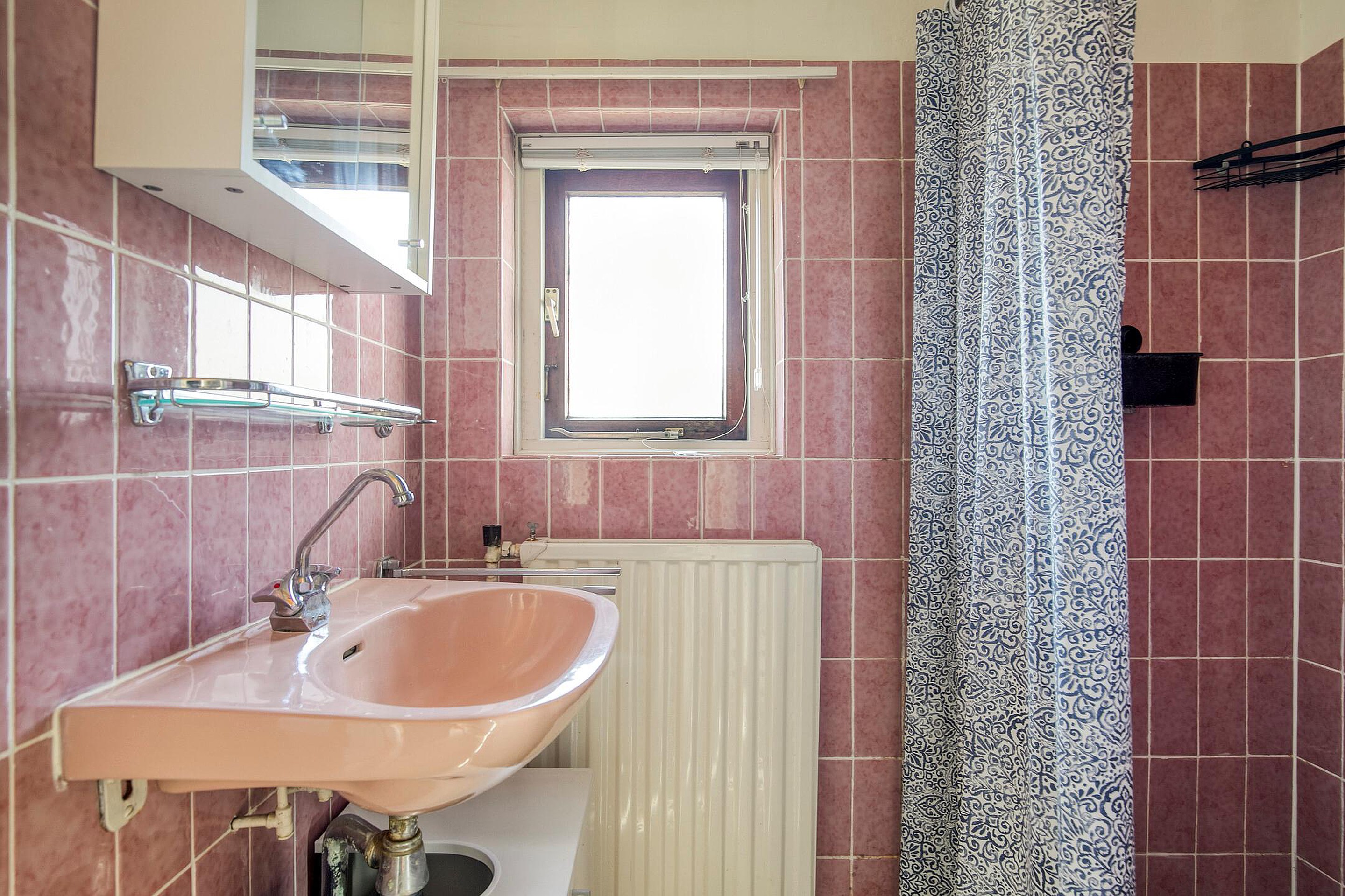 De compacte badkamer beschikt over een inloopdouche en wastafel.