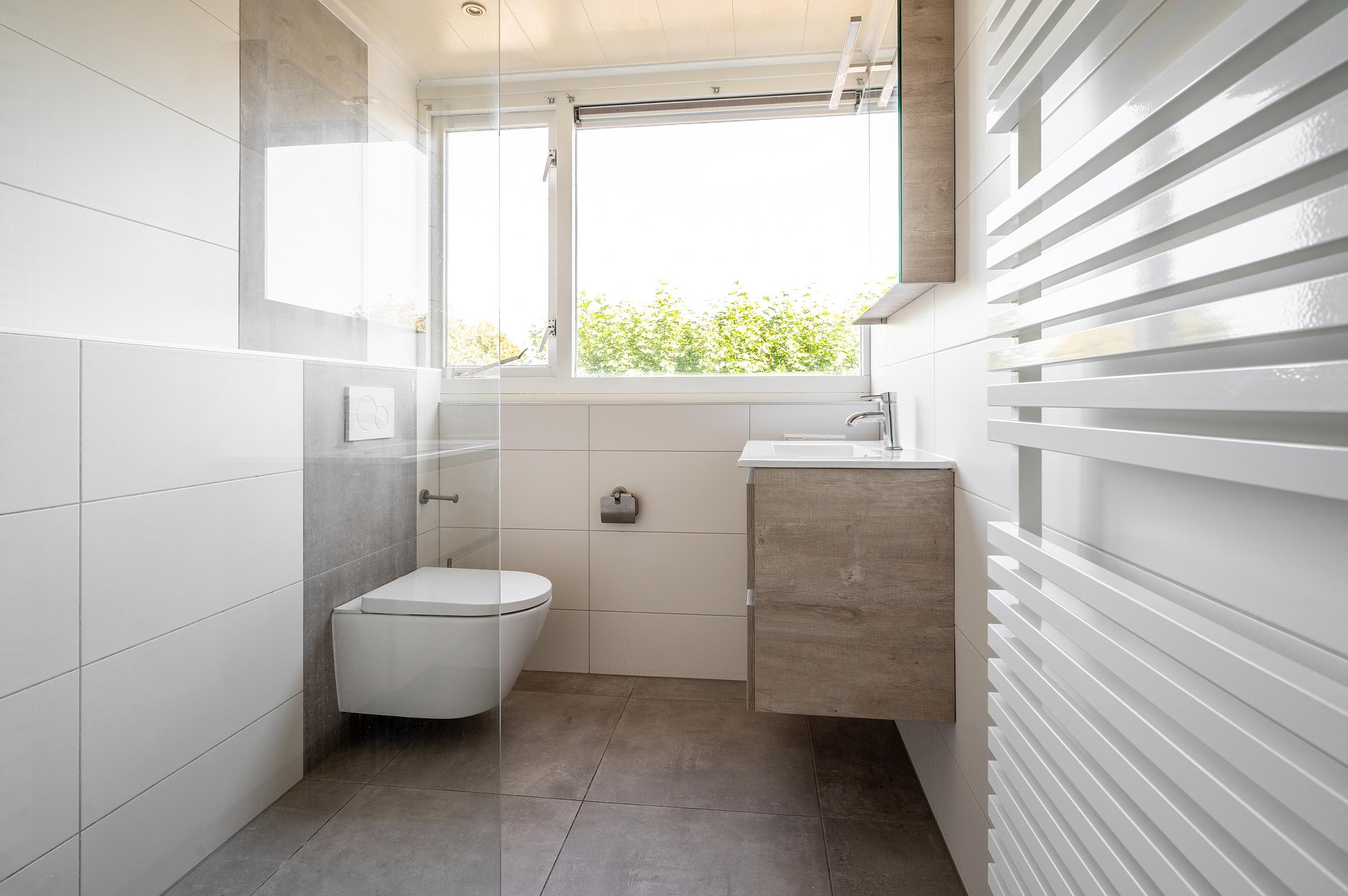 1e Verdieping: Vanaf de overloop zijn de 2 ruime slaapkamers, de badkamer en de vliering bereikbaar. De slaapkamer aan de voorzijde is over de volle breedte van de woning gesitueerd en in, indien gewenst, op te splitsen en daarmee een derde slaapkamer te realiseren. De slaapkamers beschikken beiden over een laminaatvloer en een dakkapel, wat voor veel ruimte en daglichttoetreding zorgt. De trap en de overloop zijn voorzien van een nette vloerbedekking. De eveneens vernieuwde badkamer (2021) profiteert eveneens van de woningbrede dakkapel en is in aardetinten en wit uitgevoerd. Bovendien is deze ingericht met een inloopdouche met glaswand en een draingoot, een spoeltoilet, een wastafel met meubel en spiegelkast, een designradiator en inbouwspots.