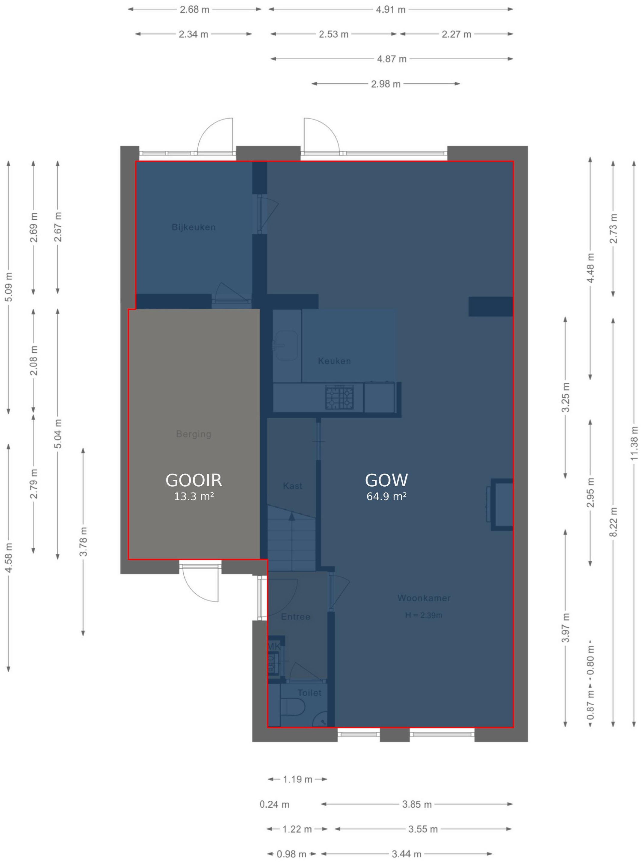 Indeling: Begane grond: Binnenkomst in de hal met de trapopgang naar de verdieping, de meterkast, de toegang tot de woonkamer en de toiletruimte.