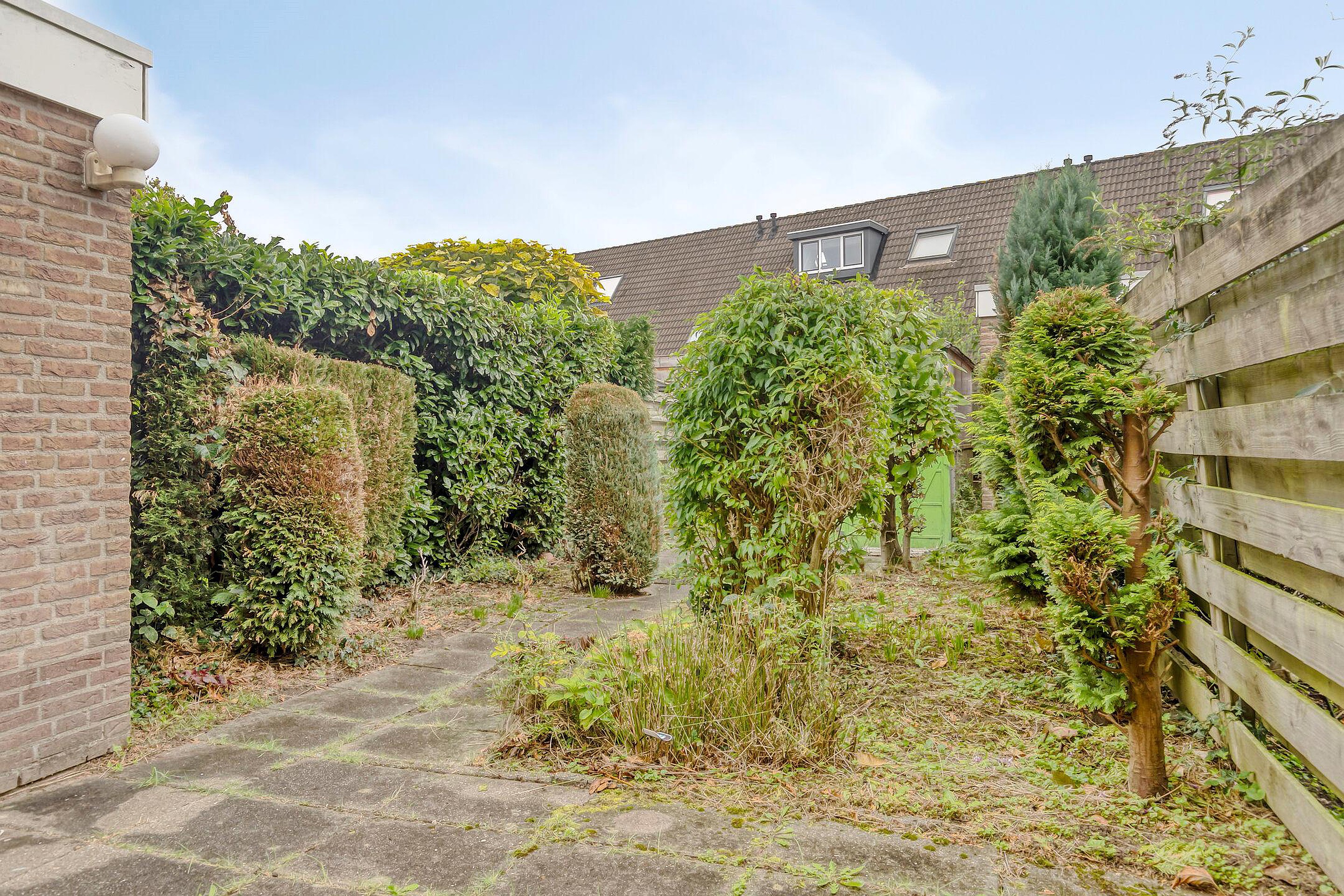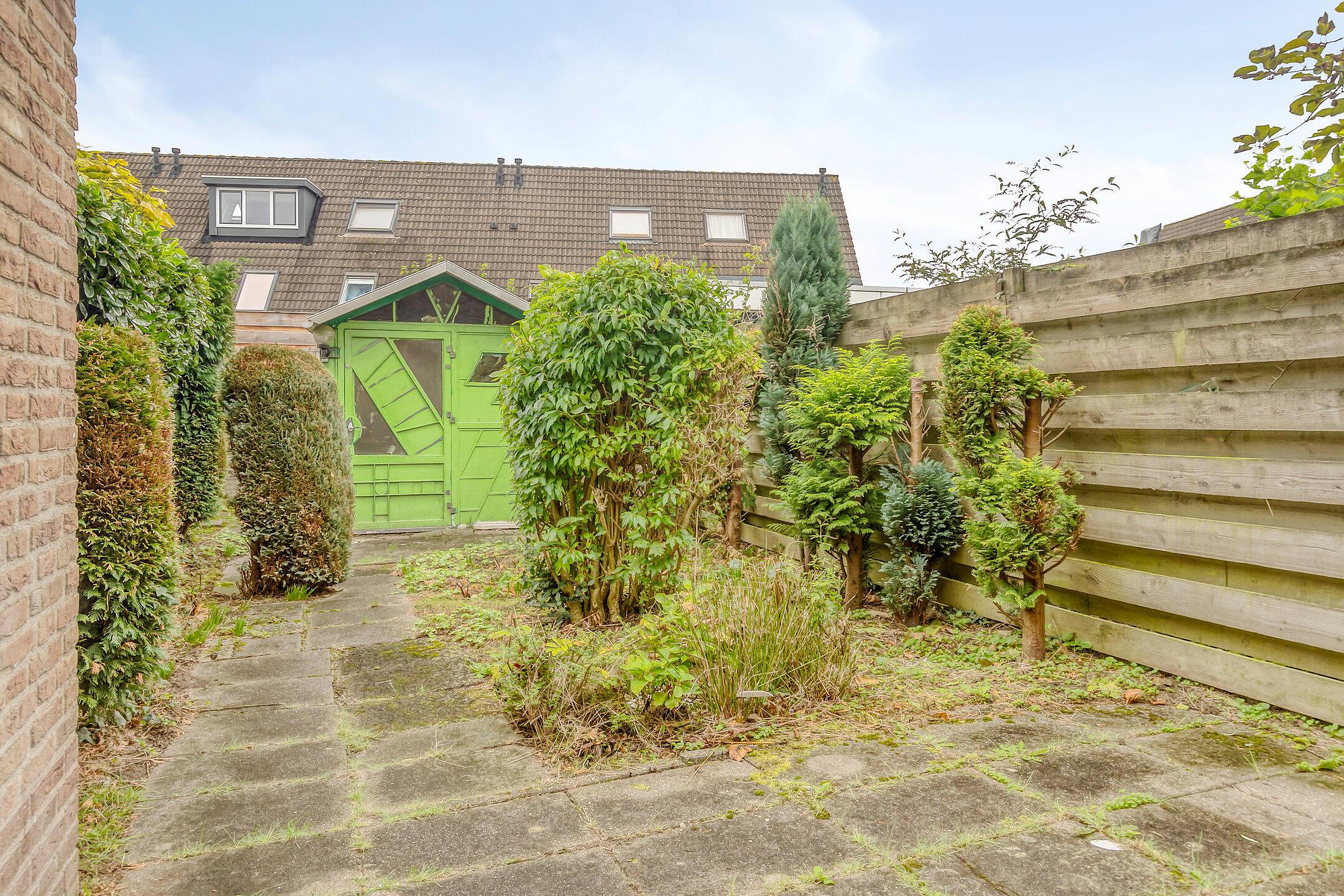 Zonnige achtertuin met stalen berging