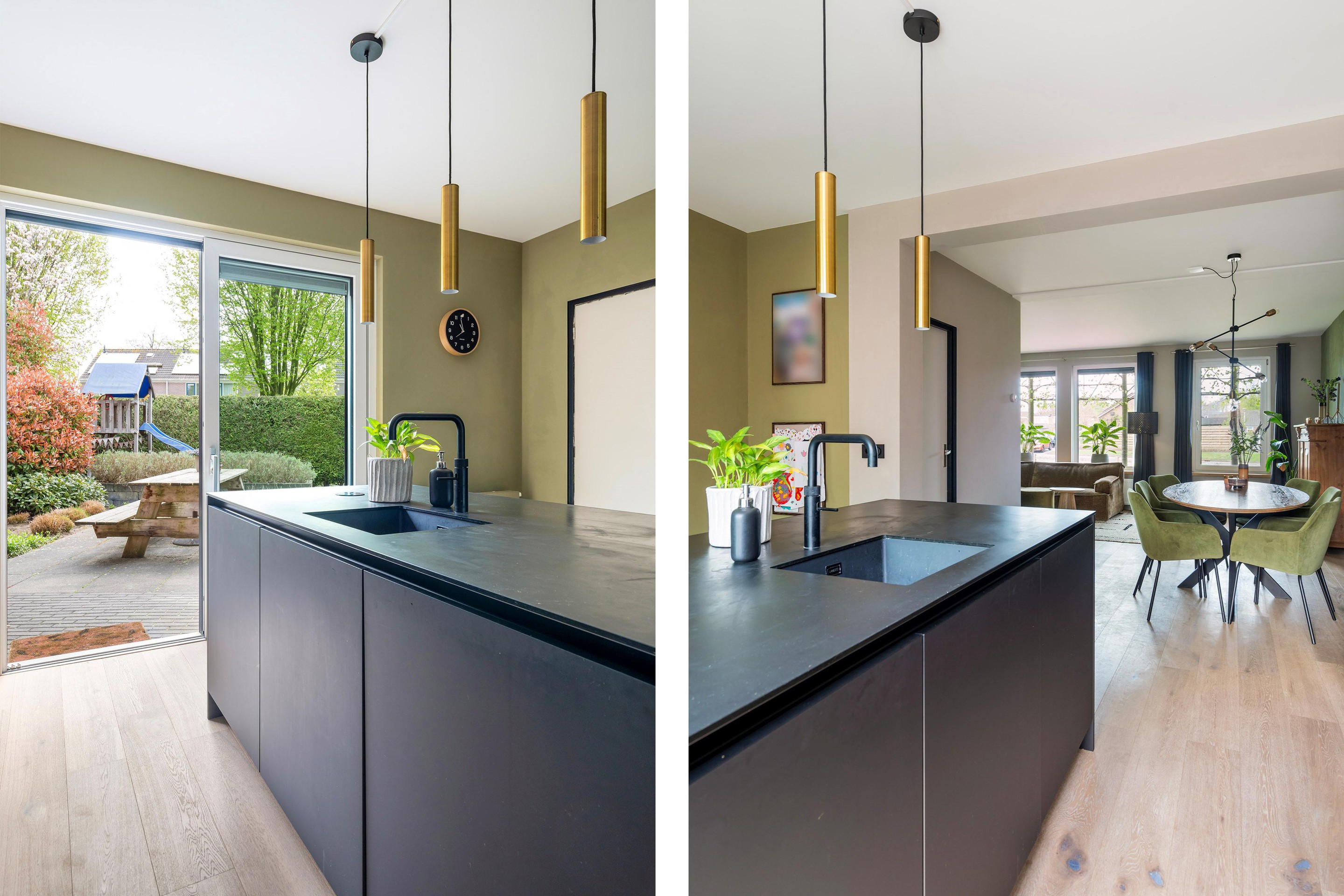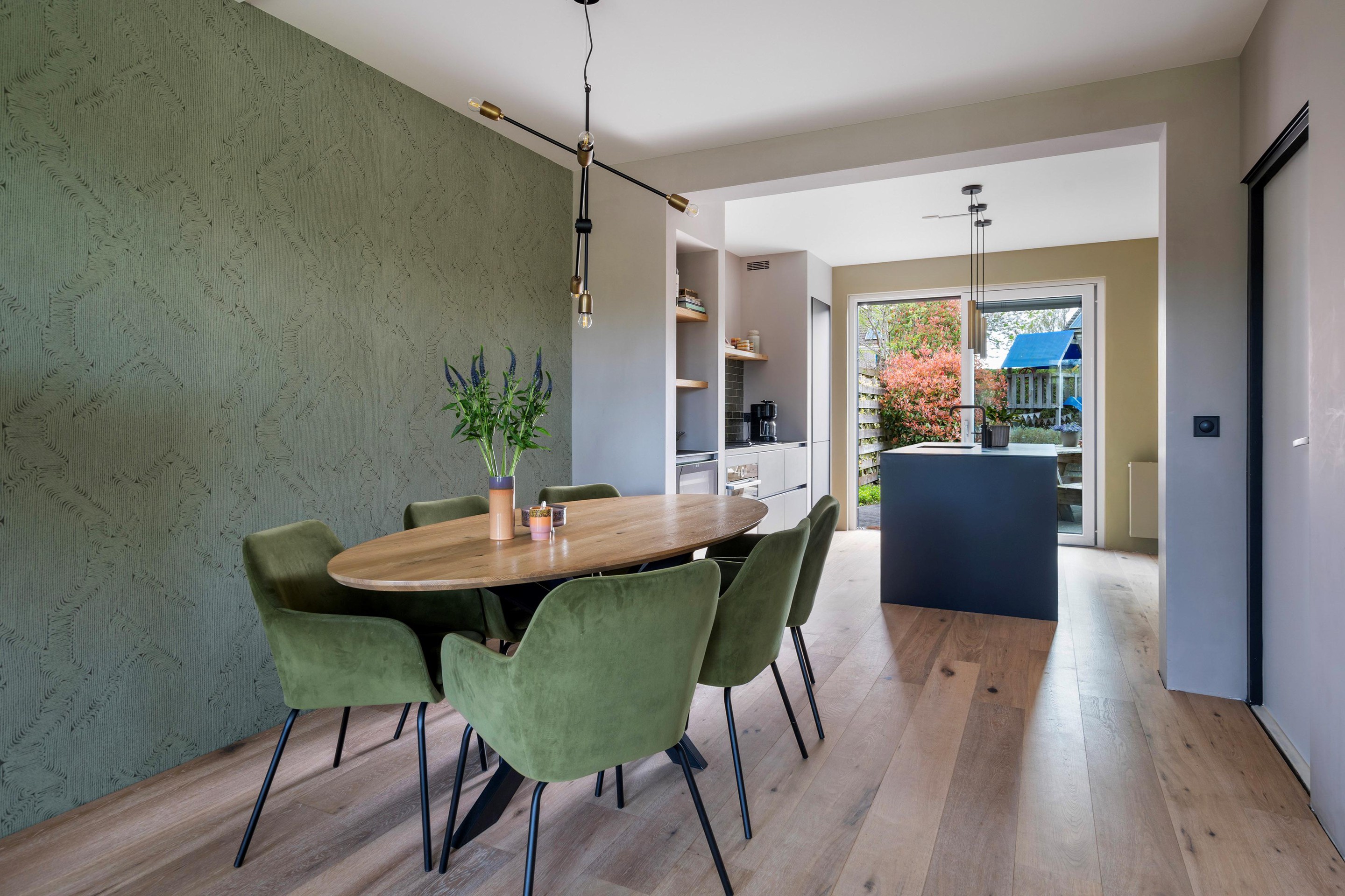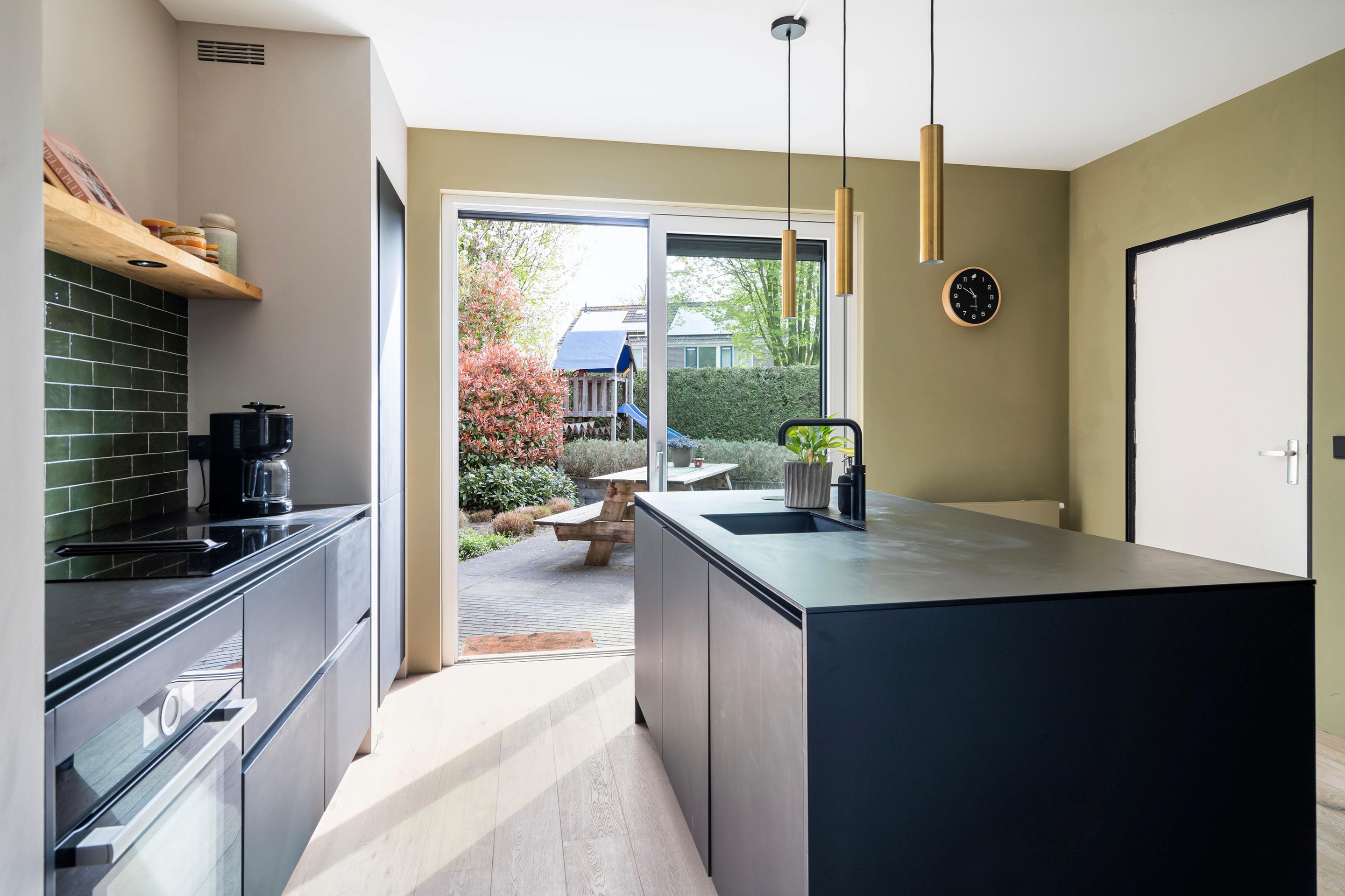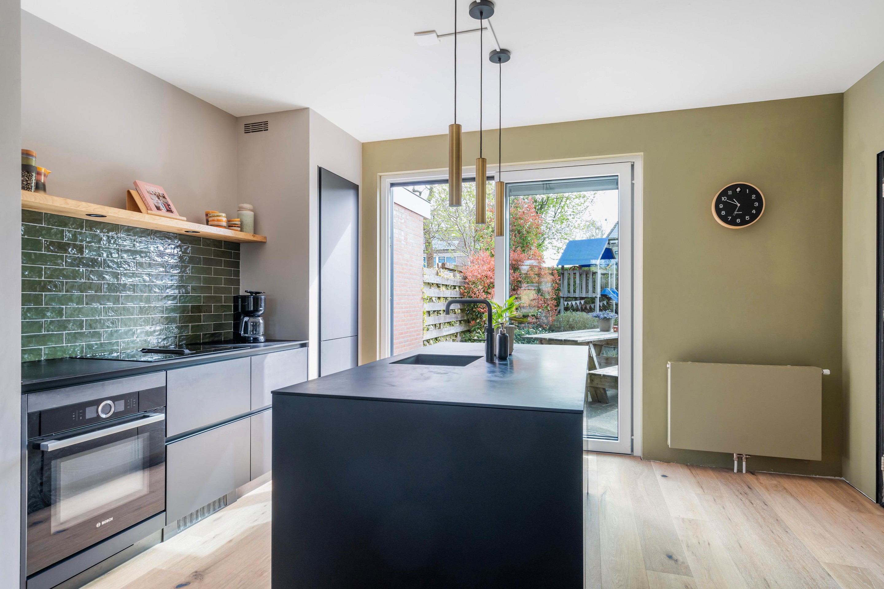 De woonkamer is licht en sfeervol, mede dankzij de nieuwe schuifpui (2024) die zorgt voor een prettige verbinding met de tuin. De recent geplaatste keuken (2024) is modern en compleet uitgevoerd en vormt samen met de parketvloer een eigentijdse basis op de begane grond.