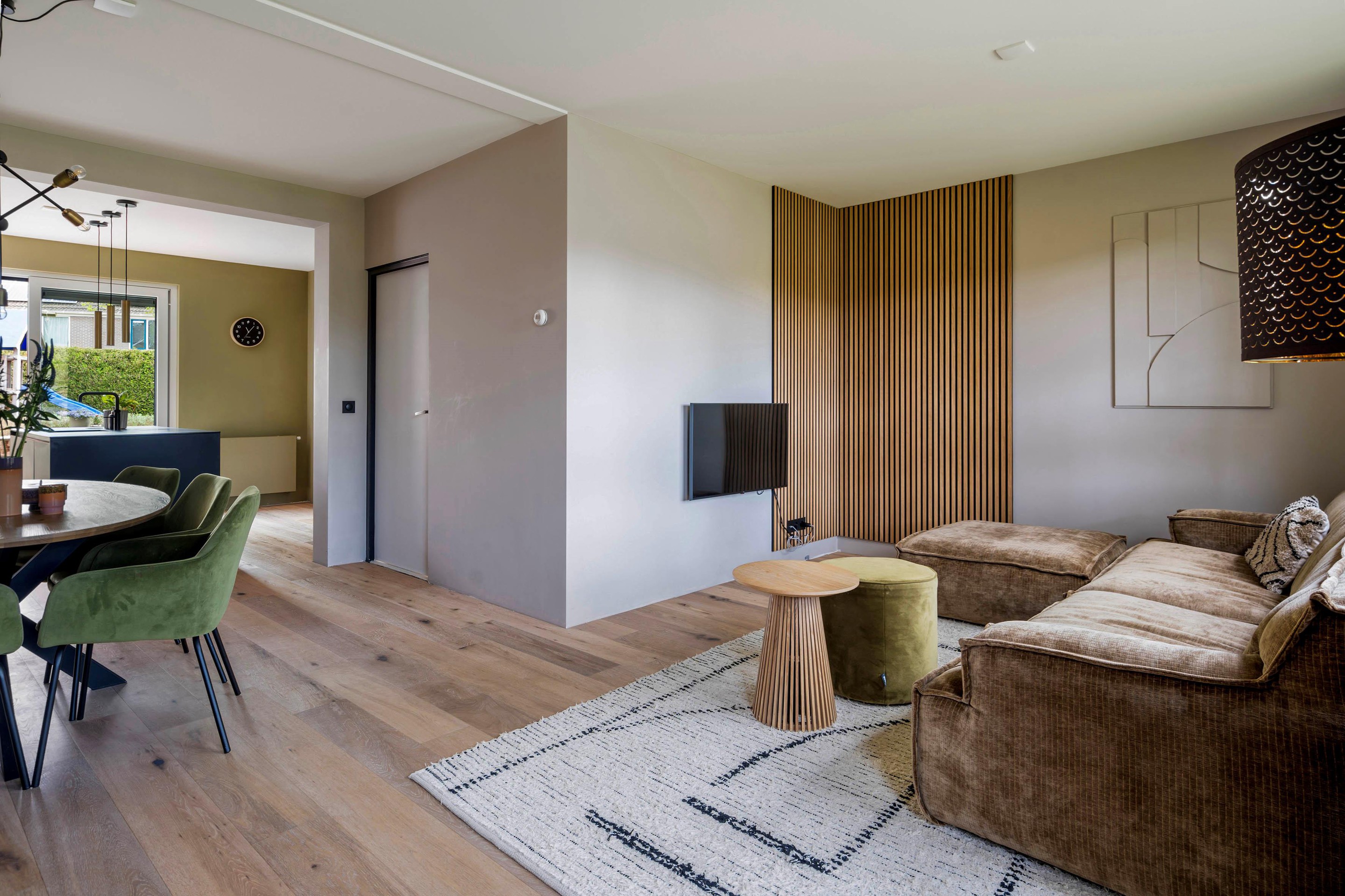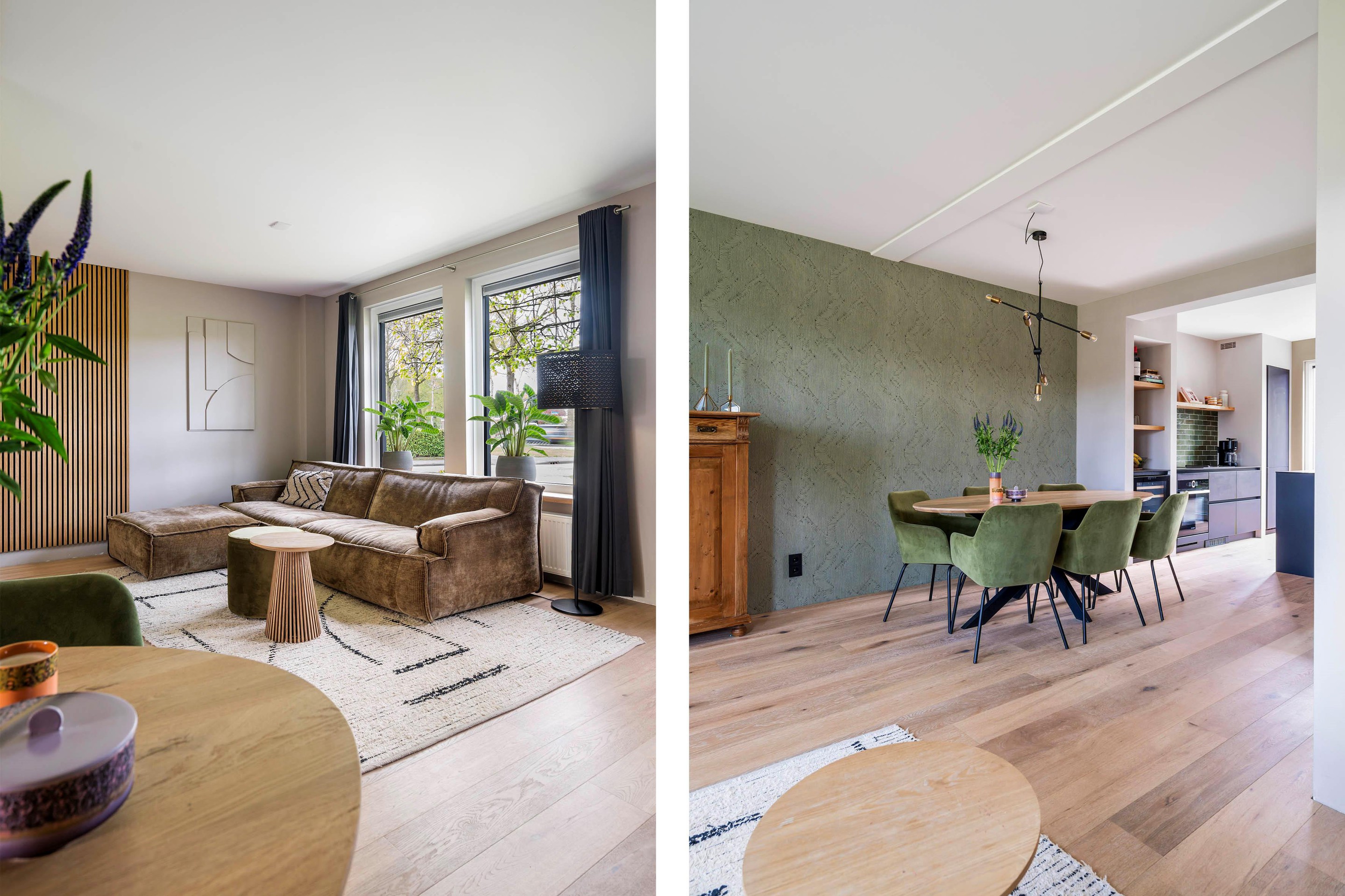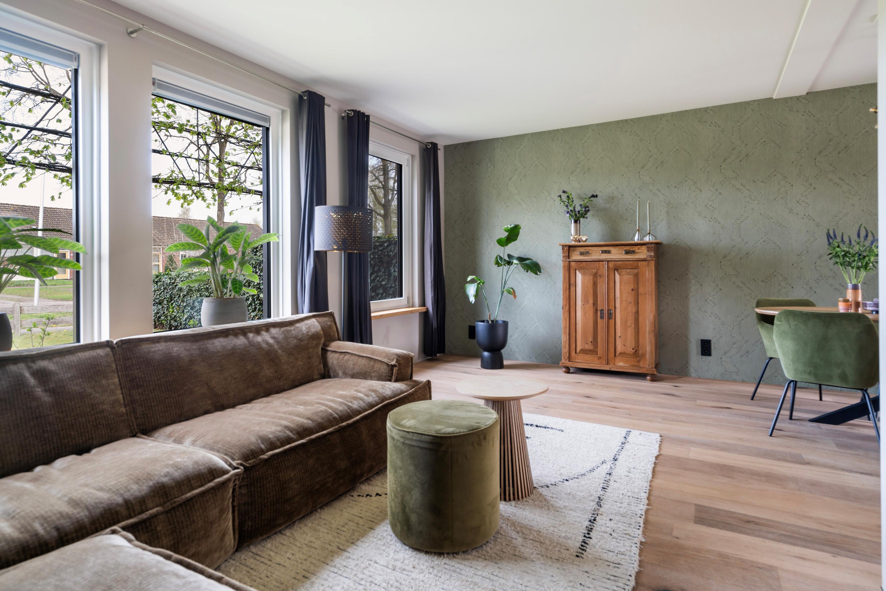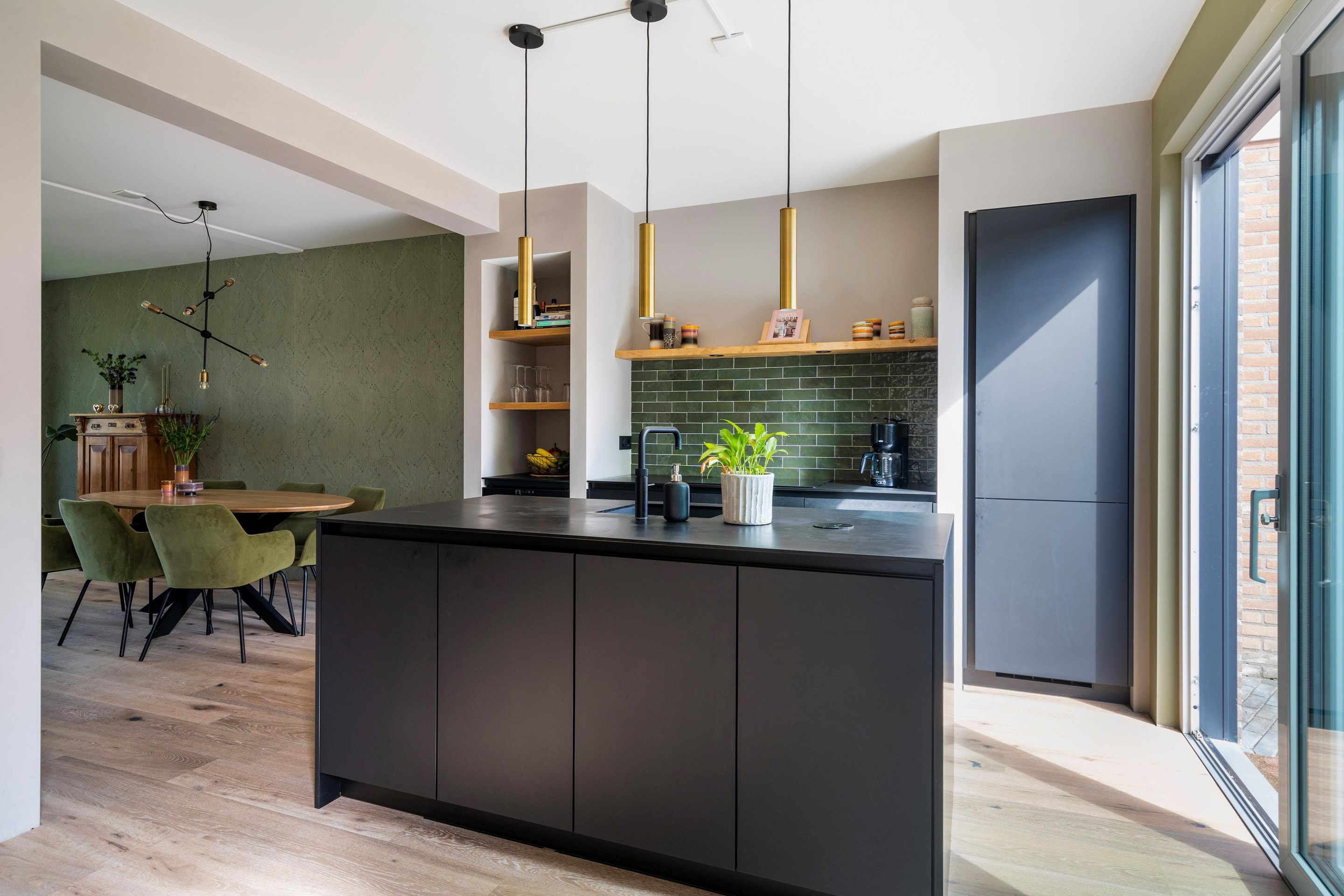 De woonkamer is licht en sfeervol, mede dankzij de nieuwe schuifpui (2024) die zorgt voor een prettige verbinding met de tuin. De recent geplaatste keuken (2024) is modern en compleet uitgevoerd en vormt samen met de parketvloer een eigentijdse basis op de begane grond.