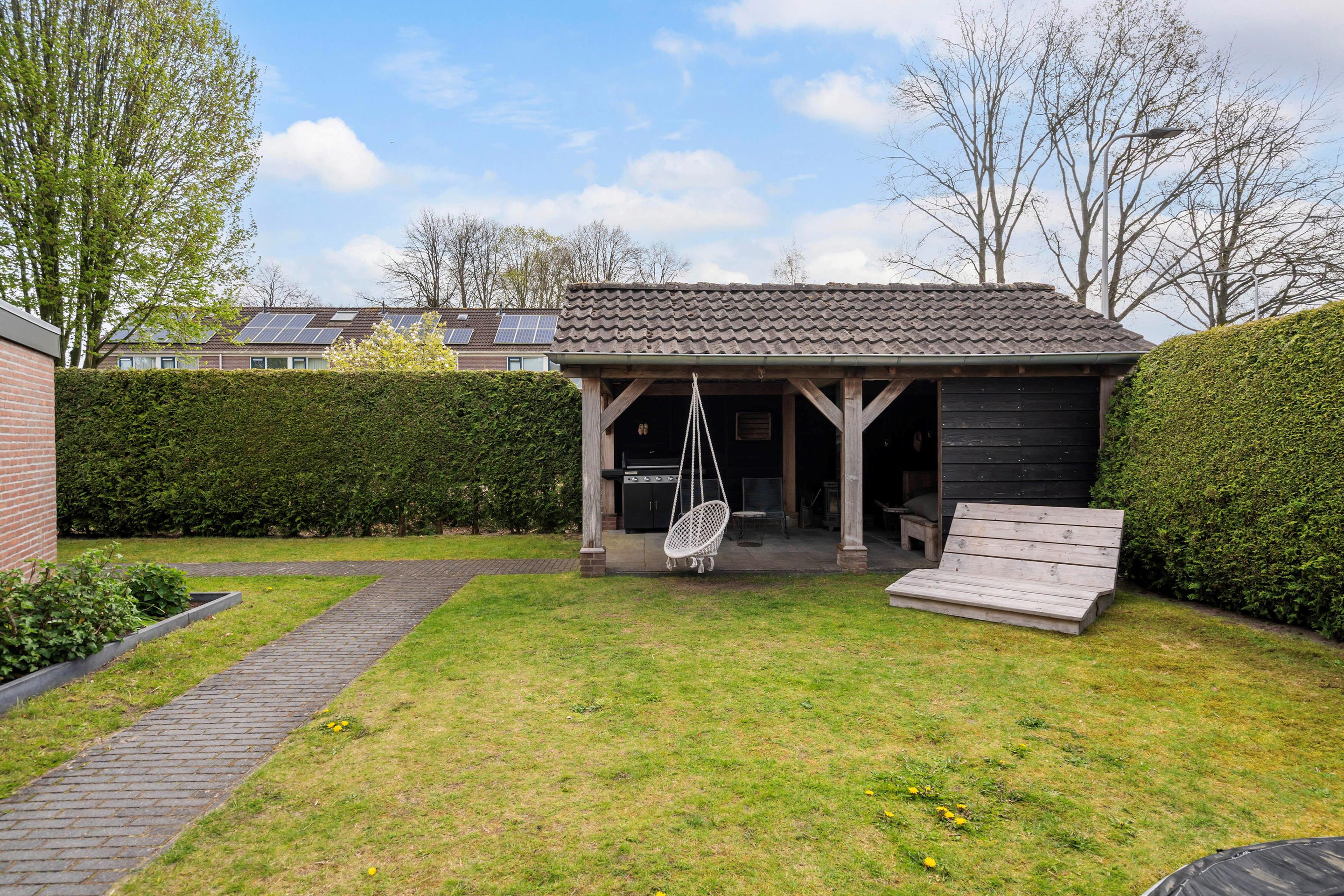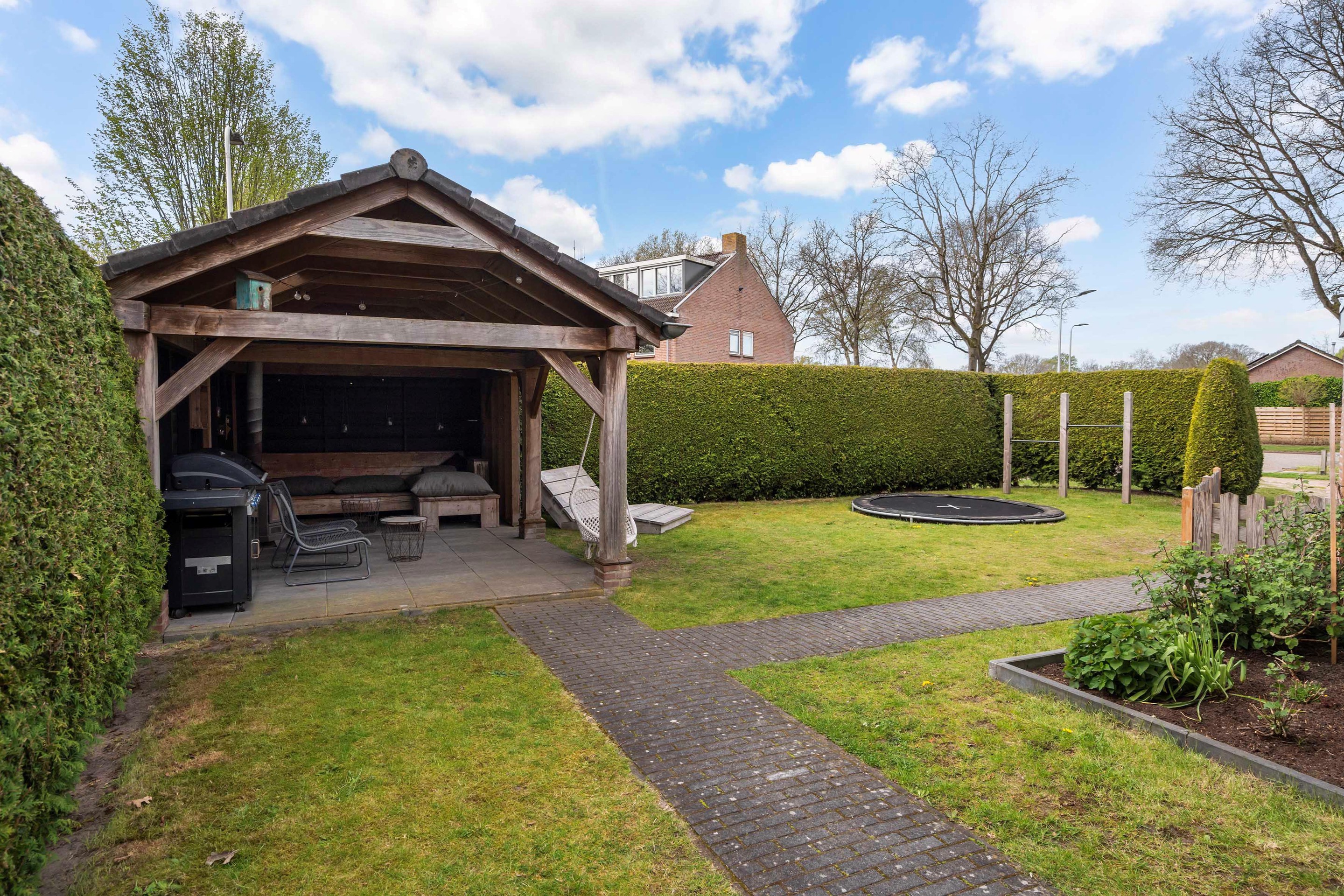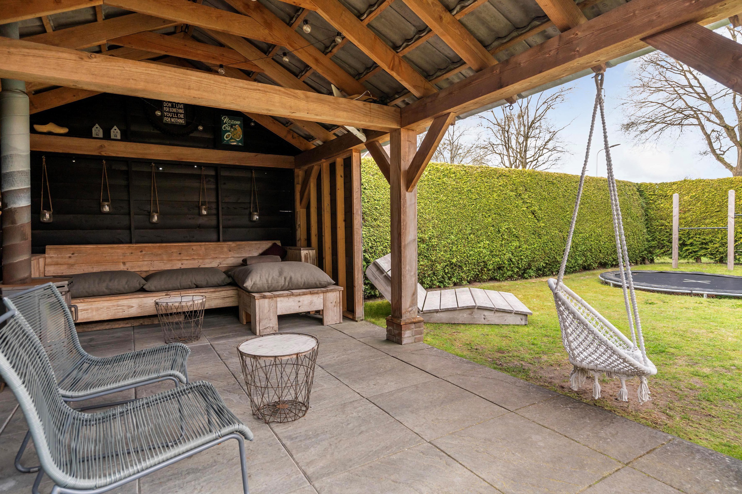 De tuin is een fijne buitenruimte, waarbij naast de oprit van de woning ook meer tuin is en het geheel een goede basis geeft voor meerdere zithoeken. Hierdoor kun je op verschillende momenten van de dag een prettige plek vinden in de zon of schaduw. De overkapping met houtkachel achter in de tuin zorgt voor extra leefcomfort en maakt het mogelijk om ook op minder zonnige dagen buiten te zitten.