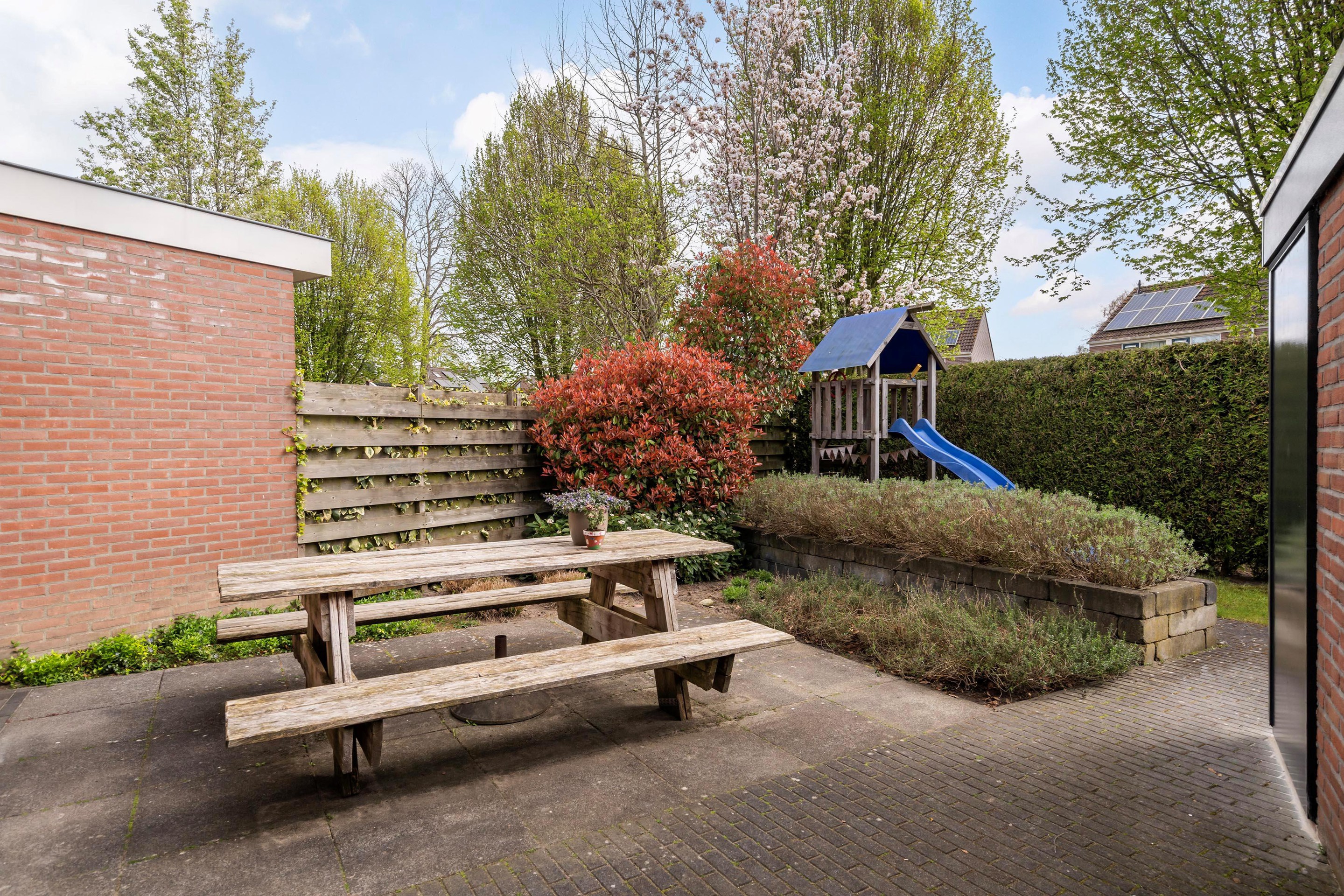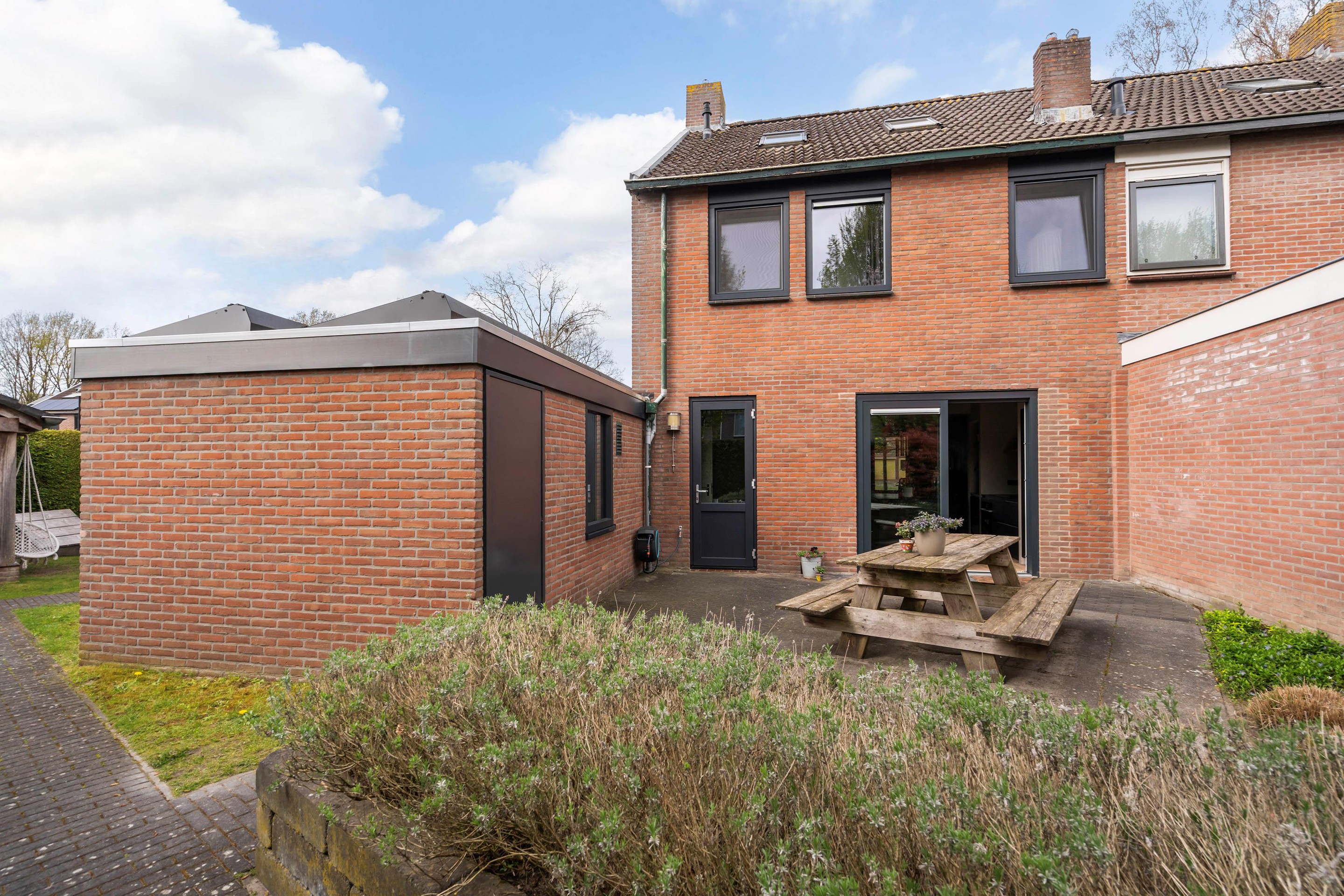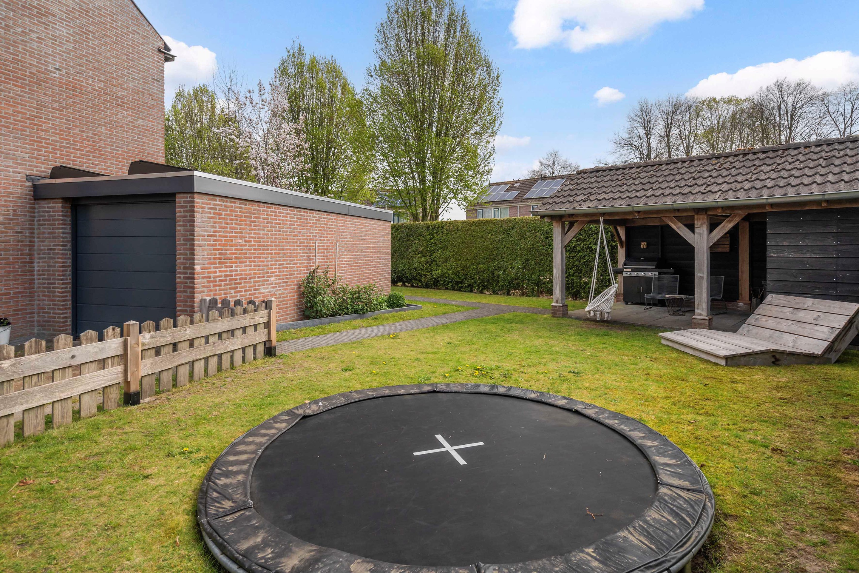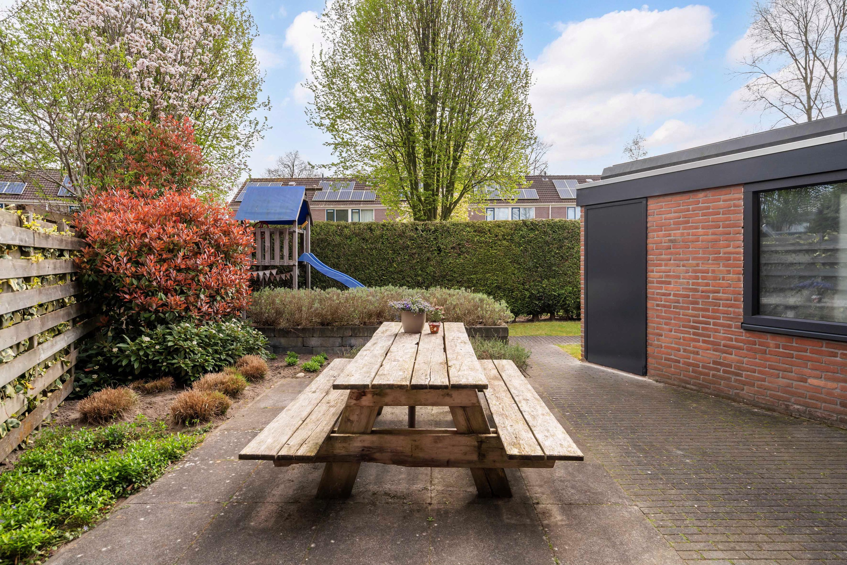 De tuin is een fijne buitenruimte, waarbij naast de oprit van de woning ook meer tuin is en het geheel een goede basis geeft voor meerdere zithoeken. Hierdoor kun je op verschillende momenten van de dag een prettige plek vinden in de zon of schaduw. De overkapping met houtkachel achter in de tuin zorgt voor extra leefcomfort en maakt het mogelijk om ook op minder zonnige dagen buiten te zitten.
