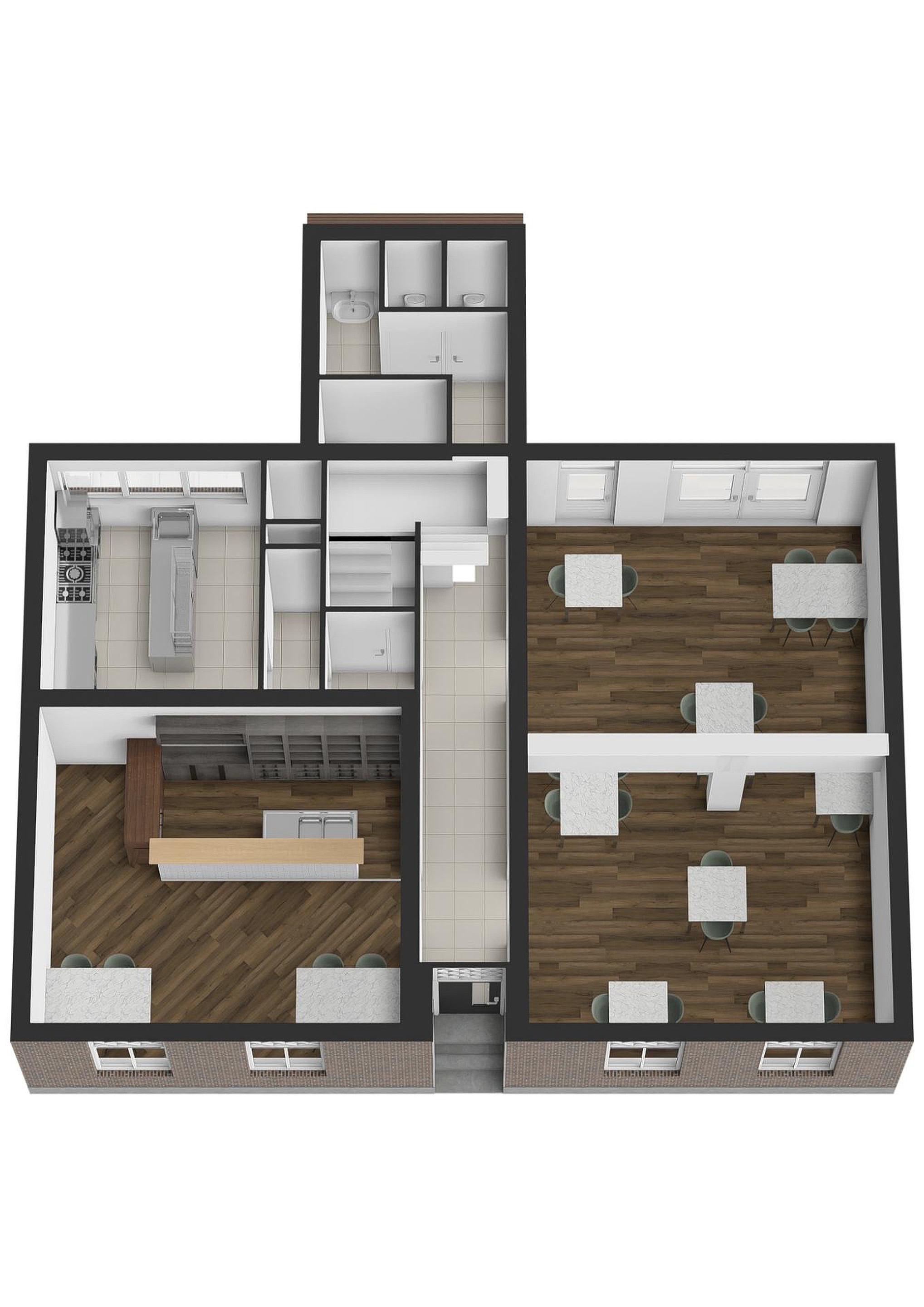 Fraaie hal (11 m2) met authentieke tegelvloer, restaurant (48 m2) met plankenvloer, originele schouw en tuindeuren met toegang tot het terras, bargedeelte (30 m2) met parketvloer, keuken (12 m2) en de toiletgroep (12 m2) bestaande uit een voorportaal met wastafel en een dames- en herentoilet.