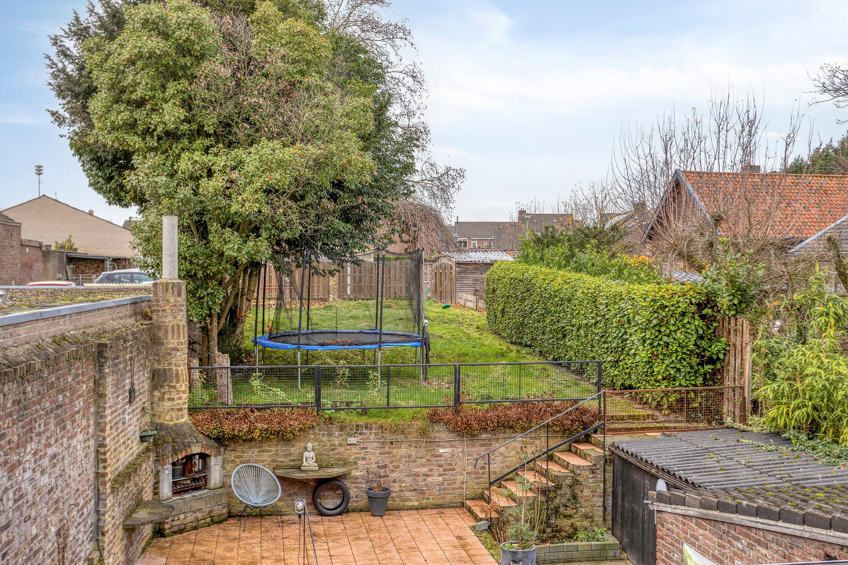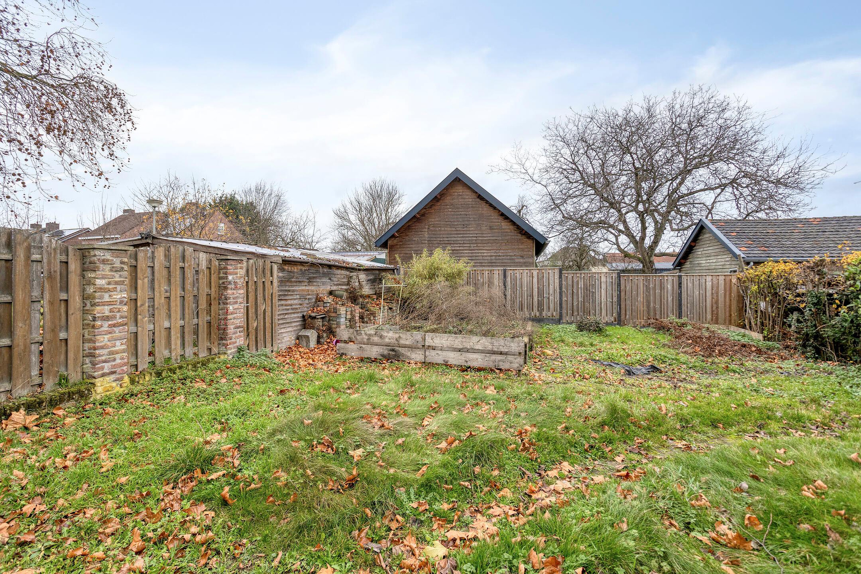 De ruime, op net zuidwesten gelegen tuin beschikt over een betegeld terras waar men van alle privacy van de zon kunt genieten. Via een trap bereikt men het hoger gelegen deel van de achtertuin, dat is aangelegd met gazon, diverse bomen en beplanting. De tuin is volledig omsloten door deels een houten schutting en een groene heg, wat zorgt voor een beschutte buitenruimte.