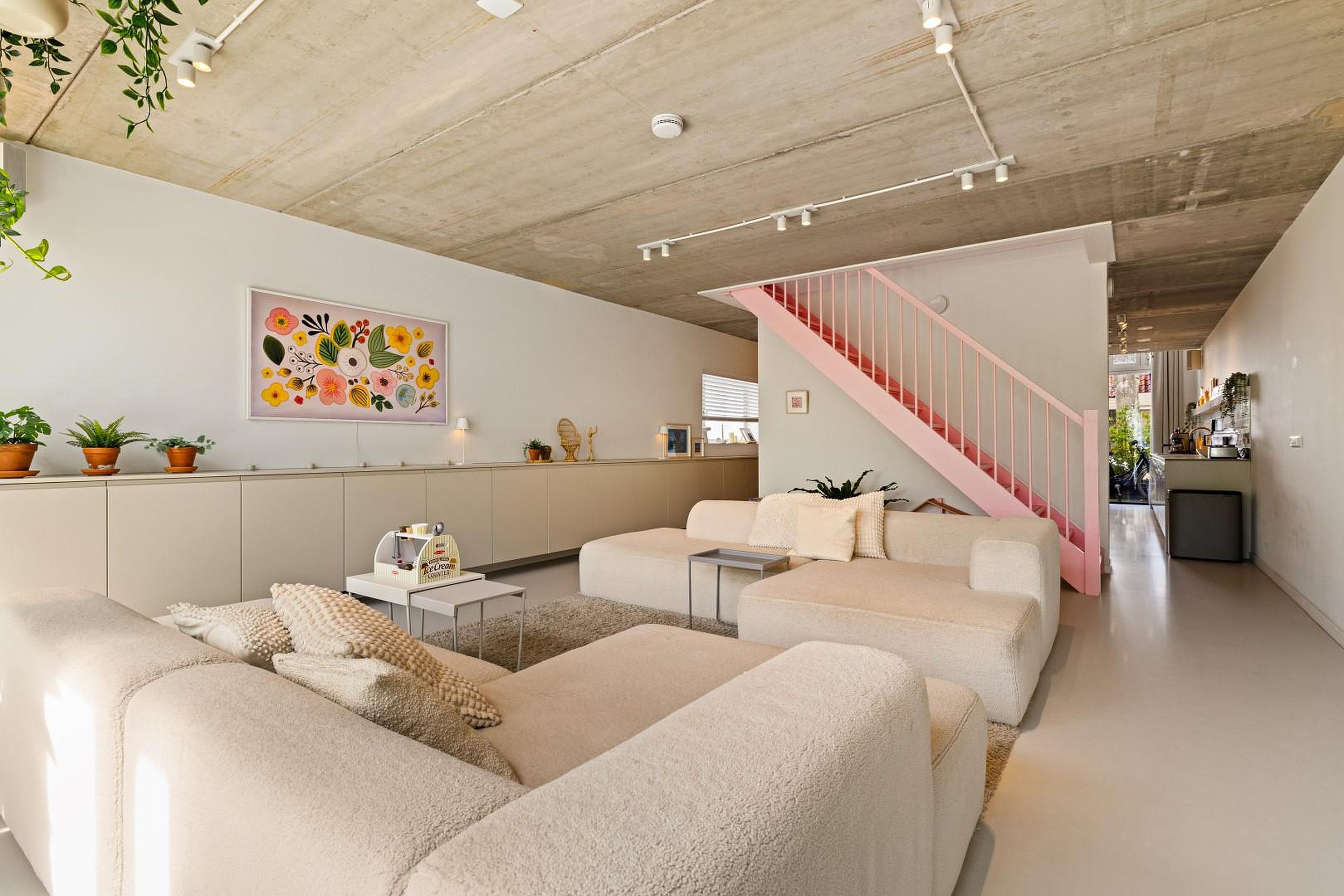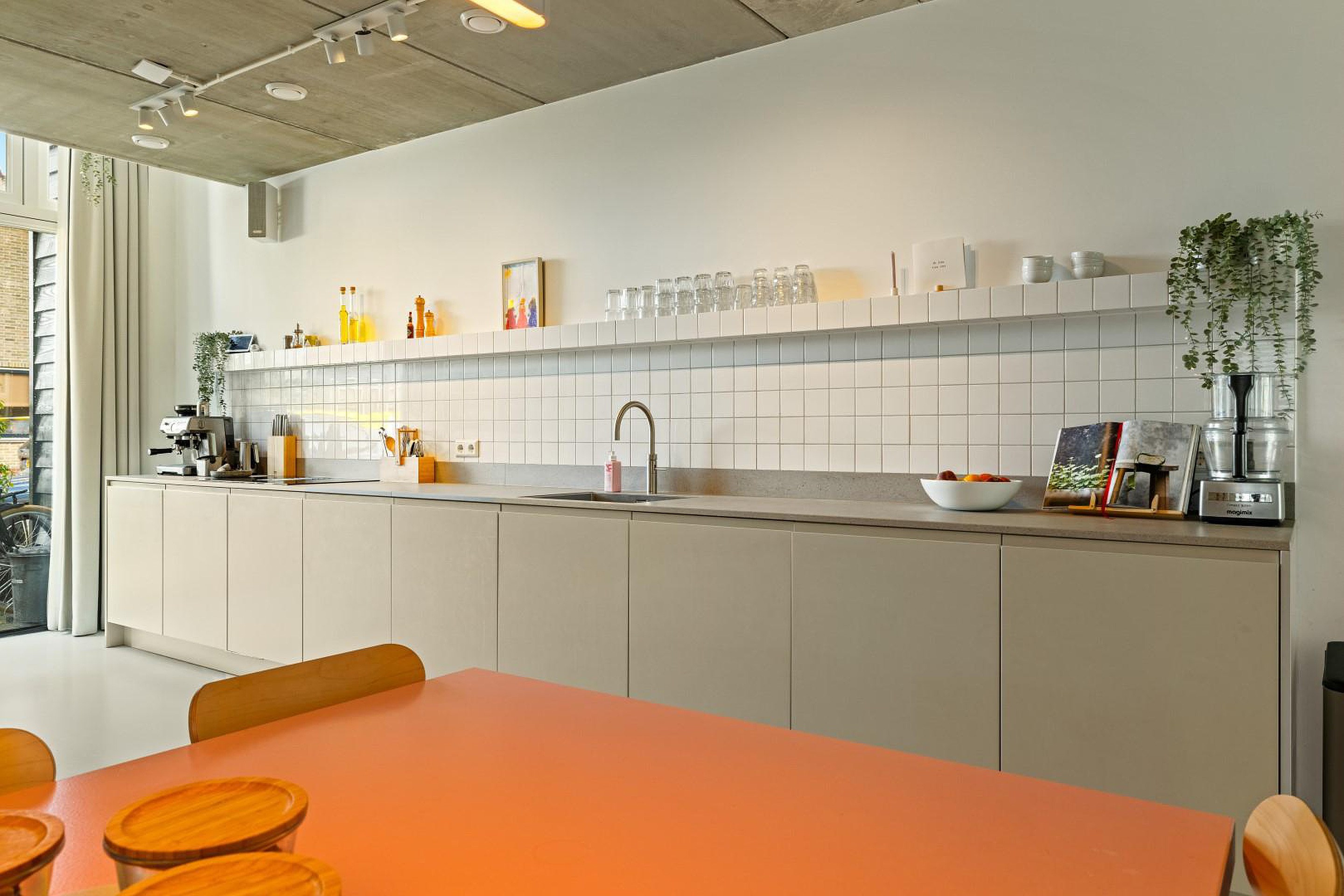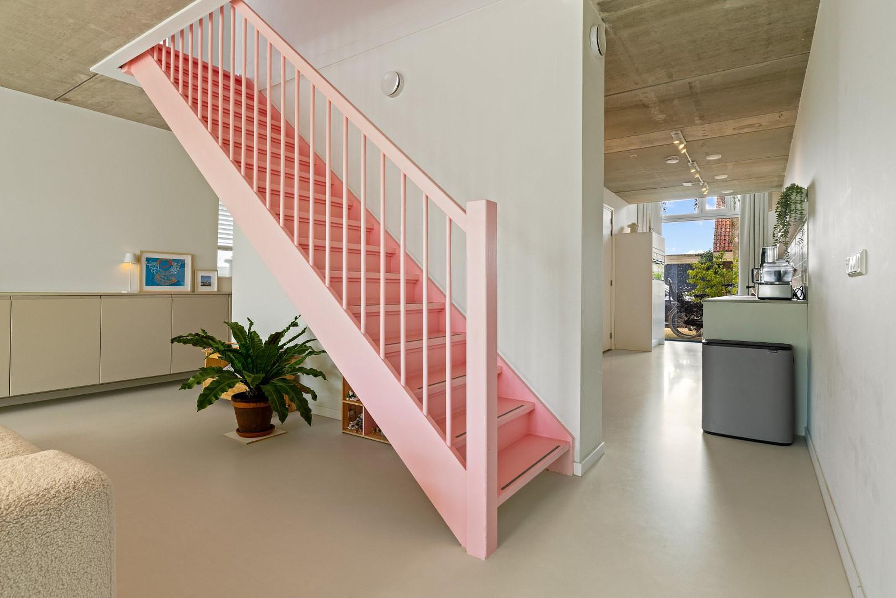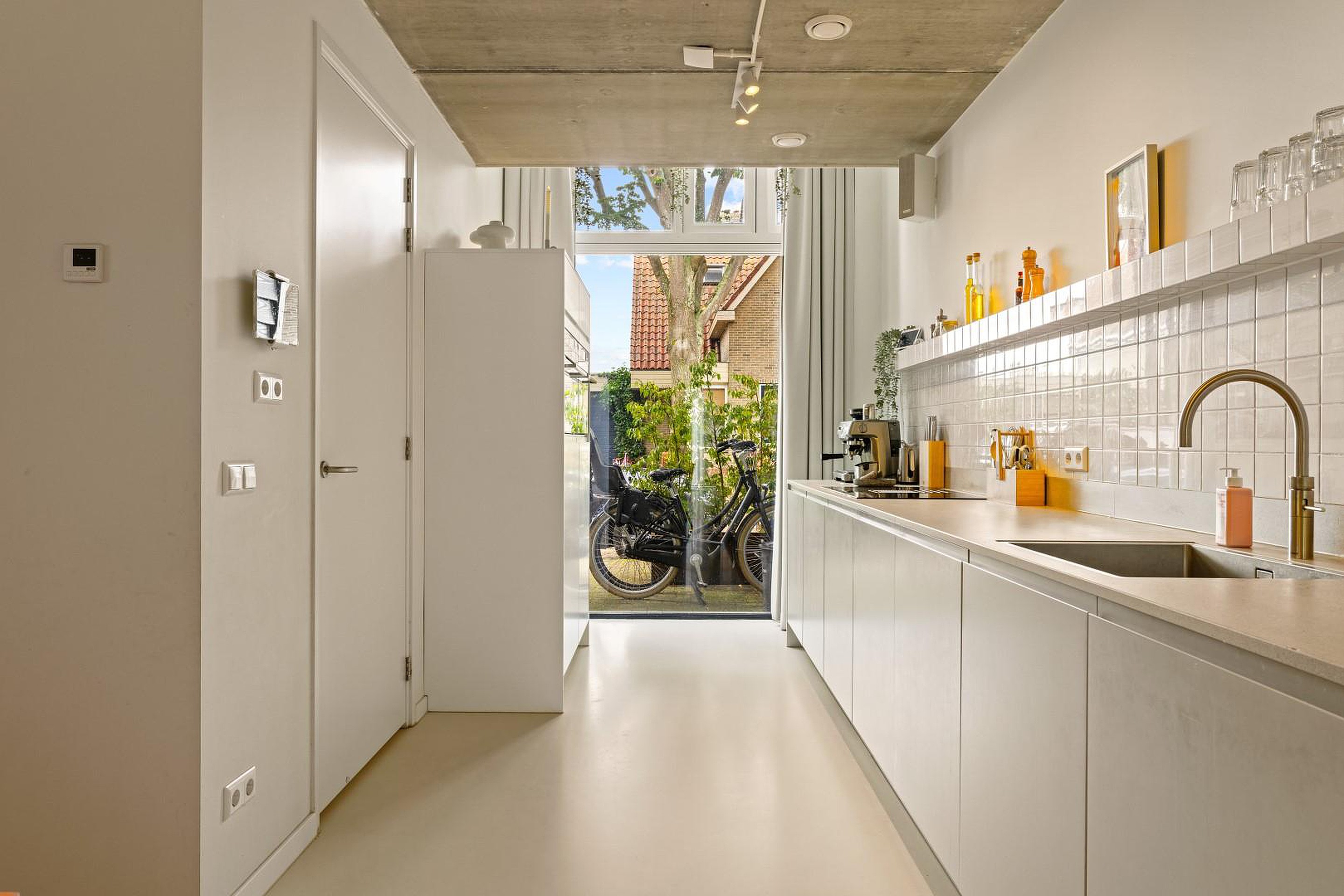 De begane grond is indrukwekkend open en licht, met een prachtige gietvloer die in de hele woning is doorgelegd. De luxe woonkeuken is volledig uitgerust met hoogwaardige inbouwapparatuur: een oven, stoomoven, inductiekookplaat met geïntegreerde afzuiging, twee koelkasten, een losse vriezer, Quooker en een vaatwasser.