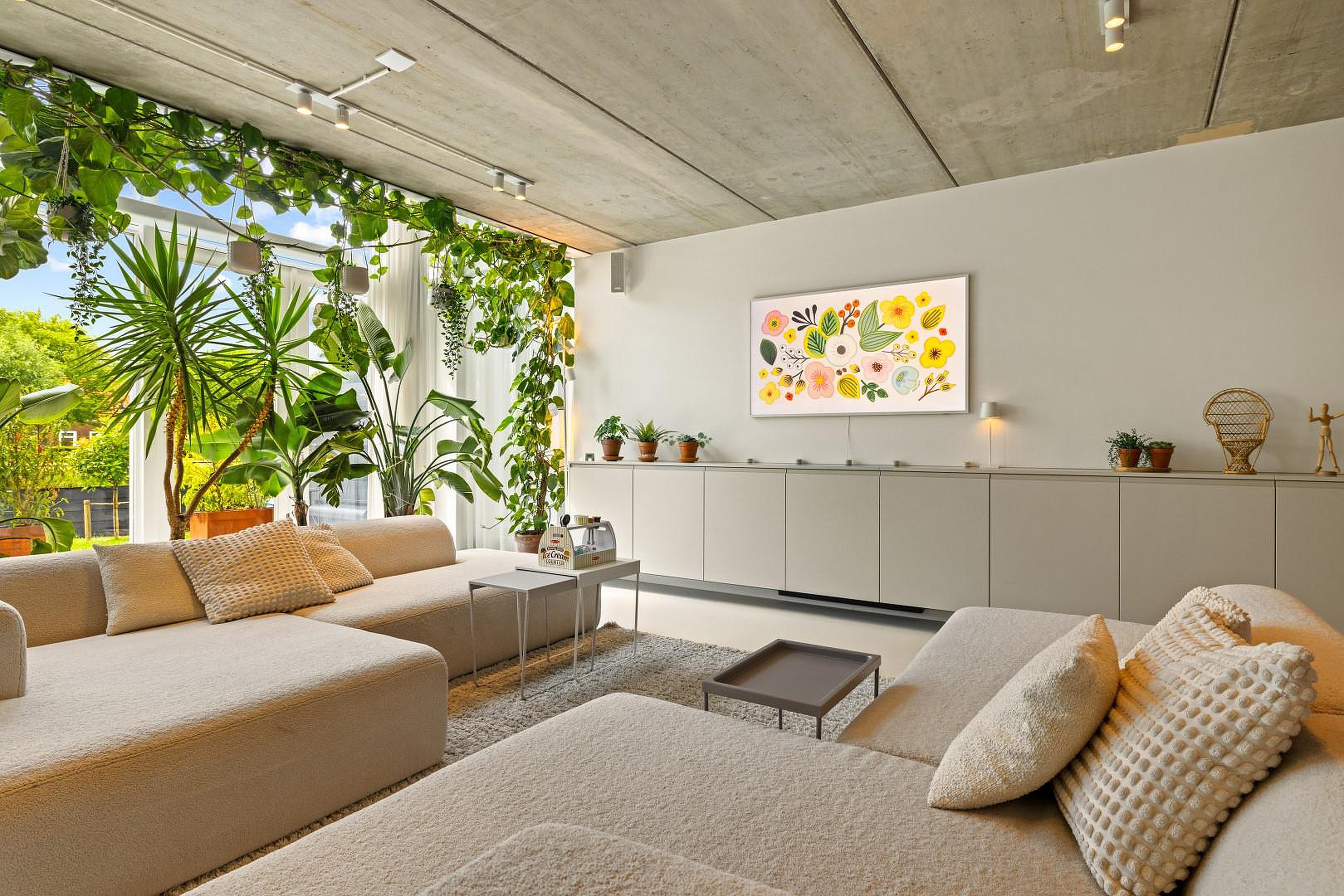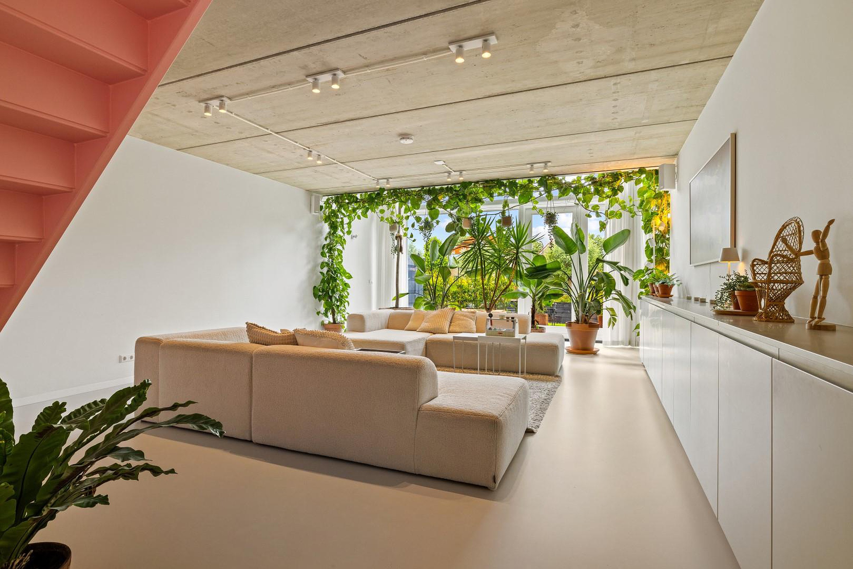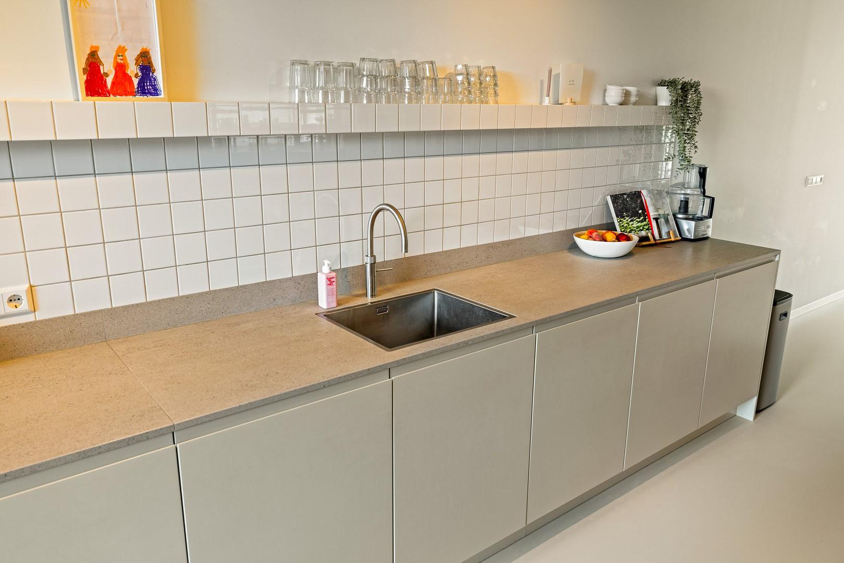De begane grond is indrukwekkend open en licht, met een prachtige gietvloer die in de hele woning is doorgelegd. De luxe woonkeuken is volledig uitgerust met hoogwaardige inbouwapparatuur: een oven, stoomoven, inductiekookplaat met geïntegreerde afzuiging, twee koelkasten, een losse vriezer, Quooker en een vaatwasser.