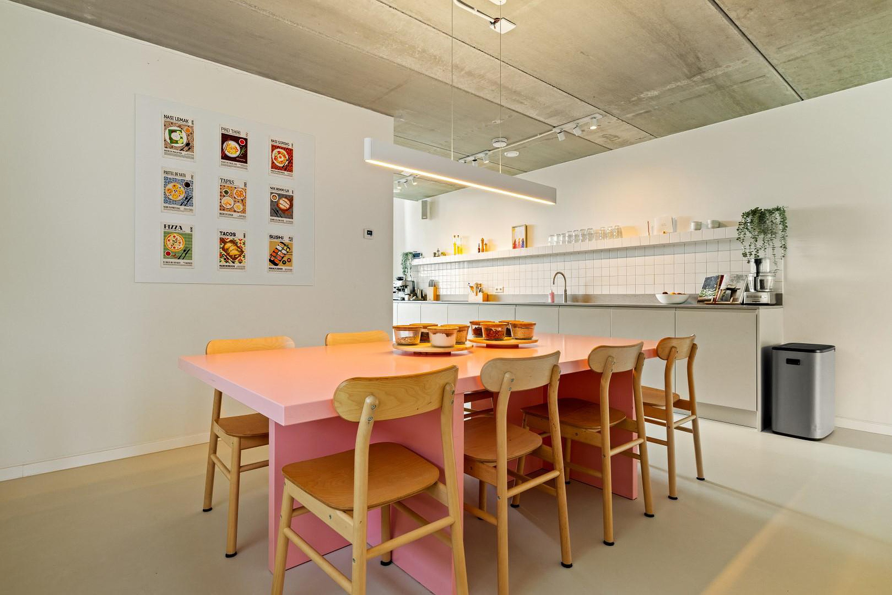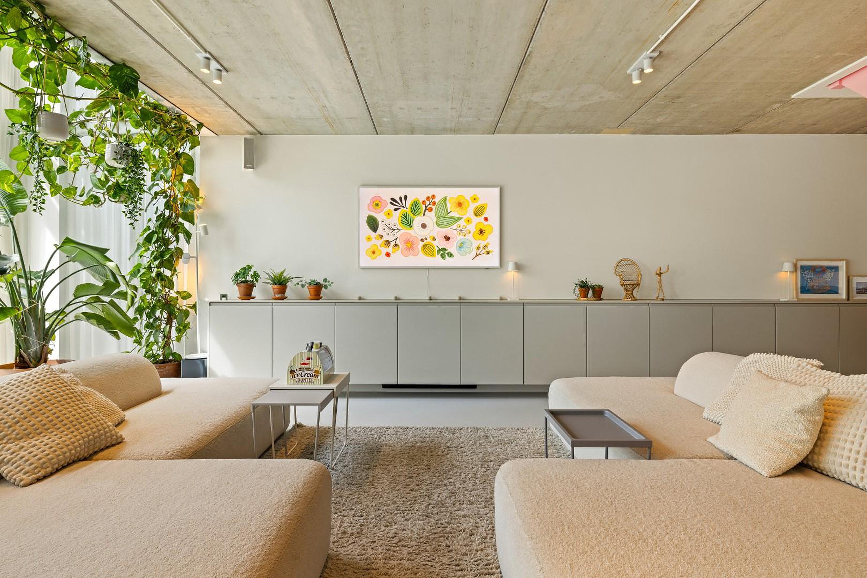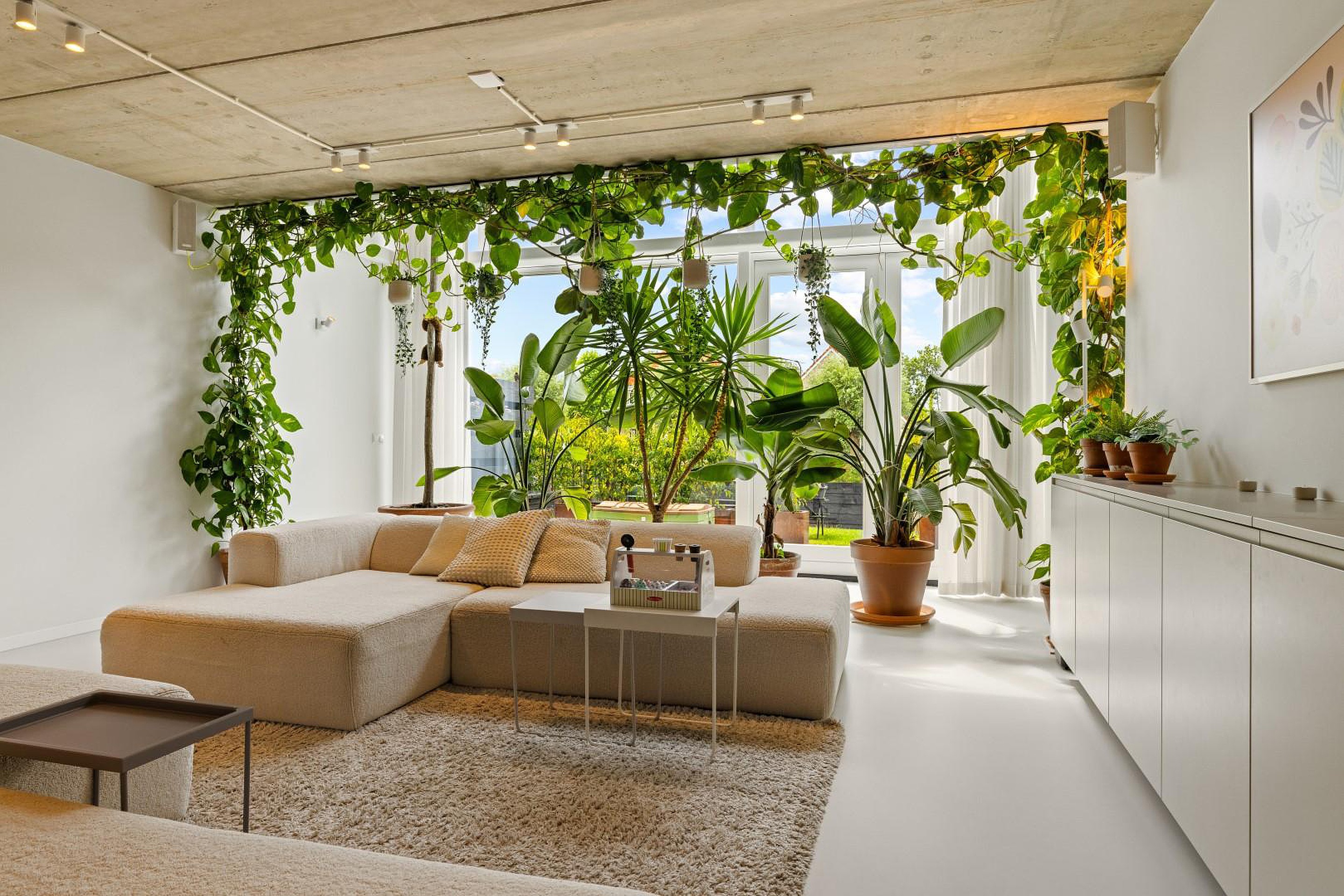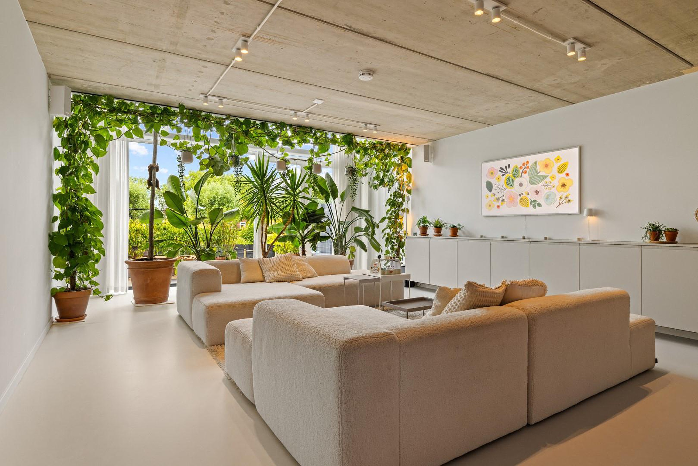 De begane grond is indrukwekkend open en licht, met een prachtige gietvloer die in de hele woning is doorgelegd. De luxe woonkeuken is volledig uitgerust met hoogwaardige inbouwapparatuur: een oven, stoomoven, inductiekookplaat met geïntegreerde afzuiging, twee koelkasten, een losse vriezer, Quooker en een vaatwasser.