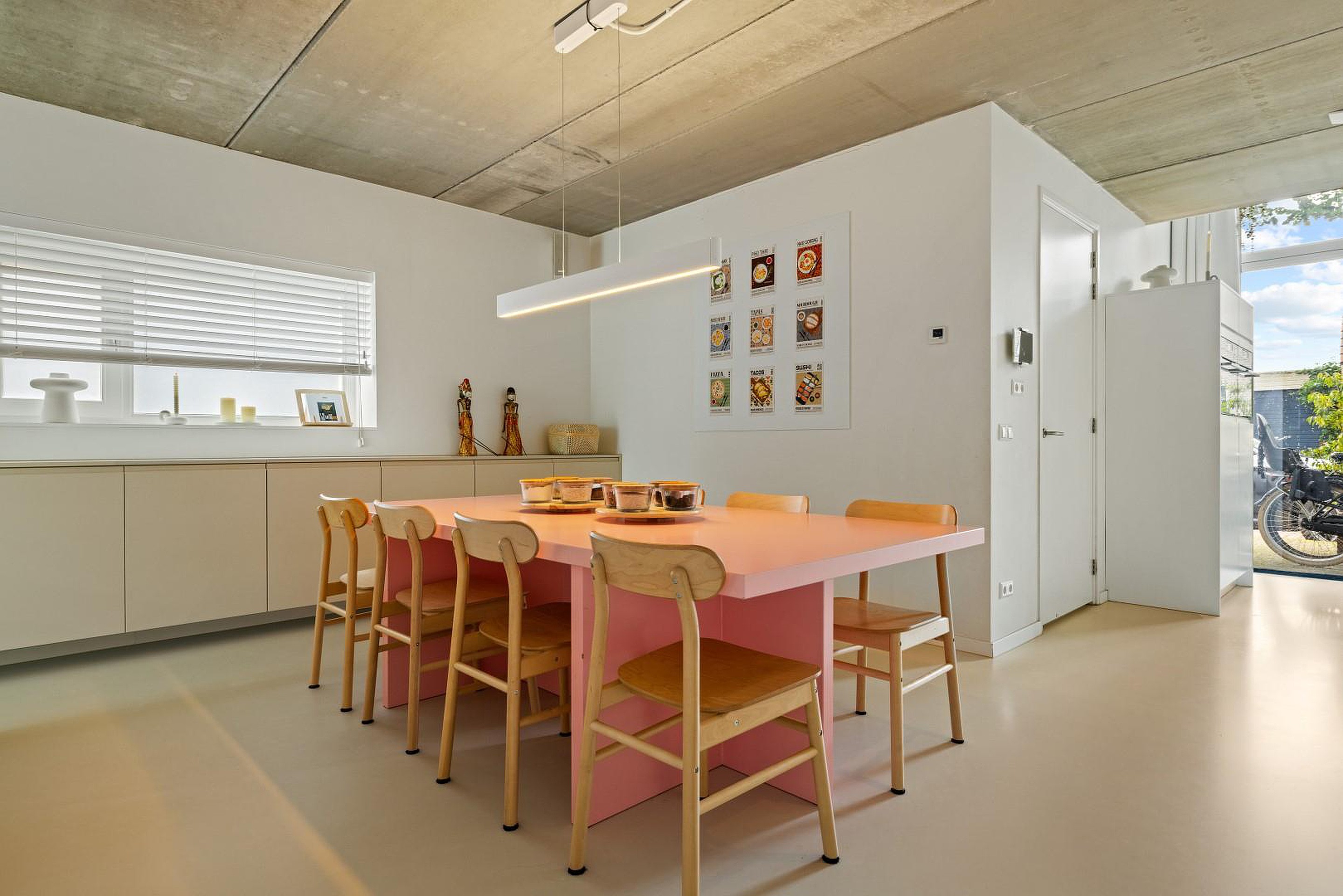 De eetkamer loopt naadloos over in de ruime woonkamer, waar de glazen achtergevel van maar liefst 4,45 meter hoog zorgt voor een adembenemende lichtinval en uitzicht op de zonnige tuin én het doorgaande vaarwater. Openslaande deuren verbinden binnen met buiten, ideaal voor zomerse dagen en lange avonden aan het water.