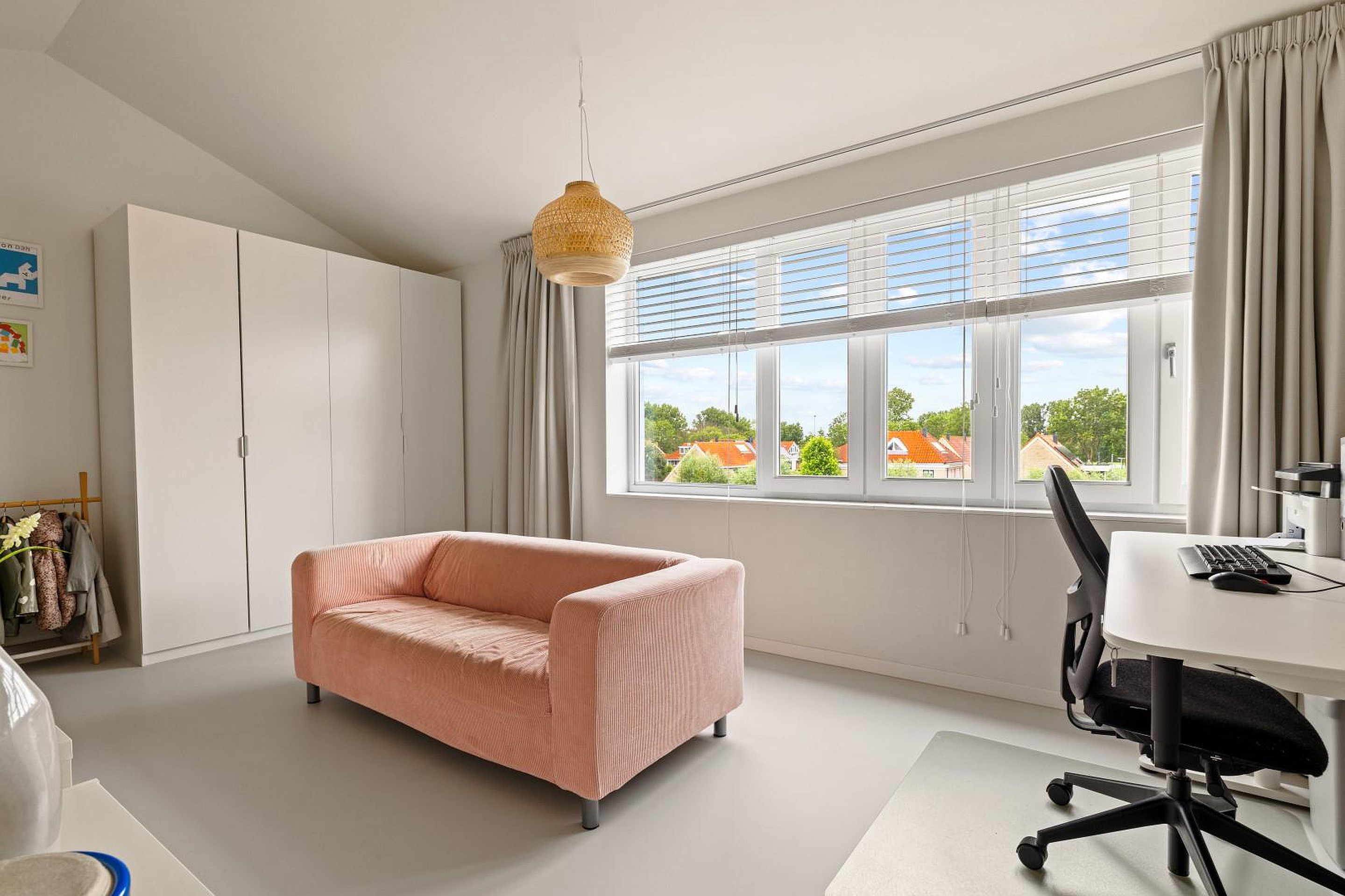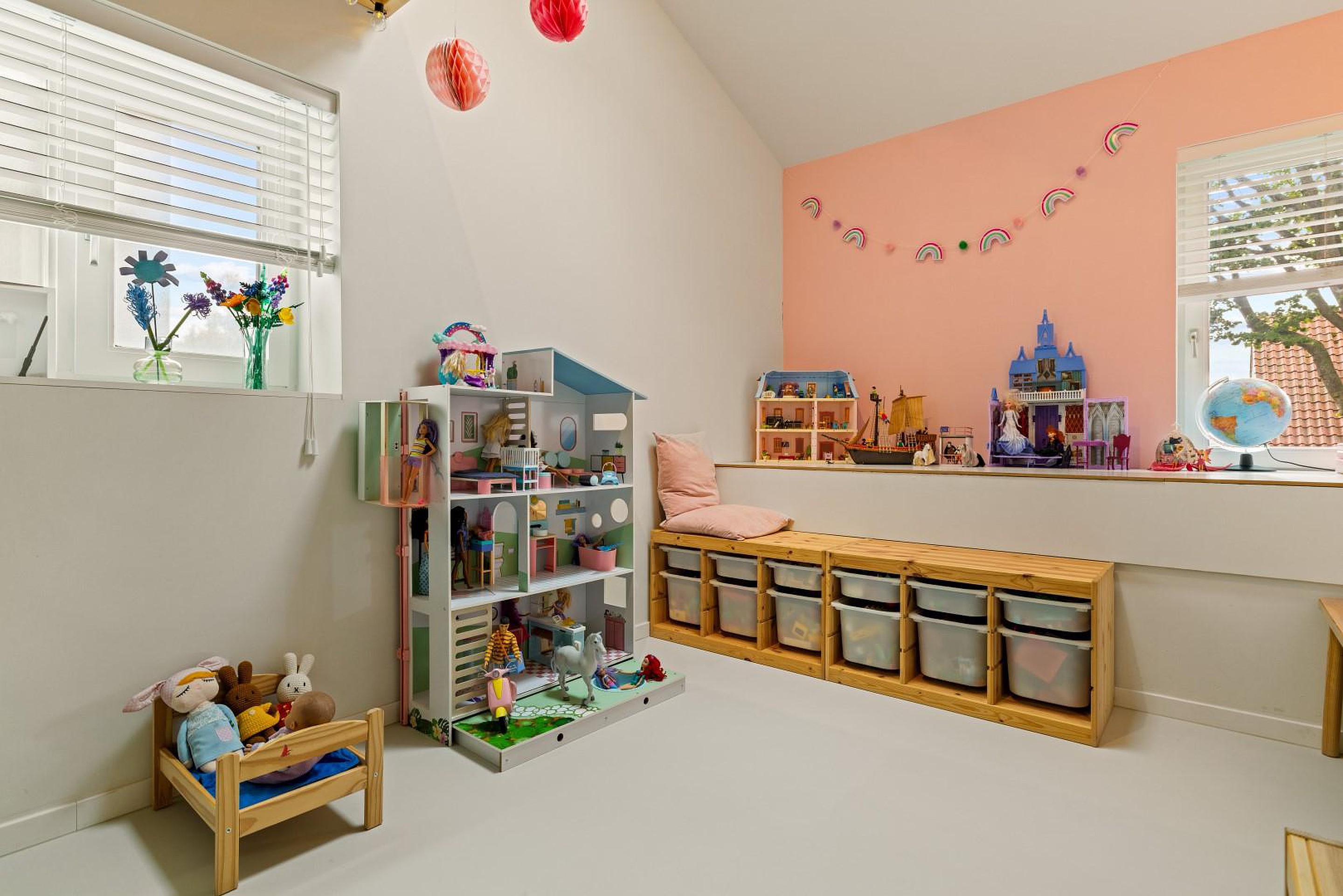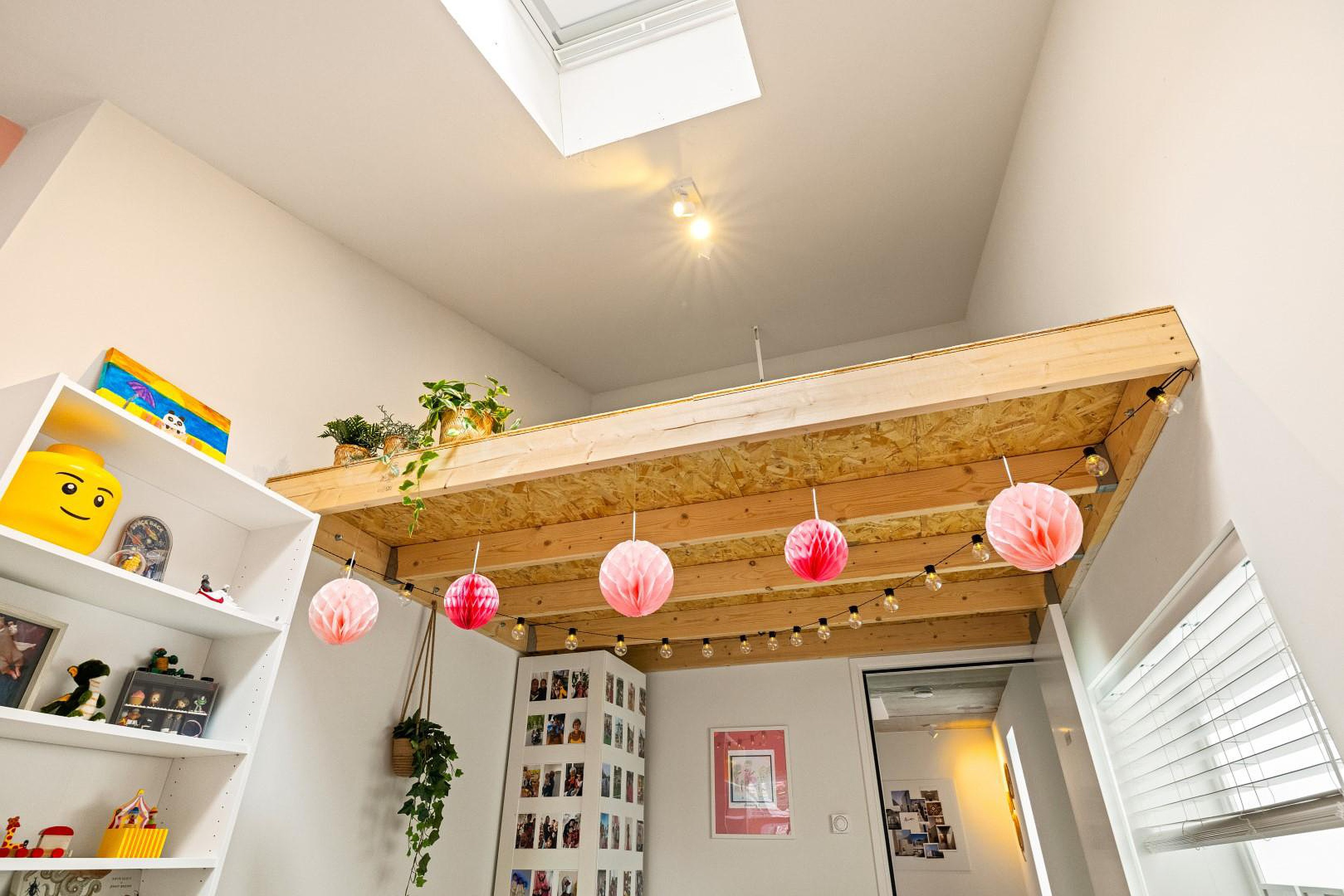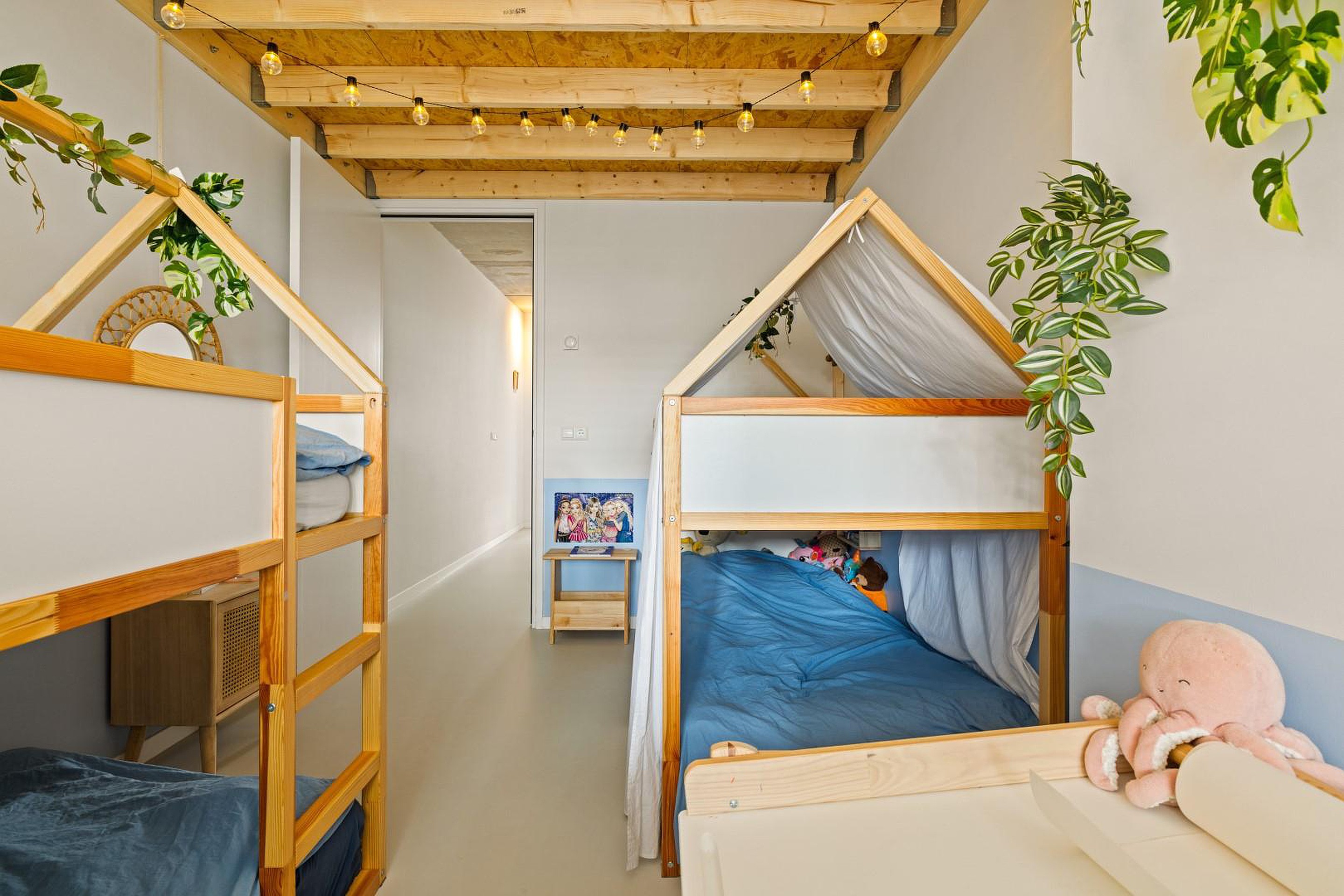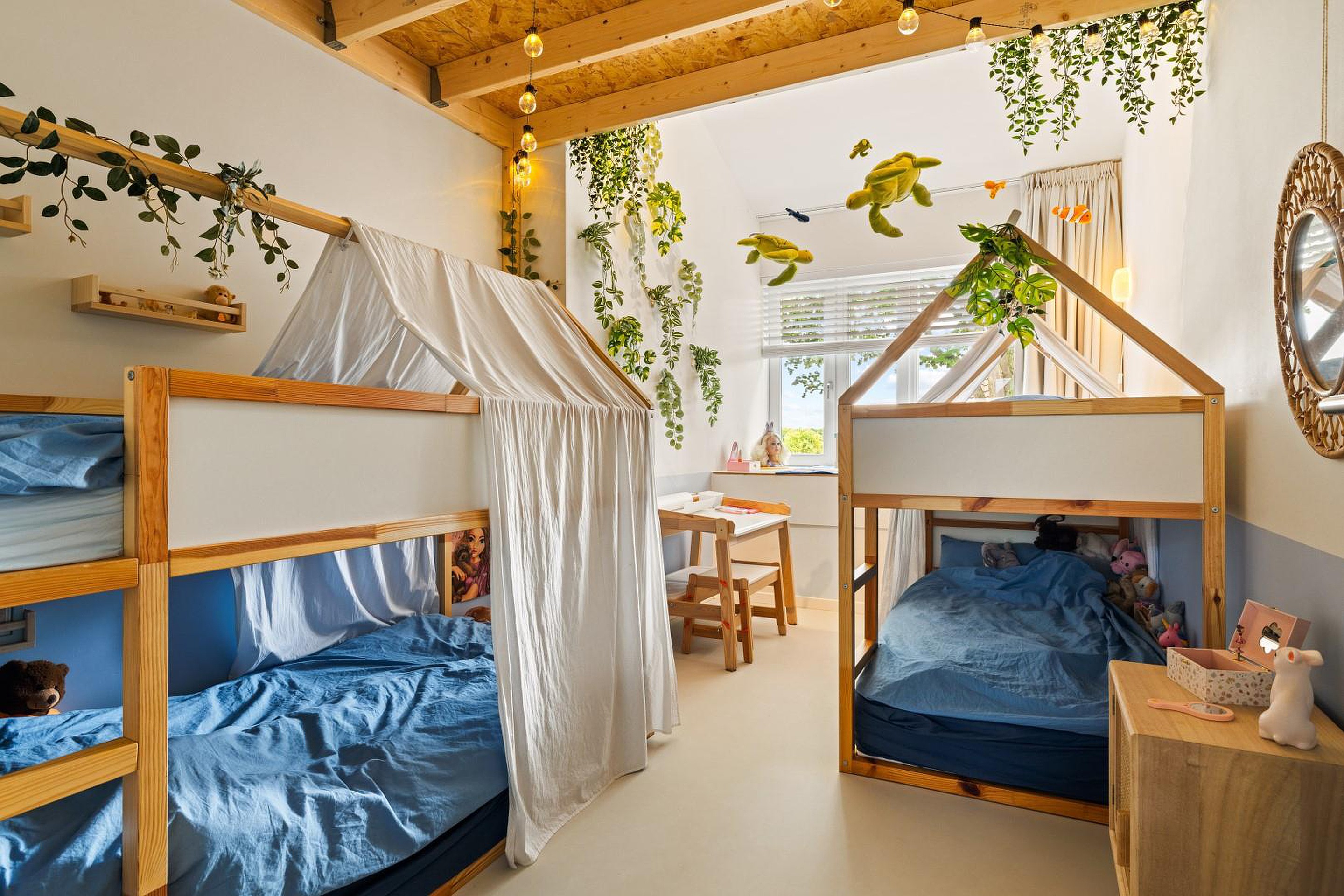 De overloop geeft toegang tot twee slaapkamers aan de voorzijde, elk voorzien van een sfeervolle vide, perfect als speelhoek of werkplek. In het midden van deze verdieping bevindt zich de moderne badkamer met inloopdouche, dubbele wastafel en tweede toilet.