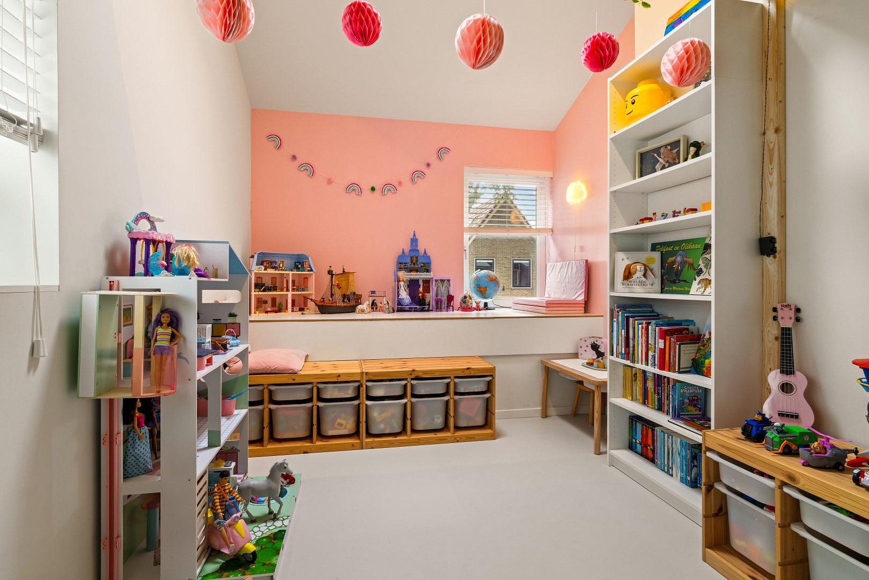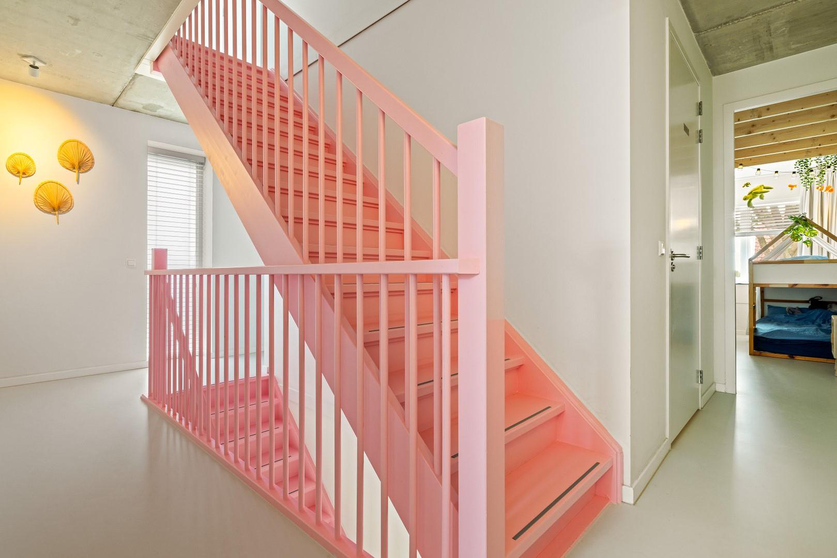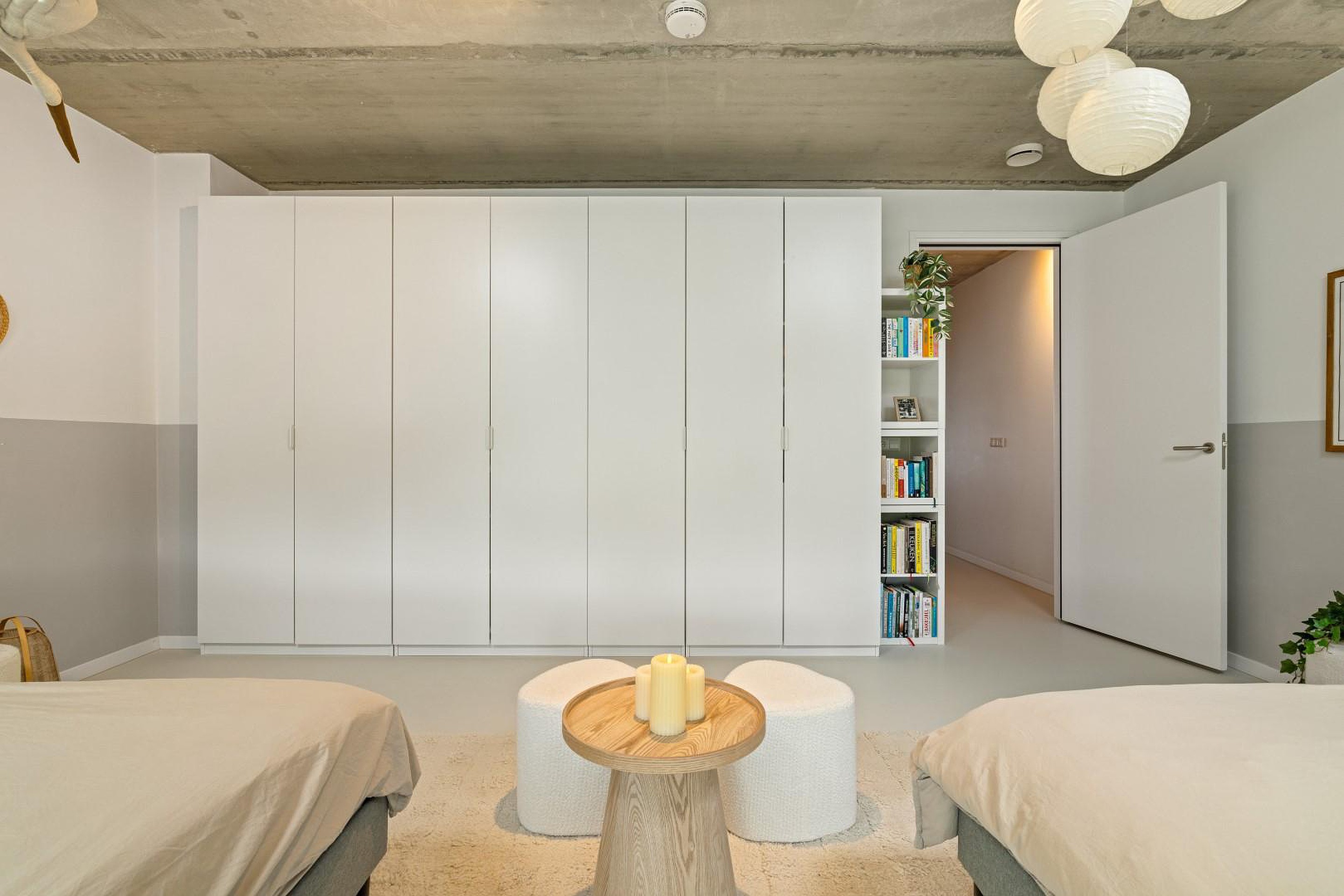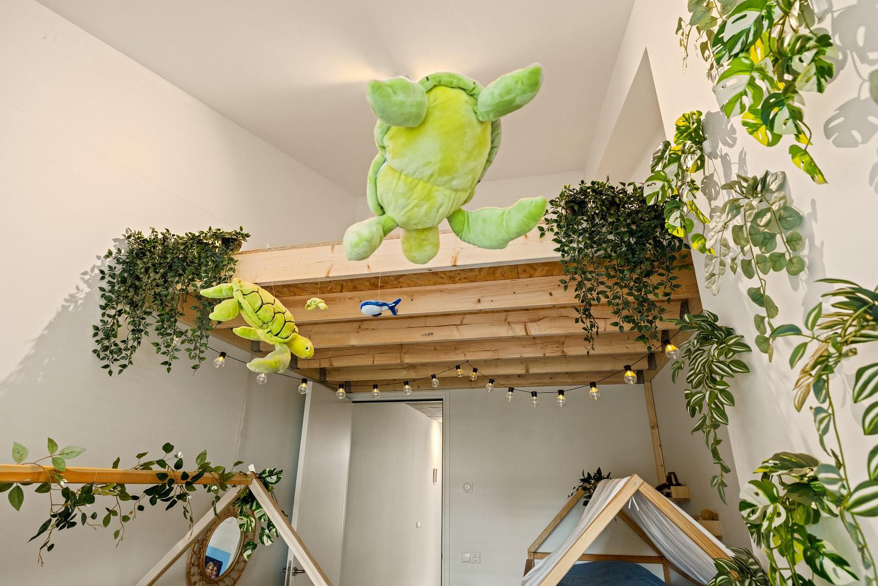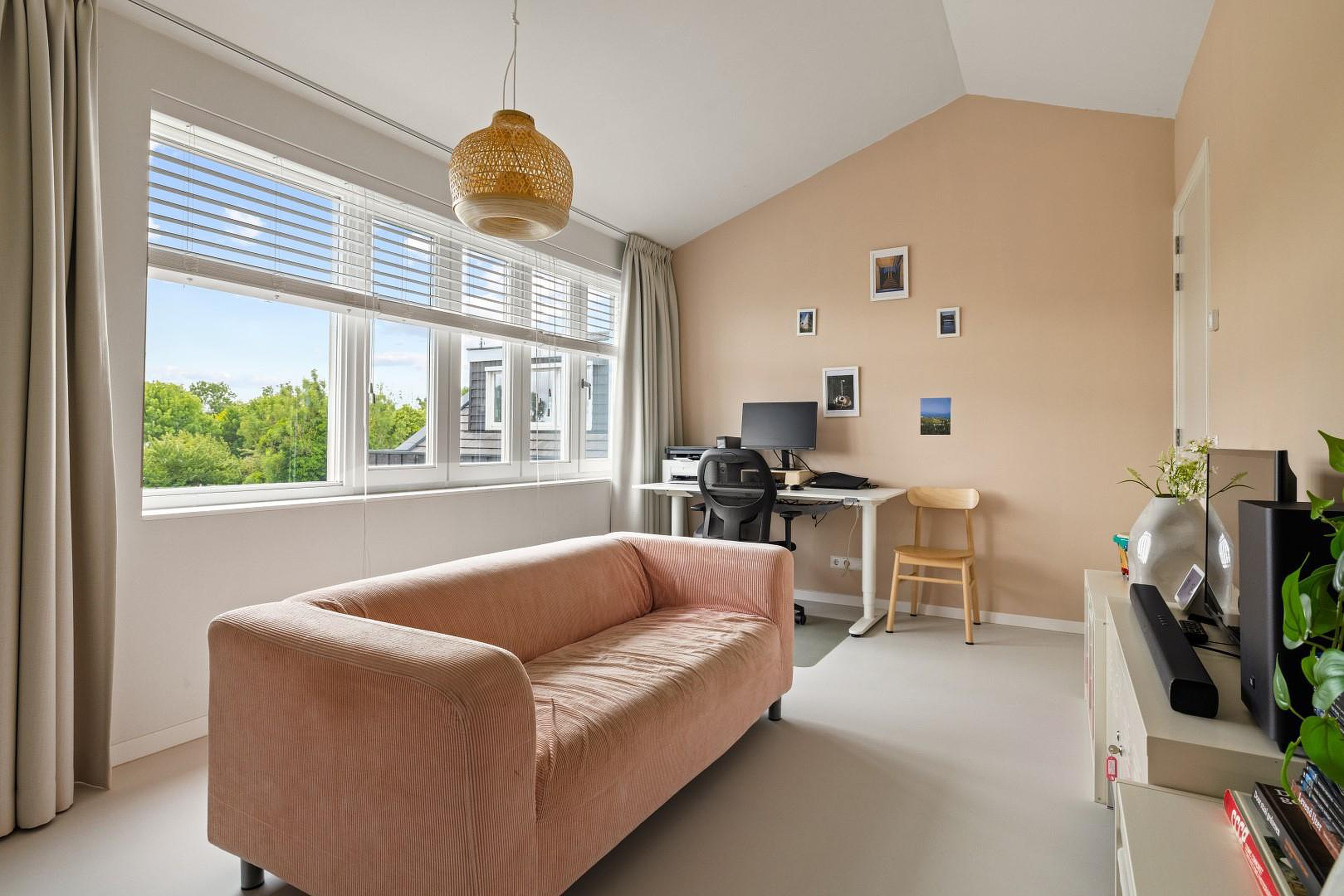 De overloop geeft toegang tot twee slaapkamers aan de voorzijde, elk voorzien van een sfeervolle vide, perfect als speelhoek of werkplek. In het midden van deze verdieping bevindt zich de moderne badkamer met inloopdouche, dubbele wastafel en tweede toilet.