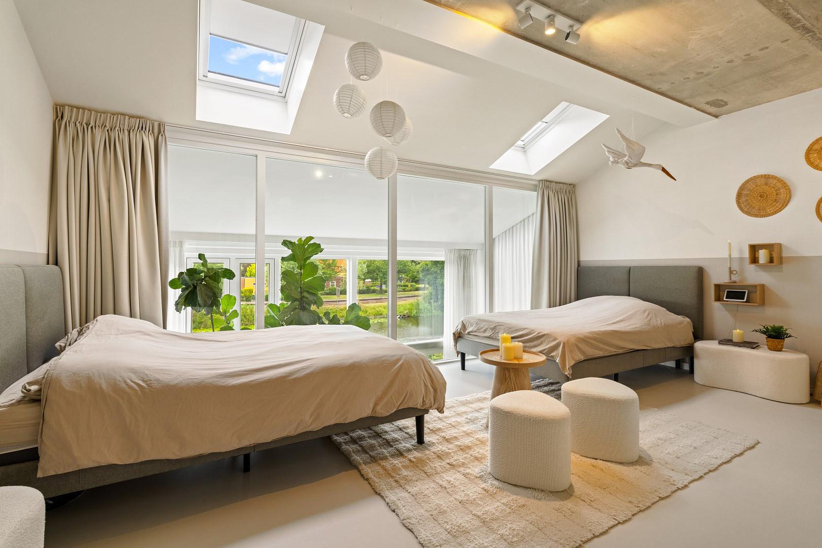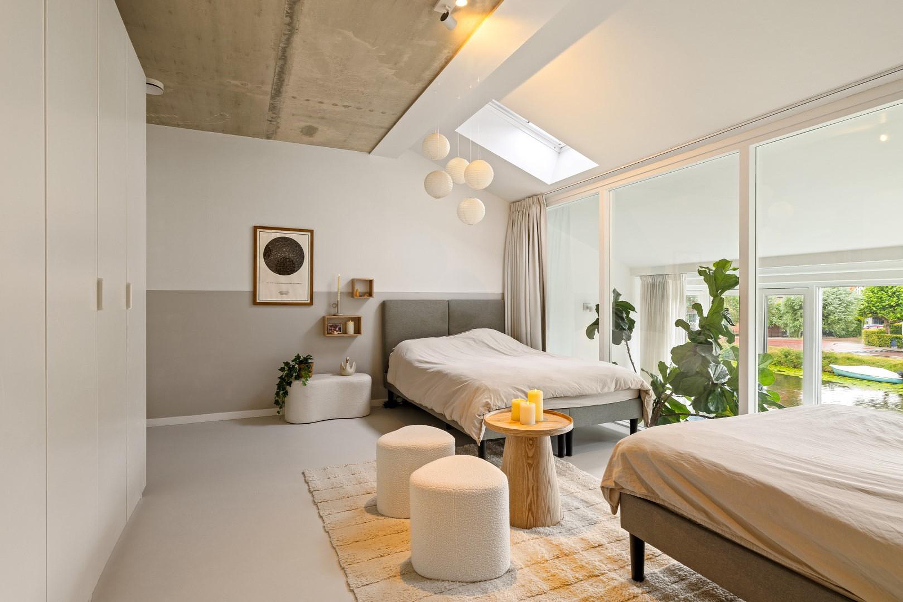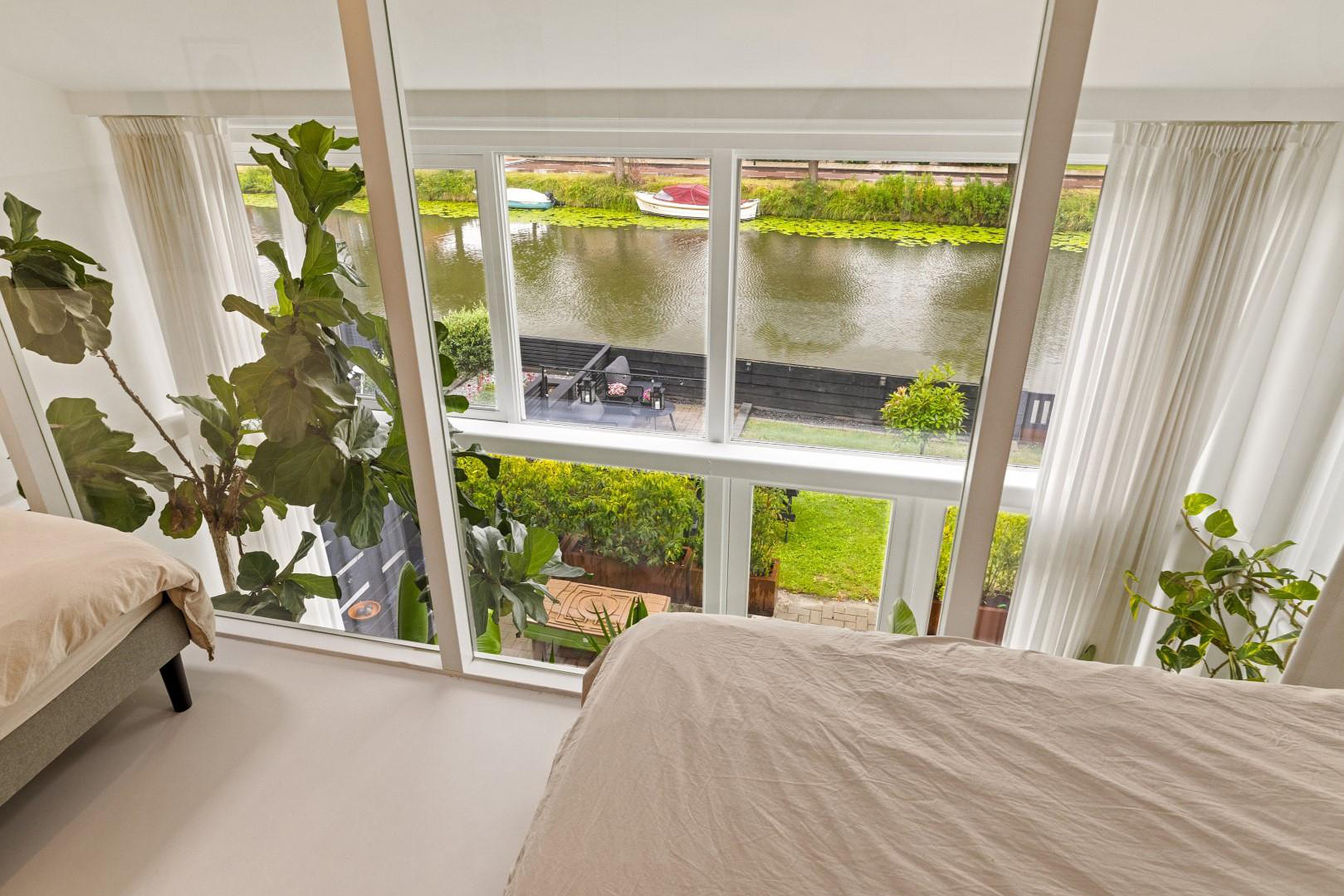 Aan de achterzijde ligt de royale master bedroom van ca. 23 m2 met uitzicht op het water en een open verbinding naar beneden in de woonkamer. Deze ruimte is desgewenst eenvoudig op te splitsen in twee aparte slaapkamers.