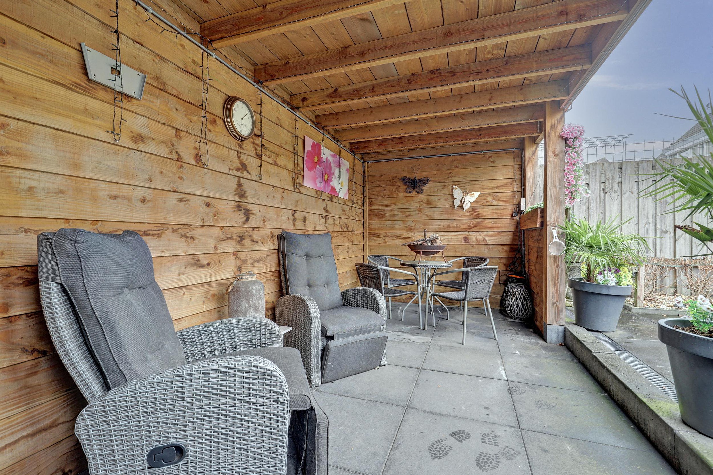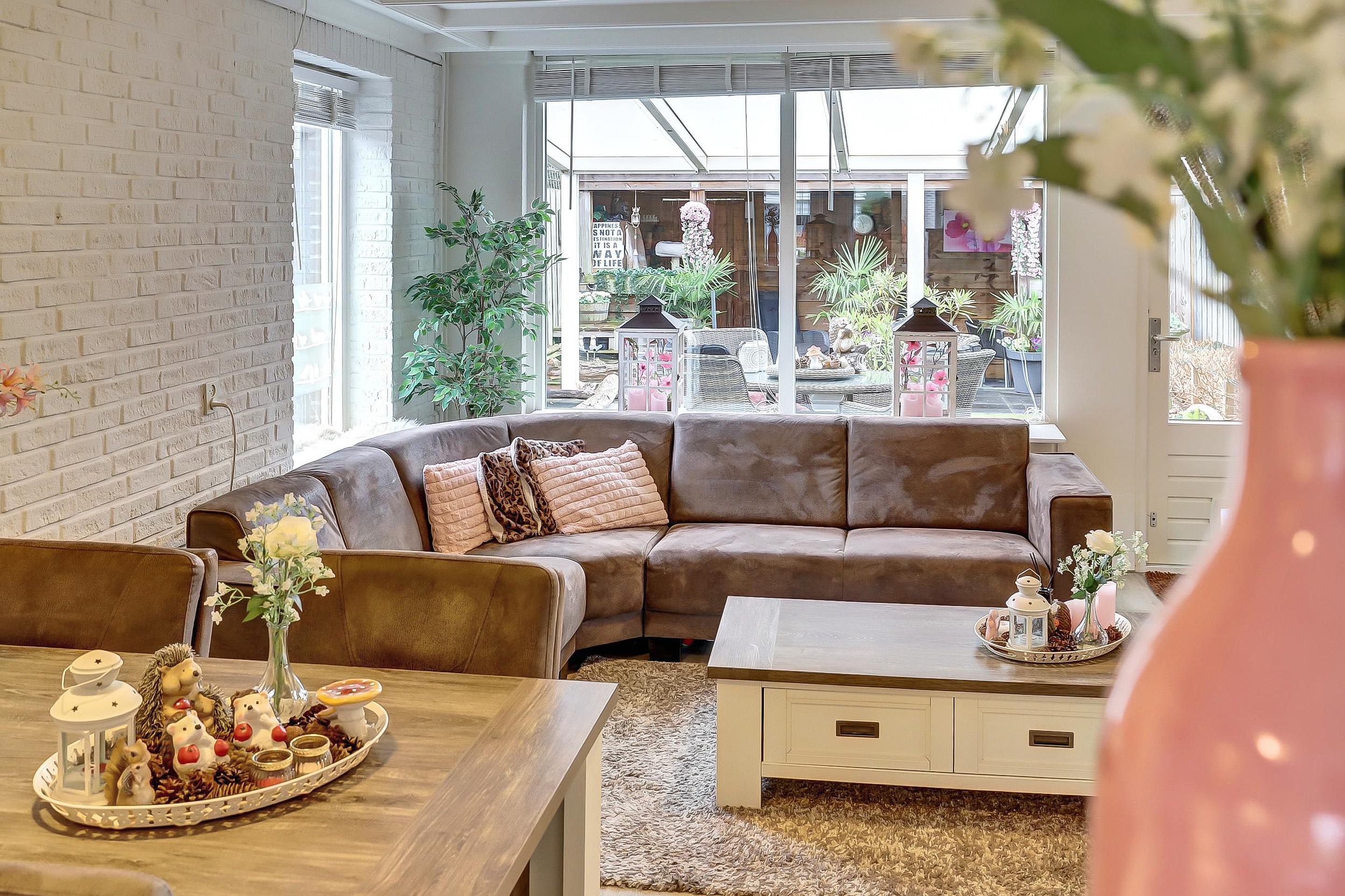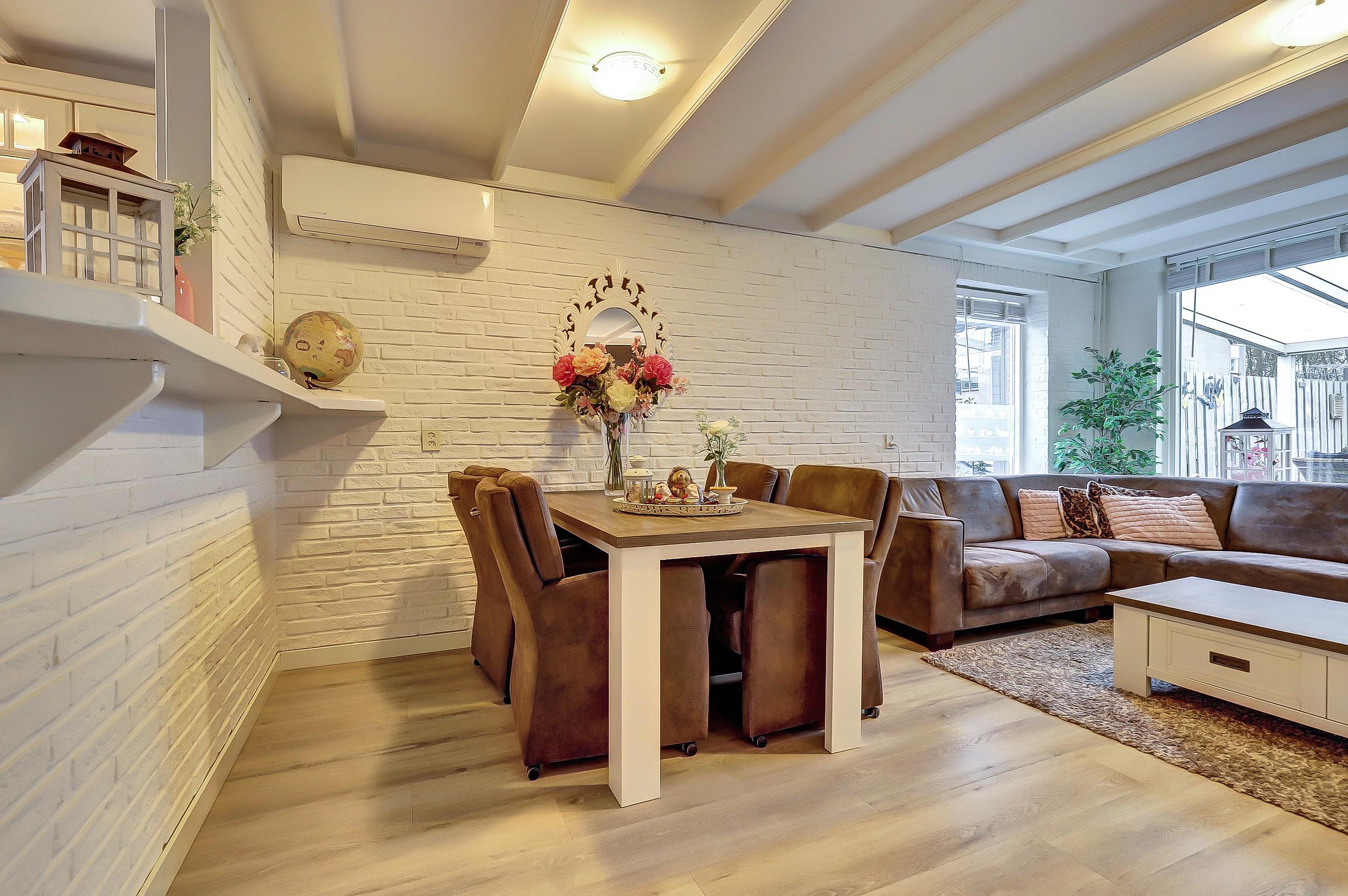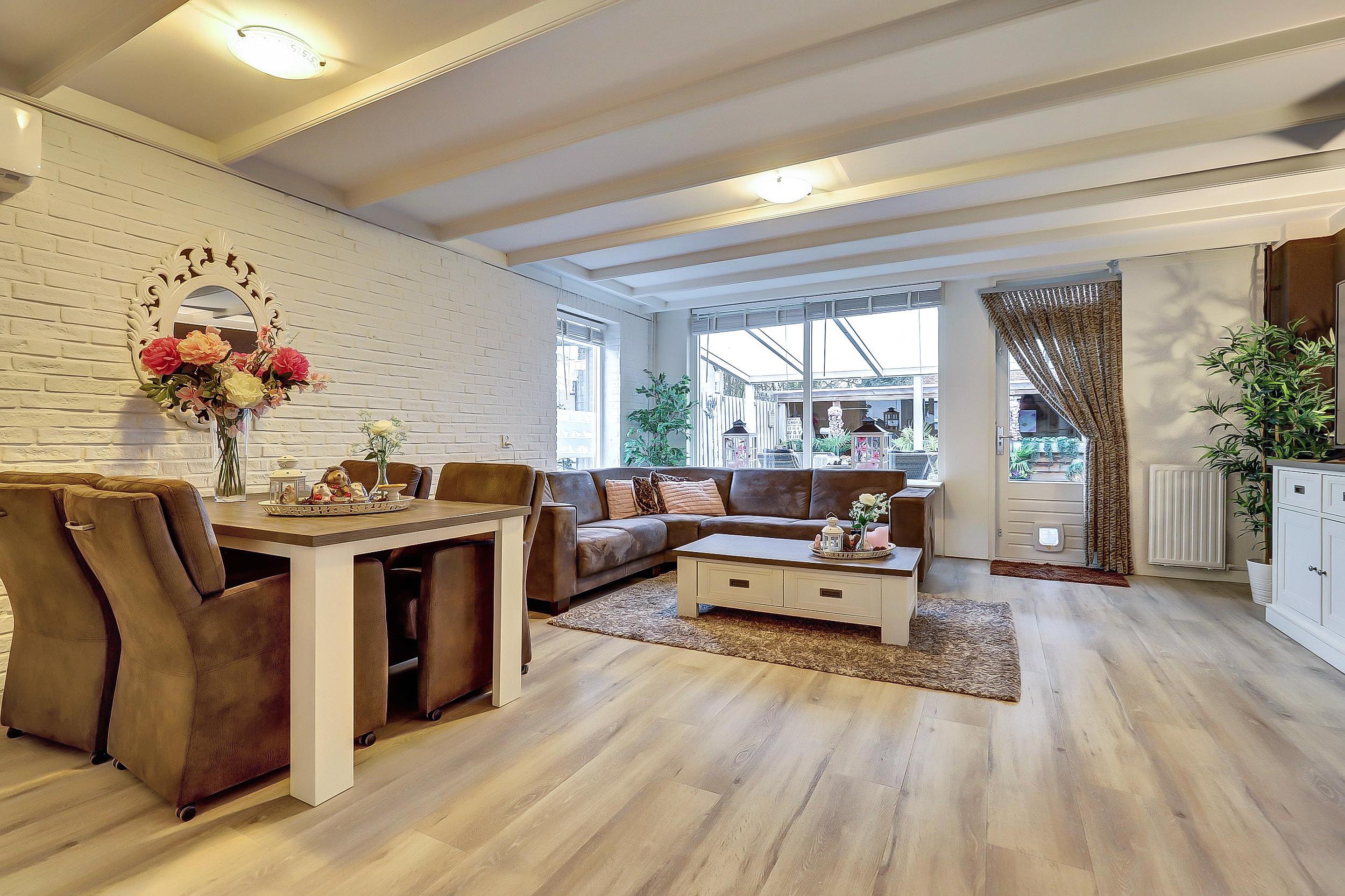 De sfeervolle woonkamer (ca. 30 m2) heeft een trapkast, airco, een extra raam in de zijgevel (met elektrisch screen) voor extra licht en keurige pvc-vloer (2021). Via de achterdeur loop je zo onder de overkapping de achtertuin in – ideaal voor lange zomeravonden of een kop koffie in de ochtendzon.