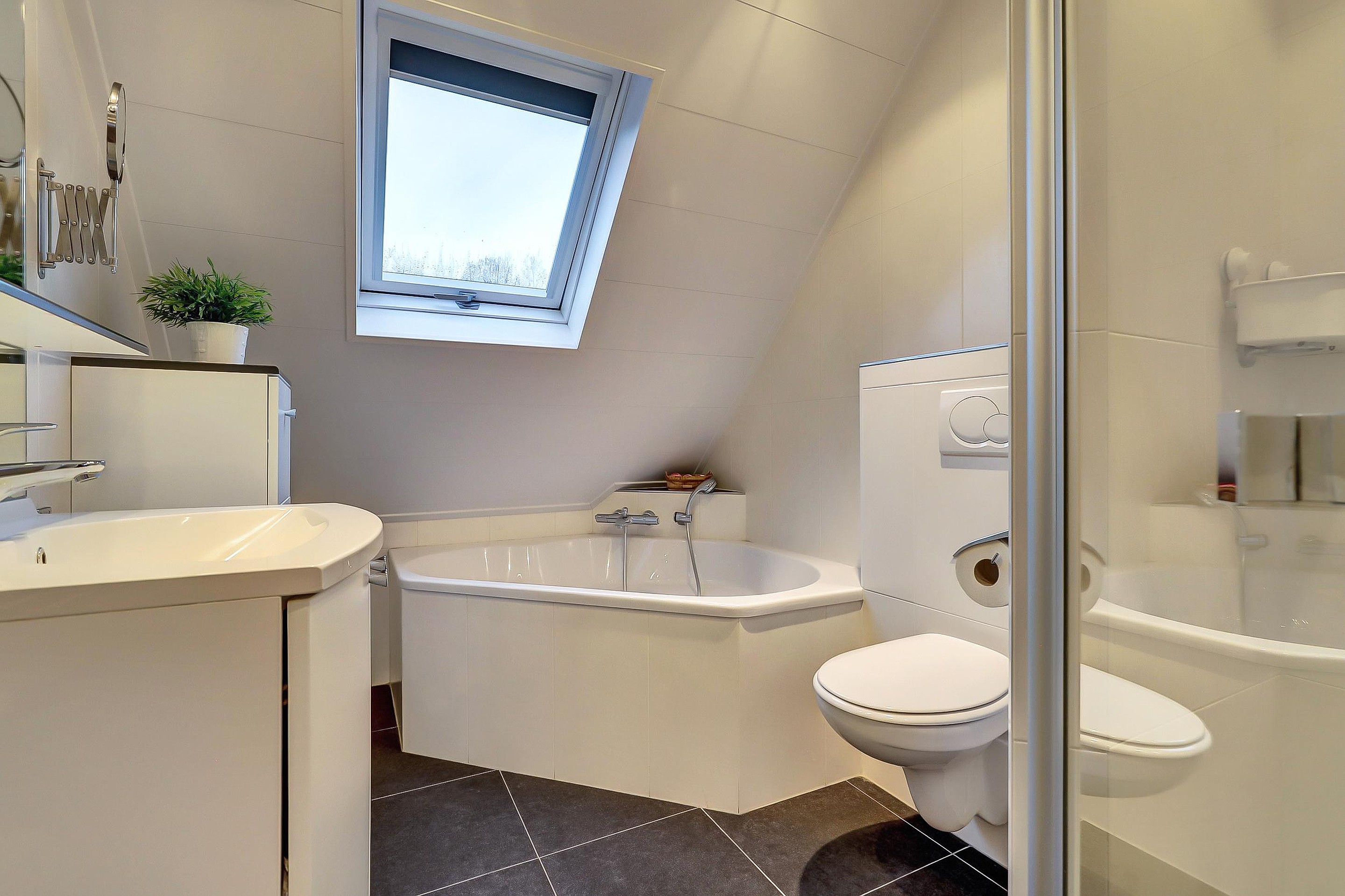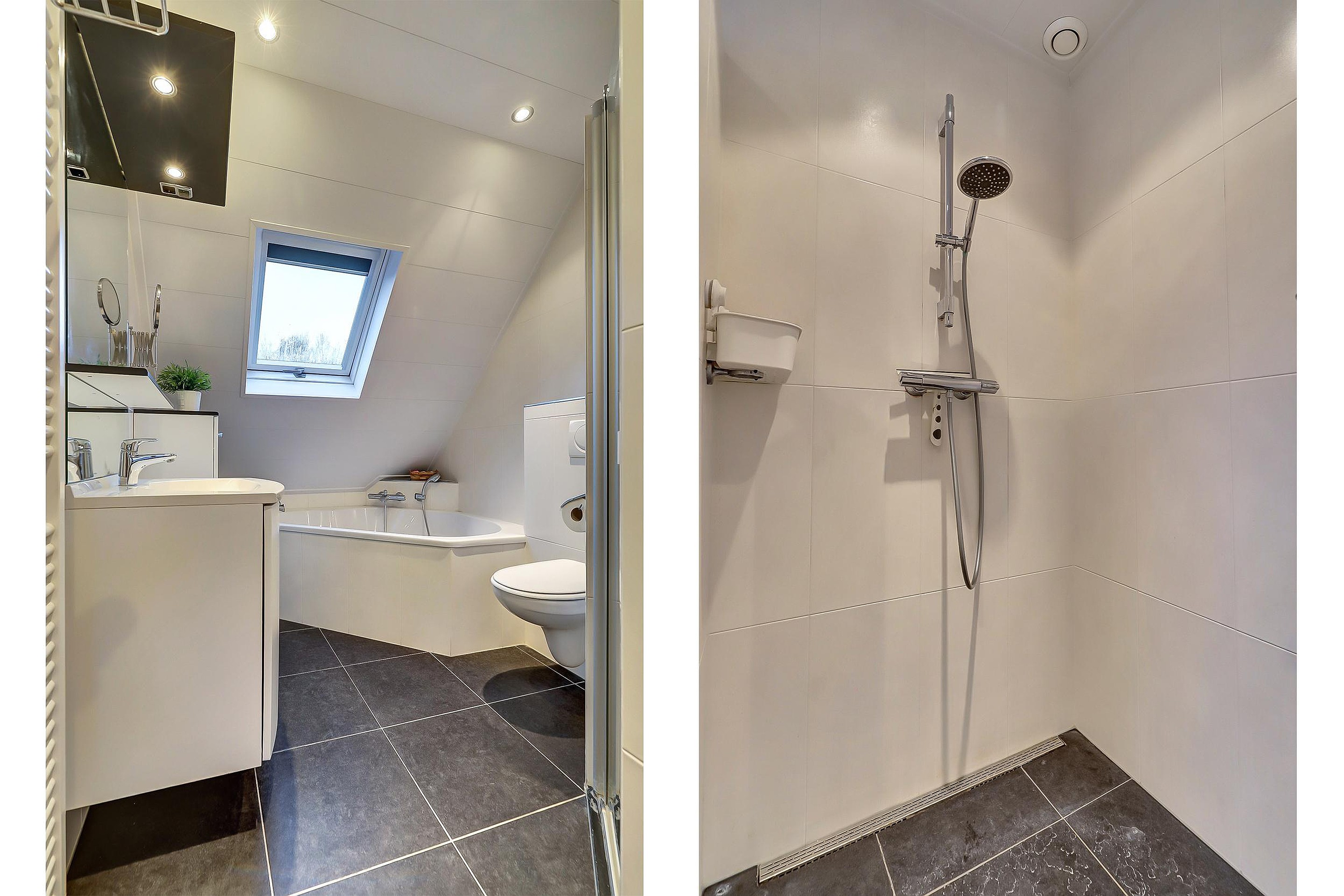 Overloop, drie slaapkamers en een complete badkamer met wastafelmeubel, douchecabine, hoekbad, tweede toilet, designradiator en dakraam.