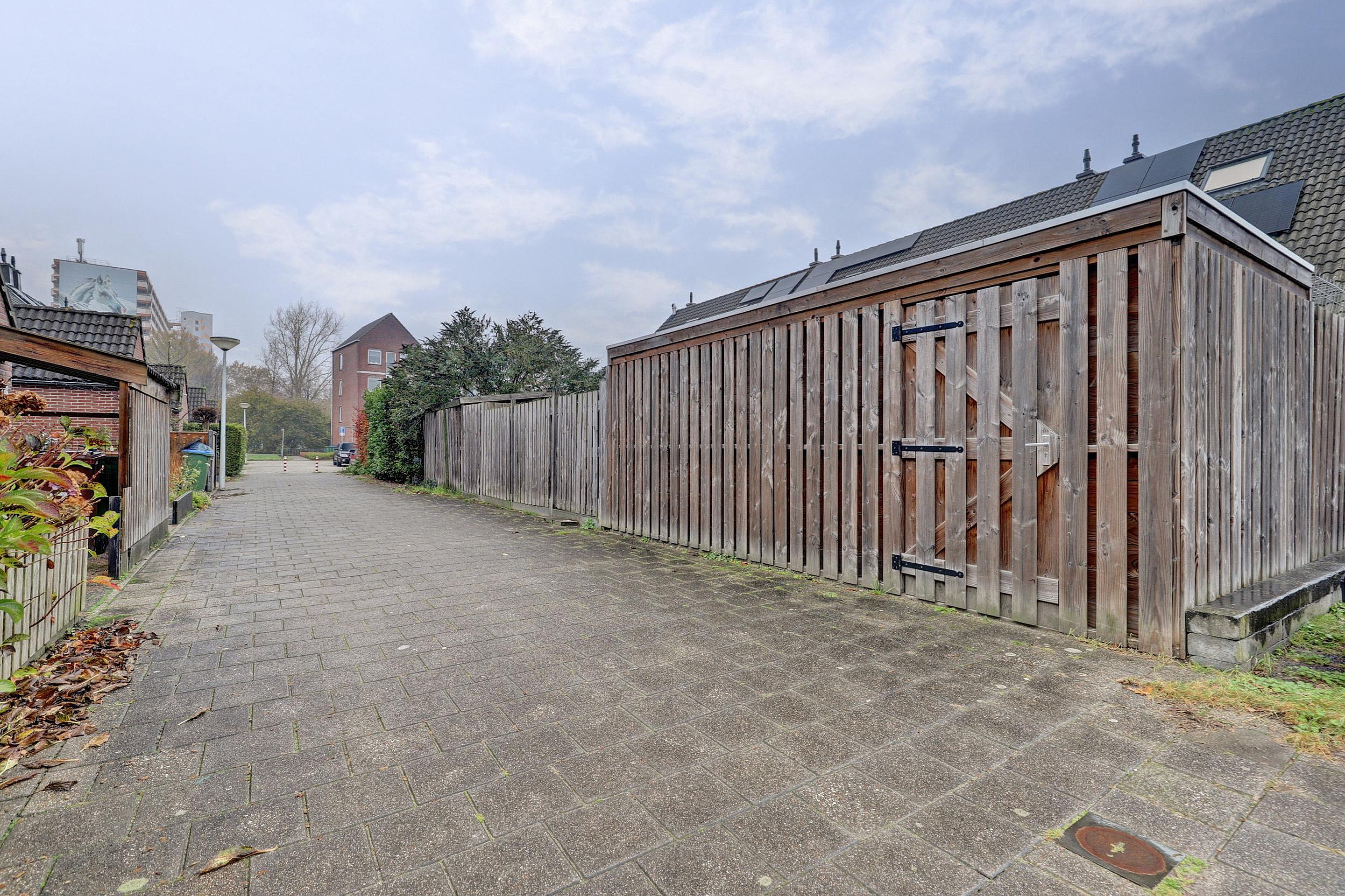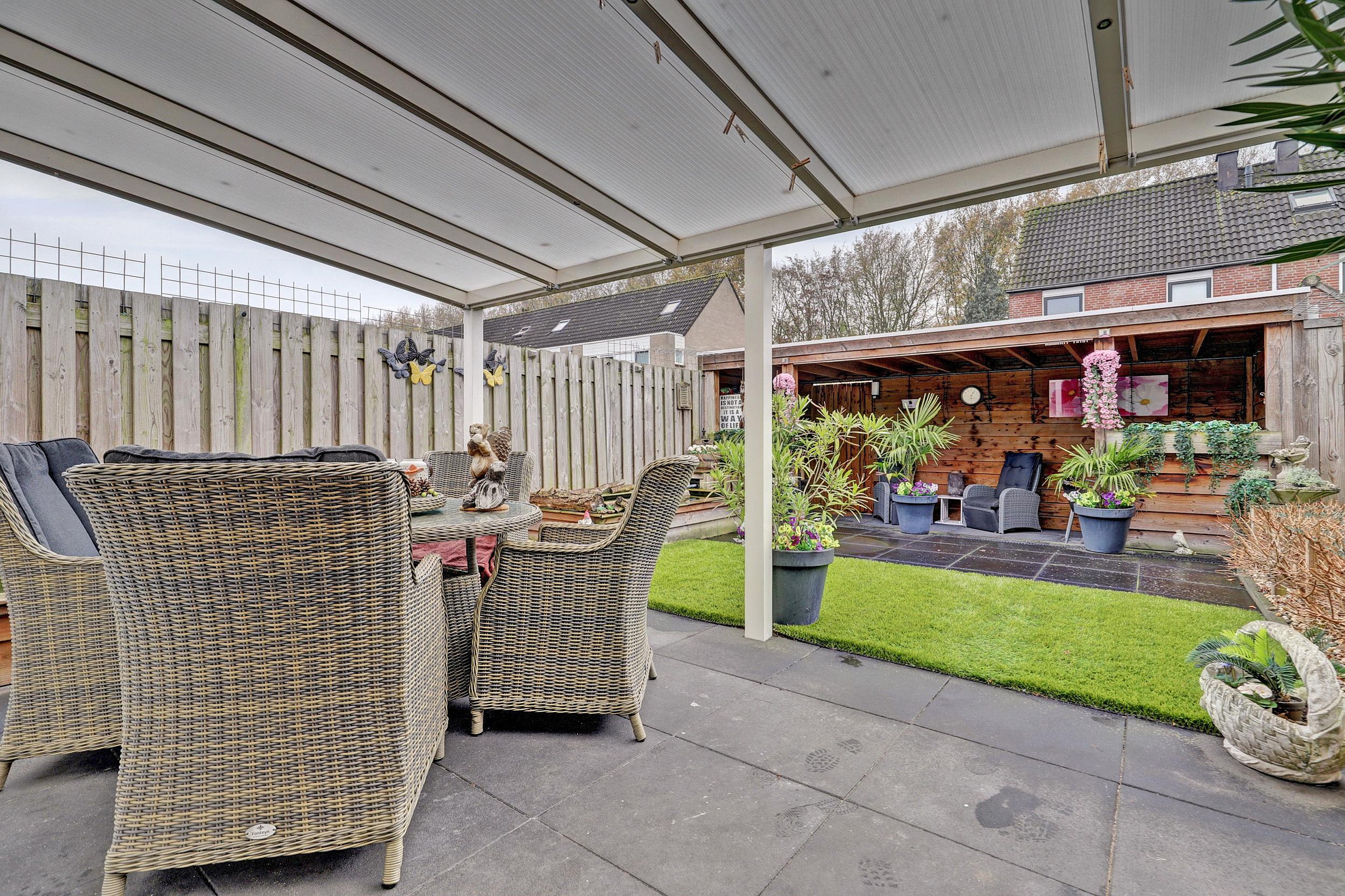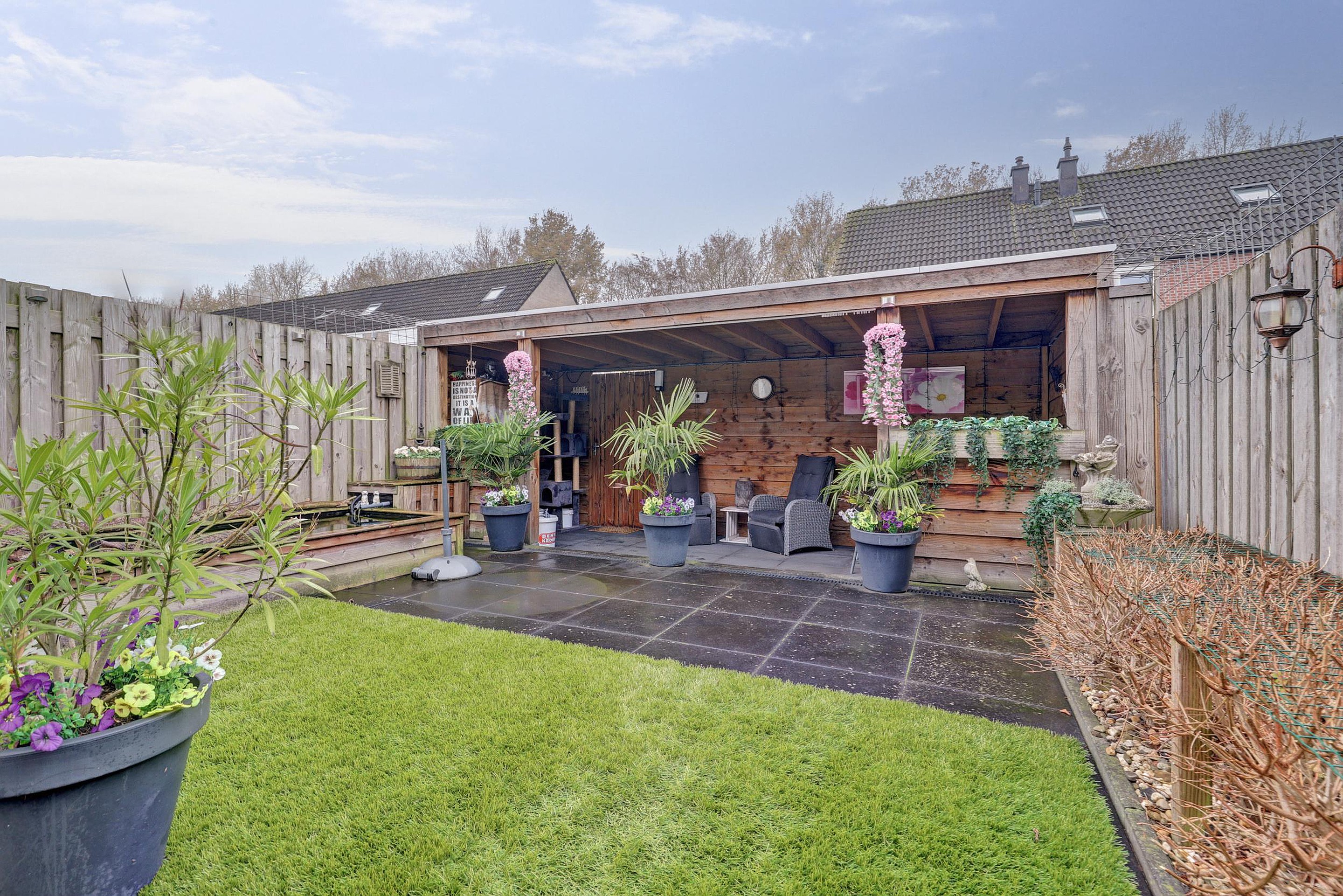 De achtertuin ligt op het westen, is netjes aangelegd en ca. 9 meter diep en 6 meter breed. De grote houten veranda (6 x 2,24 meter) maakt dat je hier in de zomer heerlijk kan relaxen en barbecueën. Via de achterom heb je een snelle verbinding met de straat.