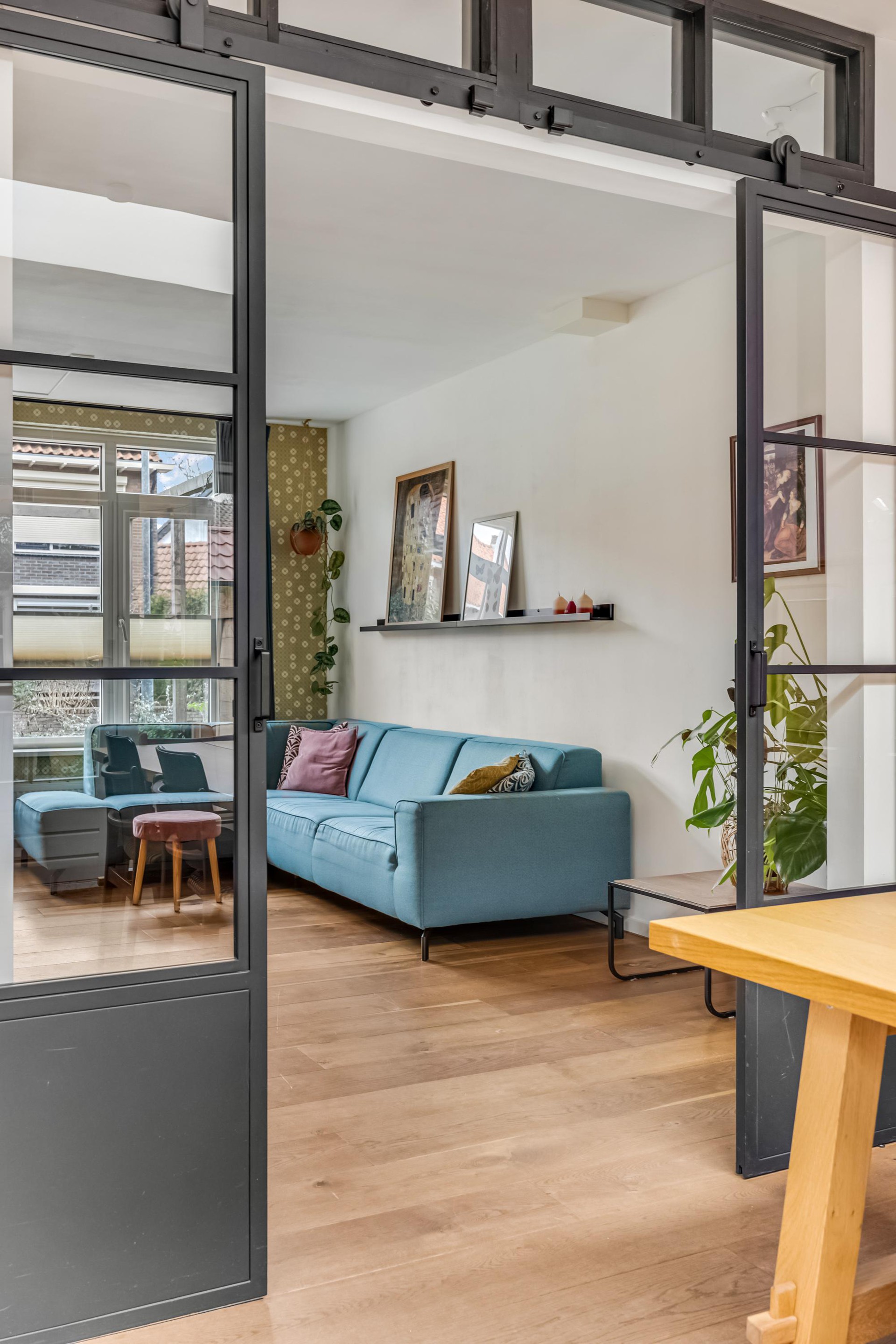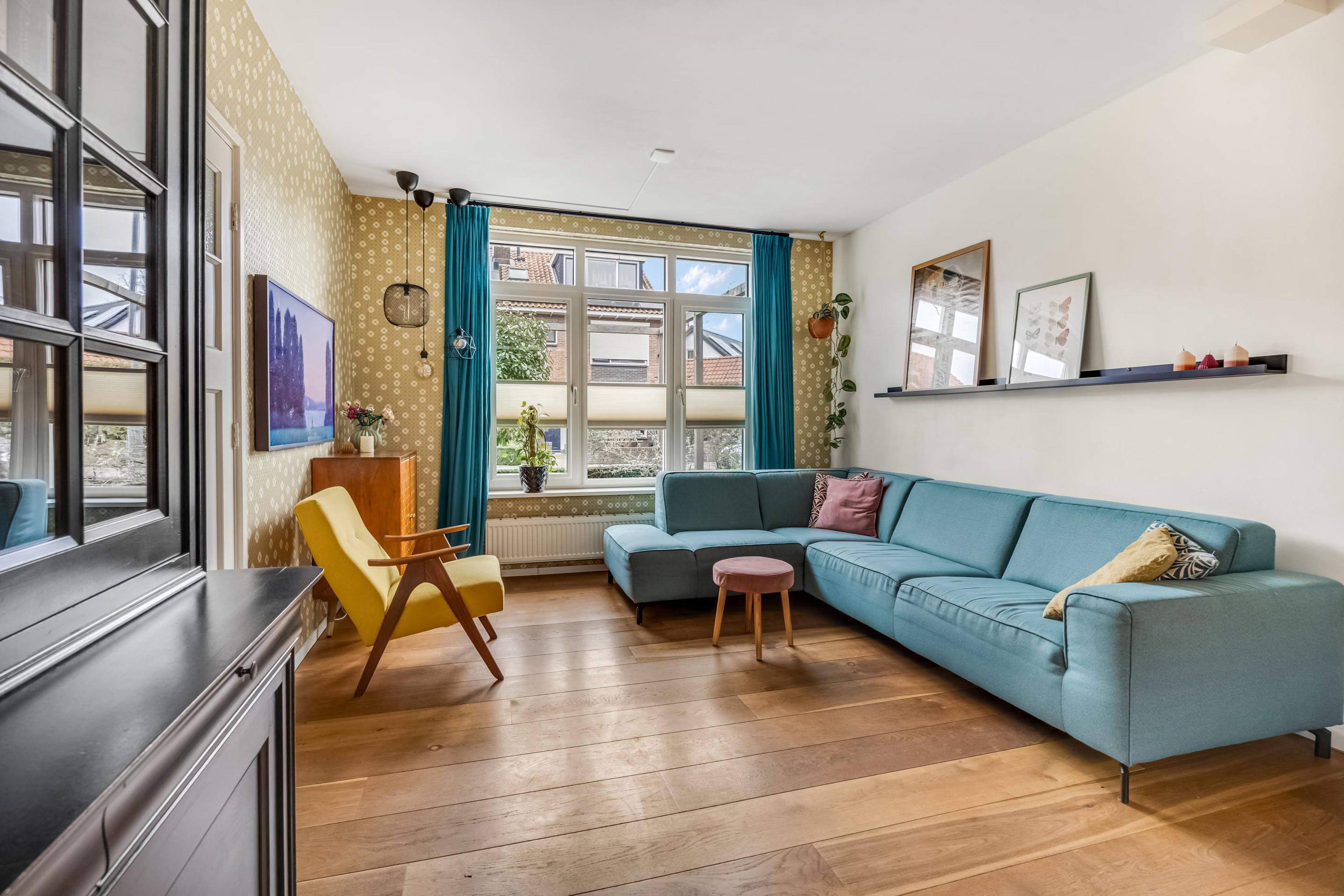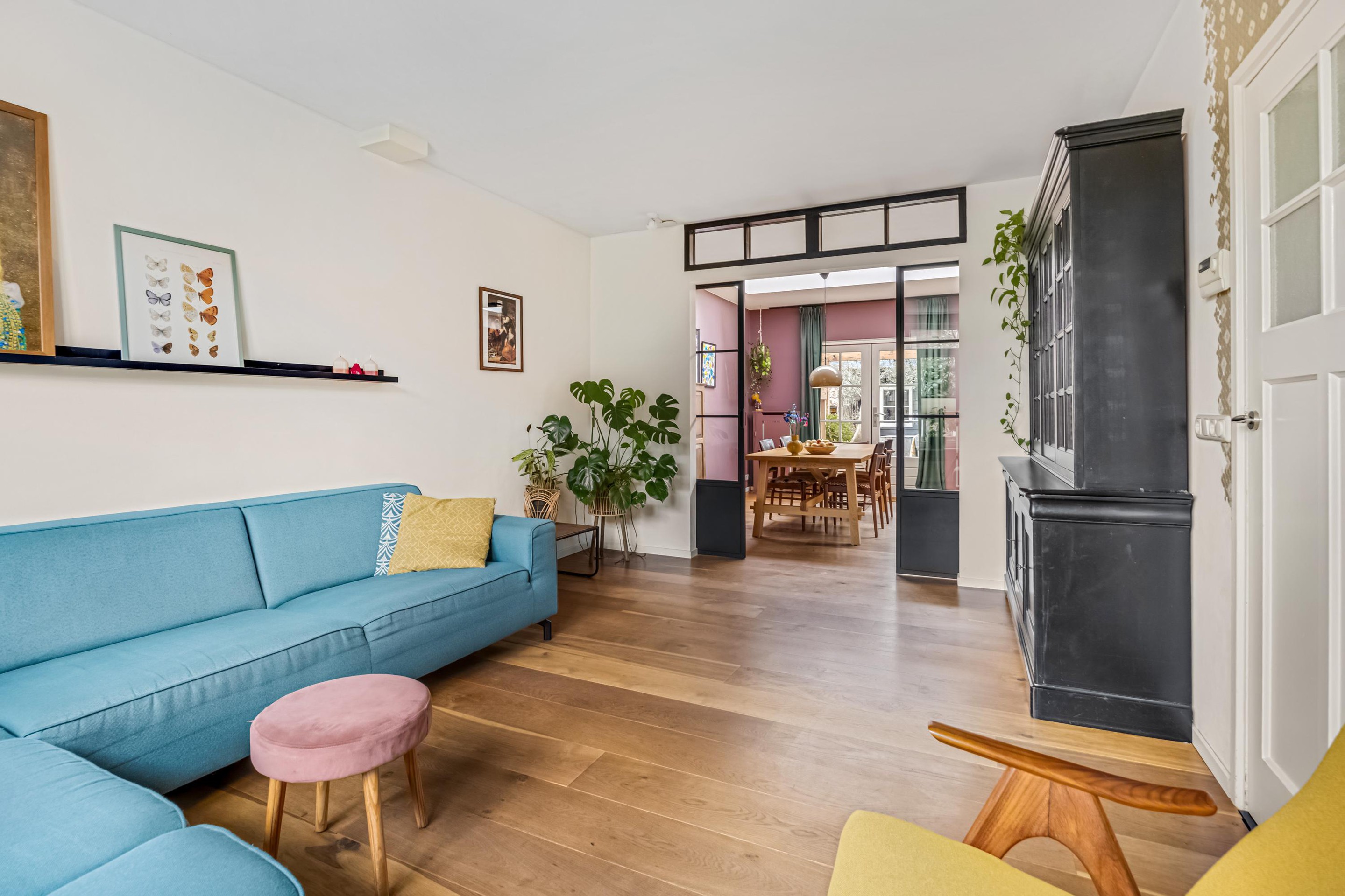 Entree, hal met trapopgang, meterkast (8 groepen) en toilet (2022) met fonteintje. Via de hal kom je in de woonkamer. Aan de voorzijde bevindt zich een gezellige zithoek. Aan de achterzijde ligt de royale uitbouw met een ruime leefkeuken, af te sluiten met moderne stalen schuifdeuren. Dankzij de twee daklichten valt er heerlijk veel daglicht binnen. Zowel de woonkamer als de keuken zijn voorzien van een warme parketvloer.