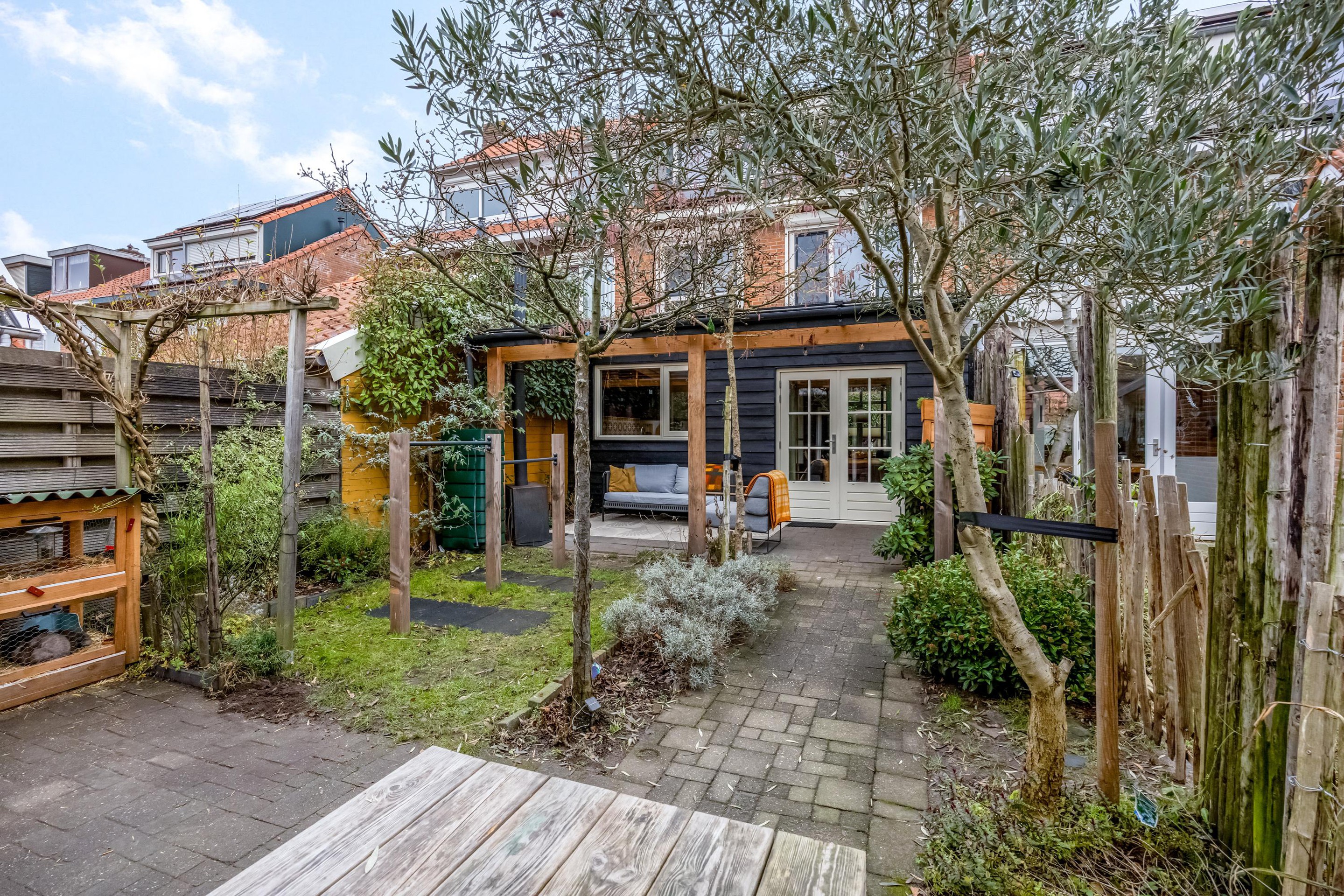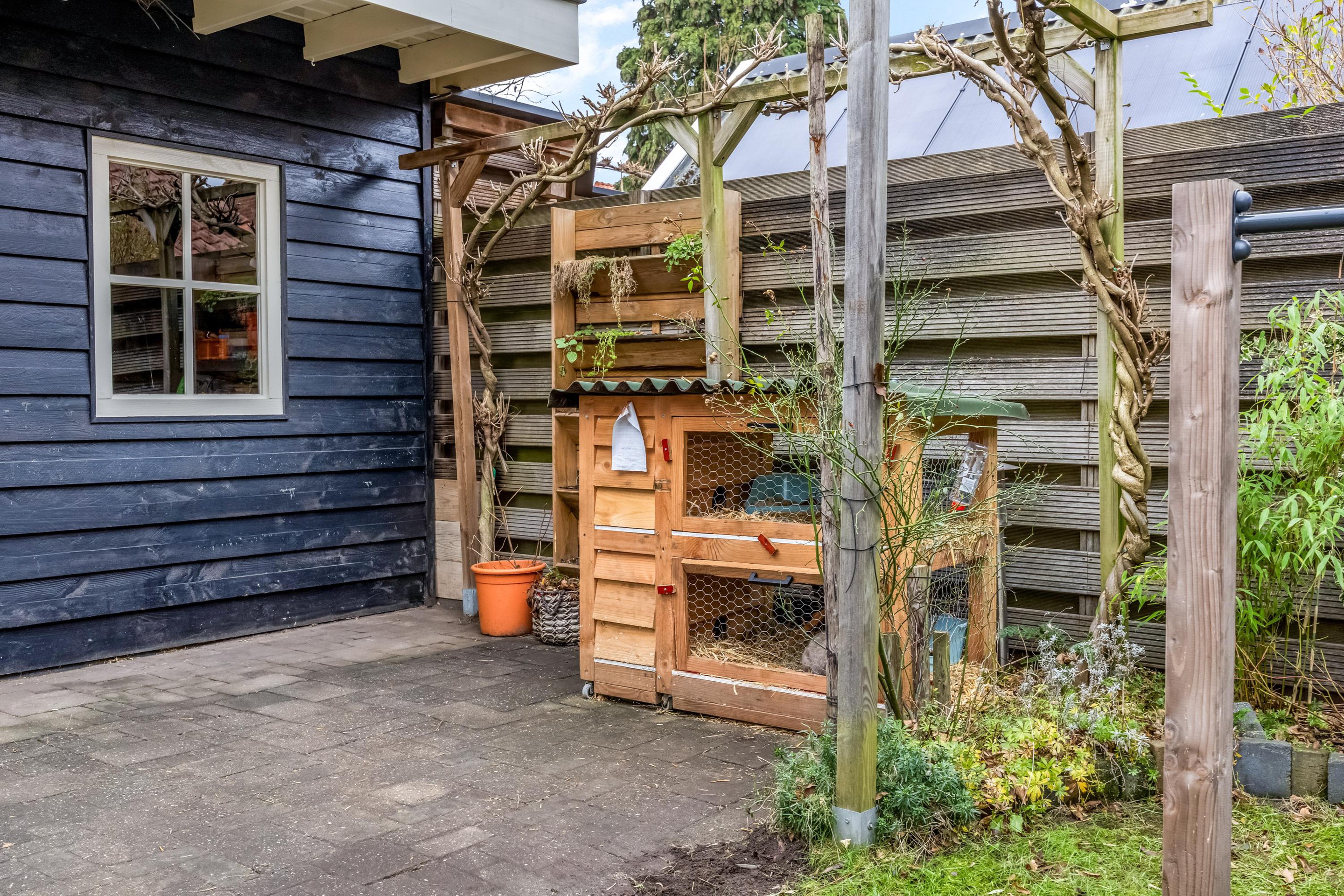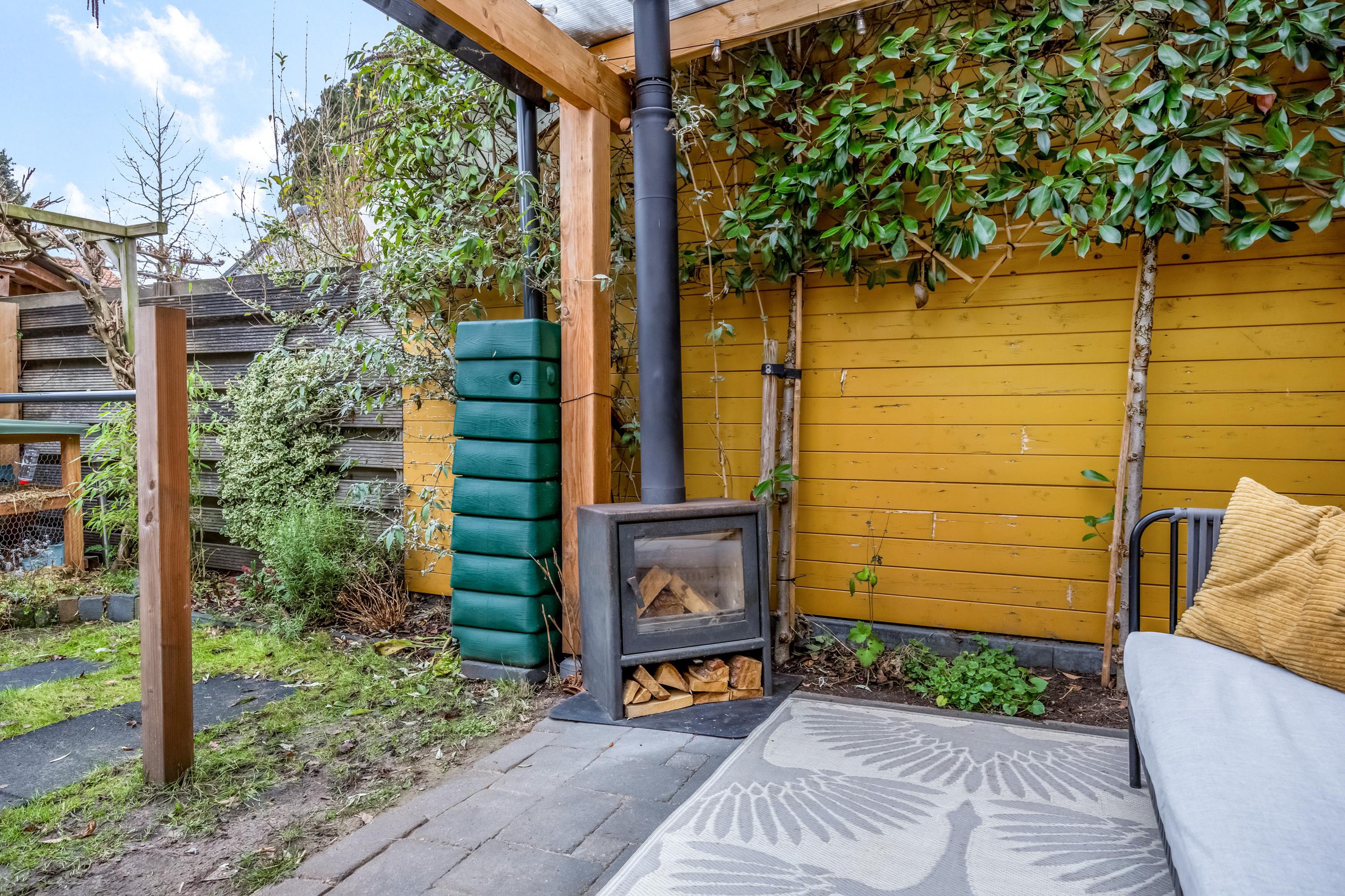 Via de achterdeur stap je onder de ruime overkapping, waar voldoende plek is voor een gezellige loungehoek. De houtkachel (ter overname) zorgt ervoor dat je hier ook in het voor- en najaar heerlijk kunt zitten. De tuin ligt gunstig op het zuidwesten en heeft een stukje gras en borders met diverse planten en struiken. Achterin de tuin staat een royale houten schuur met meer dan genoeg ruimte voor fietsen, klussen en opslag. De achterom is breed genoeg voor een bakfiets of motor.