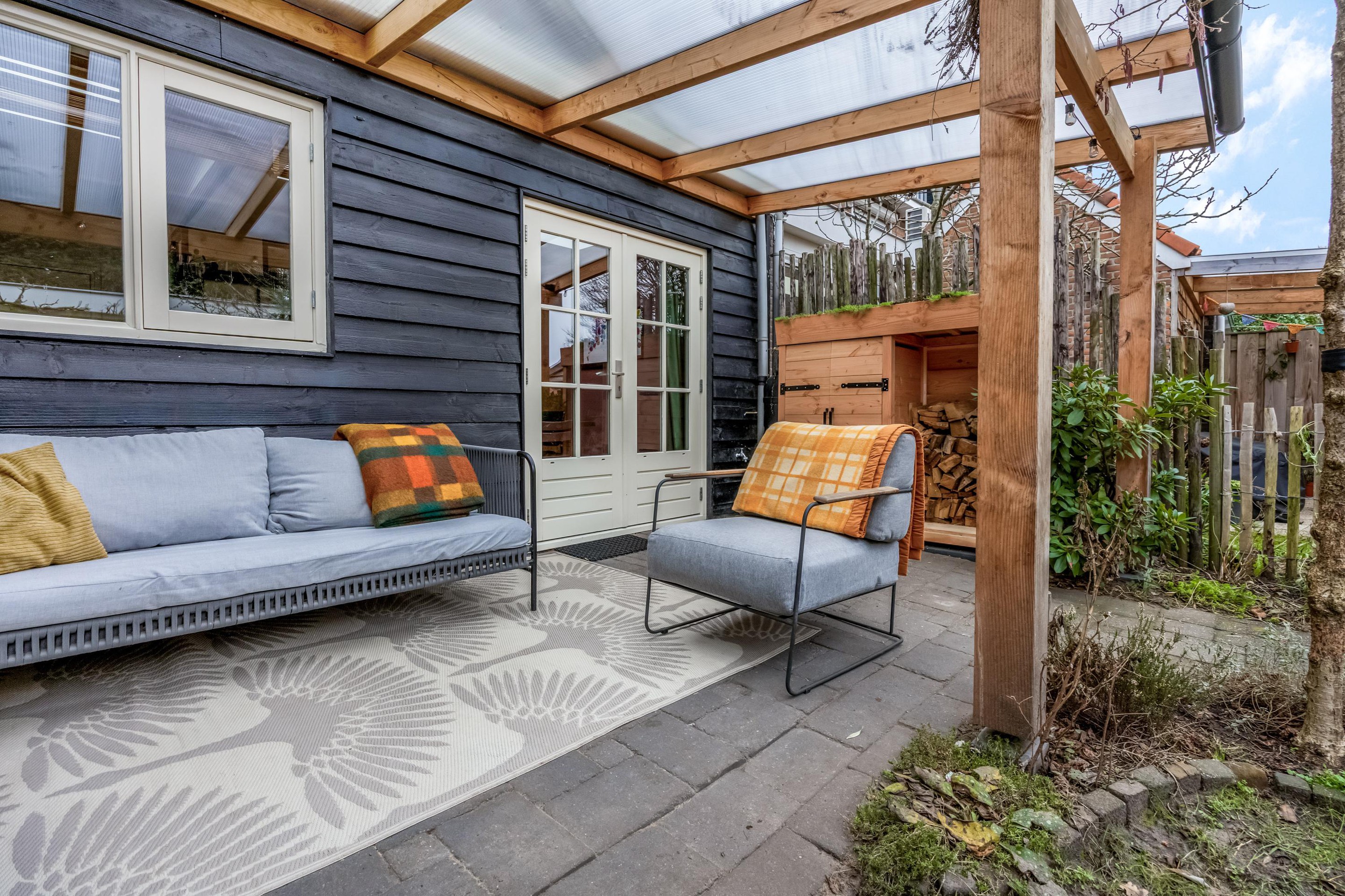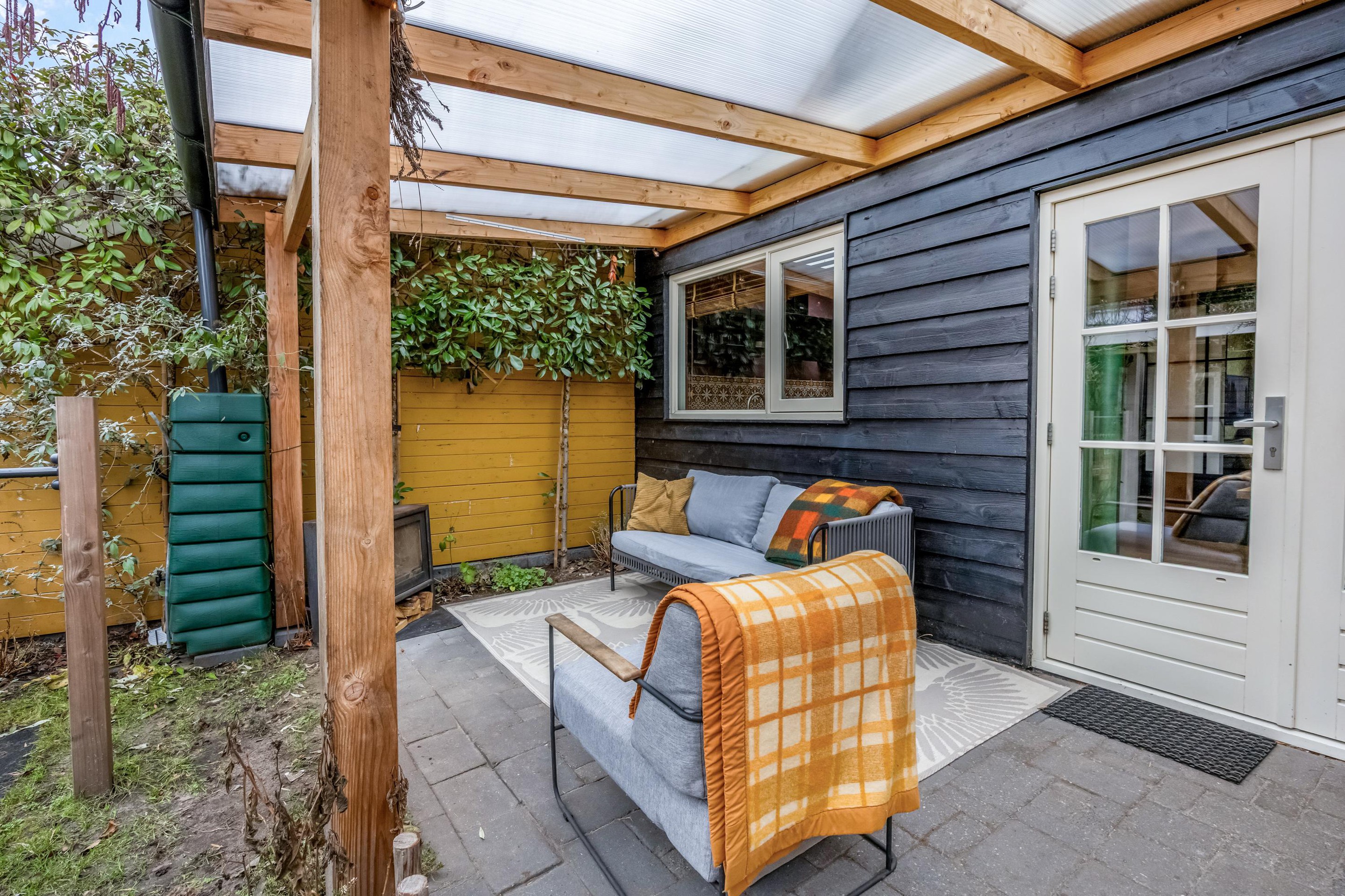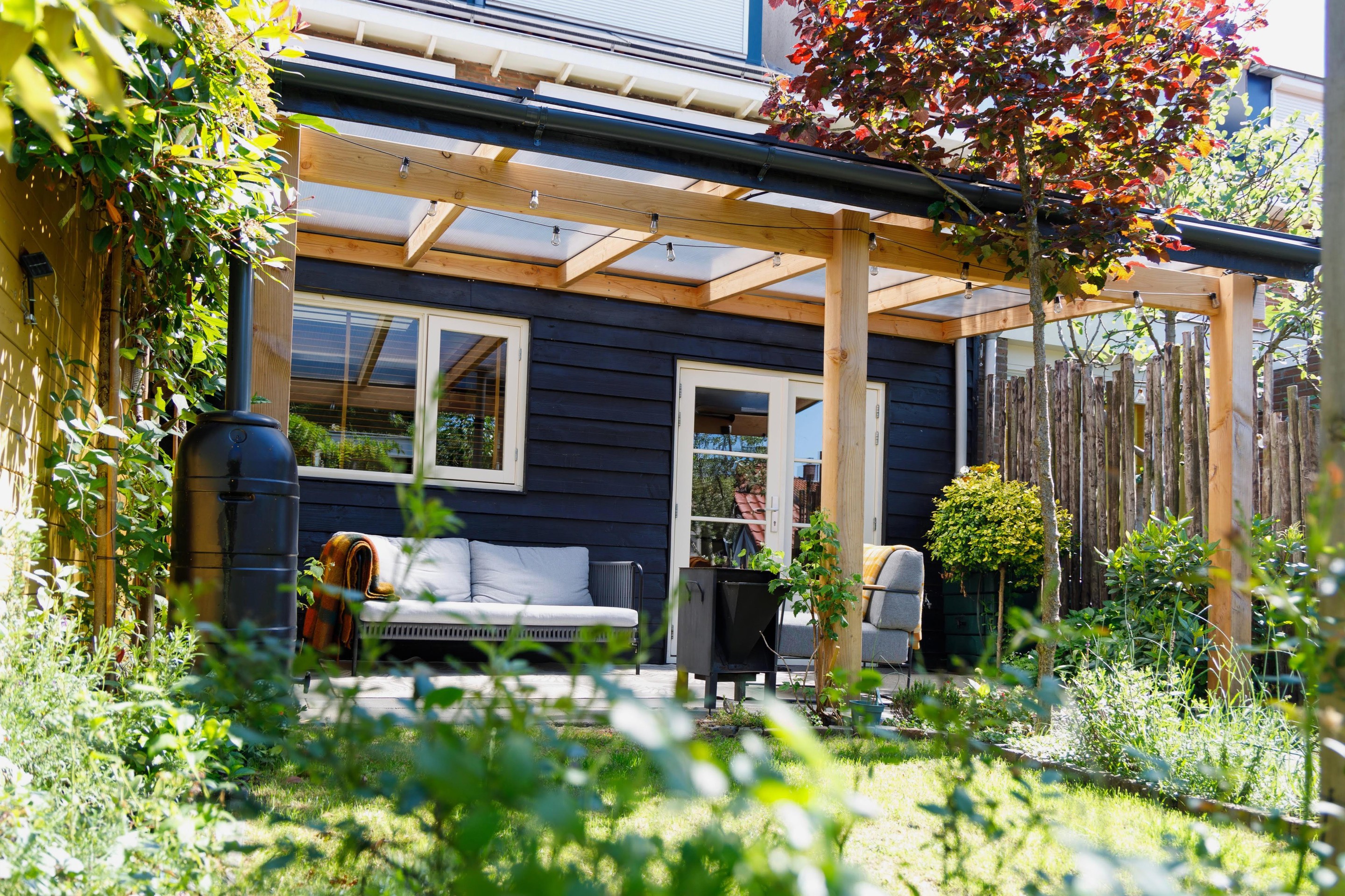 Via de achterdeur stap je onder de ruime overkapping, waar voldoende plek is voor een gezellige loungehoek. De houtkachel (ter overname) zorgt ervoor dat je hier ook in het voor- en najaar heerlijk kunt zitten. De tuin ligt gunstig op het zuidwesten en heeft een stukje gras en borders met diverse planten en struiken. Achterin de tuin staat een royale houten schuur met meer dan genoeg ruimte voor fietsen, klussen en opslag. De achterom is breed genoeg voor een bakfiets of motor.