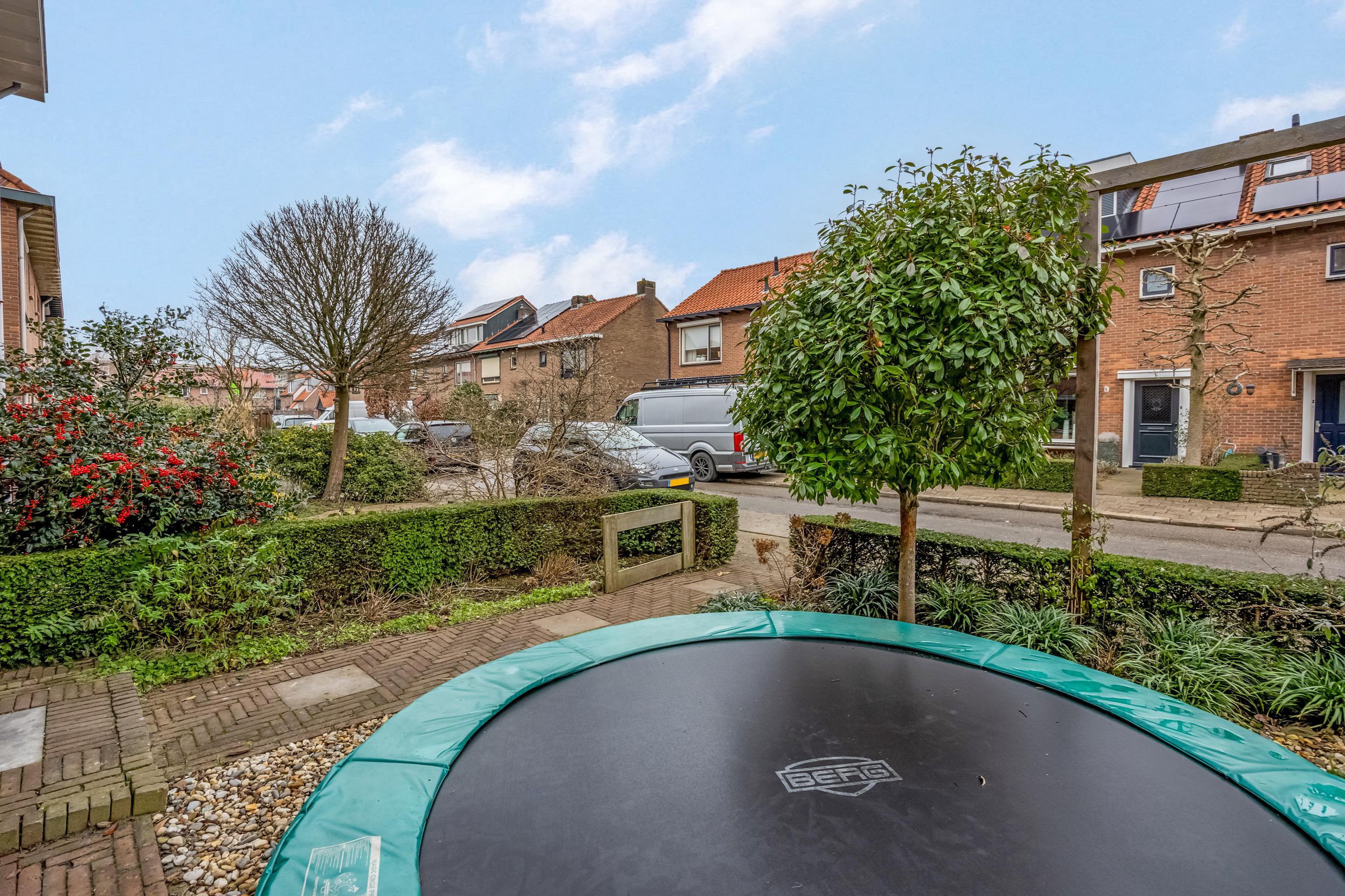In de voortuin ligt een trampoline voor eindeloos speelplezier. Parkeren kan openbaar in de straat.